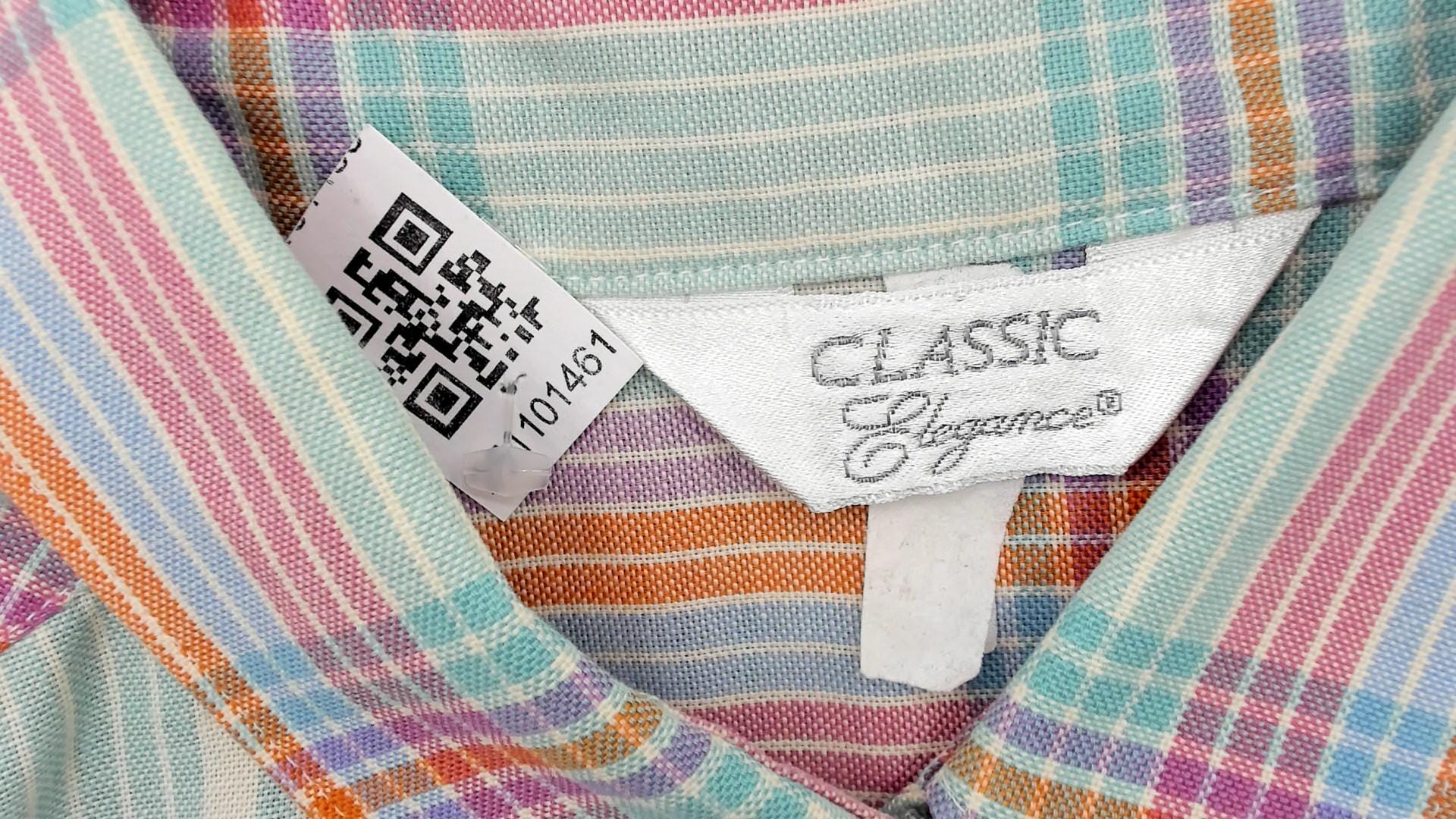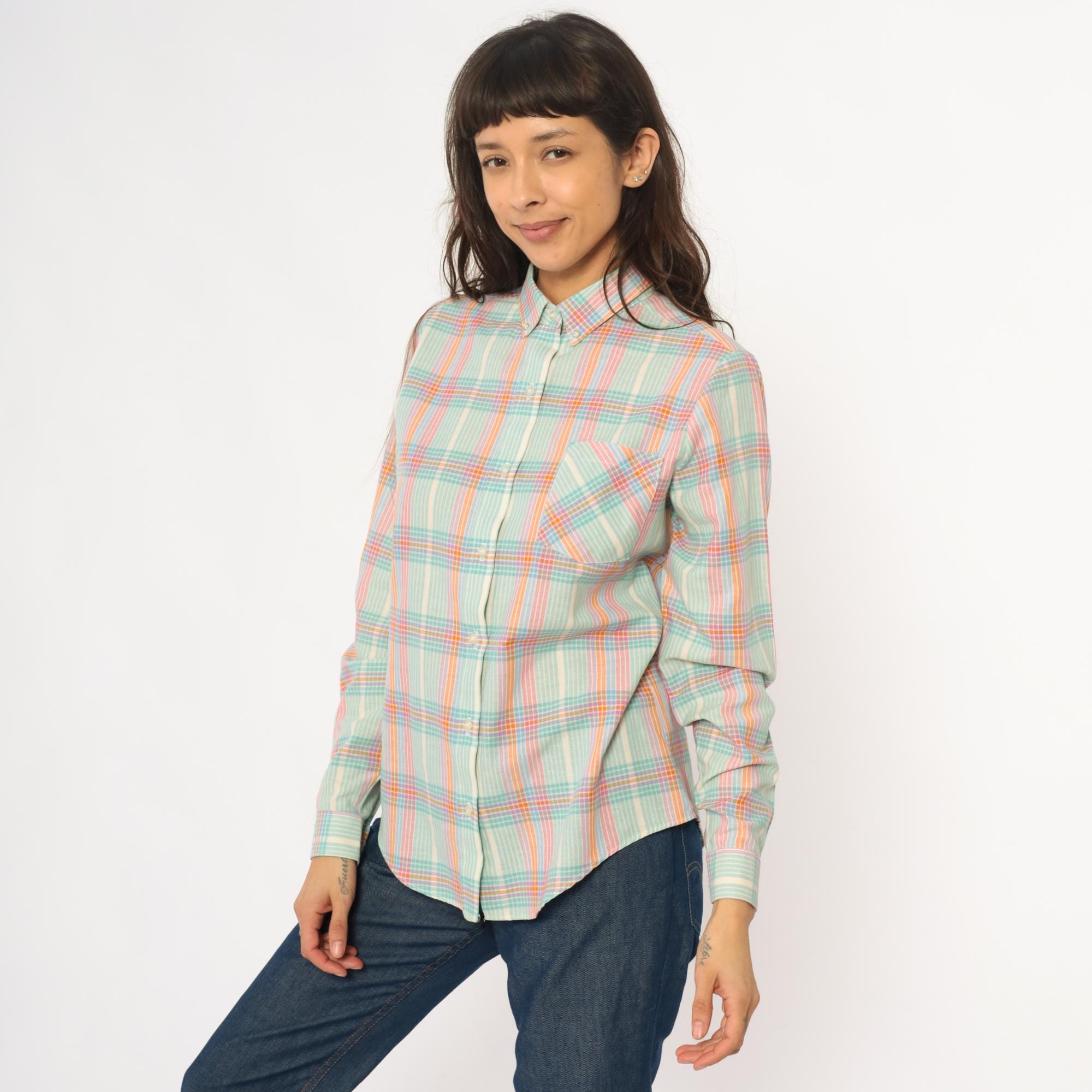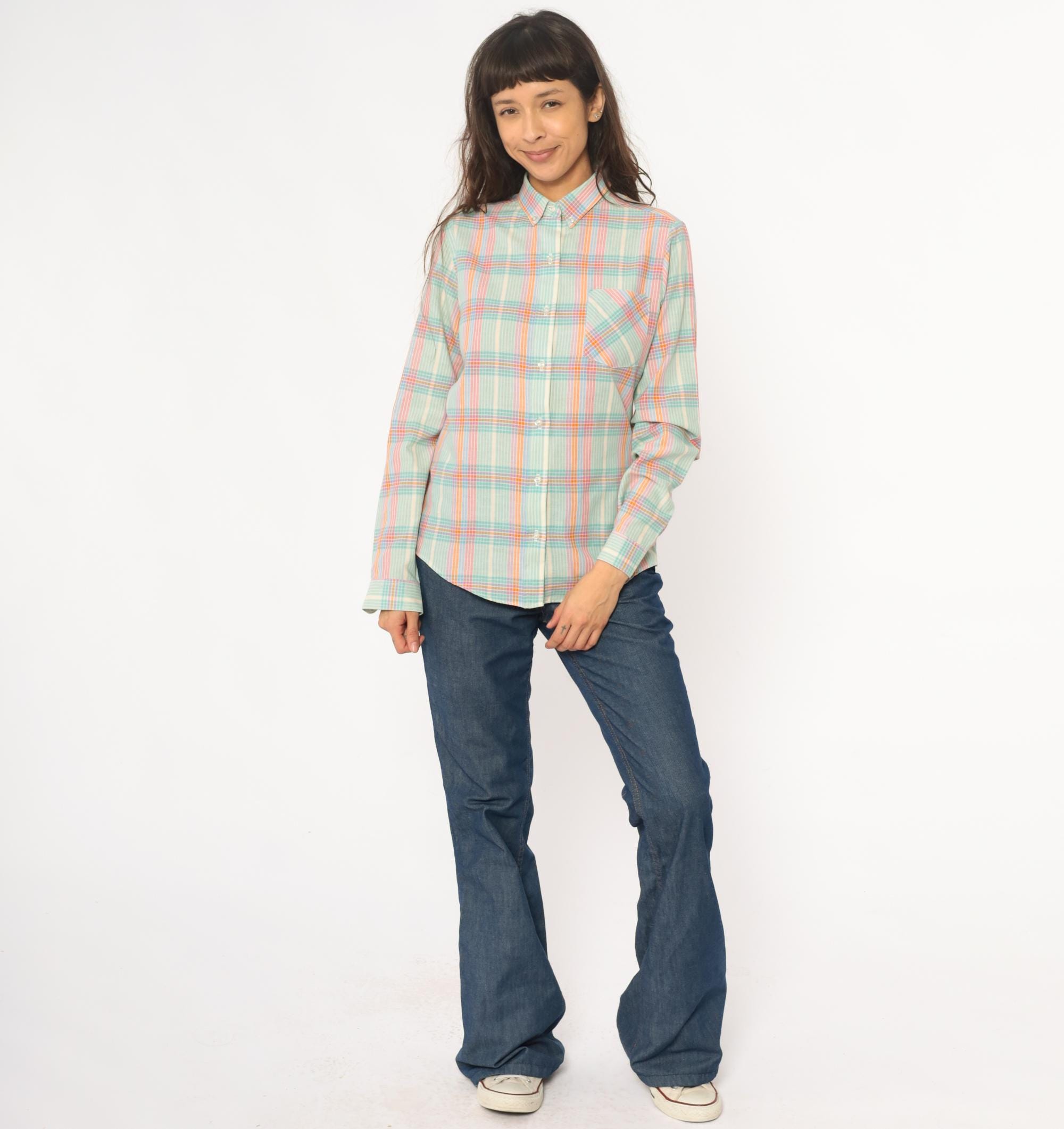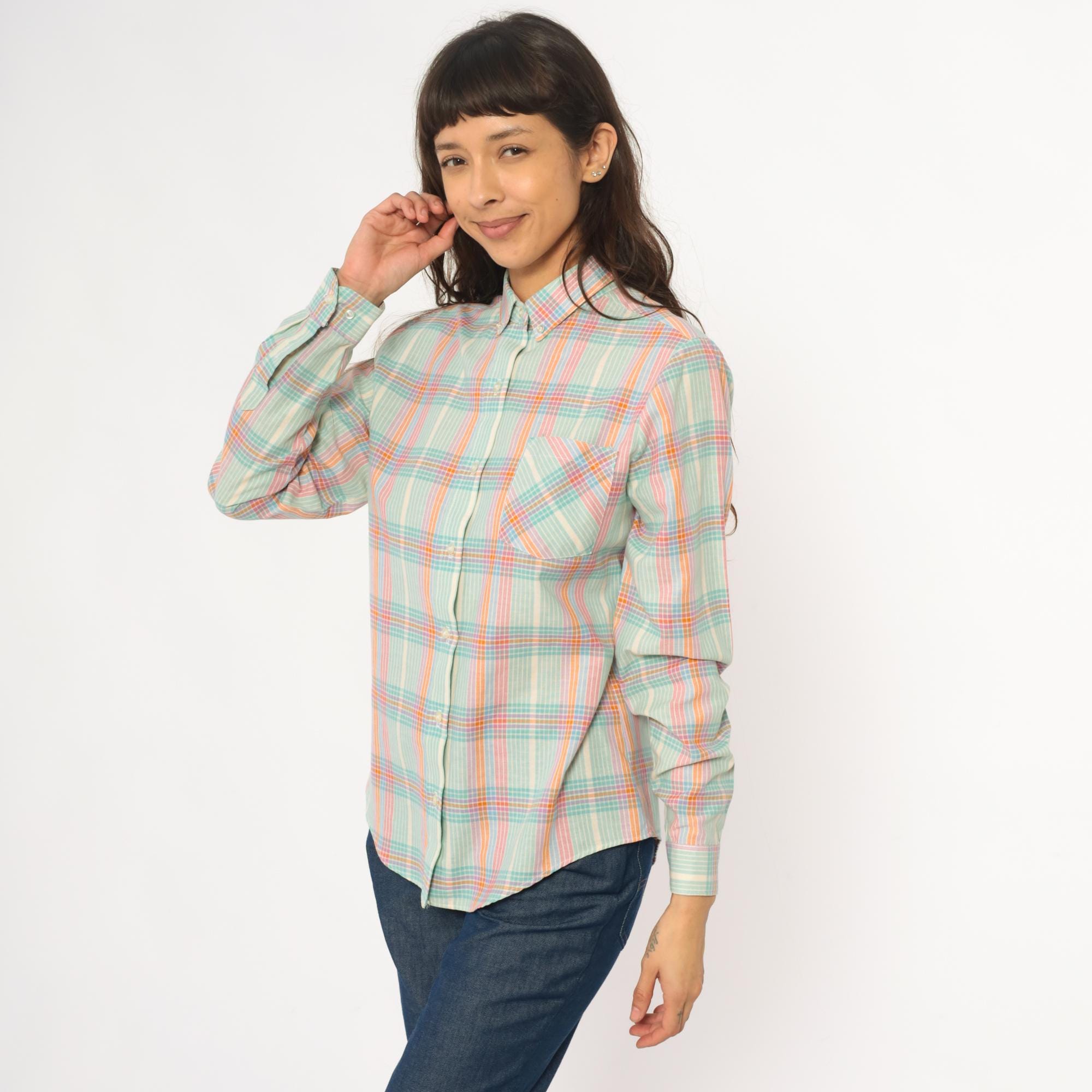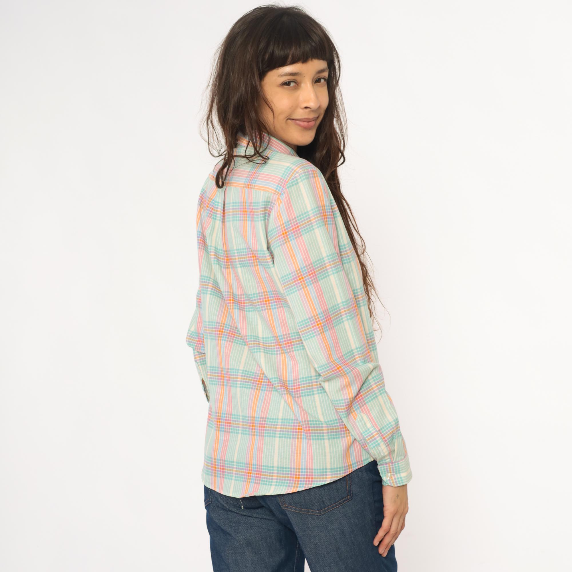 90s pastel plaid button-down shirt in mint green, coral pink, orange, blue, and yellow. Collared with button-down collar points, long sleeves, single chest pocket cut on the bias.