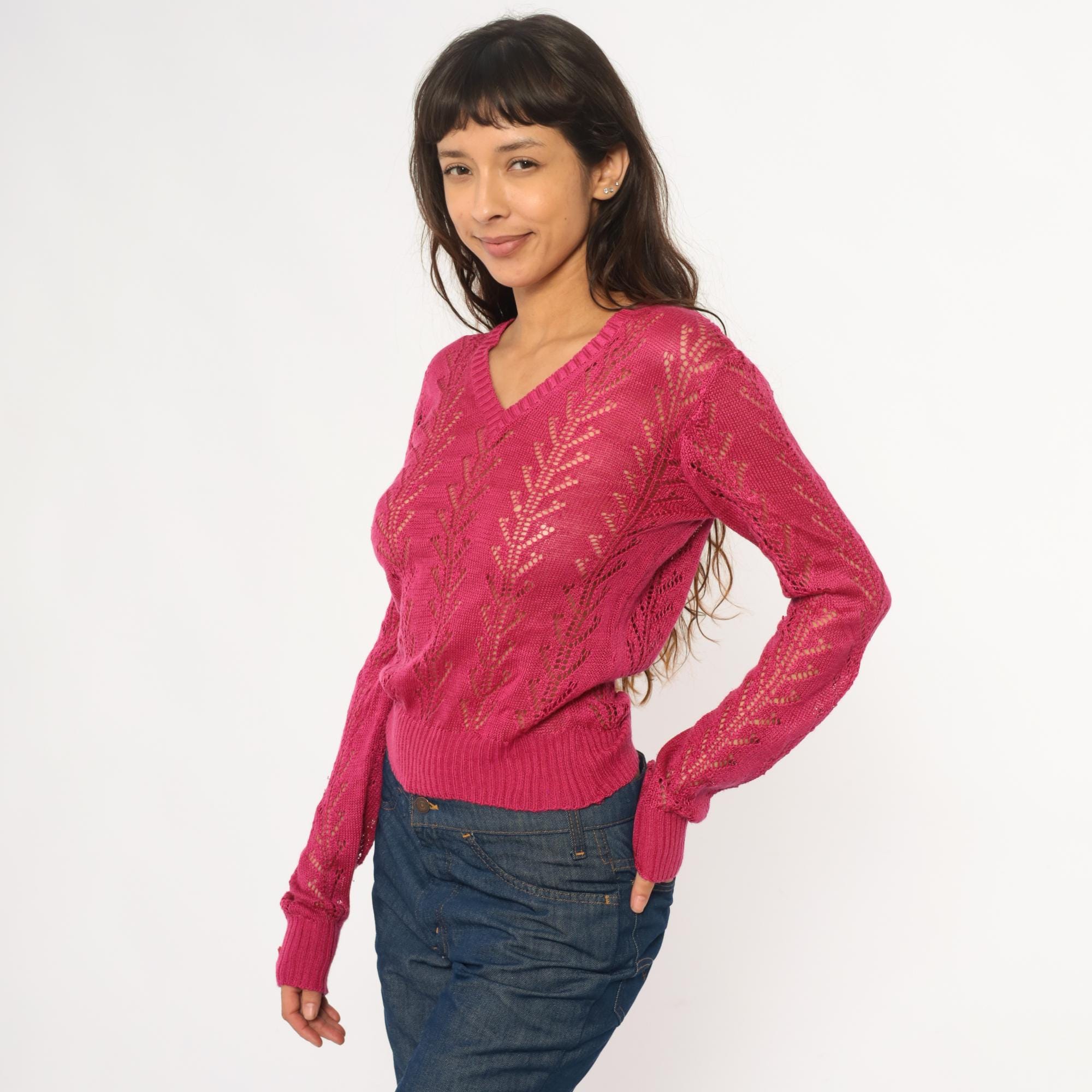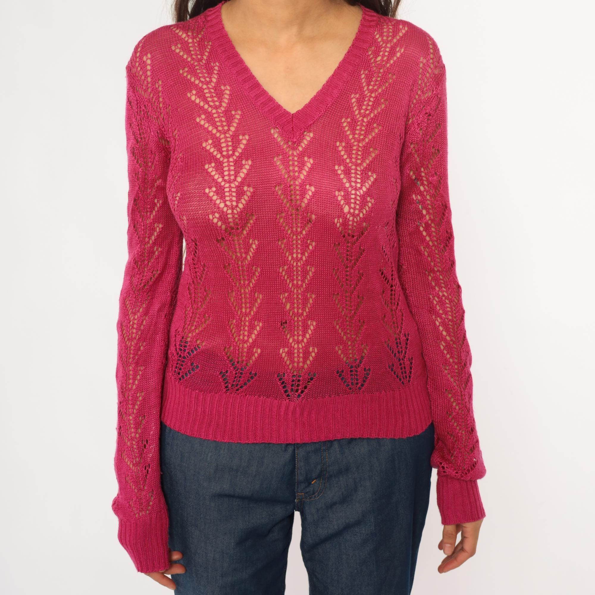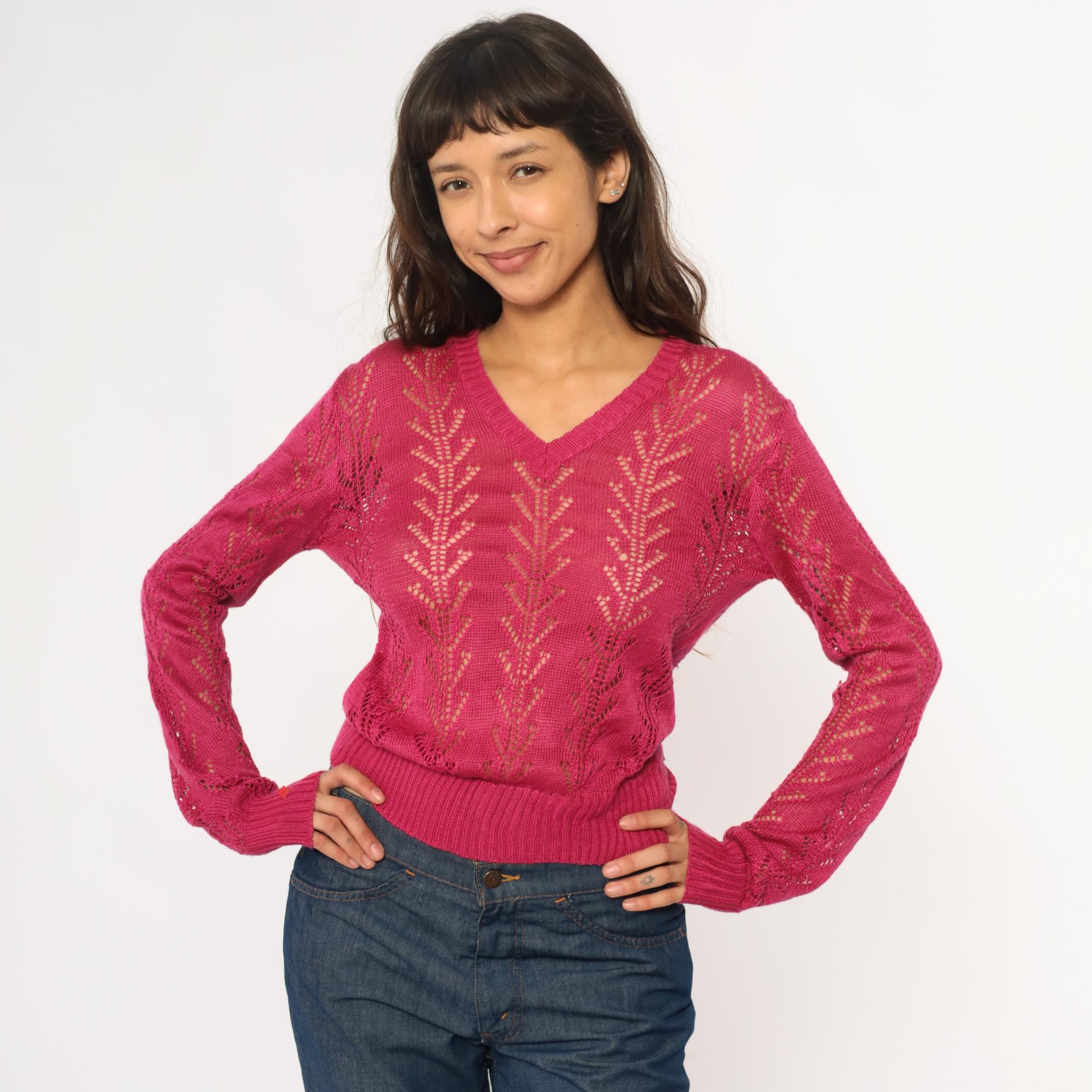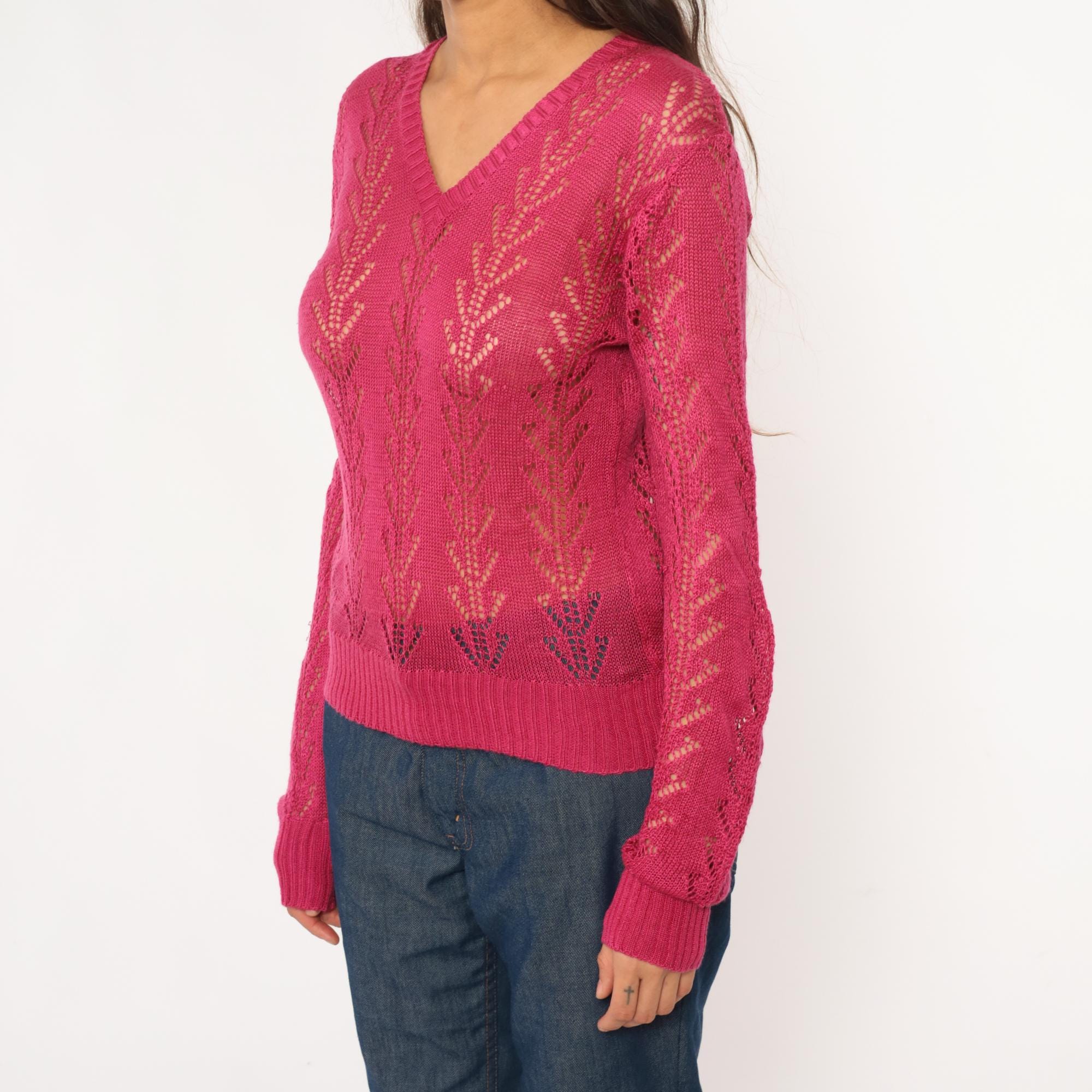 70s hot pink openwork knit sweater from alice kim with chevron lace pattern across the body and sleeves. V-neck with ribbed trim, long sleeves with ribbed cuffs, ribbed hem.