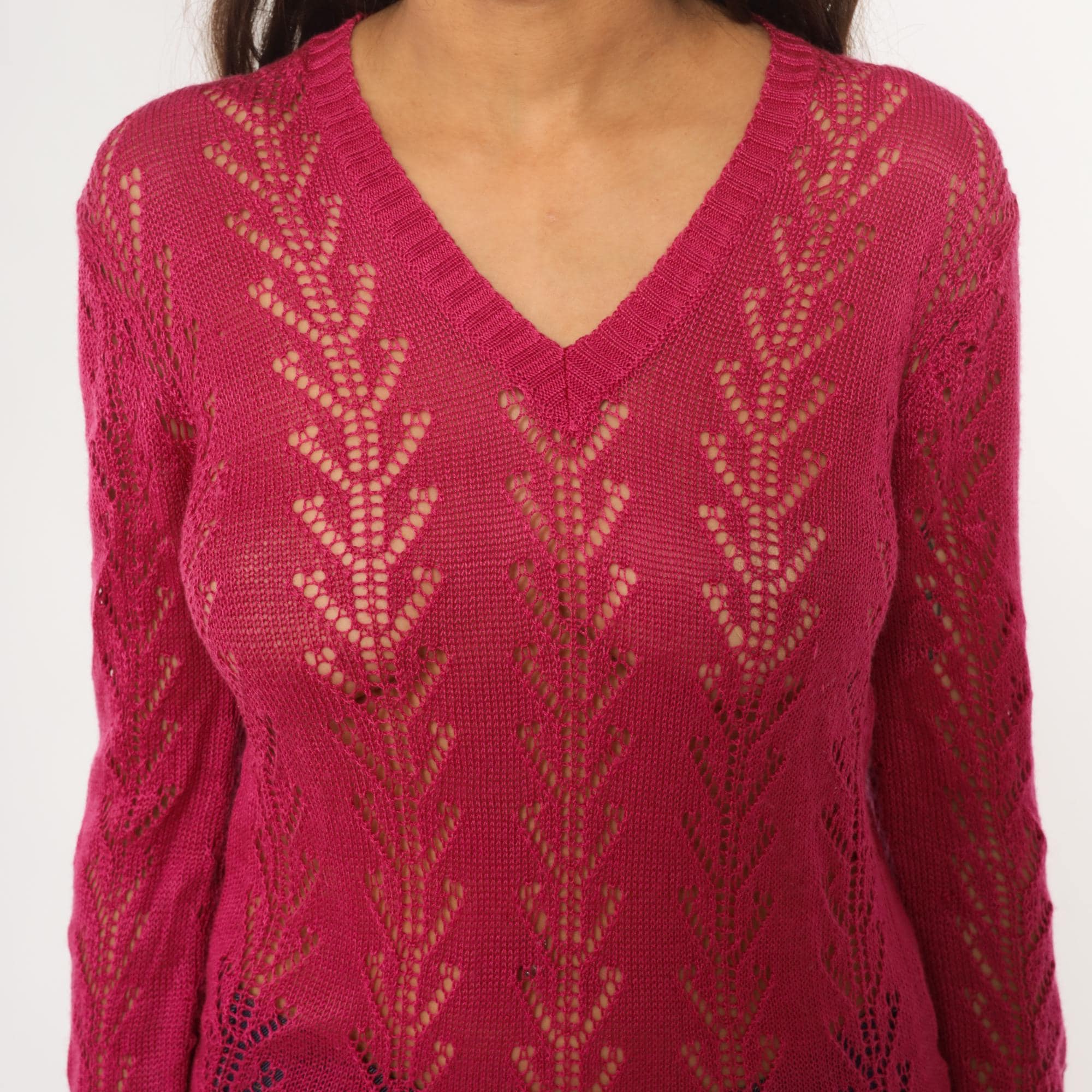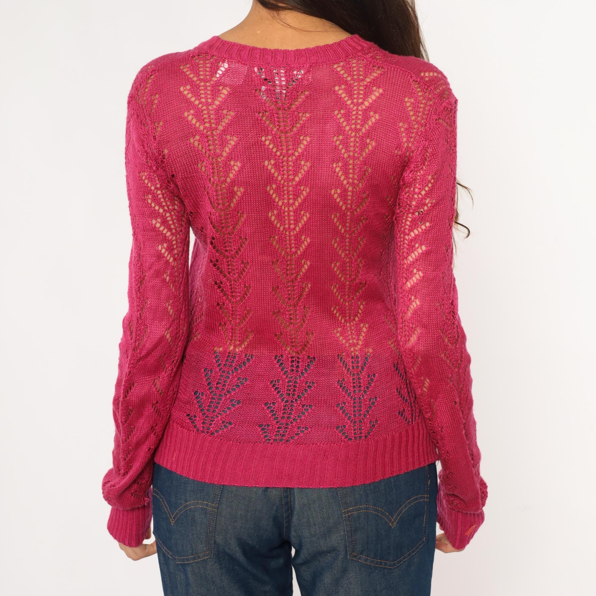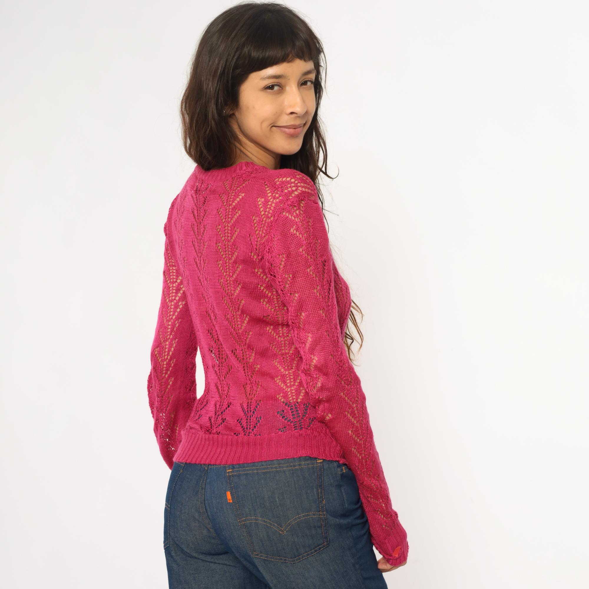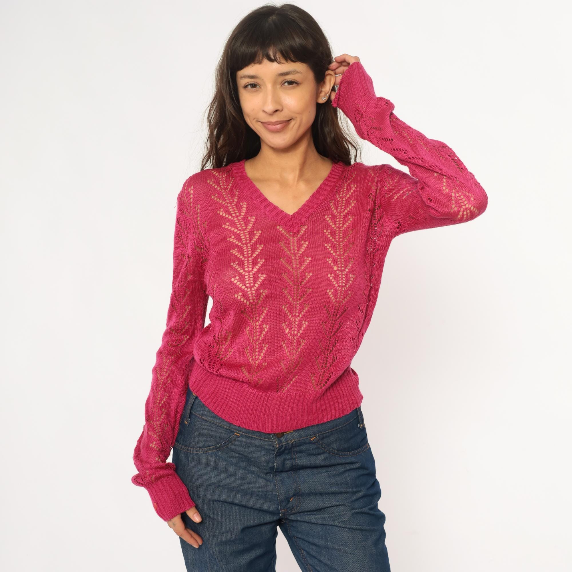 70s hot pink openwork knit sweater from alice kim with chevron lace pattern across the body and sleeves. V-neck with ribbed trim, long sleeves with ribbed cuffs, ribbed hem.