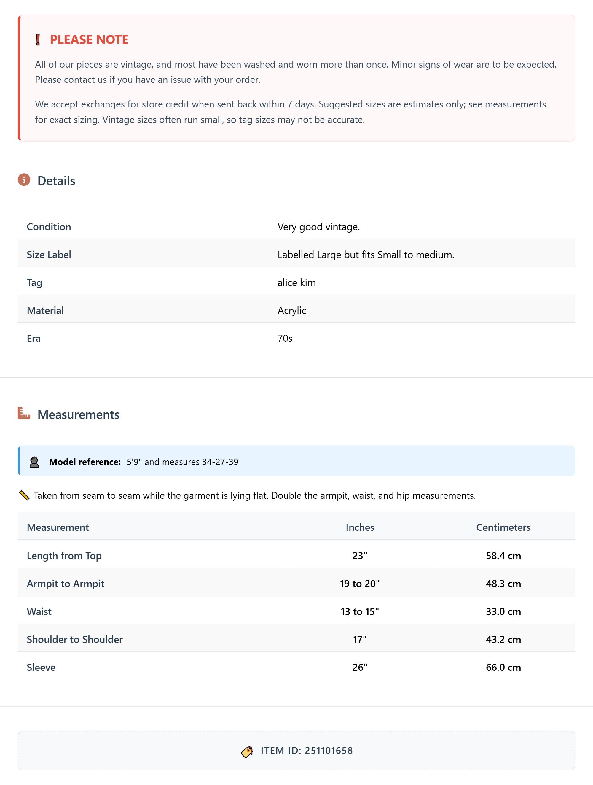 Measurements are taken laying flat and should be doubled where applicable. The "best fits" size is just an estimate, and vintage sizing can vary from modern sizing. Please use measurements to ensure proper fit. The best thing to do is measure a similar item of your own, and compare. When an item has stretch, we will list the unstretched dimensions with the stretched measurement afterwards.