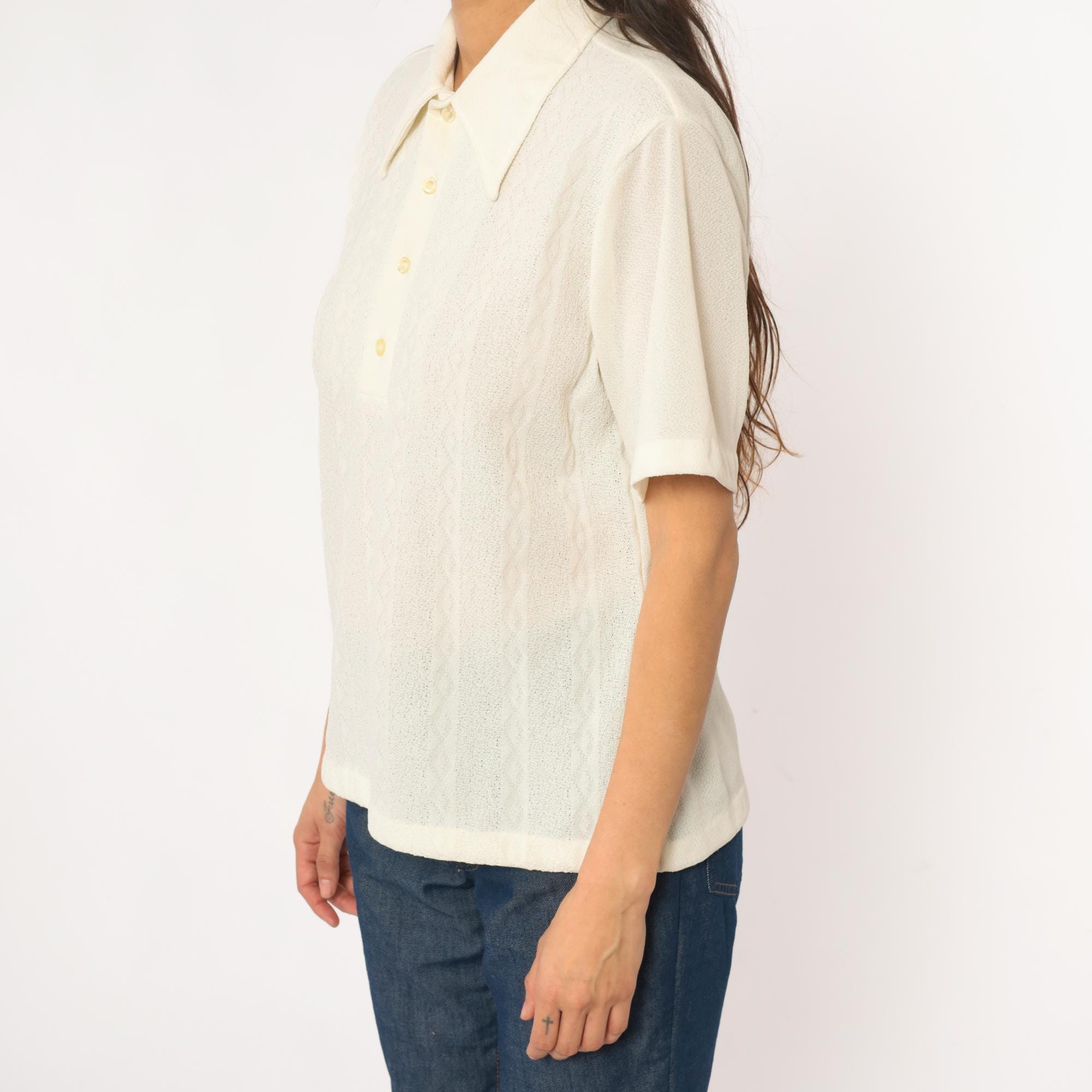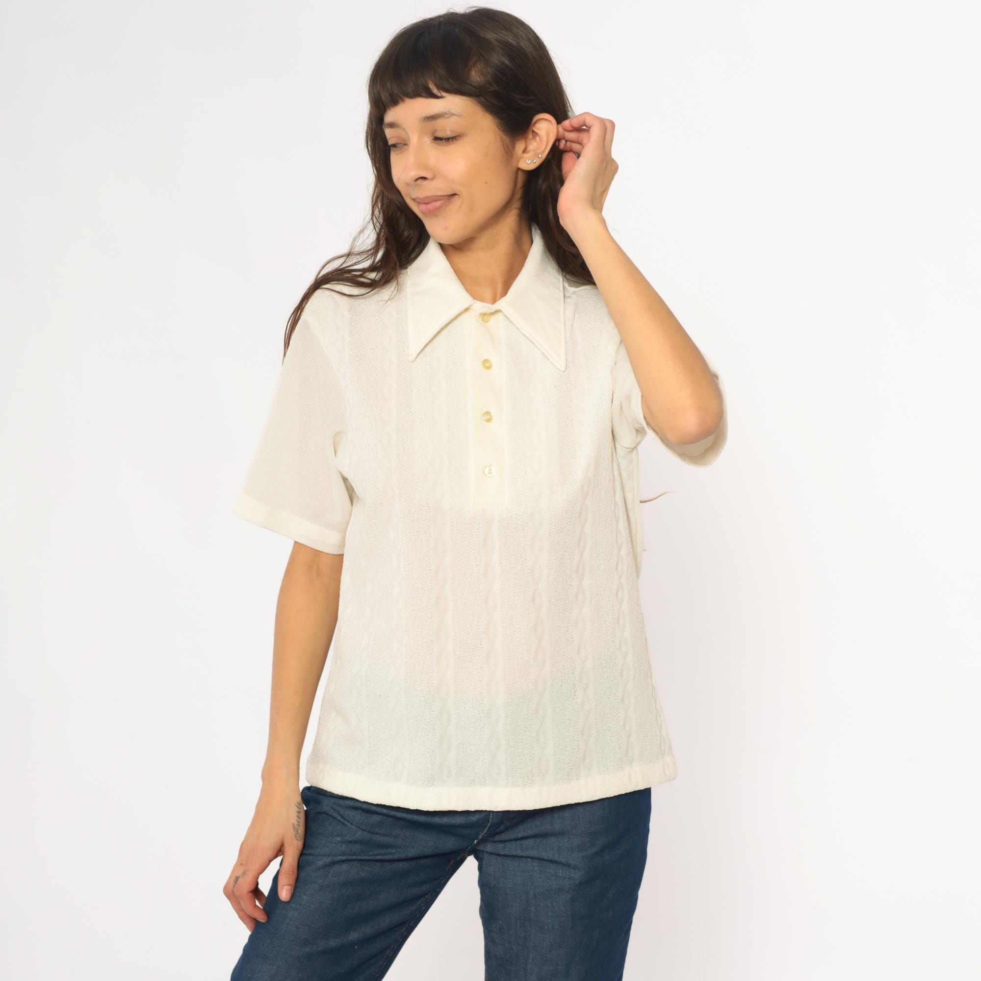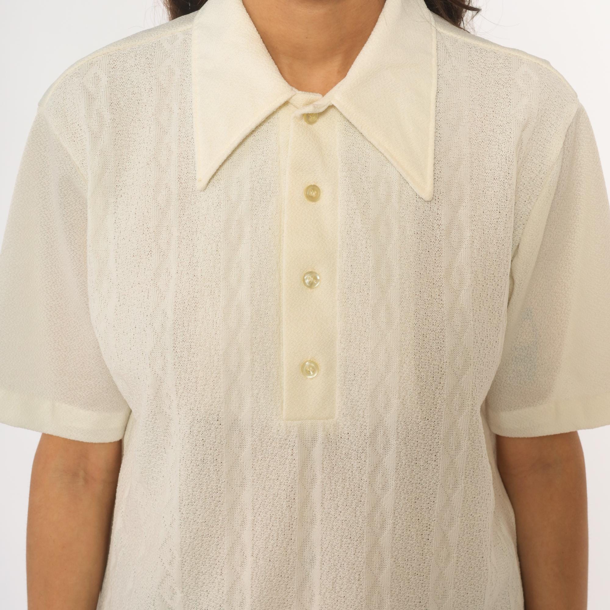 70s cream collared shirt from JC Penney Towncraft with textured vertical ribbed pattern throughout. Wide pointed collar, short sleeves, partial button front closure with three cream buttons.