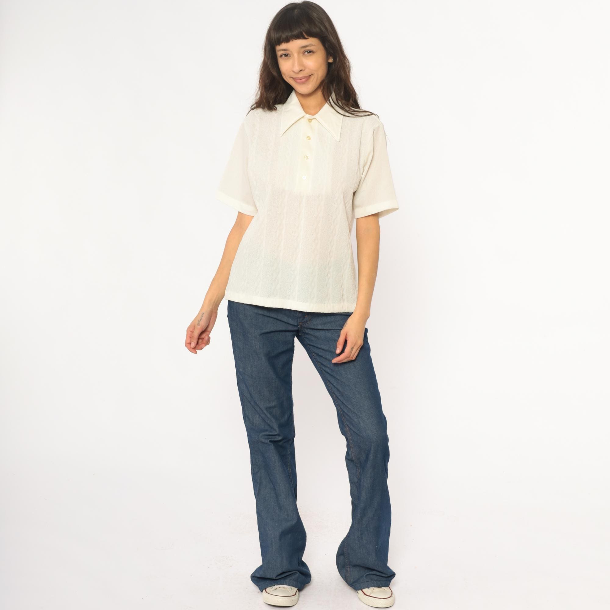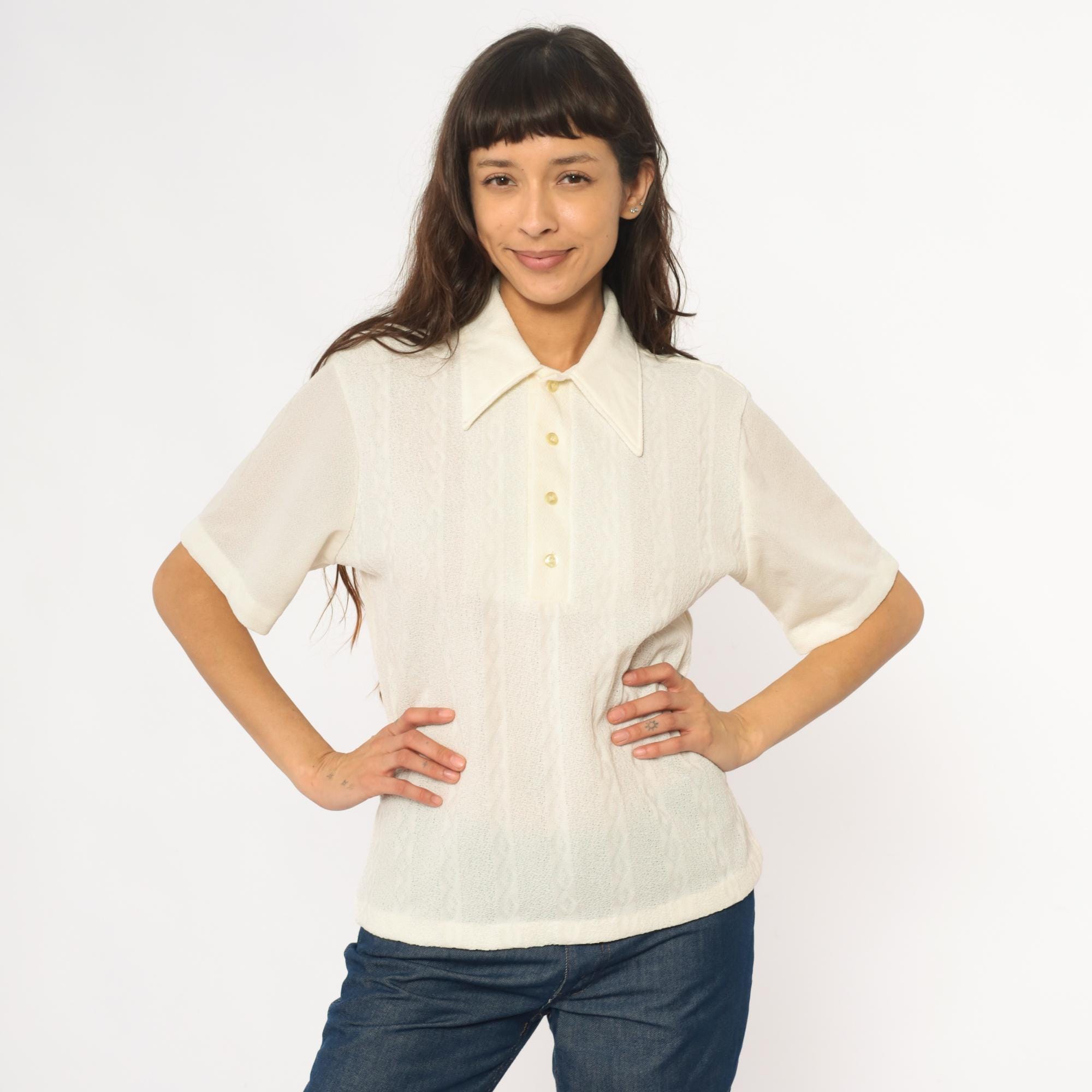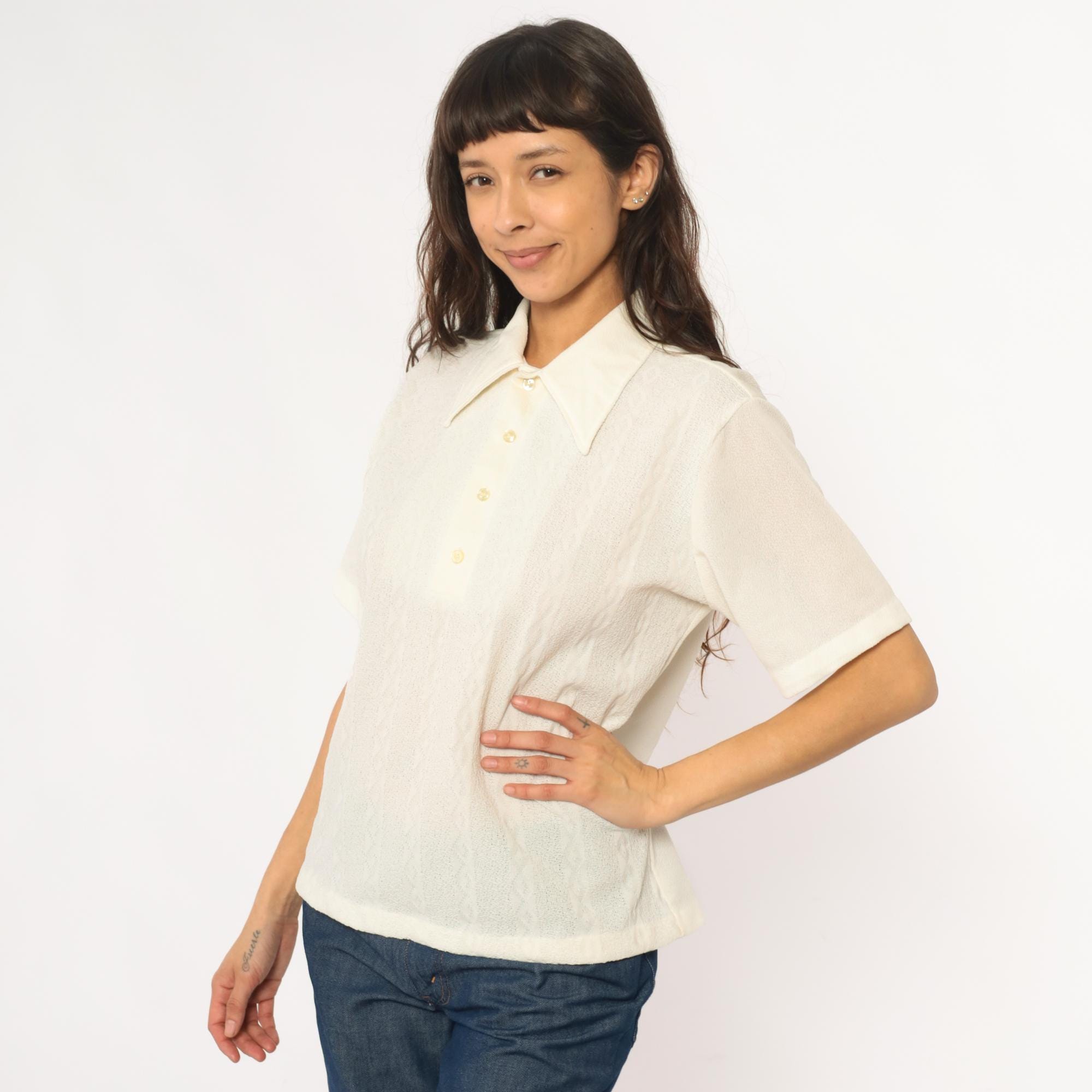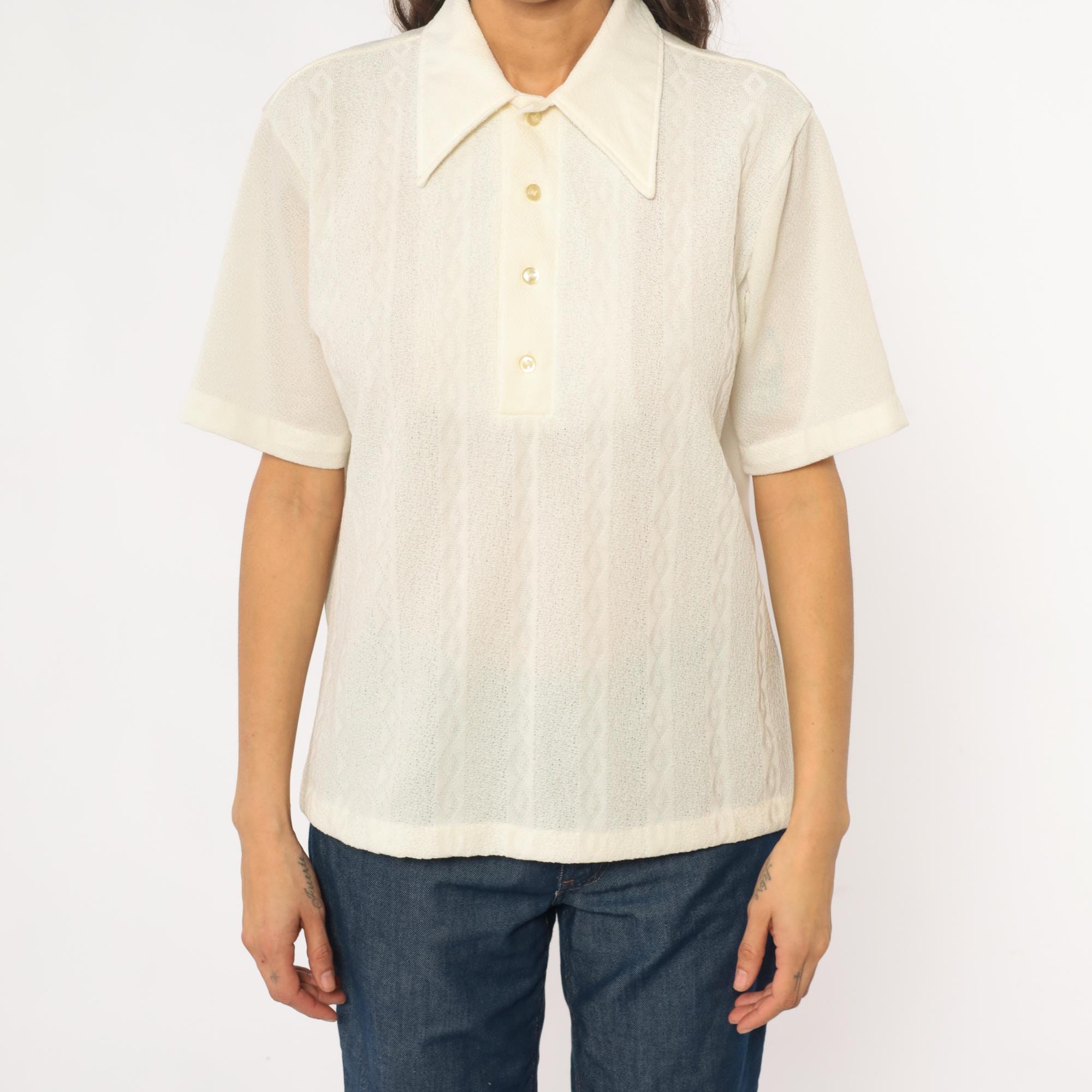 70s cream collared shirt from JC Penney Towncraft with textured vertical ribbed pattern throughout. Wide pointed collar, short sleeves, partial button front closure with three cream buttons.