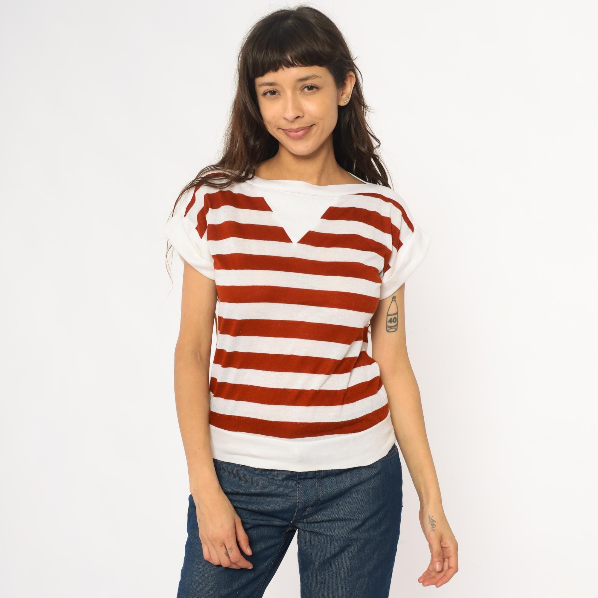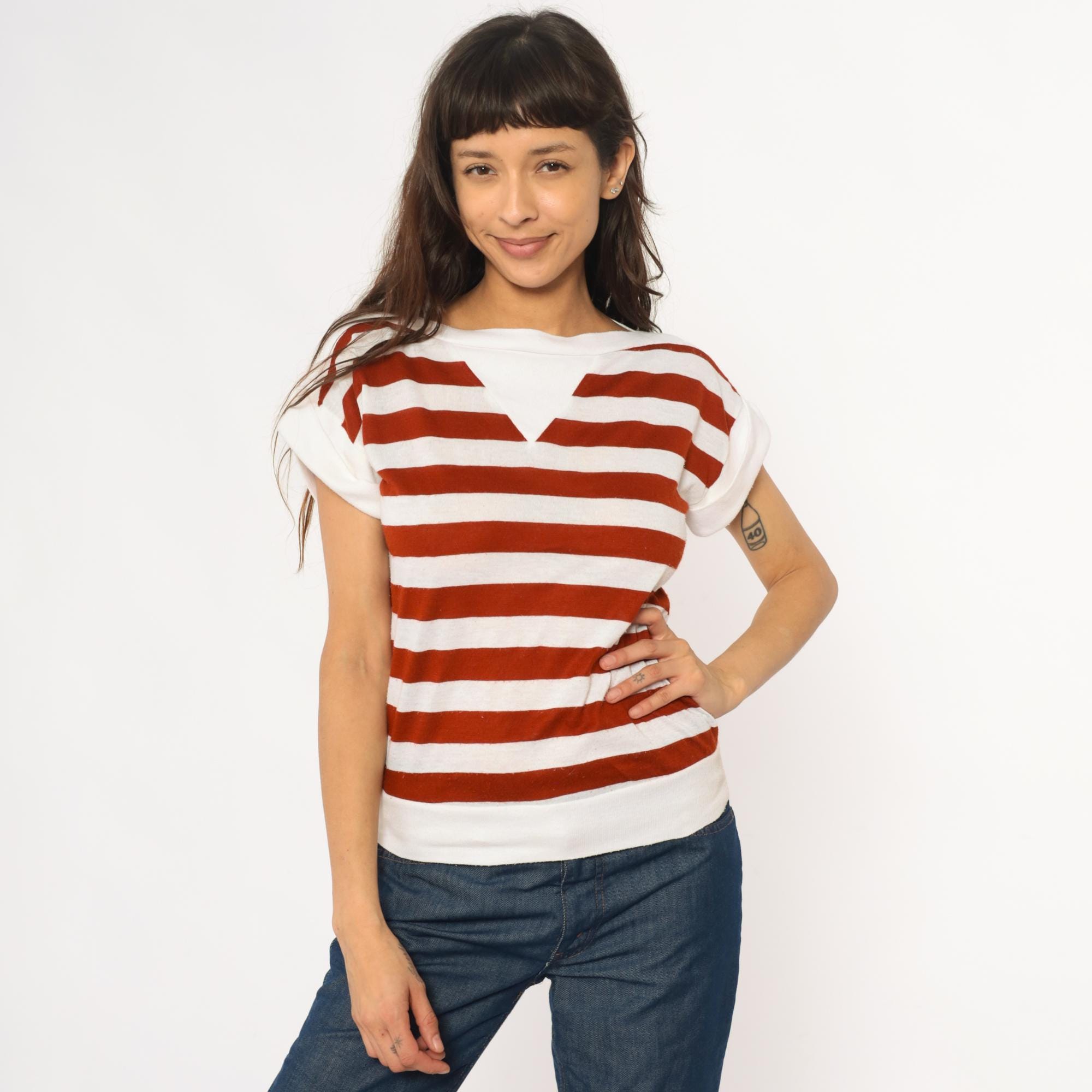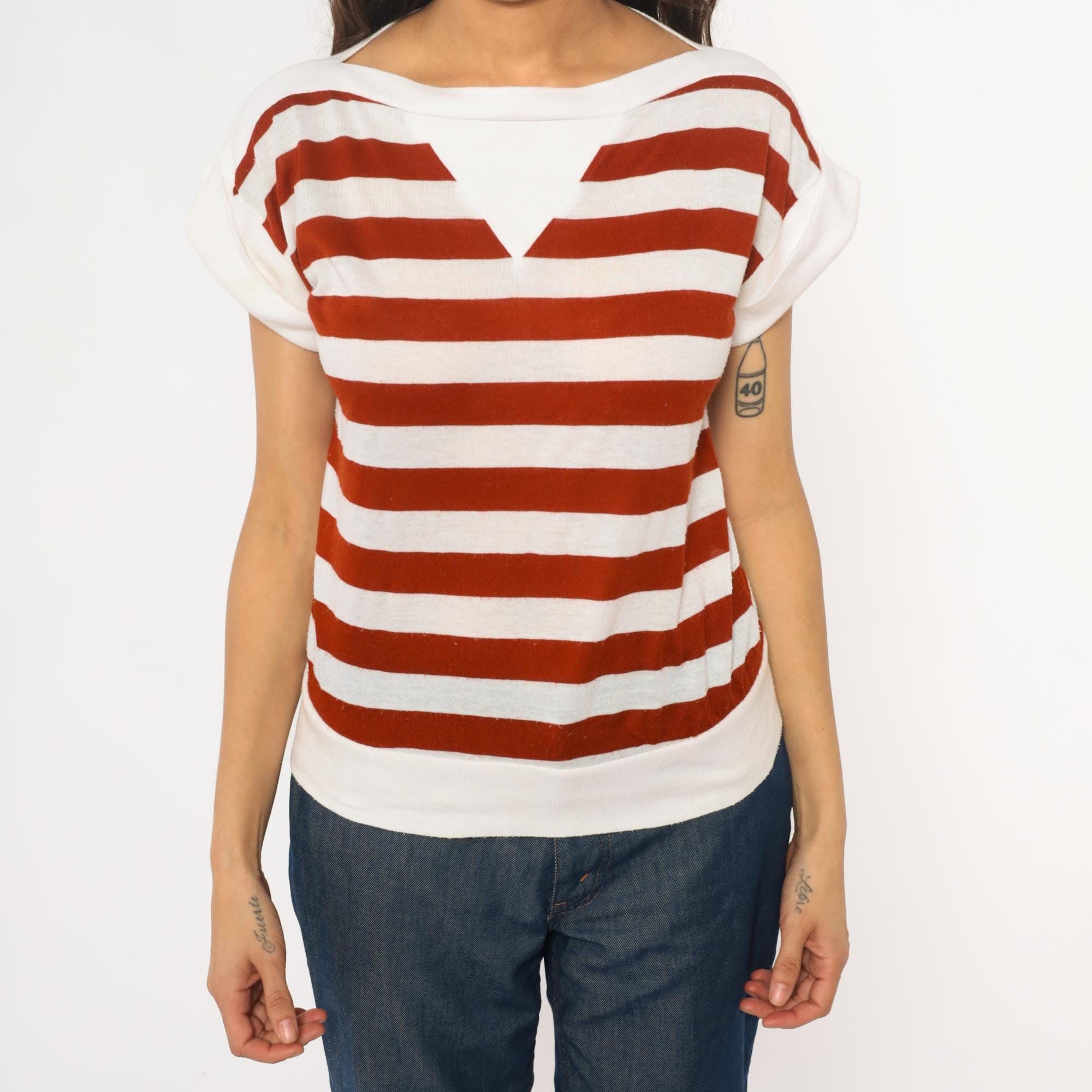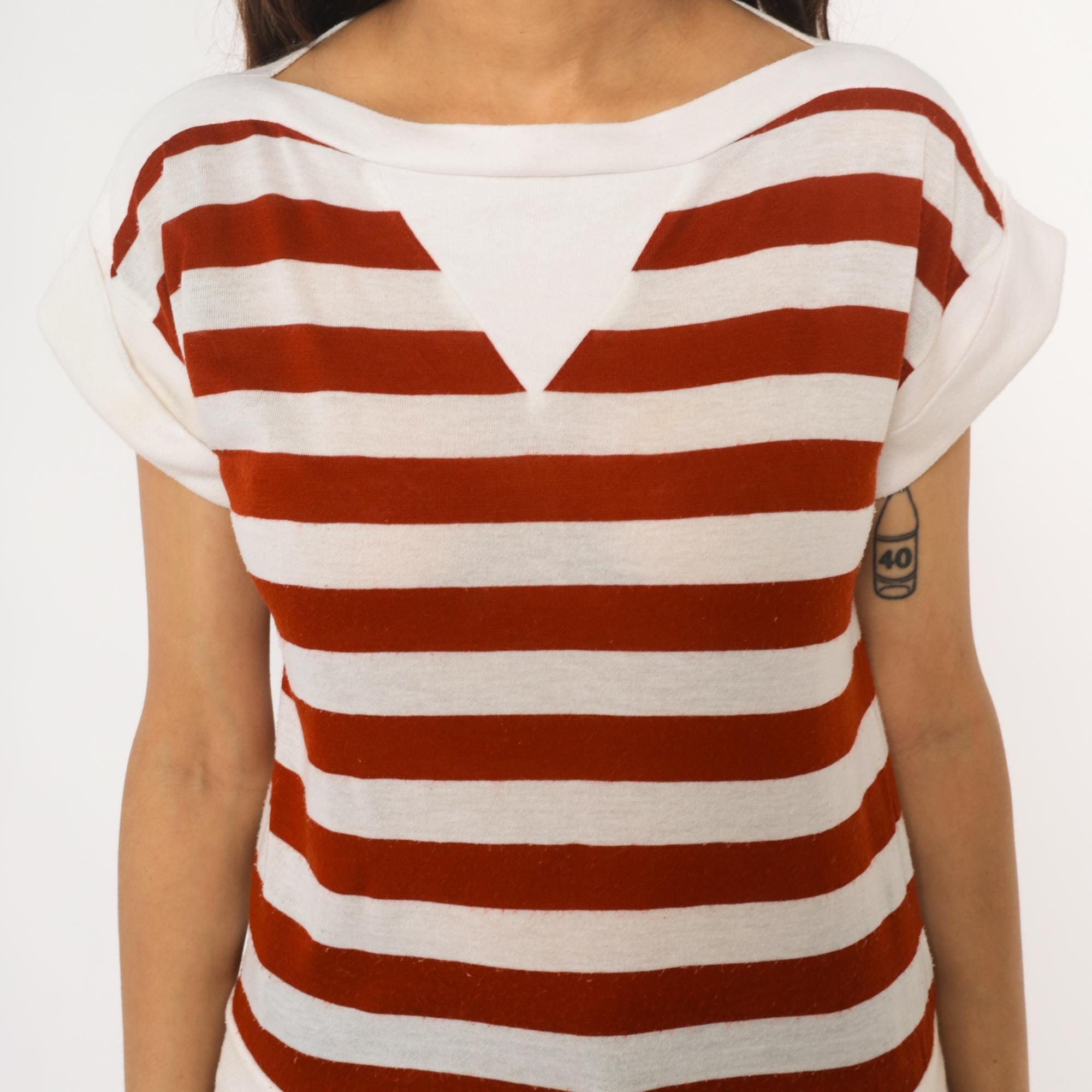 80s rust red and white horizontal striped t-shirt with boat neck and short sleeves in solid white. Wide neckline, relaxed fit through the body, straight hem.