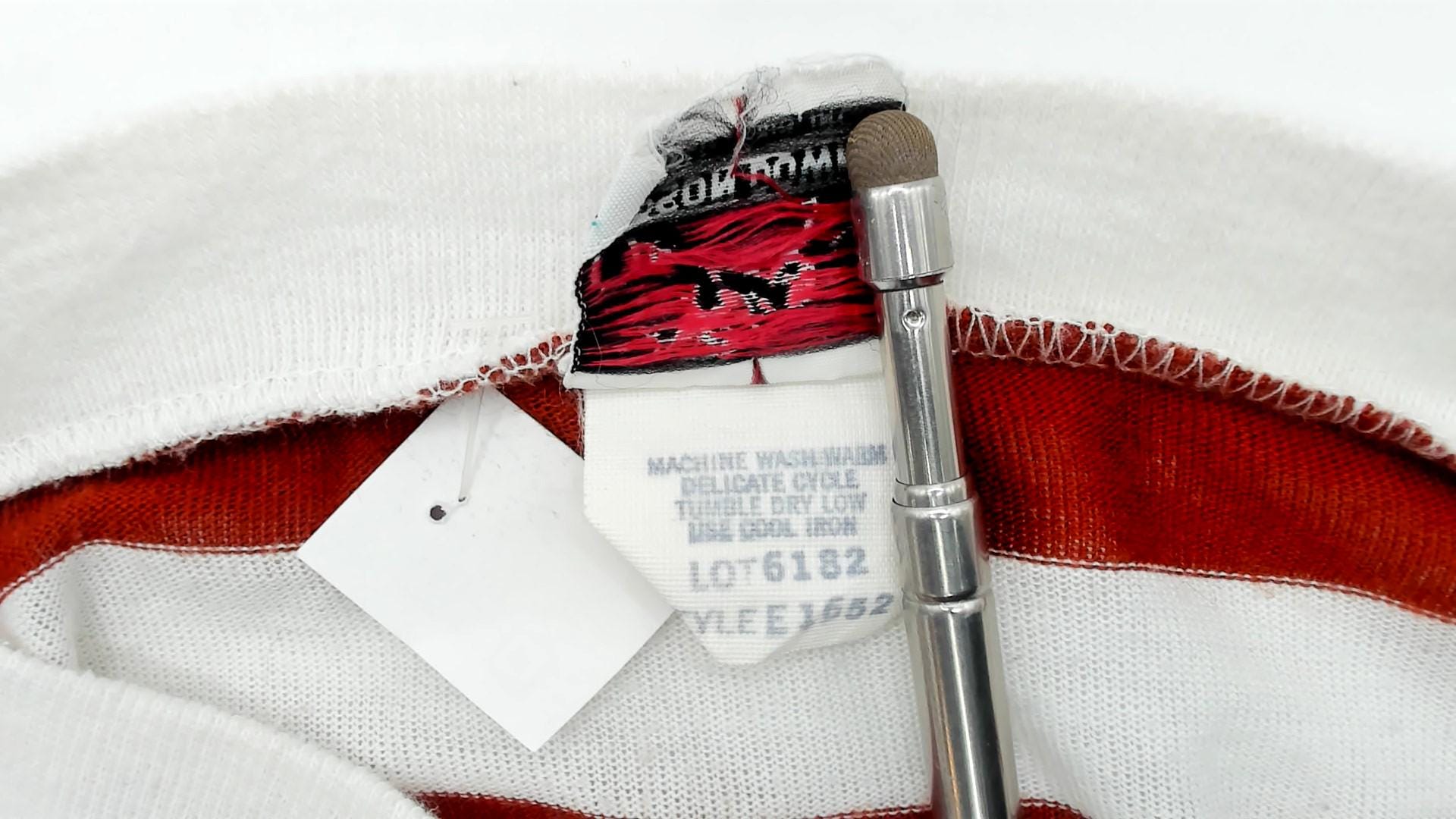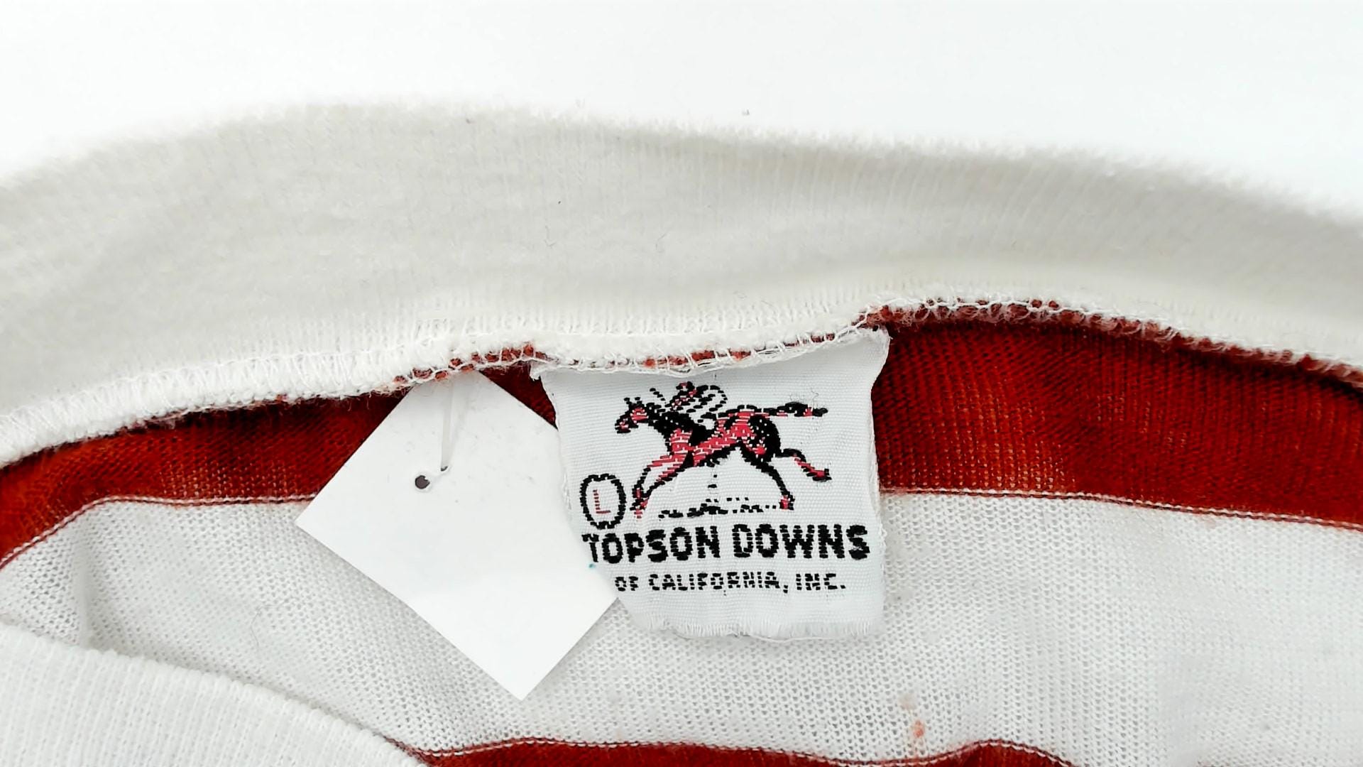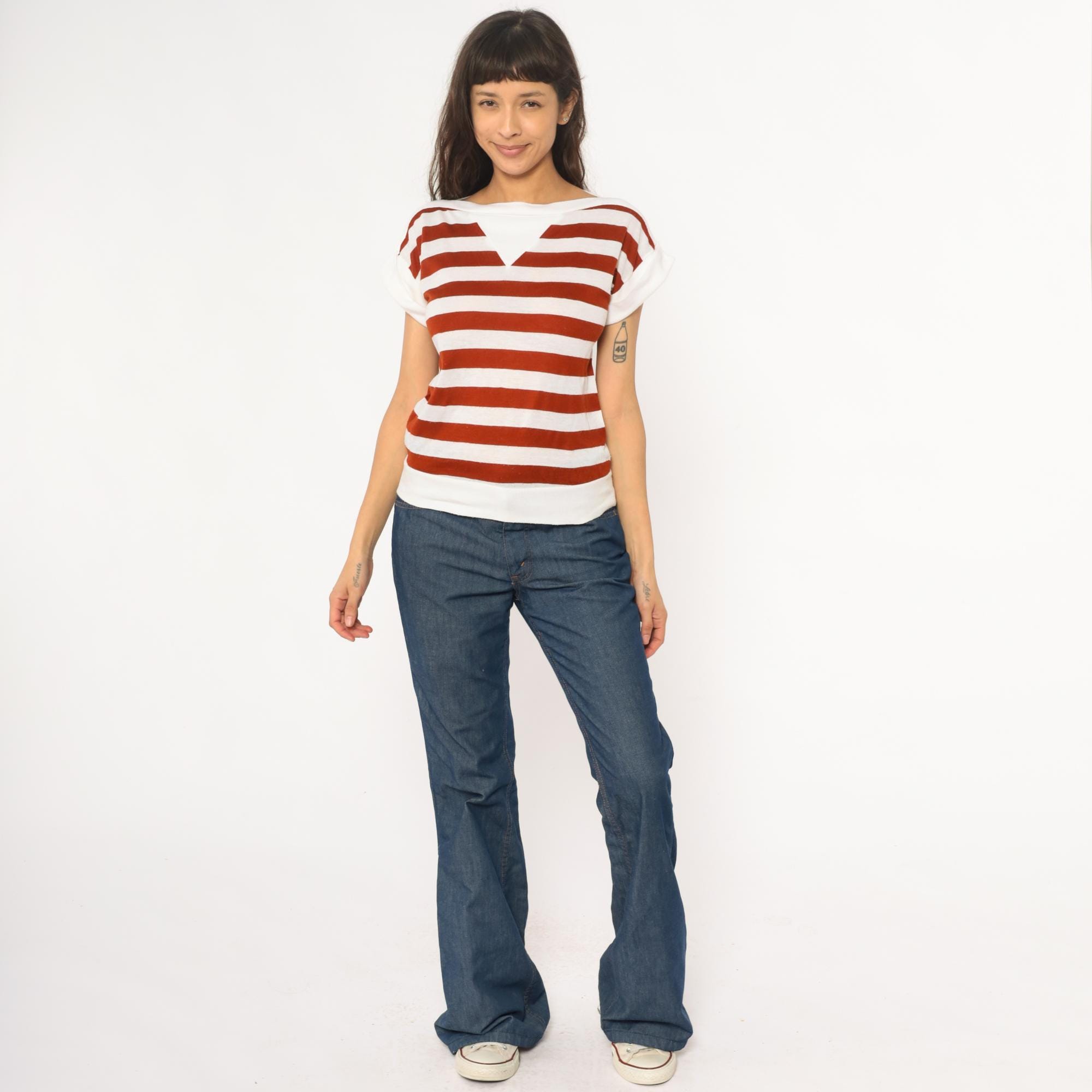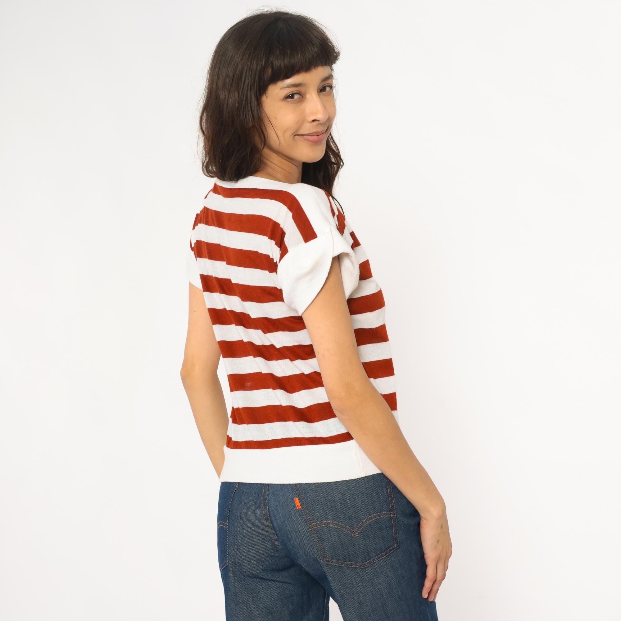 80s rust red and white horizontal striped t-shirt with boat neck and short sleeves in solid white. Wide neckline, relaxed fit through the body, straight hem.