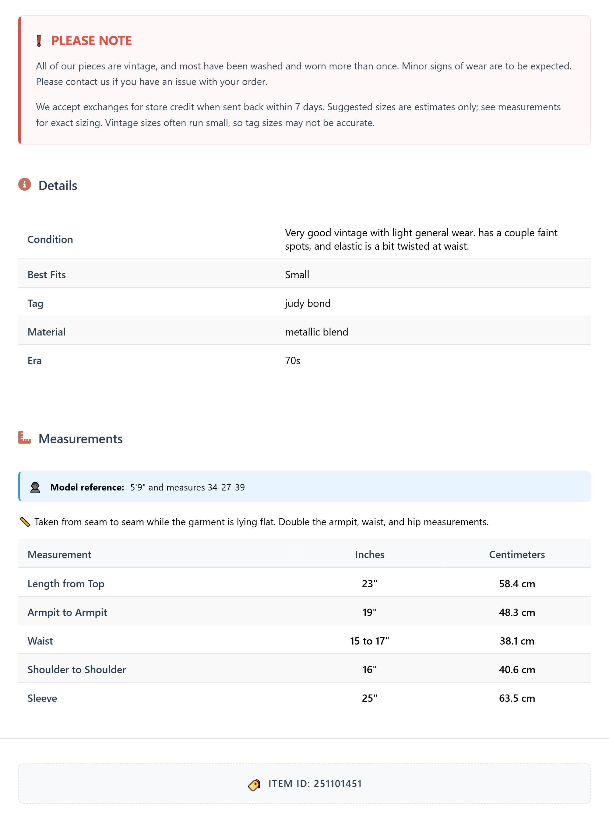 Measurements are taken laying flat and should be doubled where applicable. The "best fits" size is just an estimate, and vintage sizing can vary from modern sizing. Please use measurements to ensure proper fit. The best thing to do is measure a similar item of your own, and compare. When an item has stretch, we will list the unstretched dimensions with the stretched measurement afterwards.