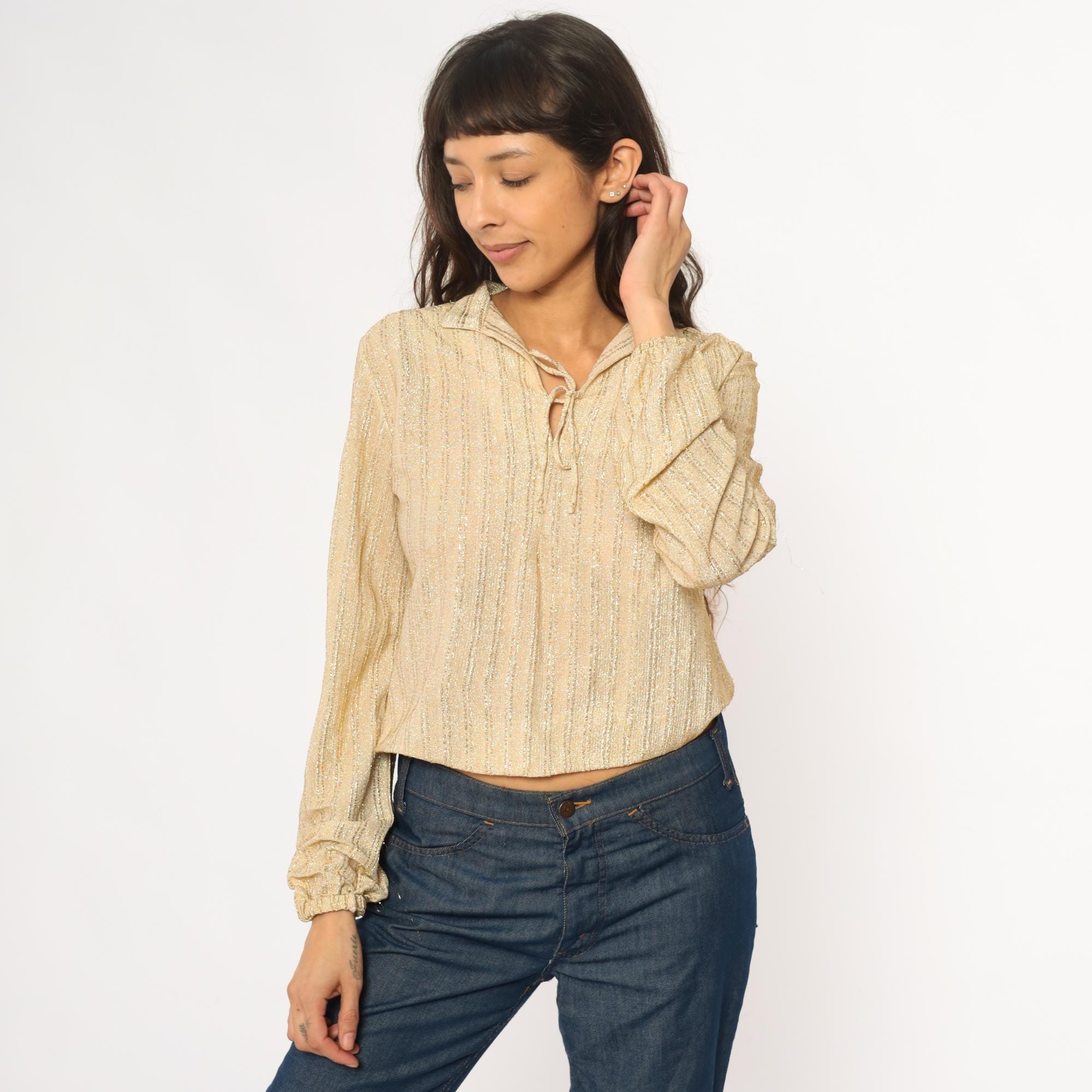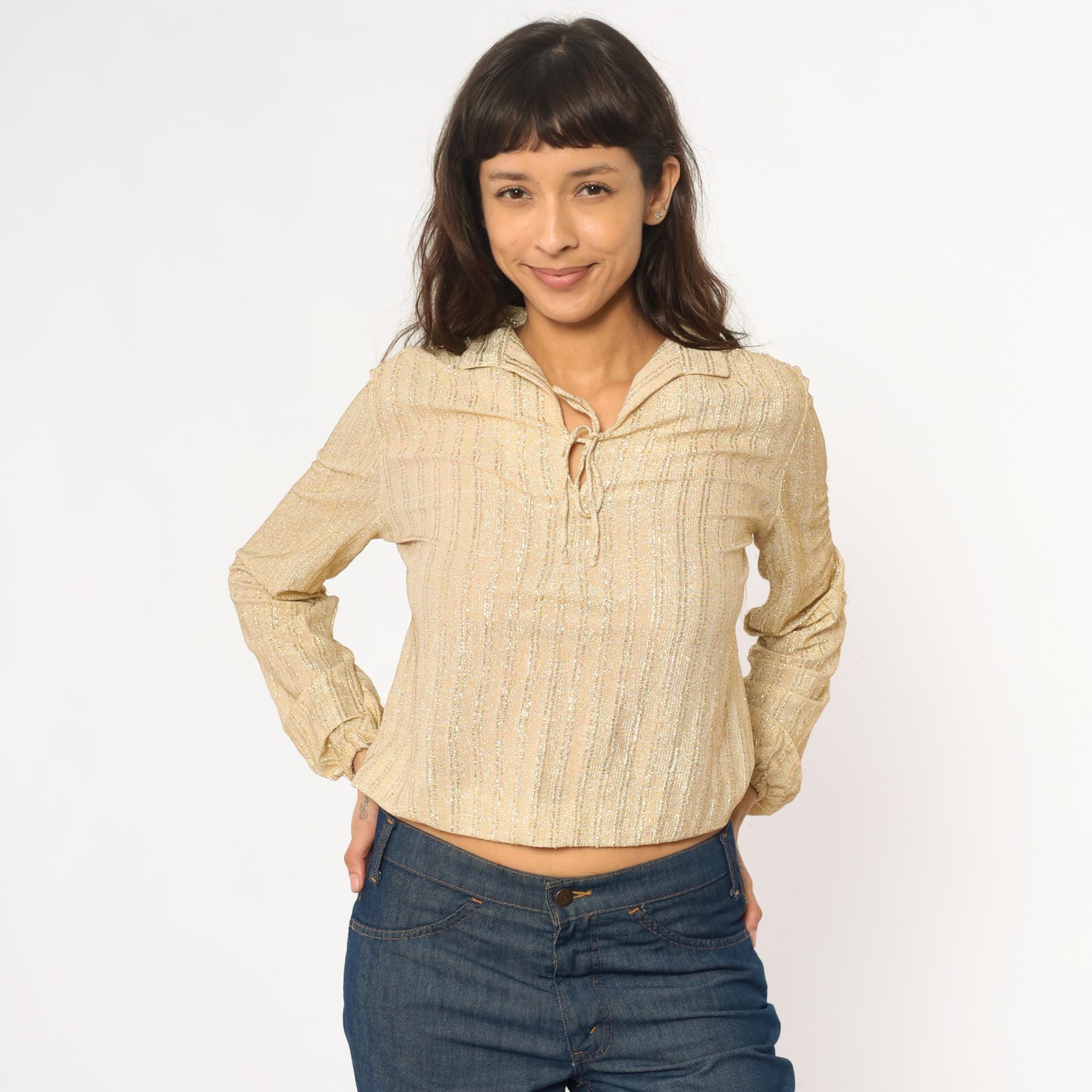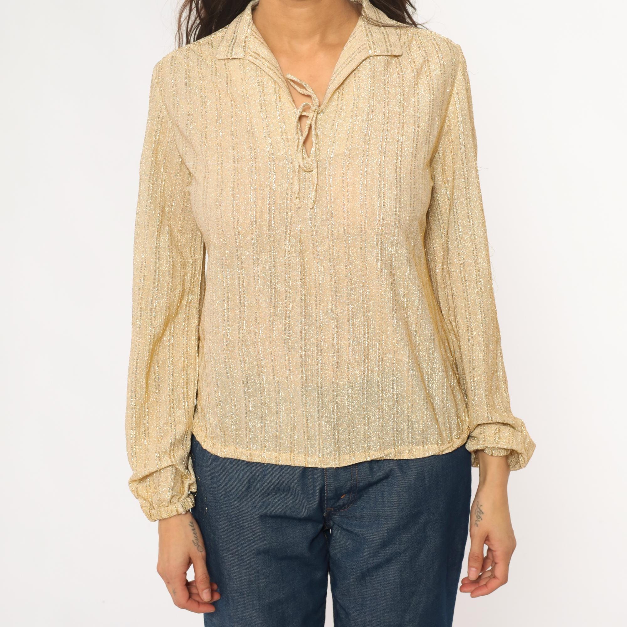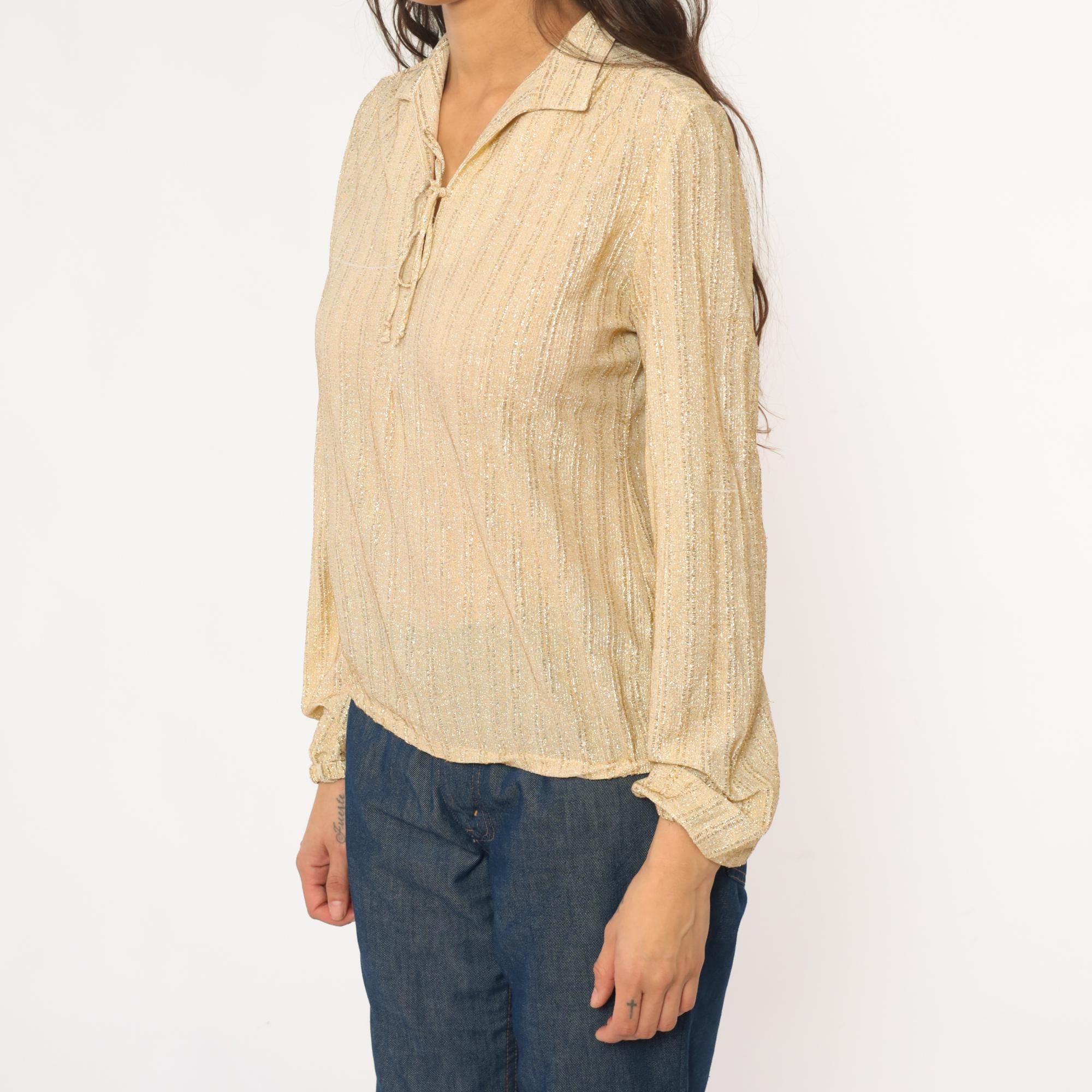 70s champagne gold metallic blouse from judy bond with collared neckline and tie closure at front. Long sleeves with gathered elastic cuffs, ribbed vertical texture throughout the fabric.