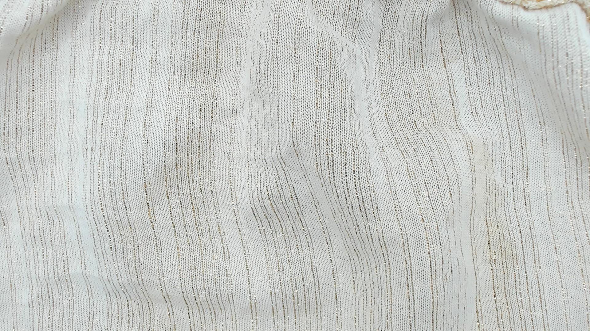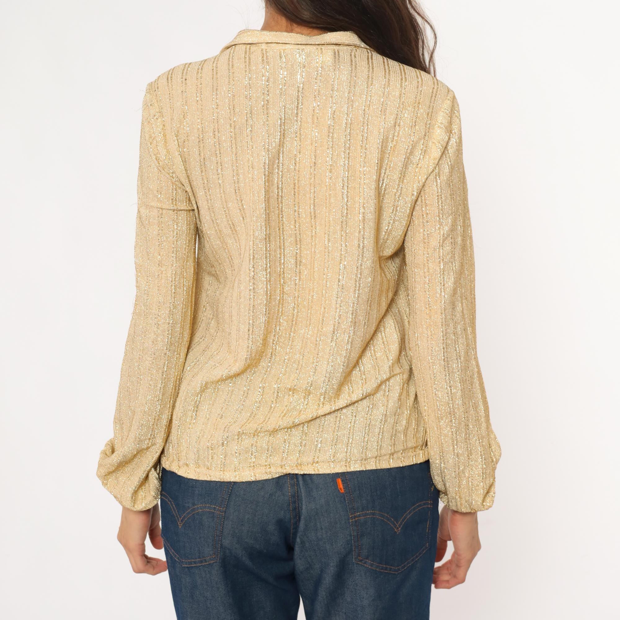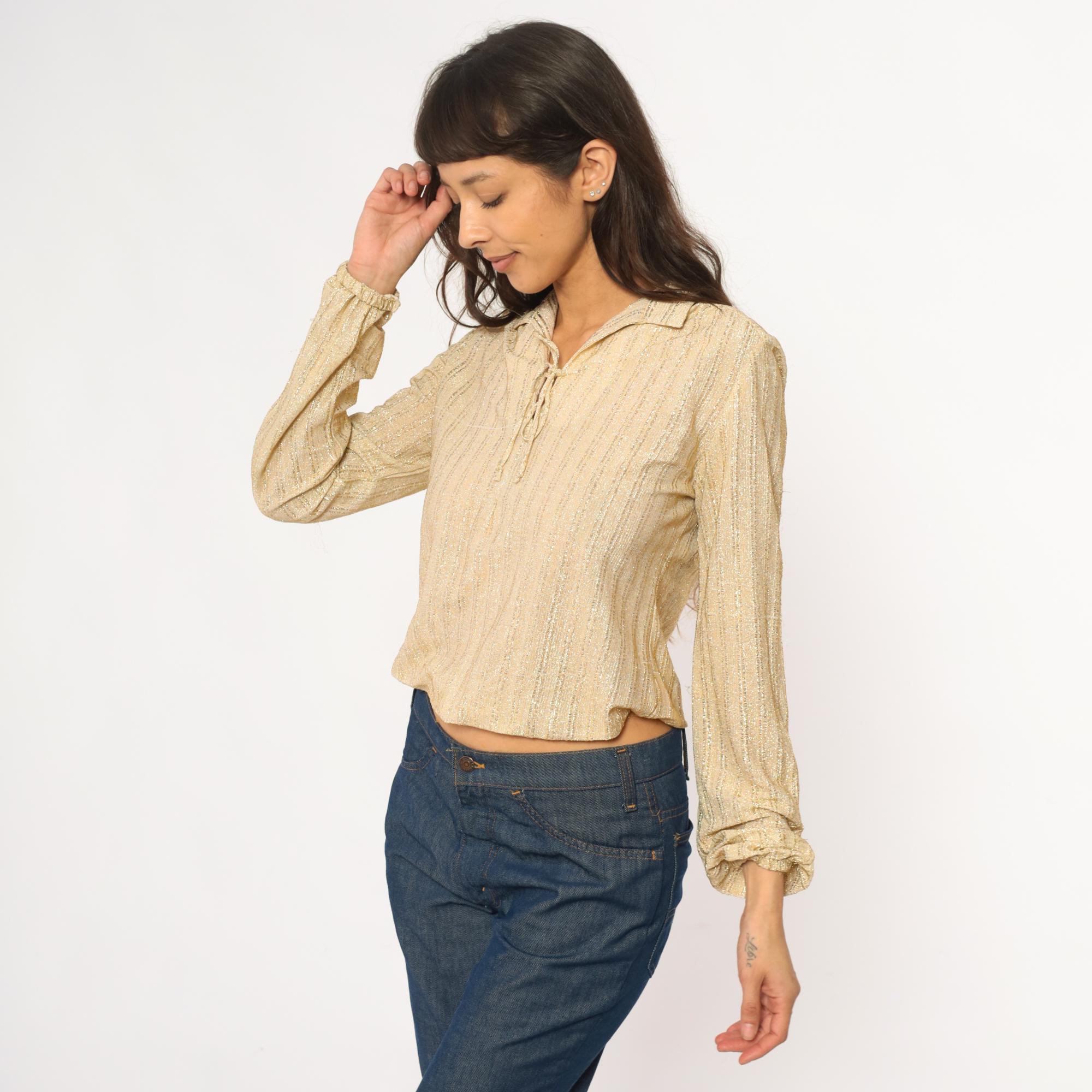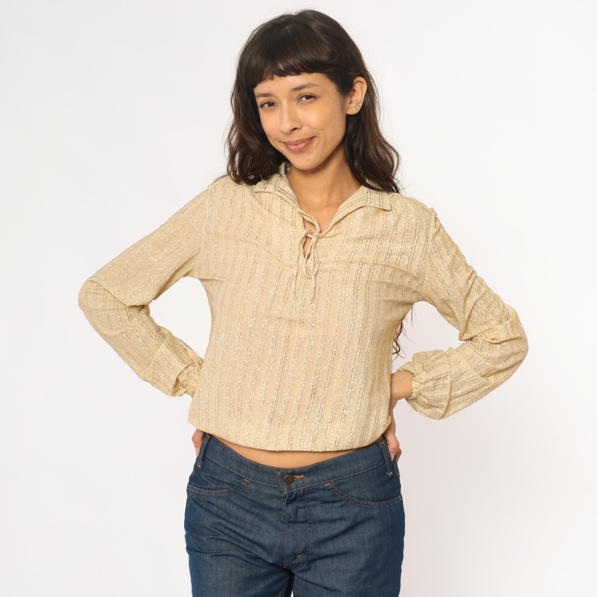70s champagne gold metallic blouse from judy bond with collared neckline and tie closure at front. Long sleeves with gathered elastic cuffs, ribbed vertical texture throughout the fabric.