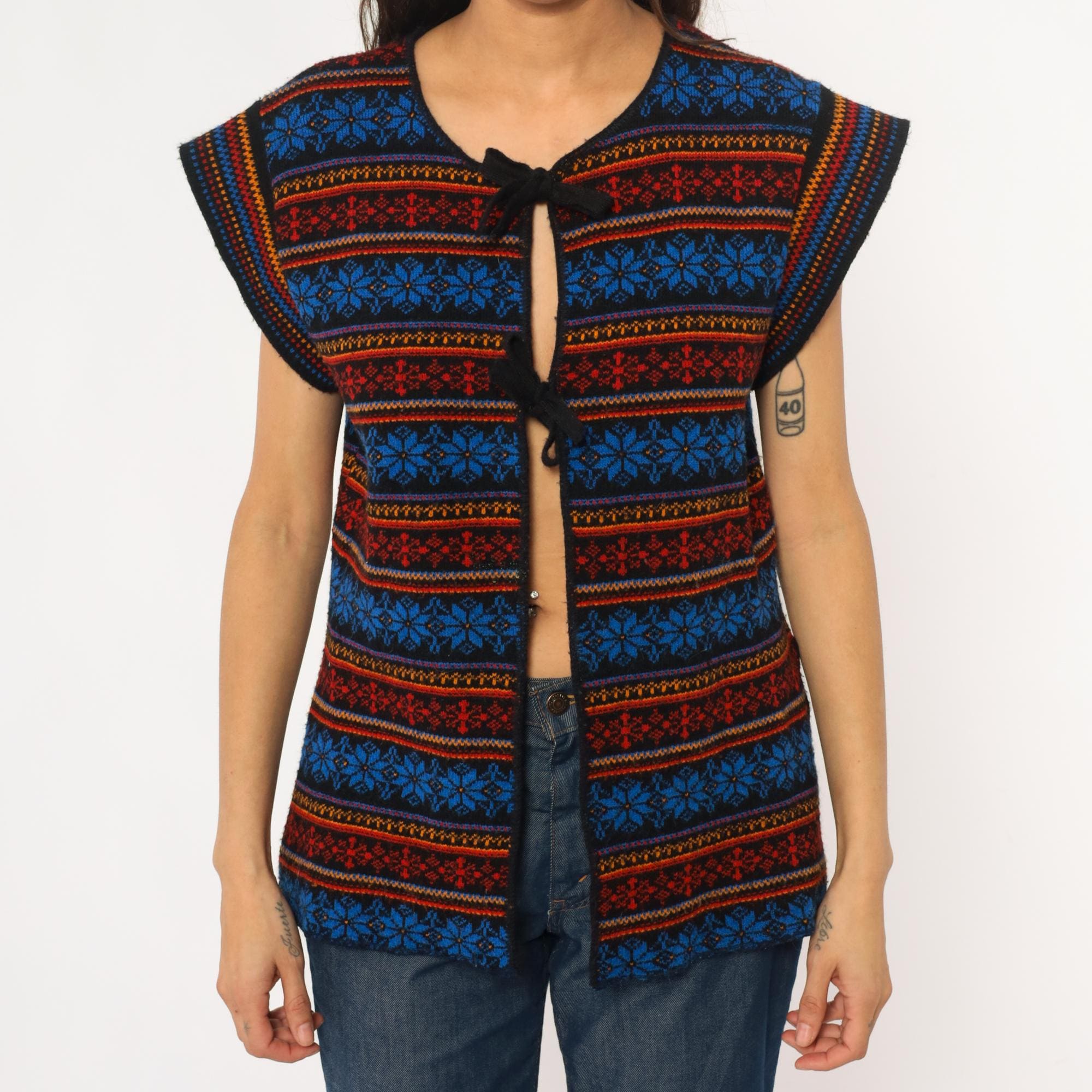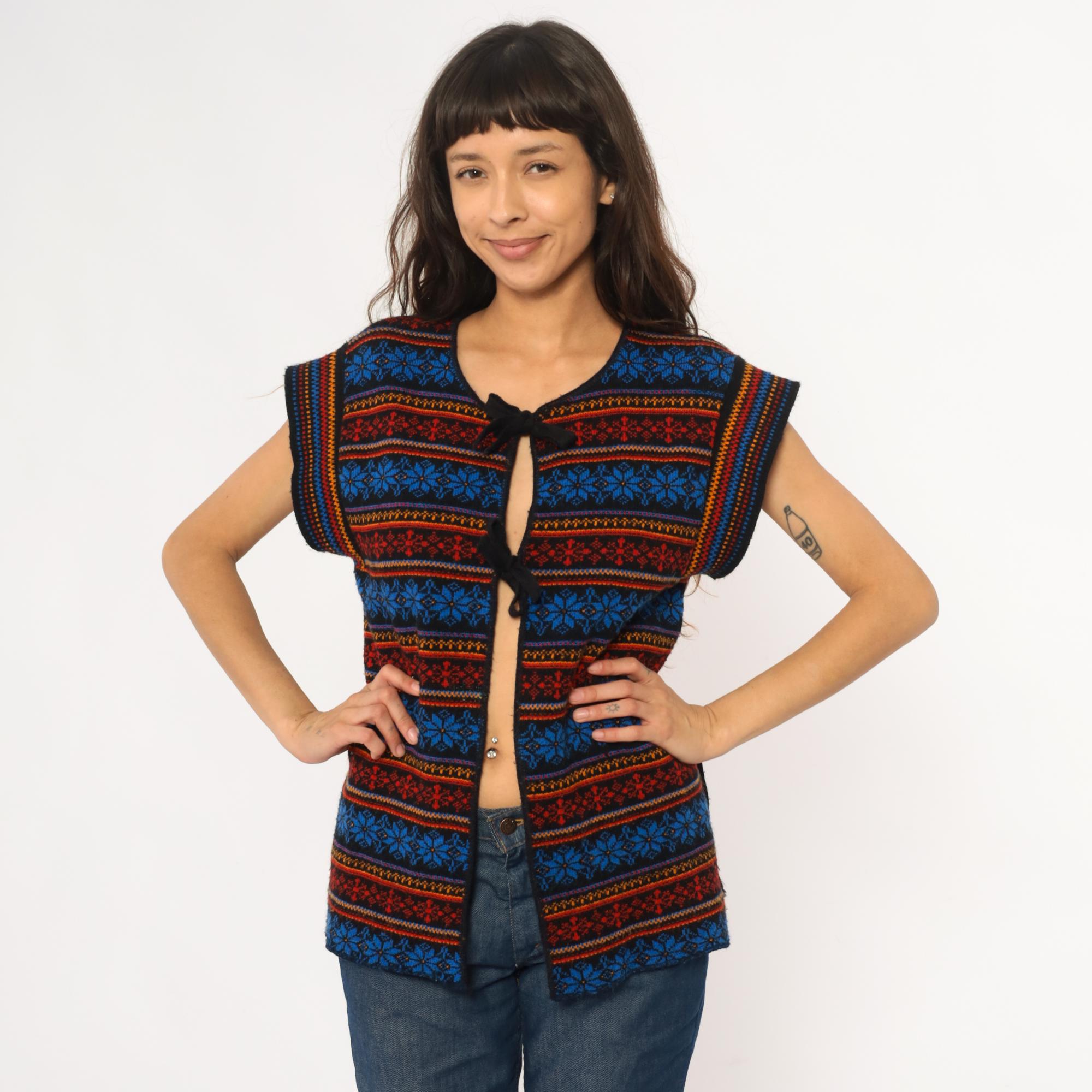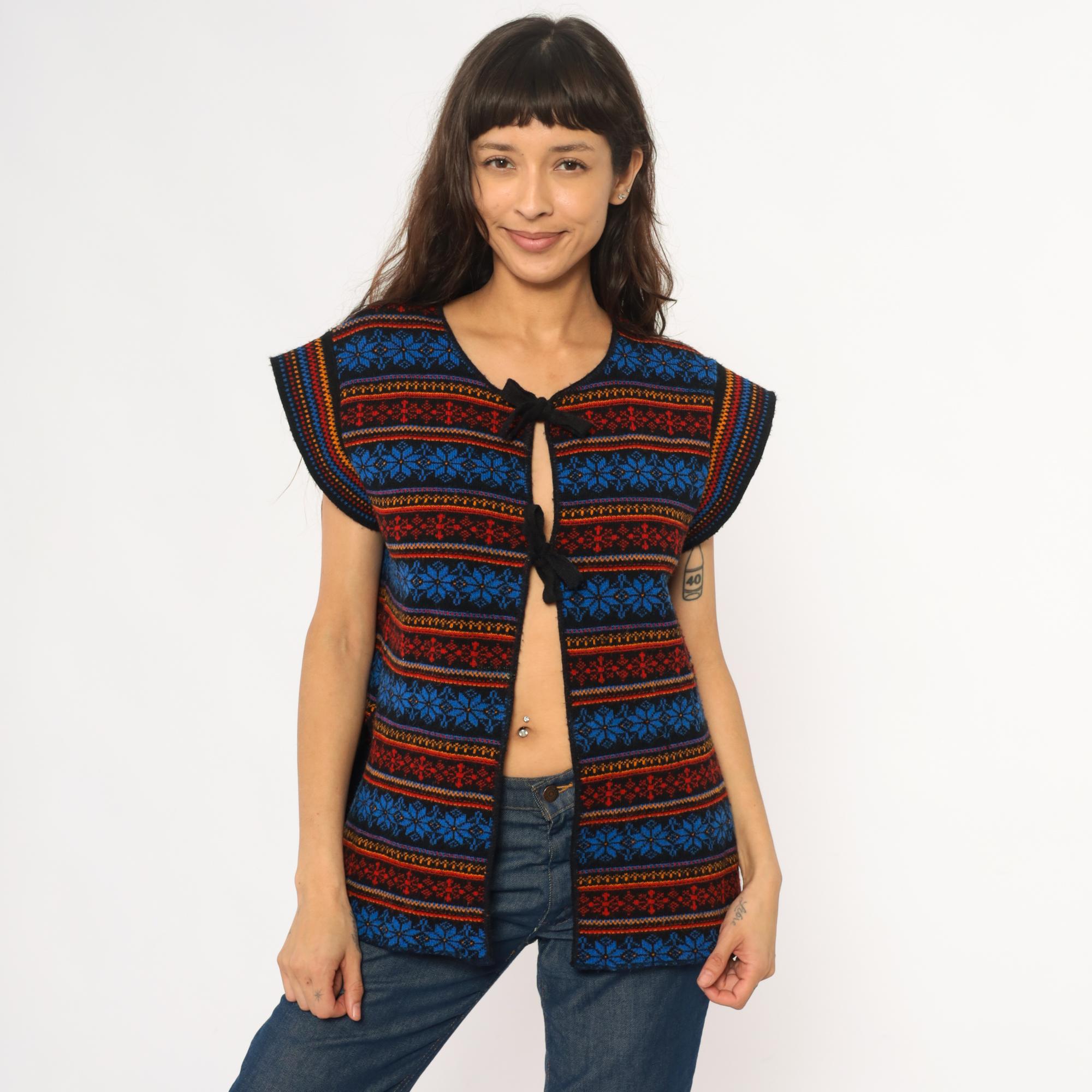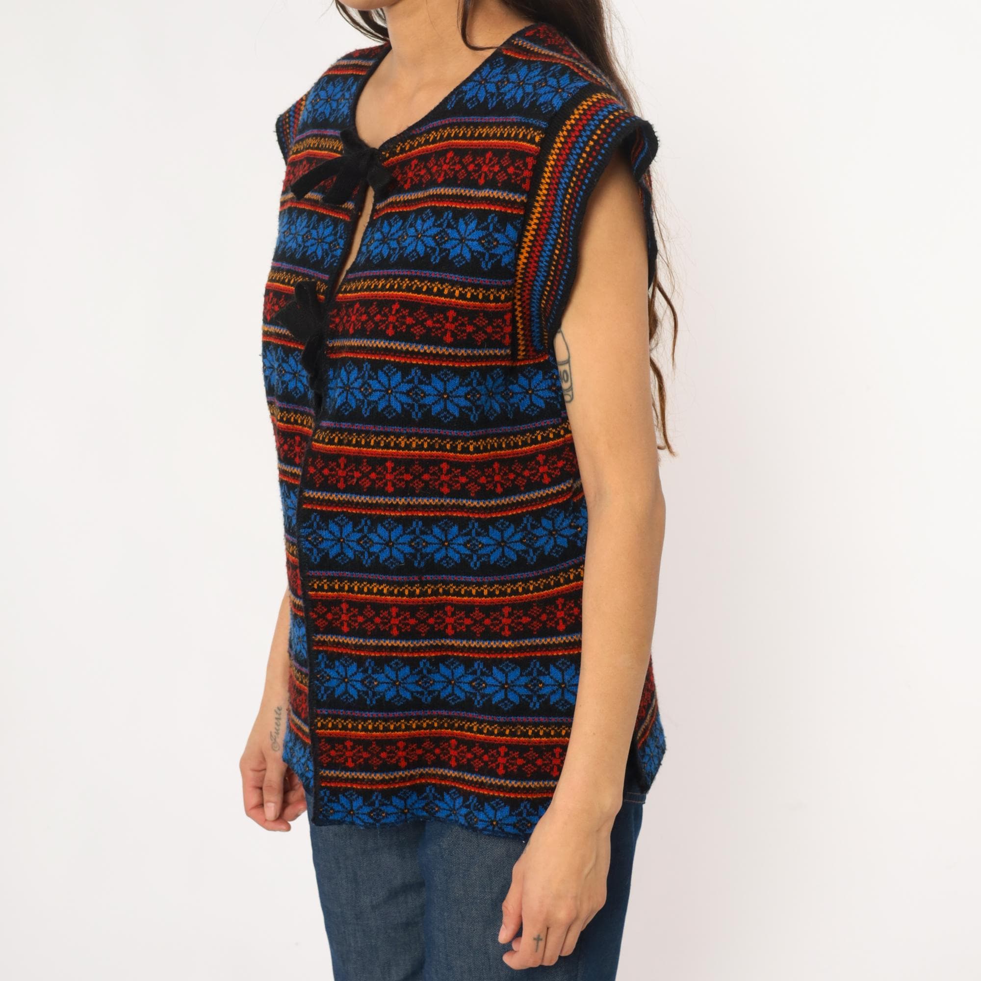 70s acrylic knit vest with horizontal Fair Isle snowflake pattern in alternating bands of royal blue, red, orange, and yellow. Tie front closure with black ribbon ties, black binding at neckline and armholes. Sleeveless silhouette with geometric snowflake motifs throughout.