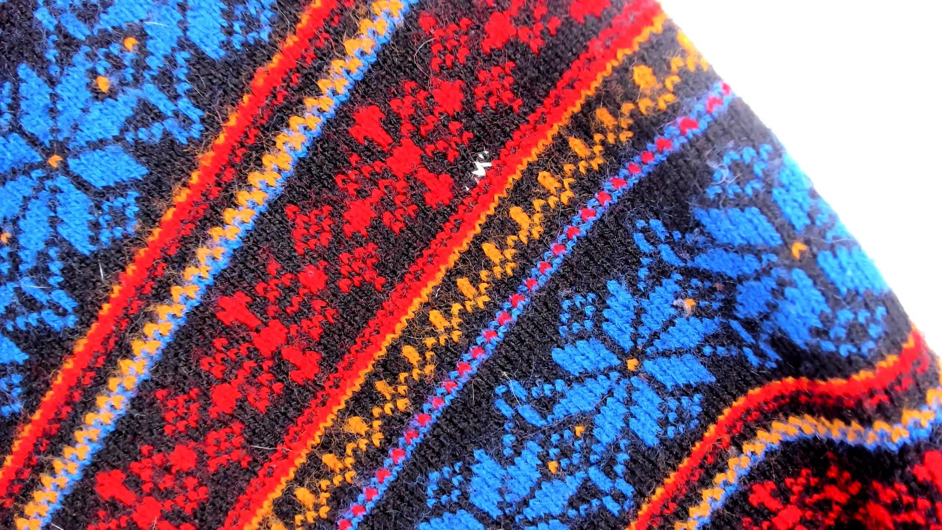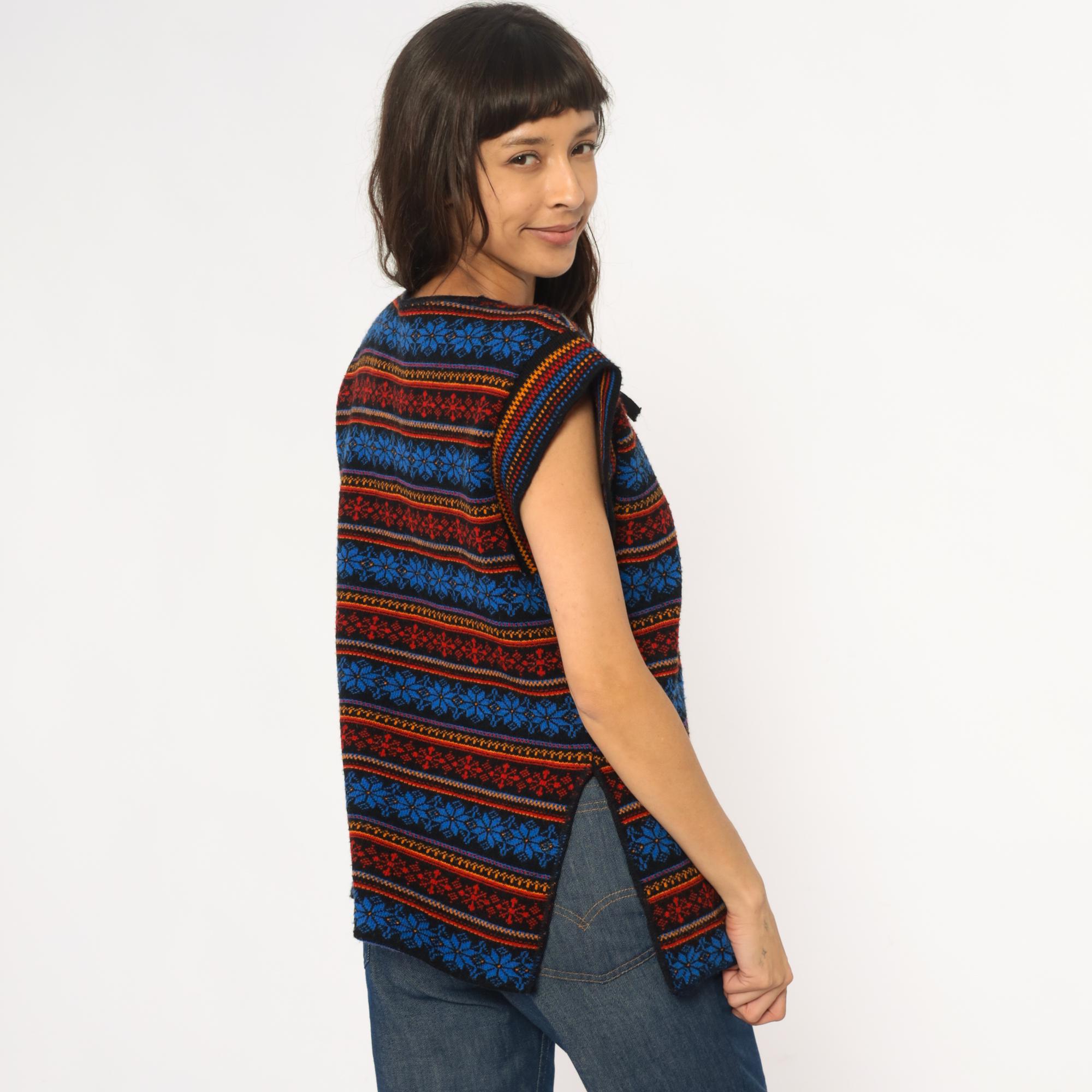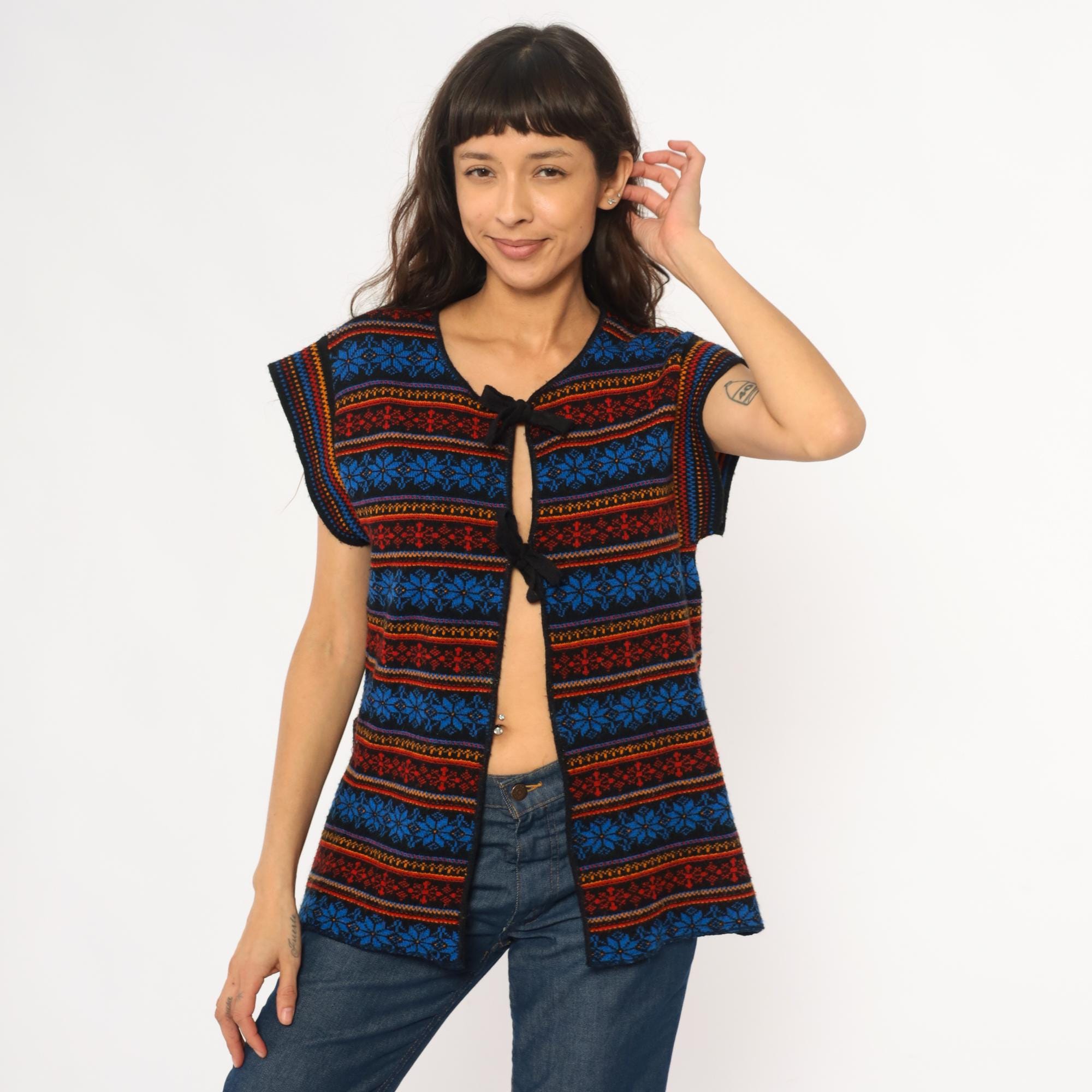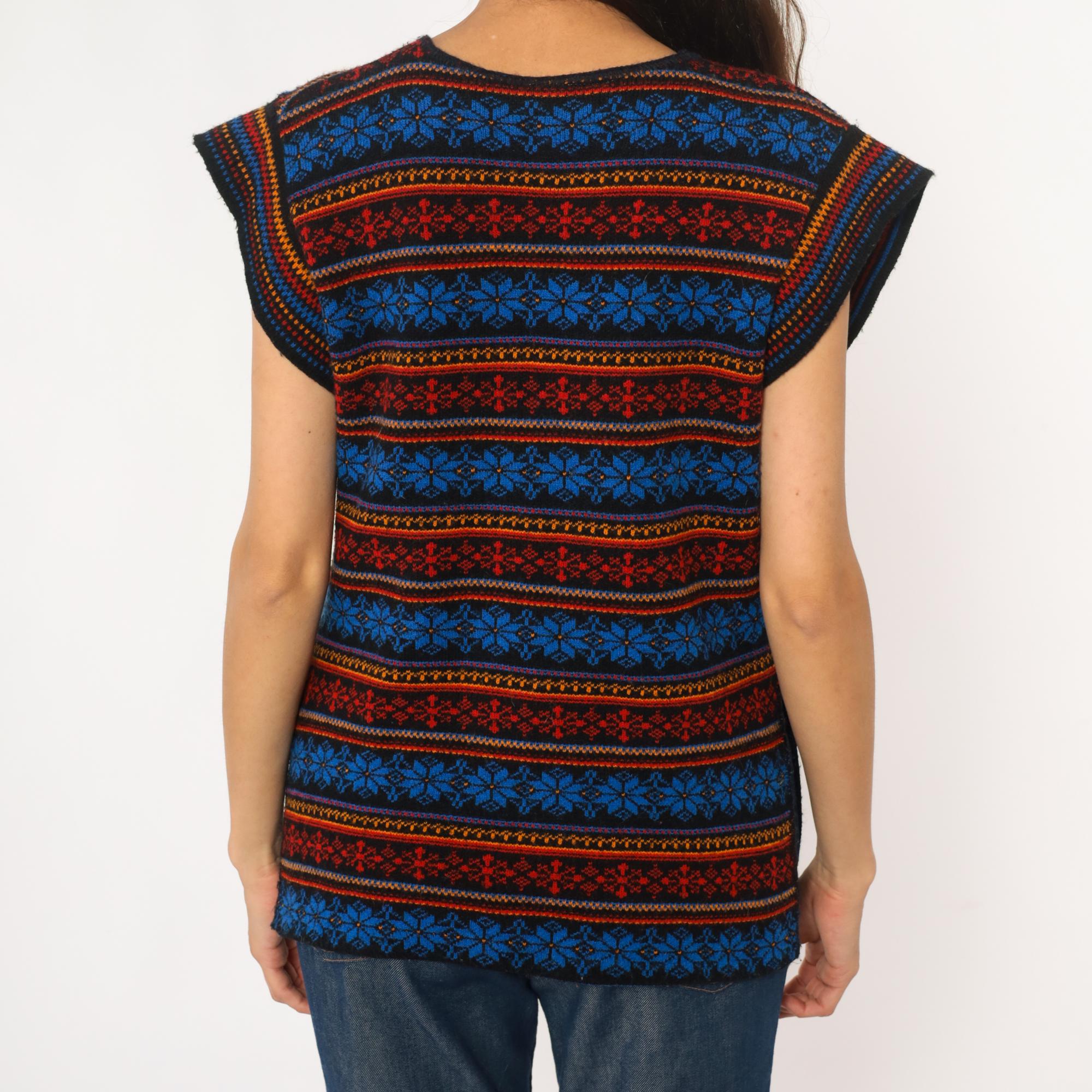 70s acrylic knit vest with horizontal Fair Isle snowflake pattern in alternating bands of royal blue, red, orange, and yellow. Tie front closure with black ribbon ties, black binding at neckline and armholes. Sleeveless silhouette with geometric snowflake motifs throughout.