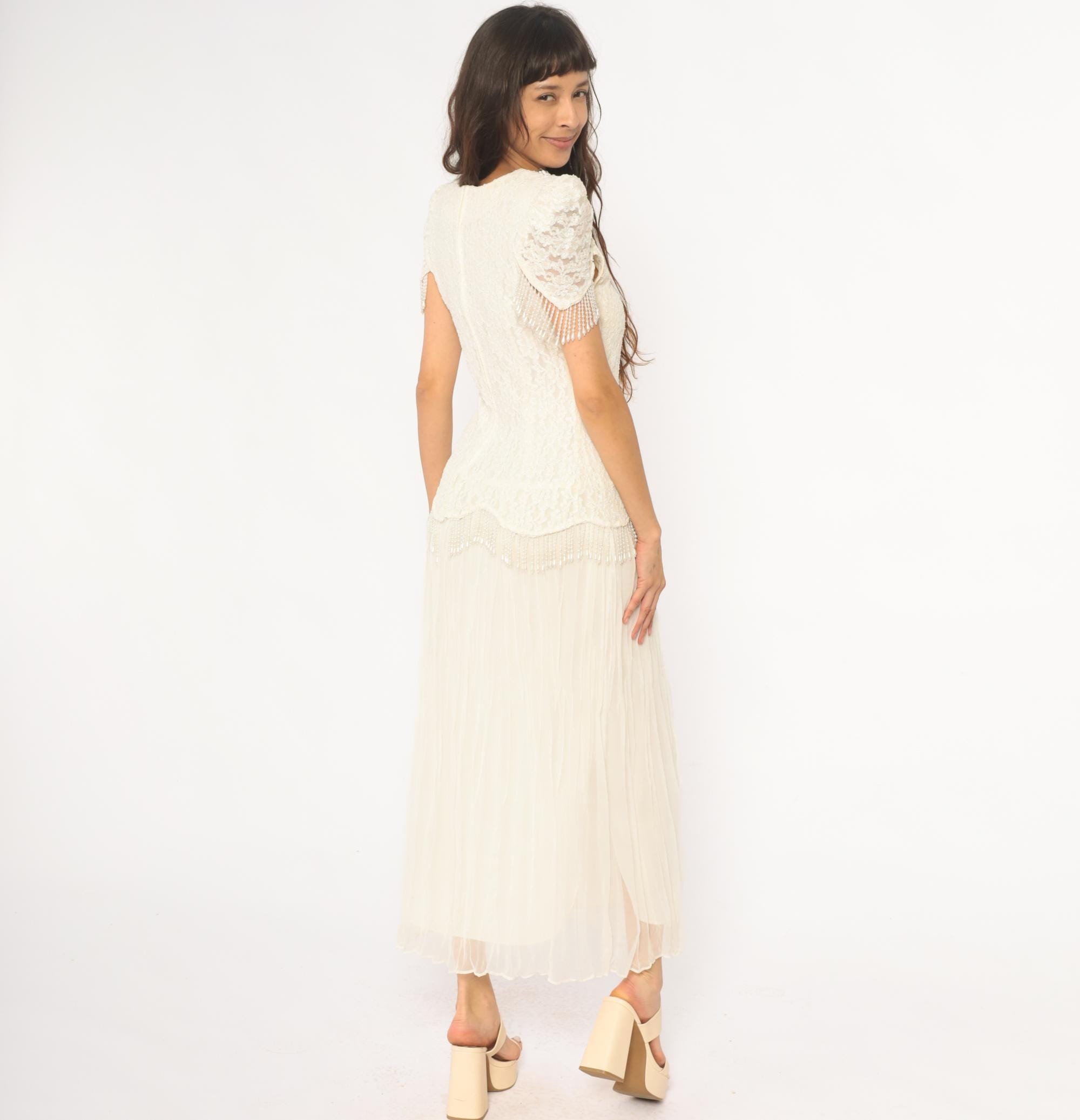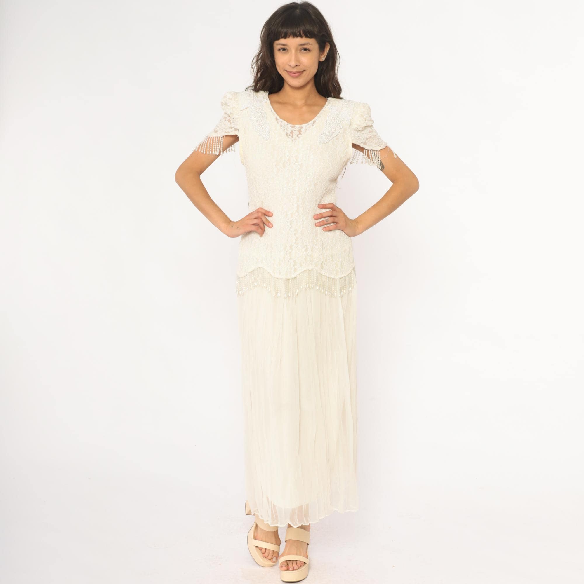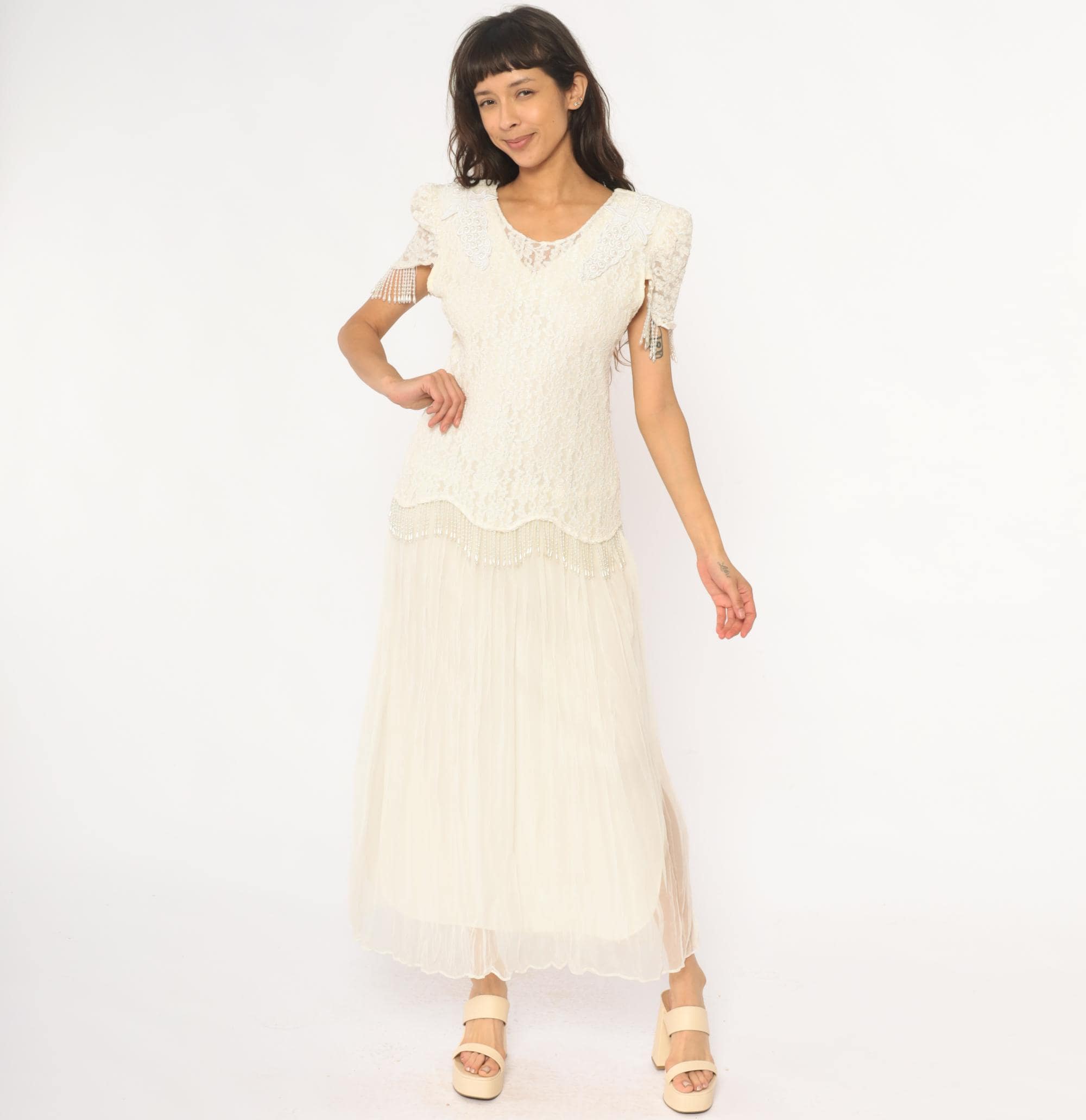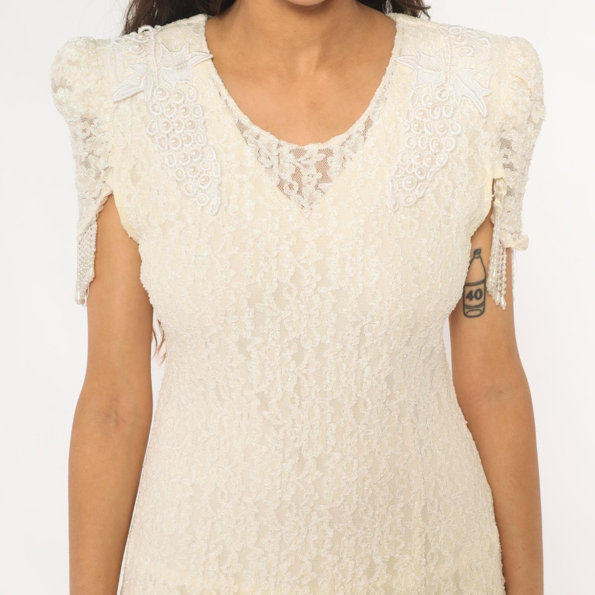 80s cream lace dress from speeed with beaded grape bunch detail at collar and sleeve edges. Lace overlay bodice with floral scroll pattern, puffed cap sleeves, scoop neckline, and back zipper closure.