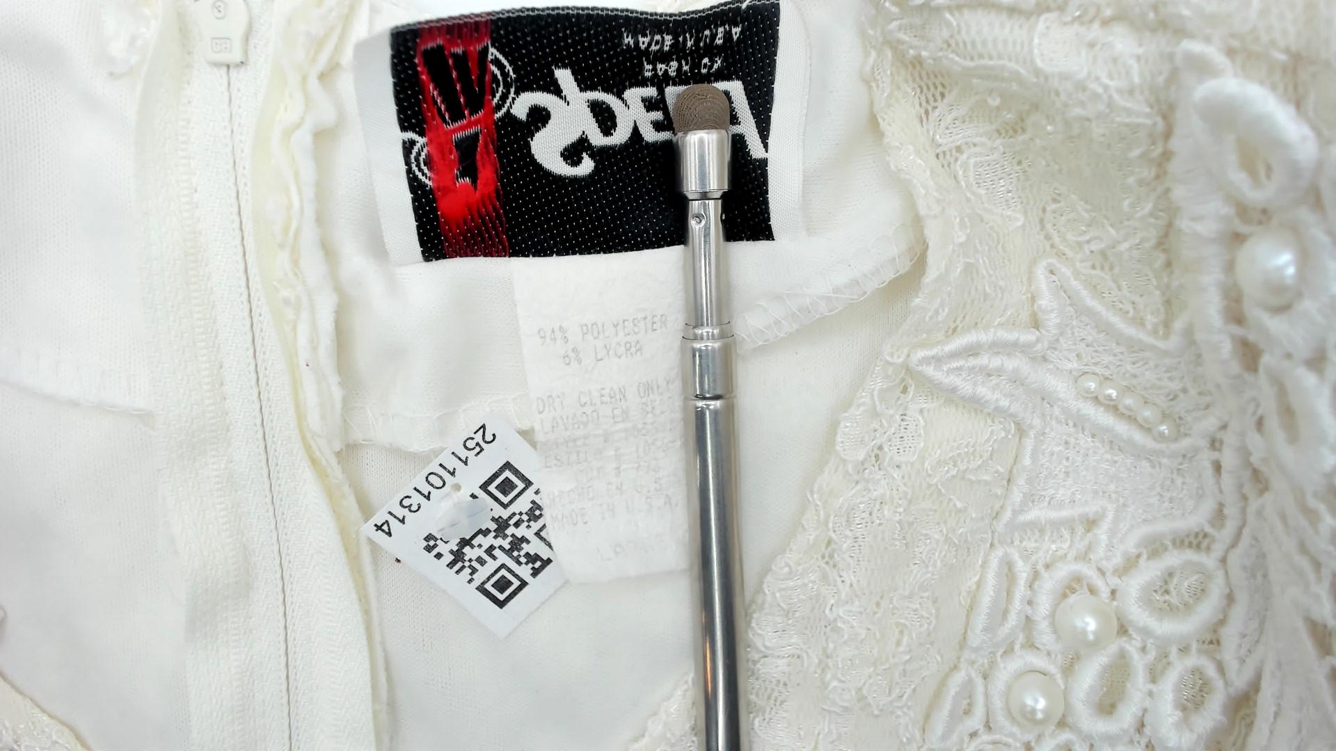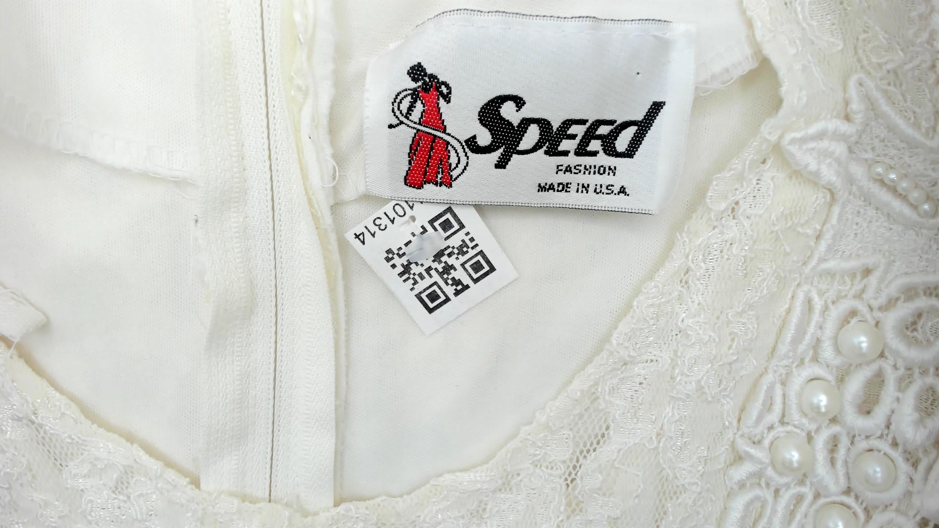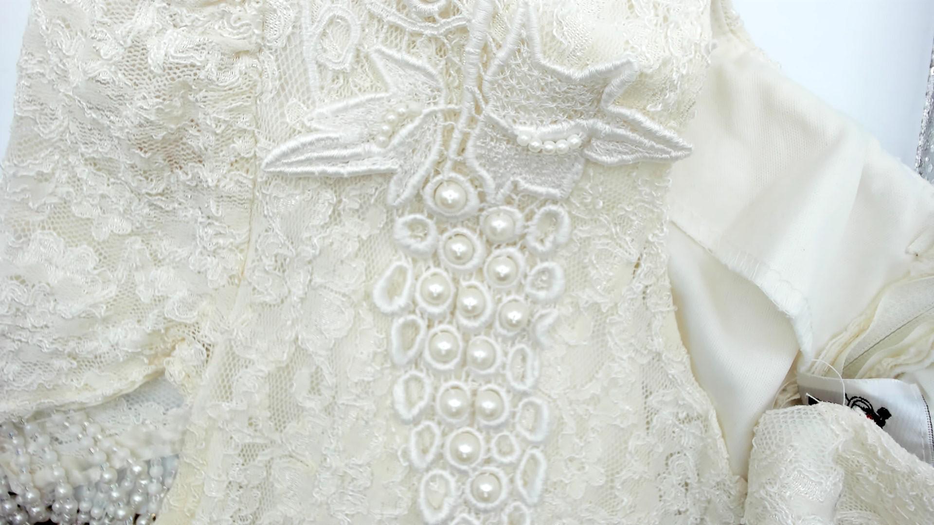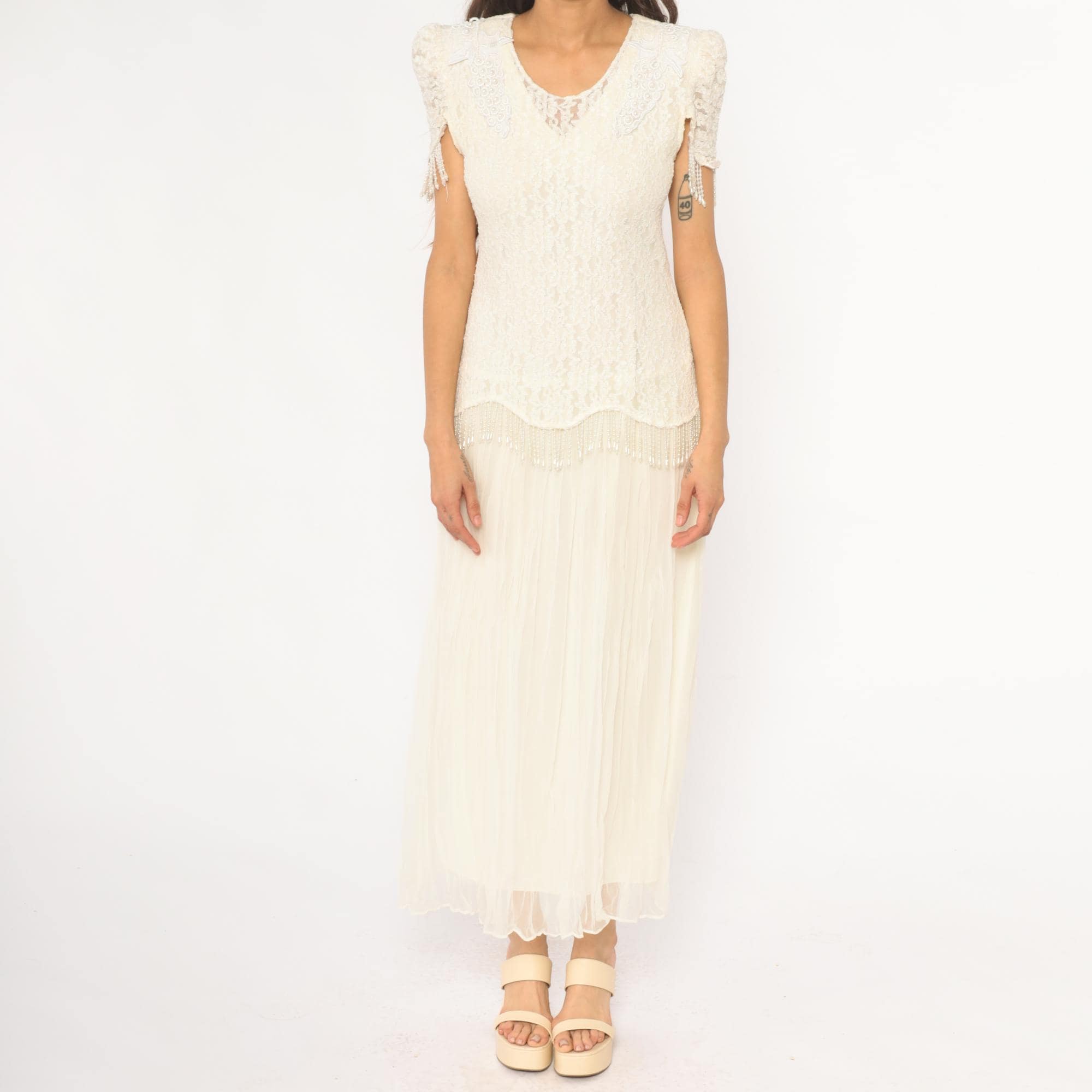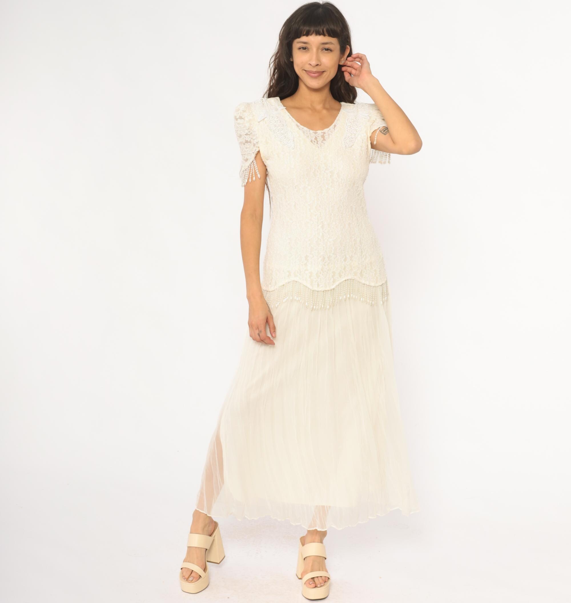 80s cream lace dress from speeed with beaded grape bunch detail at collar and sleeve edges. Lace overlay bodice with floral scroll pattern, puffed cap sleeves, scoop neckline, and back zipper closure.
