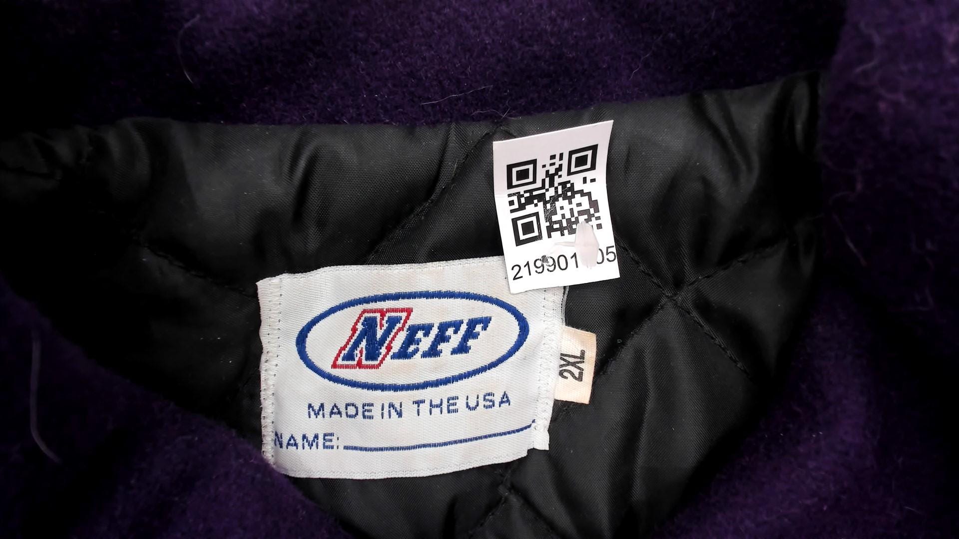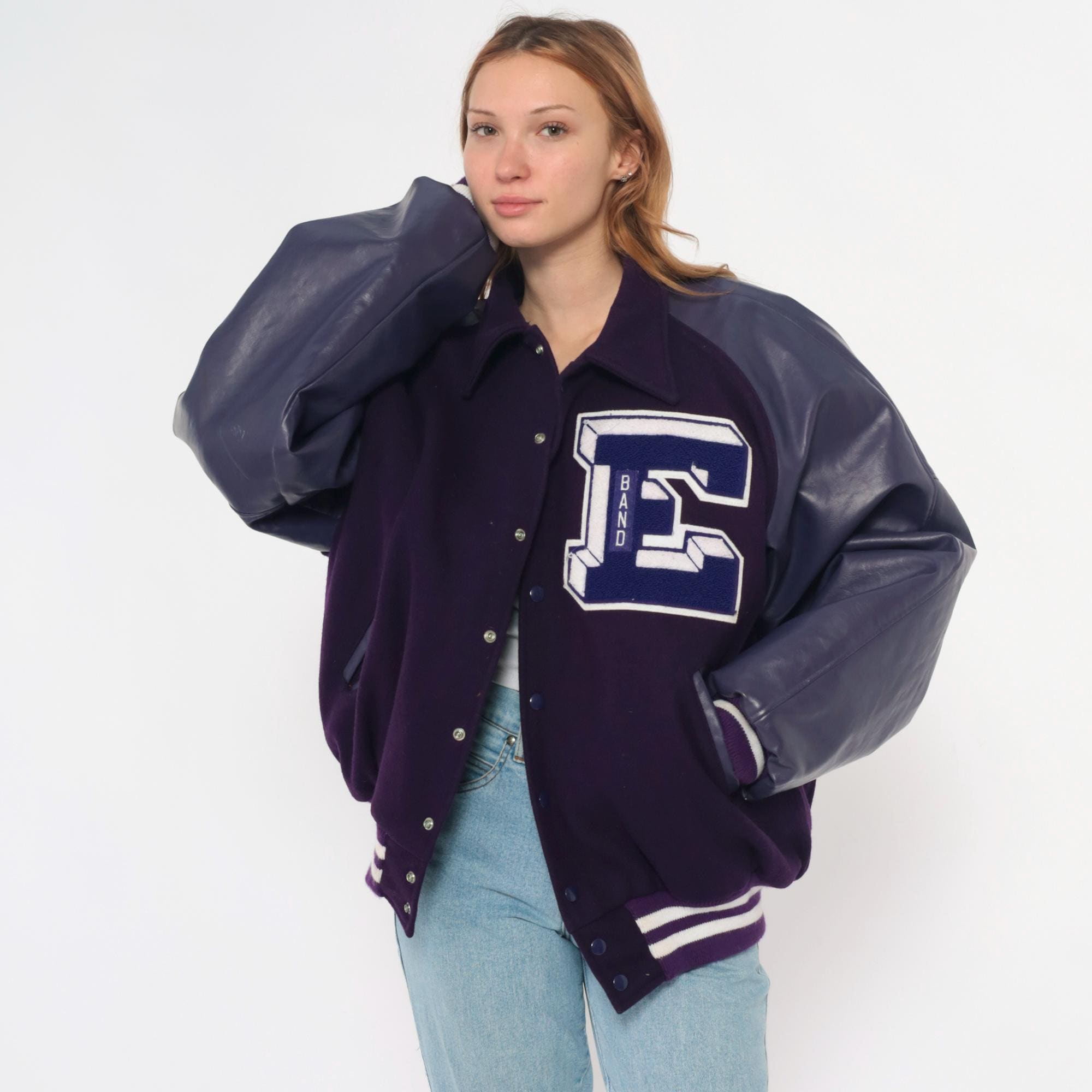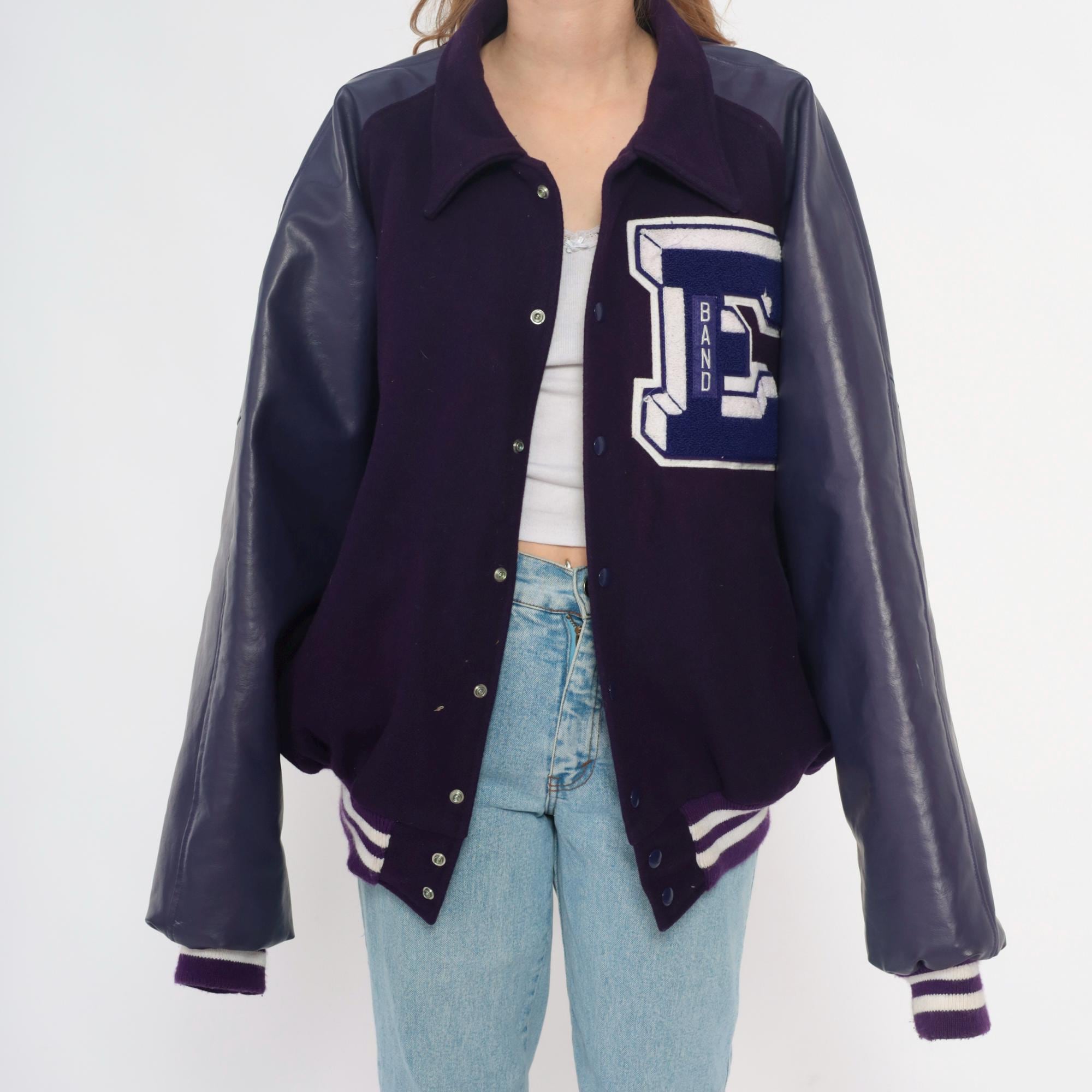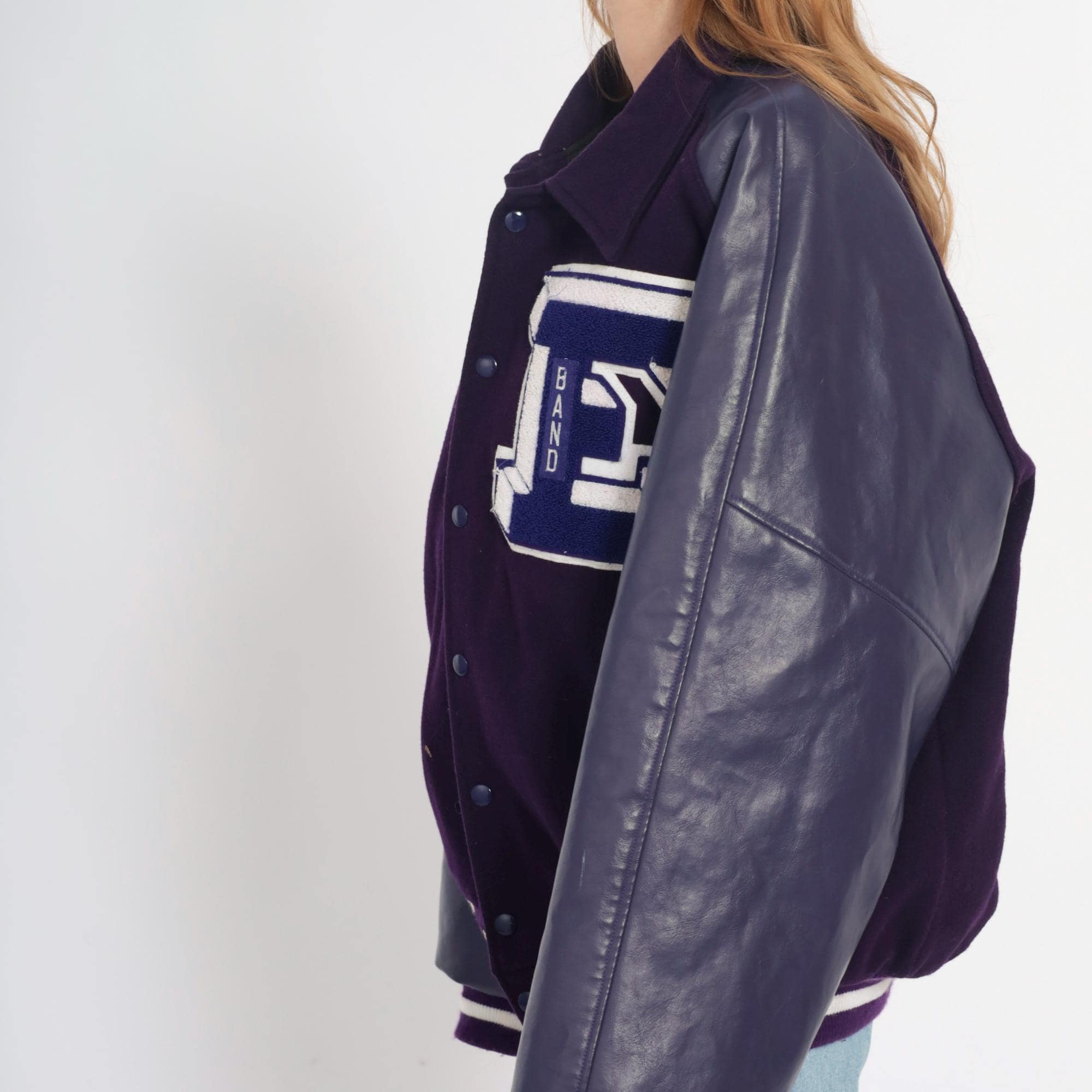 Y2K purple varsity jacket from neff with large "B BAND" letter patch on chest, white striped ribbing at collar, cuffs, and hem. Snap button closure down the front, white accent stripes on sleeves near the cuffs.