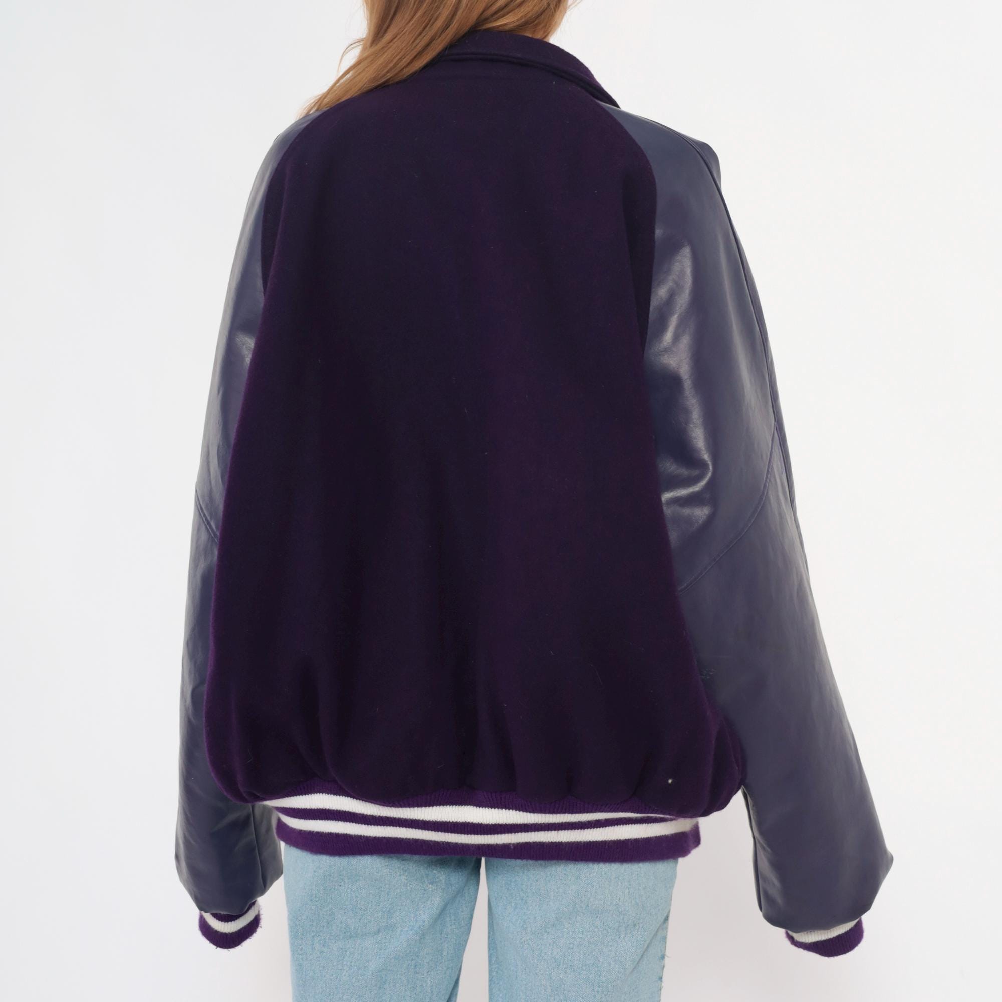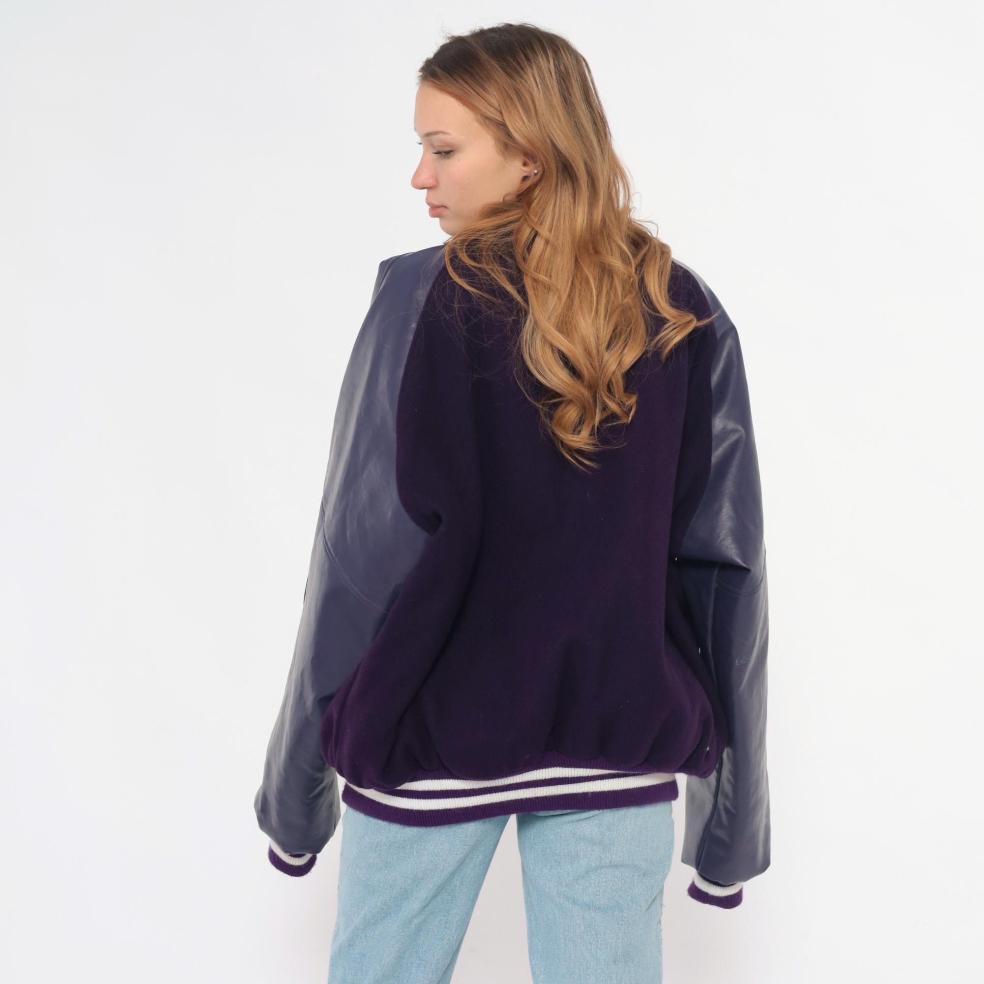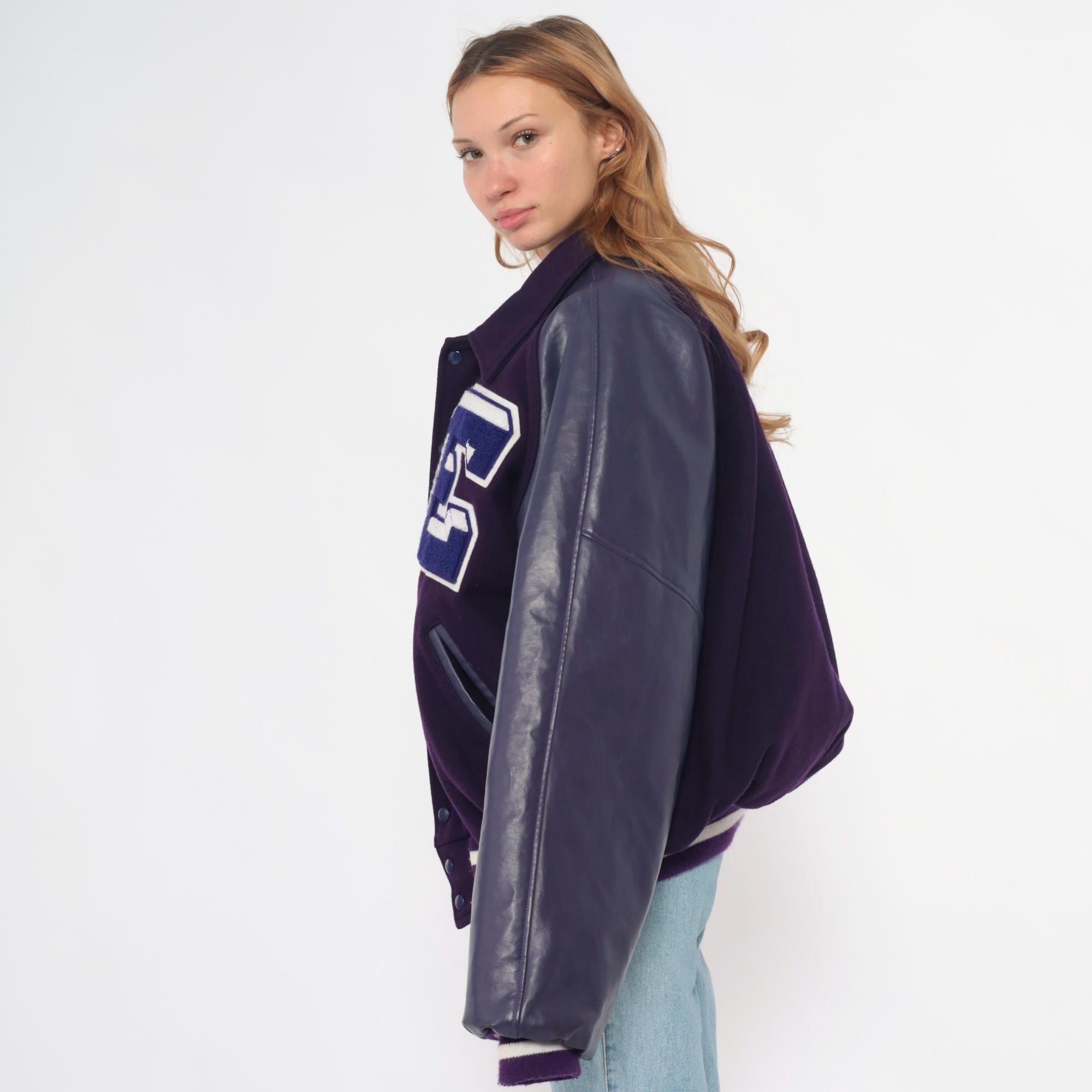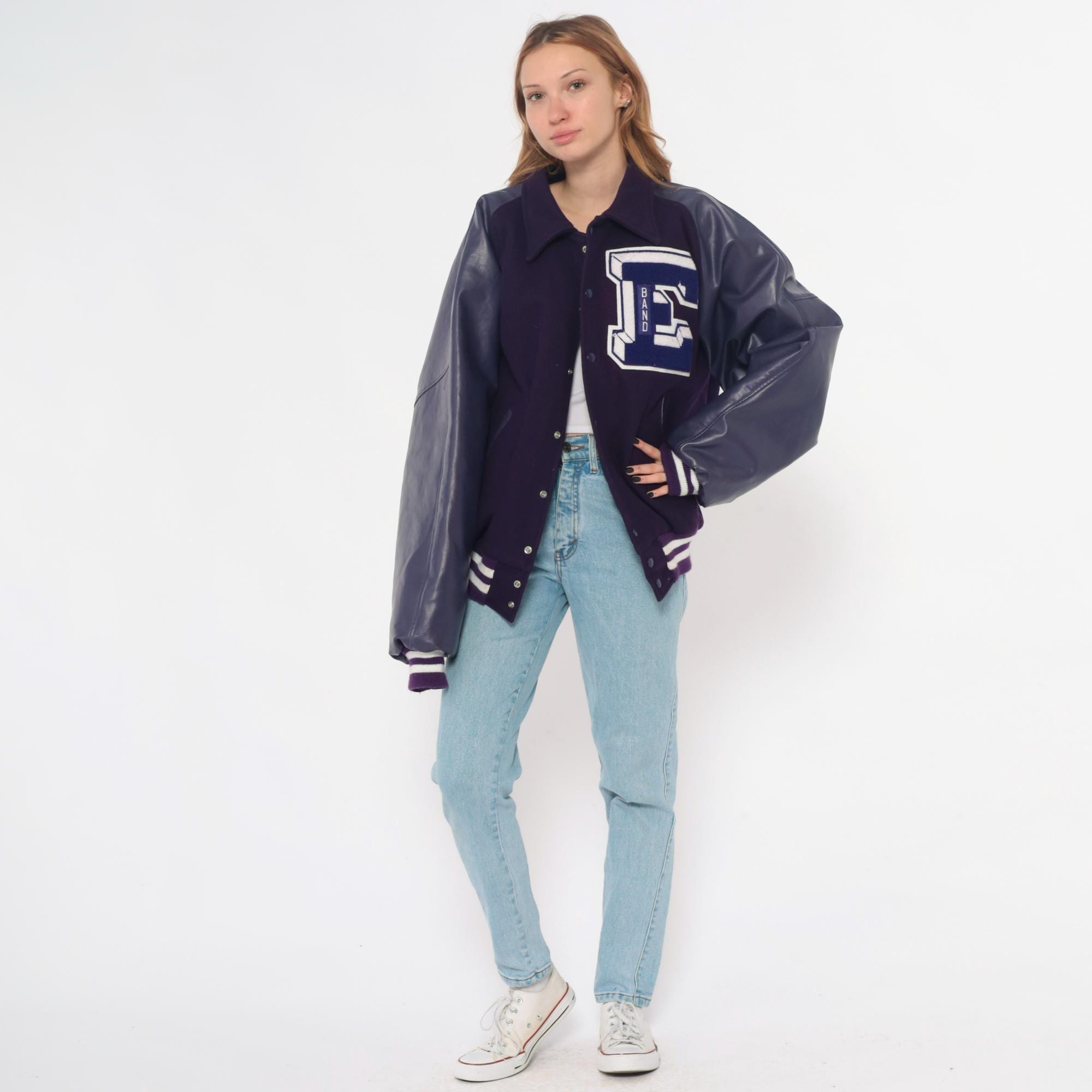 Y2K purple varsity jacket from neff with large "B BAND" letter patch on chest, white striped ribbing at collar, cuffs, and hem. Snap button closure down the front, white accent stripes on sleeves near the cuffs.