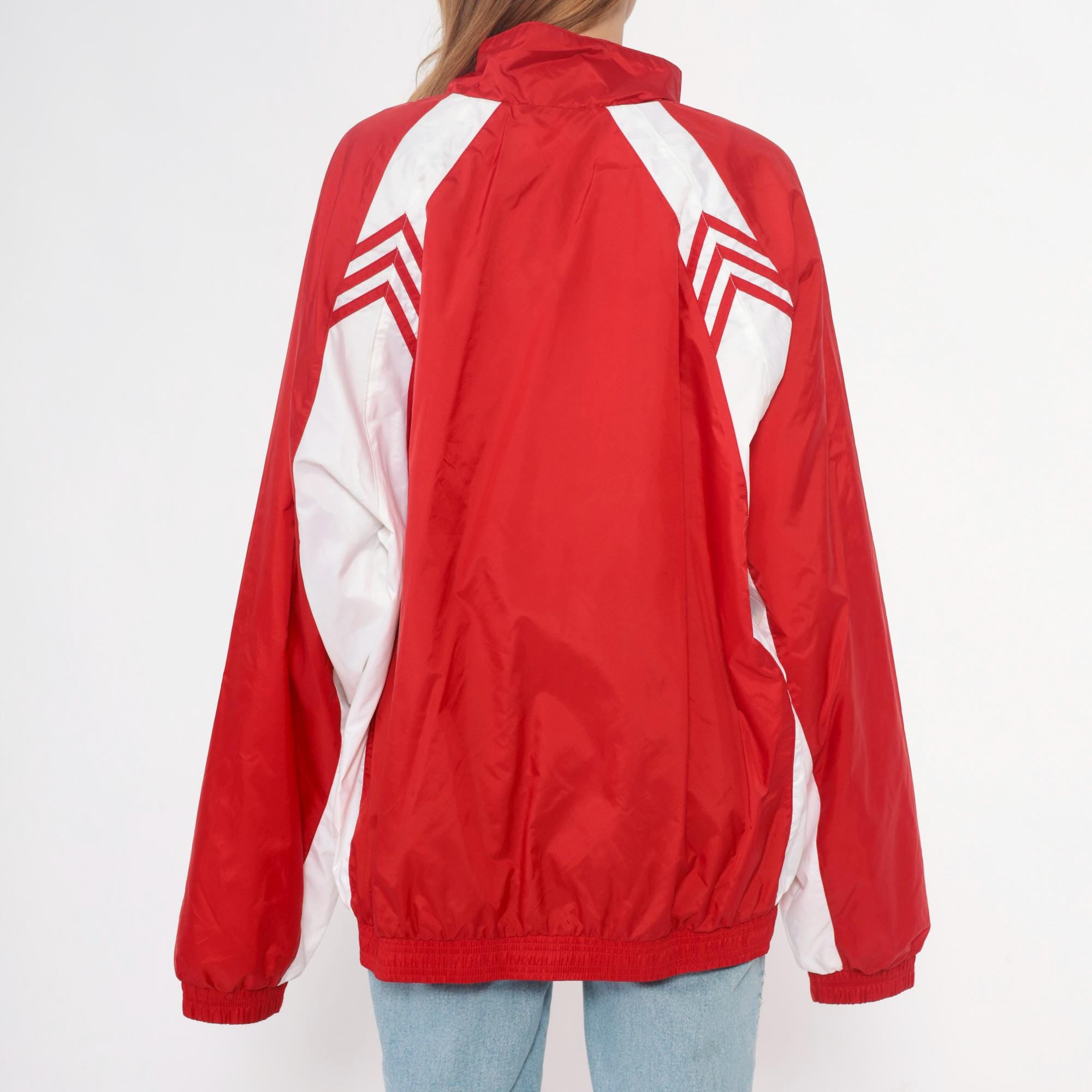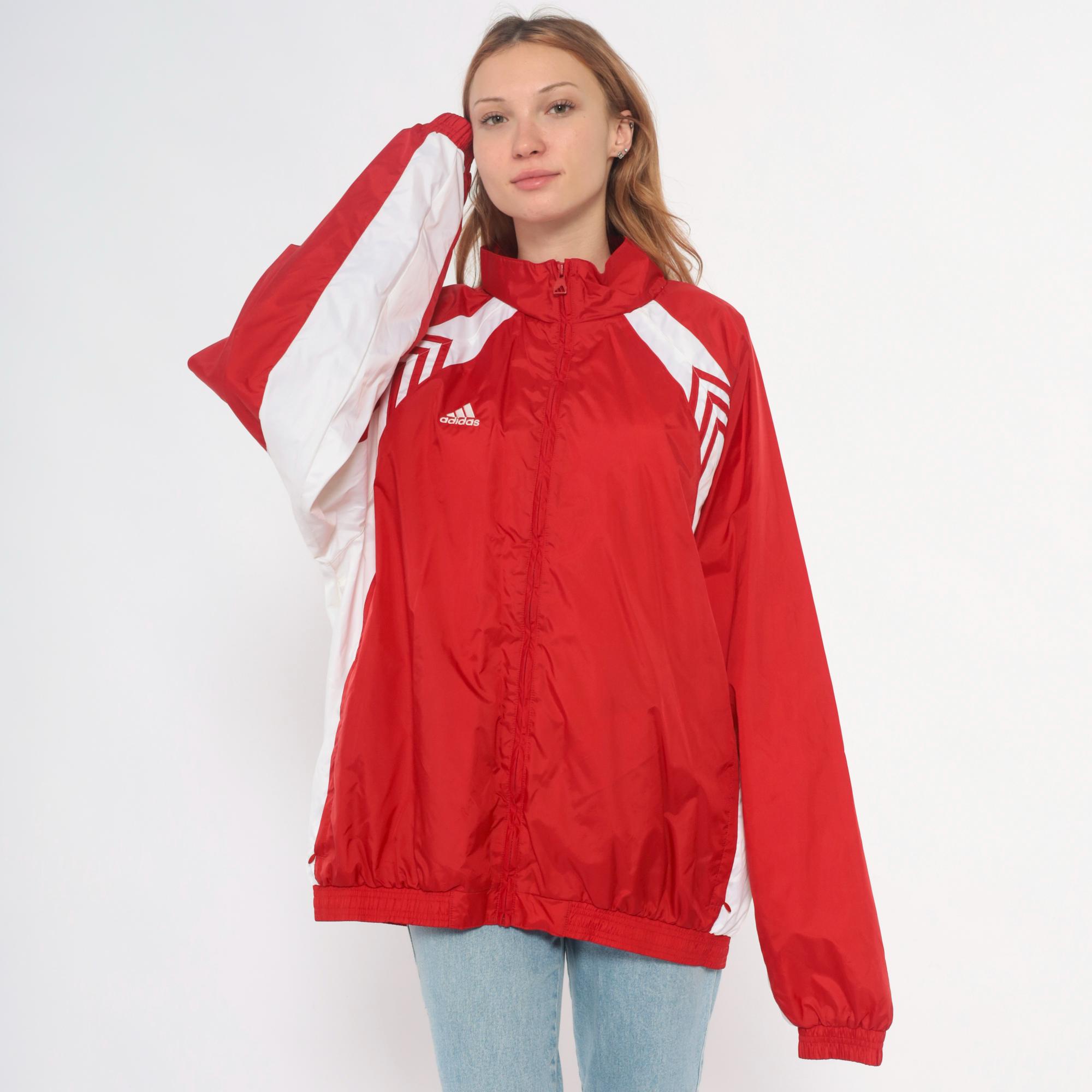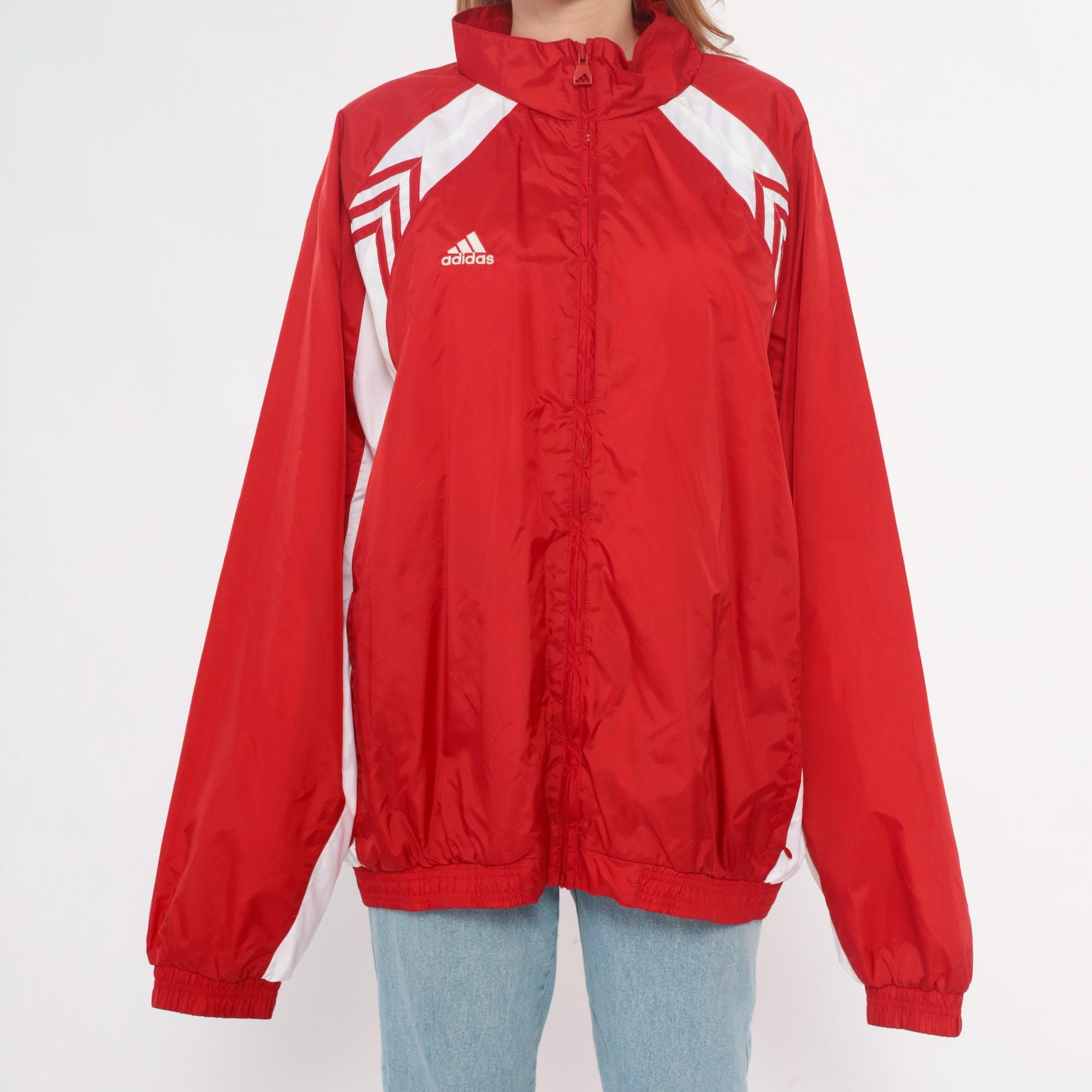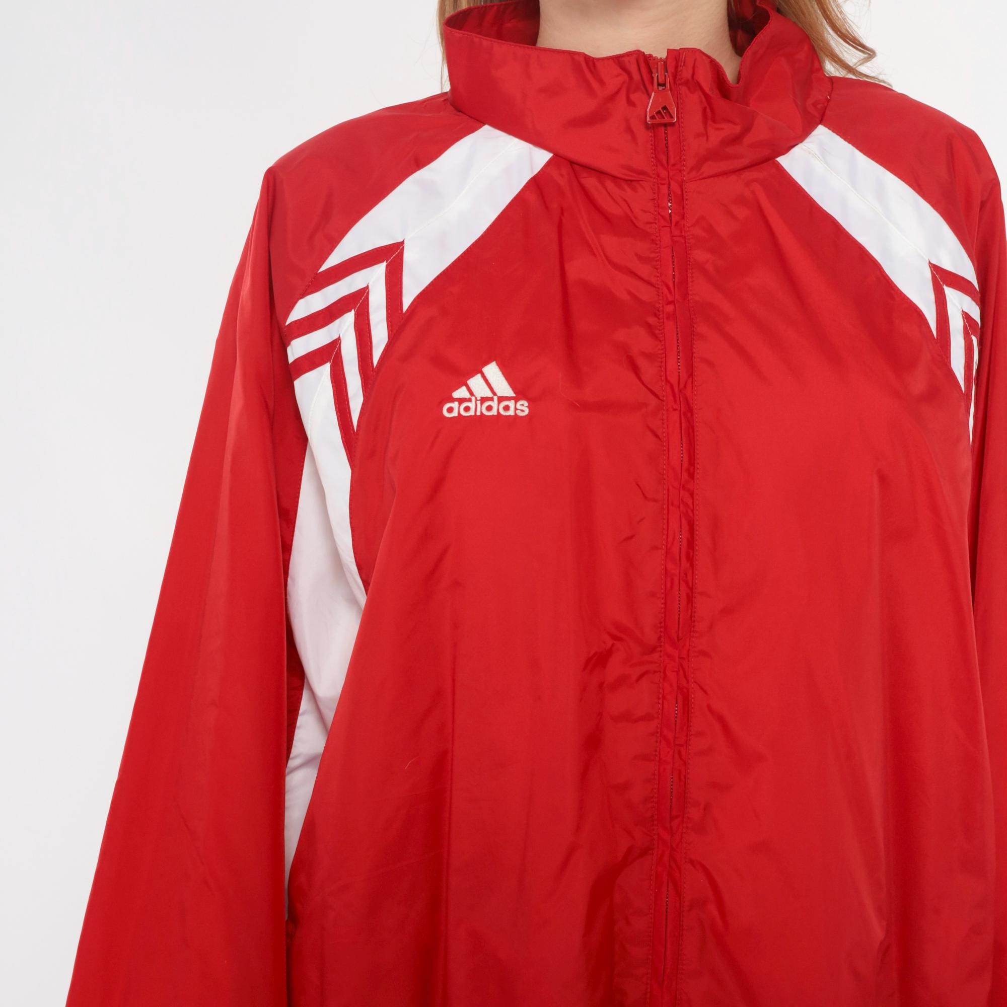 Y2K red and white track jacket from Adidas with full zip front closure and high funnel neck collar. White chevron designs on shoulders, white color blocking along sides and sleeves, small embroidered Adidas logo on chest.