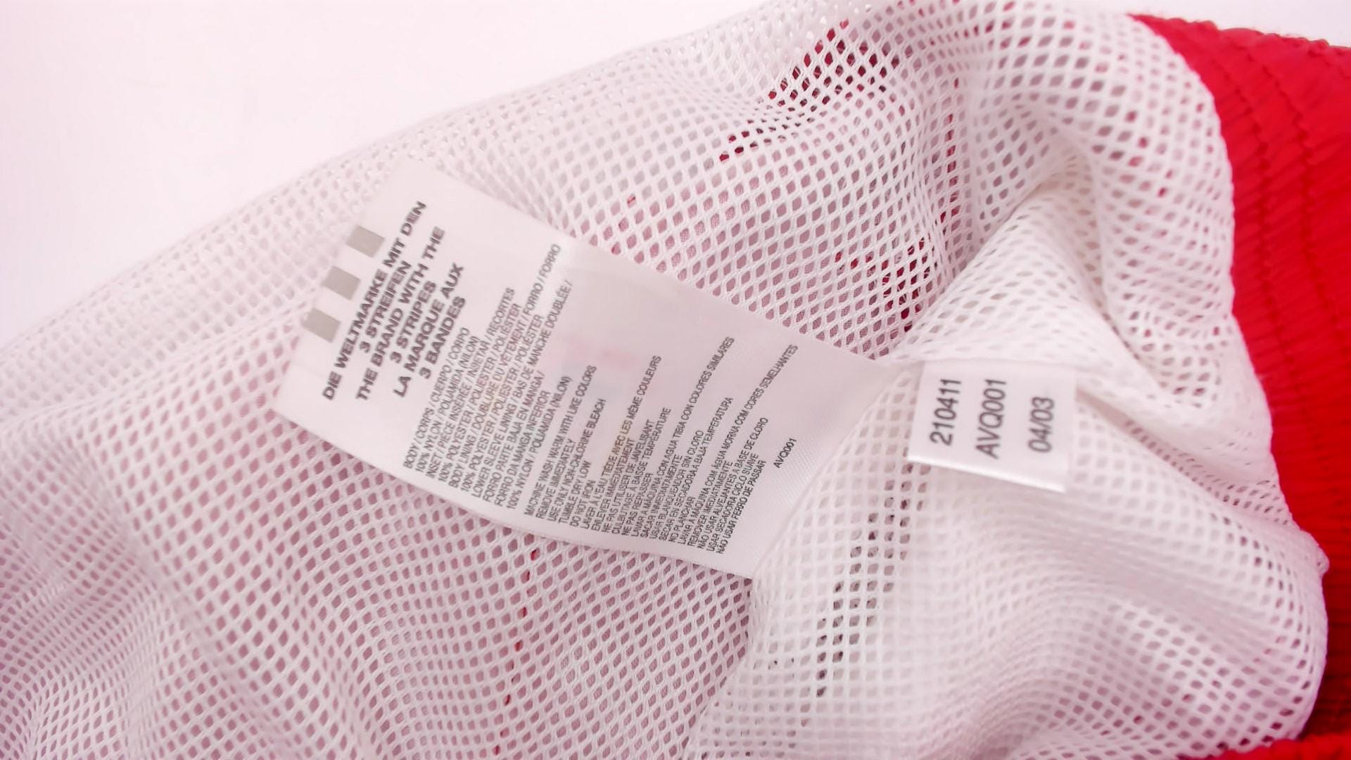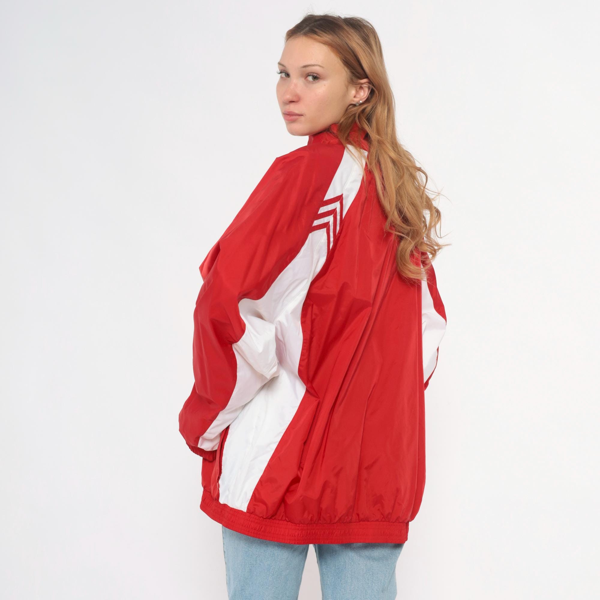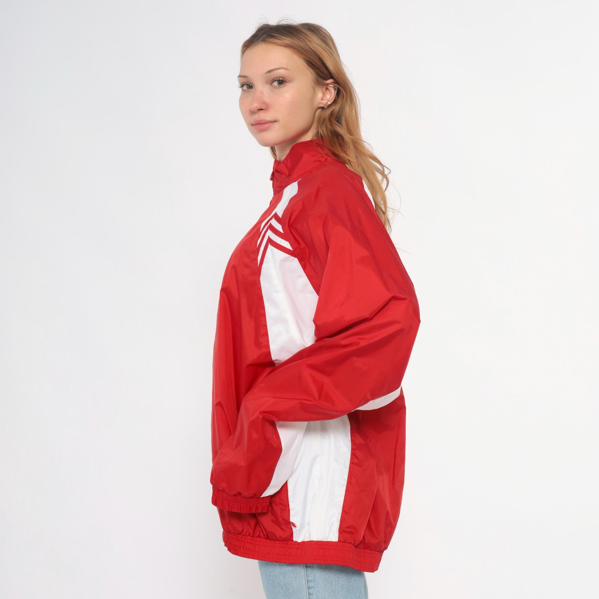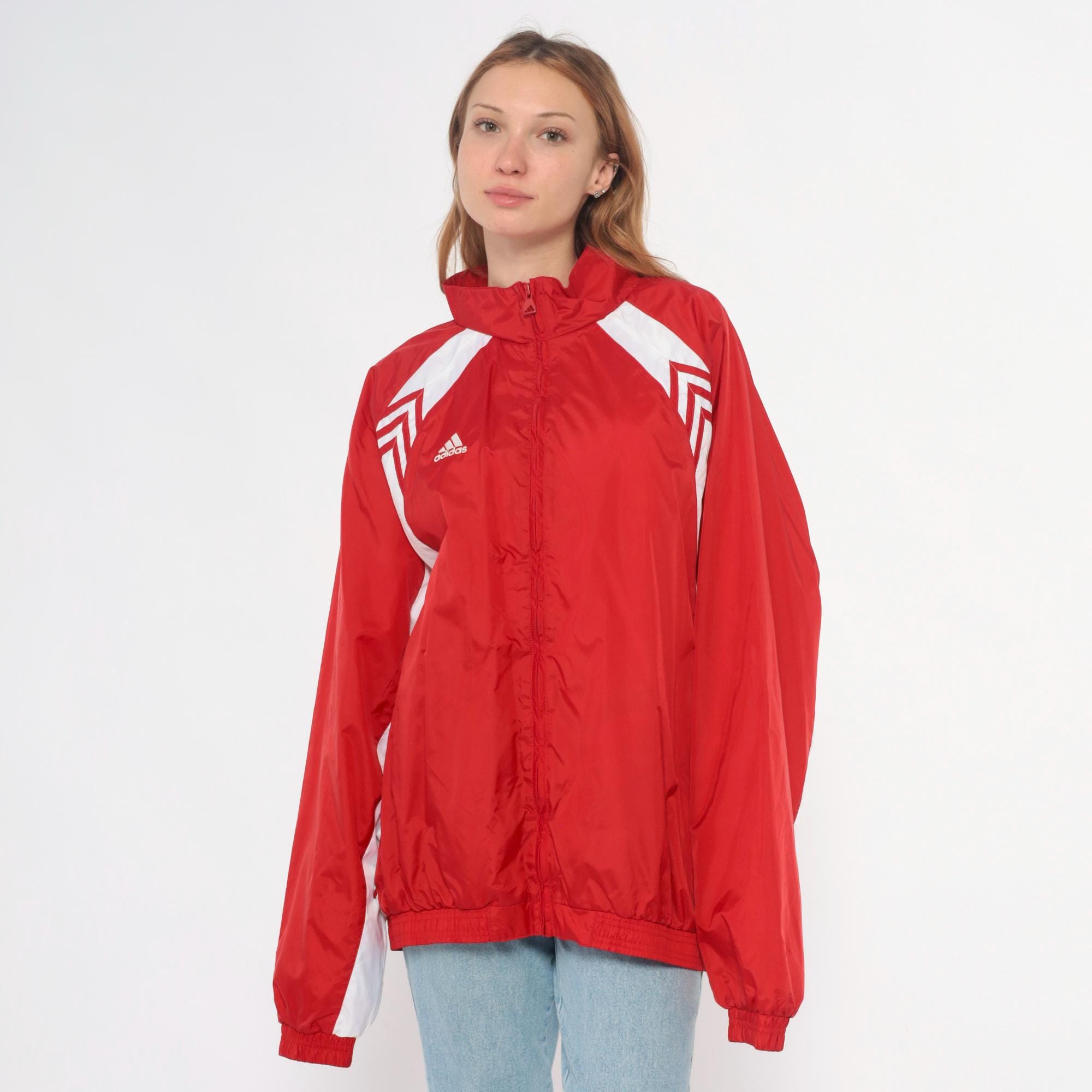 Y2K red and white track jacket from Adidas with full zip front closure and high funnel neck collar. White chevron designs on shoulders, white color blocking along sides and sleeves, small embroidered Adidas logo on chest.