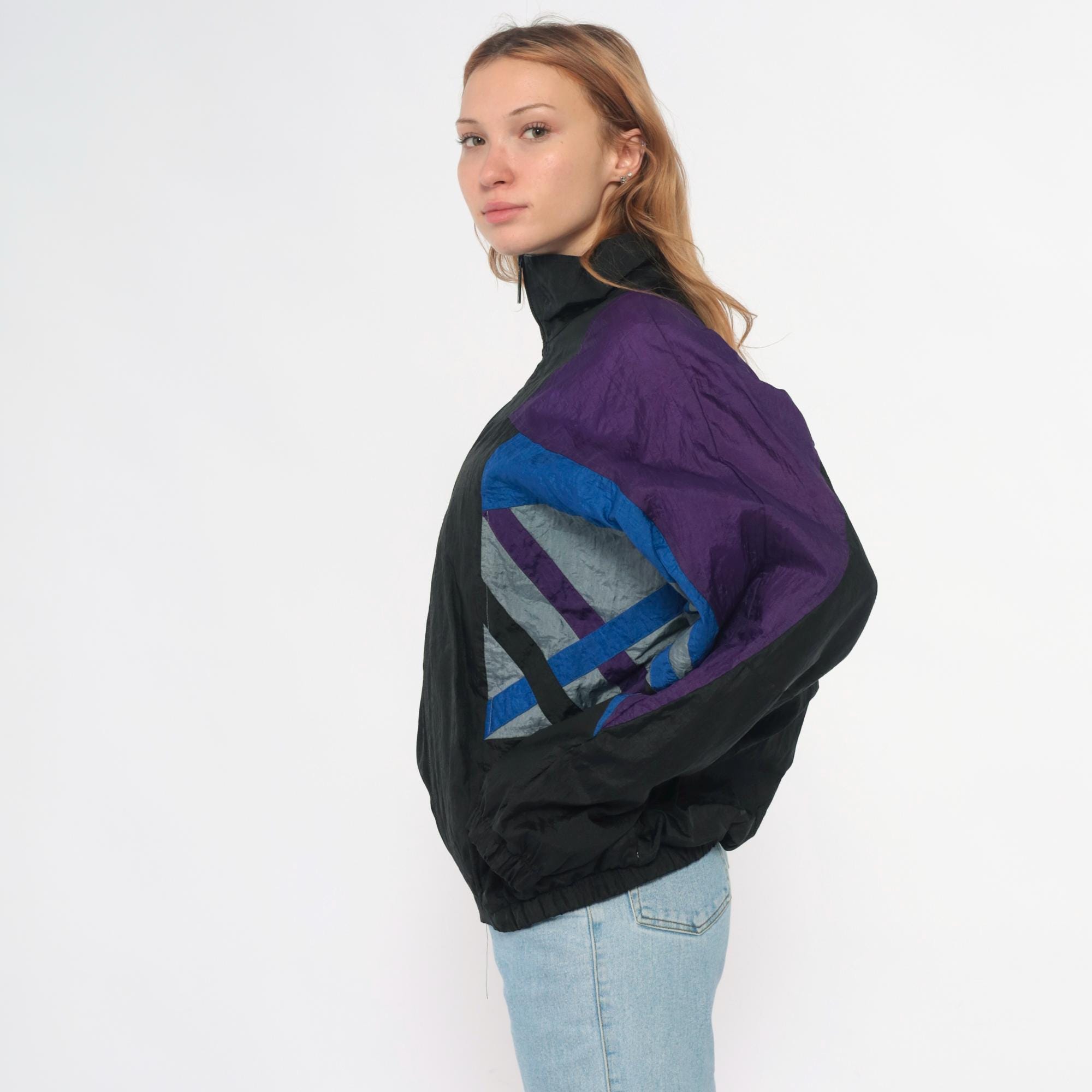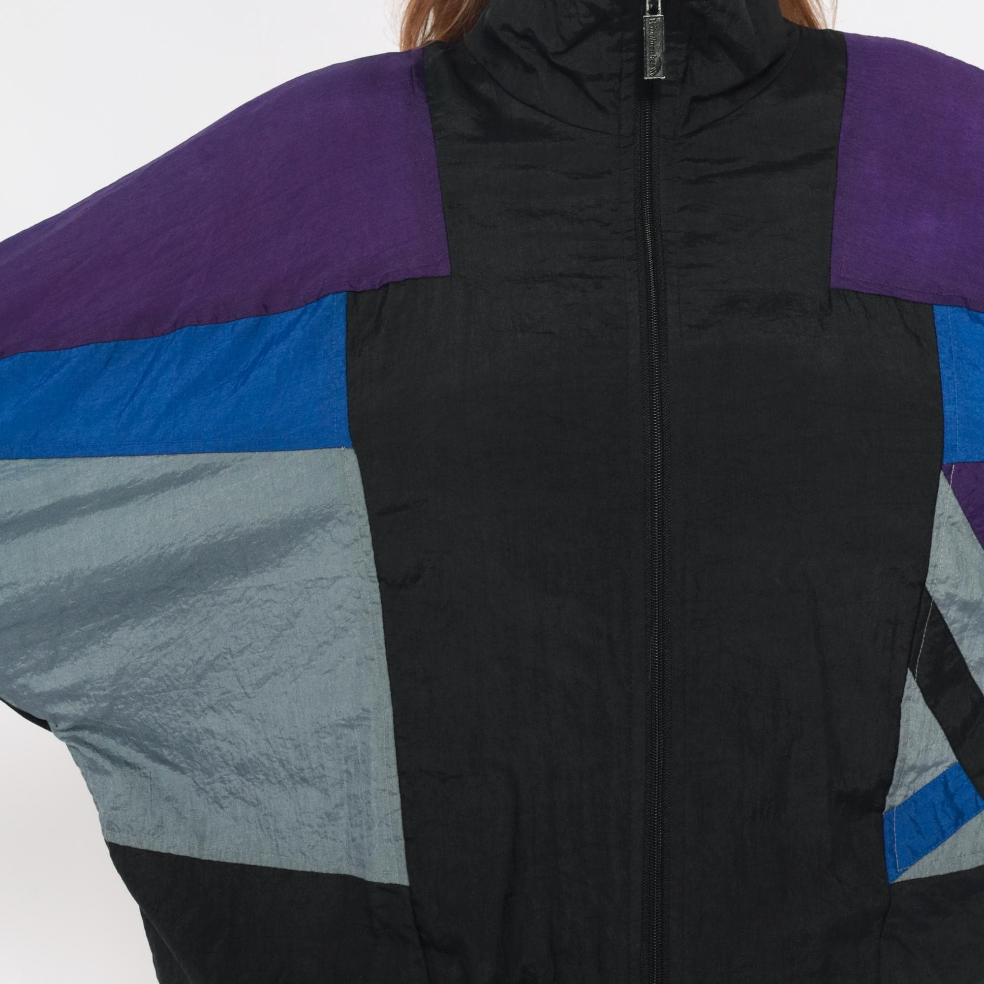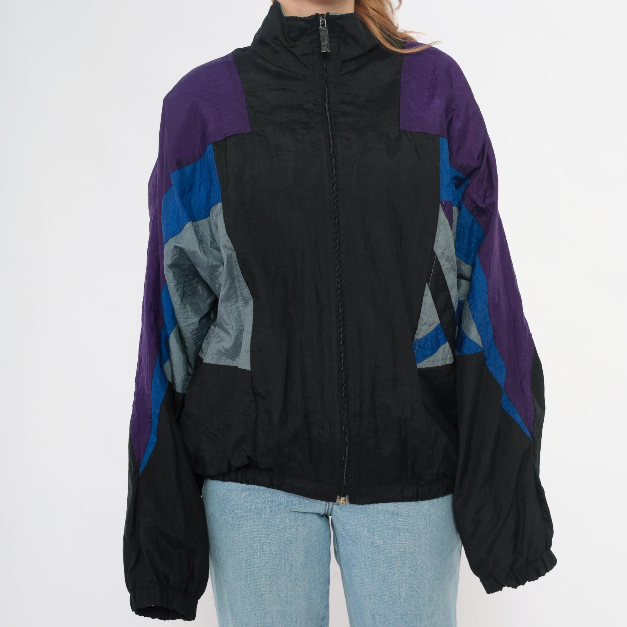 90s windbreaker jacket in black nylon with purple shoulders and geometric blue and gray color blocking across the sleeves and sides. Full front zipper closure with stand collar, elastic cuffs and hem.