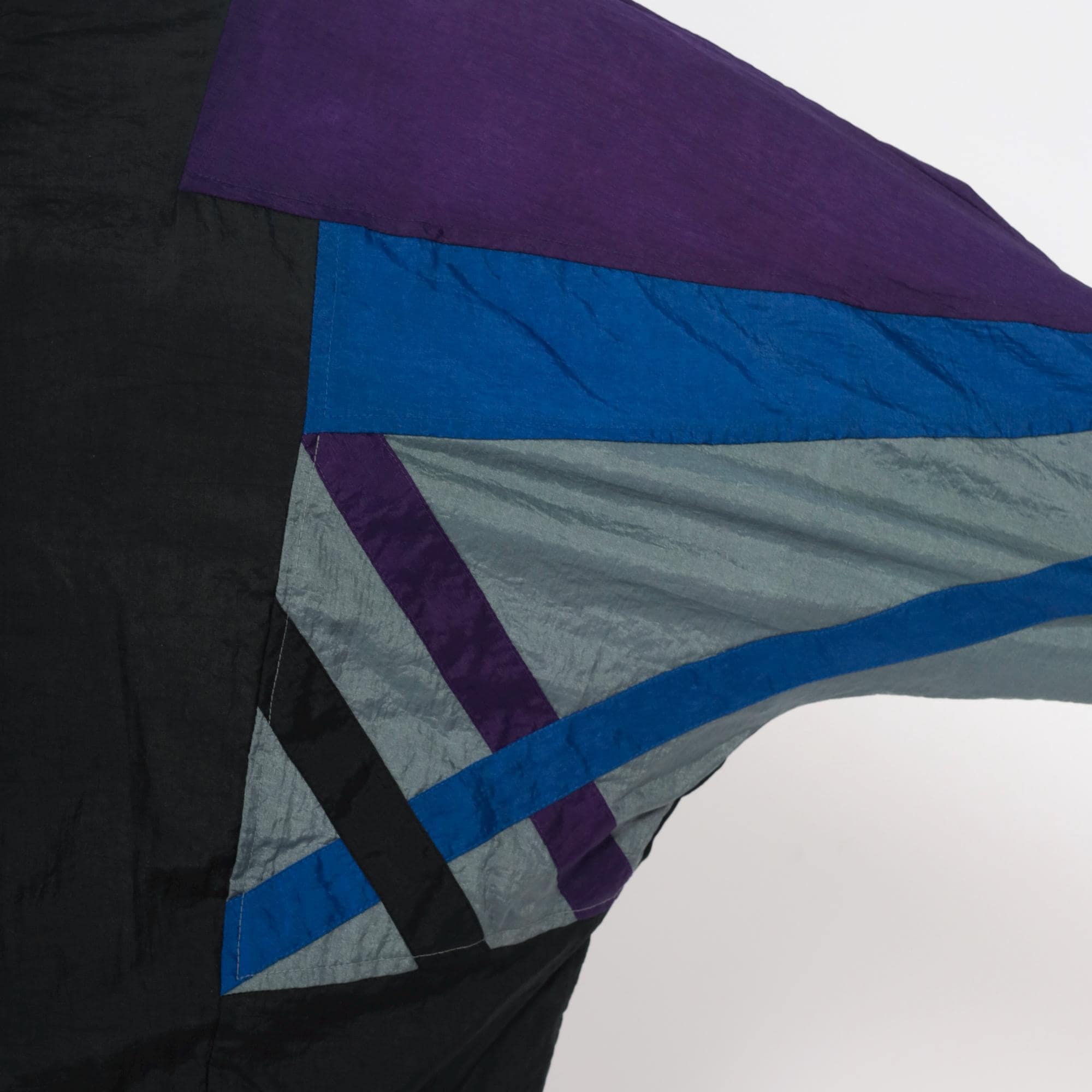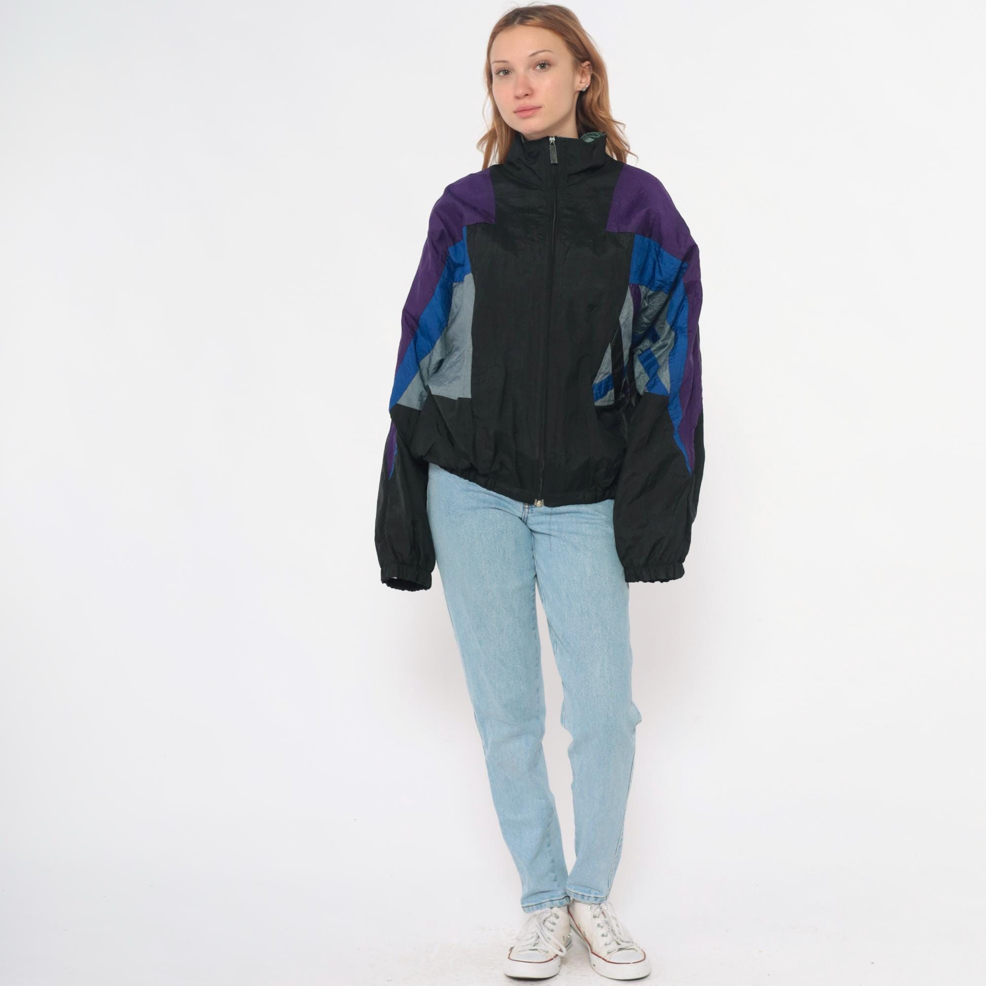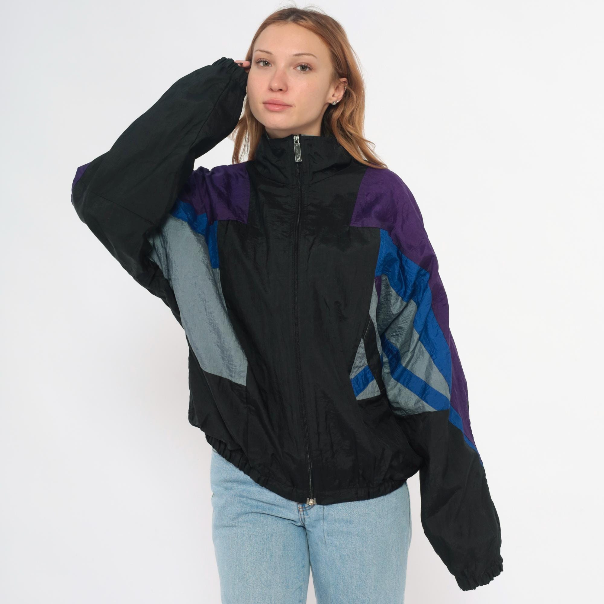 90s windbreaker jacket in black nylon with purple shoulders and geometric blue and gray color blocking across the sleeves and sides. Full front zipper closure with stand collar, elastic cuffs and hem.