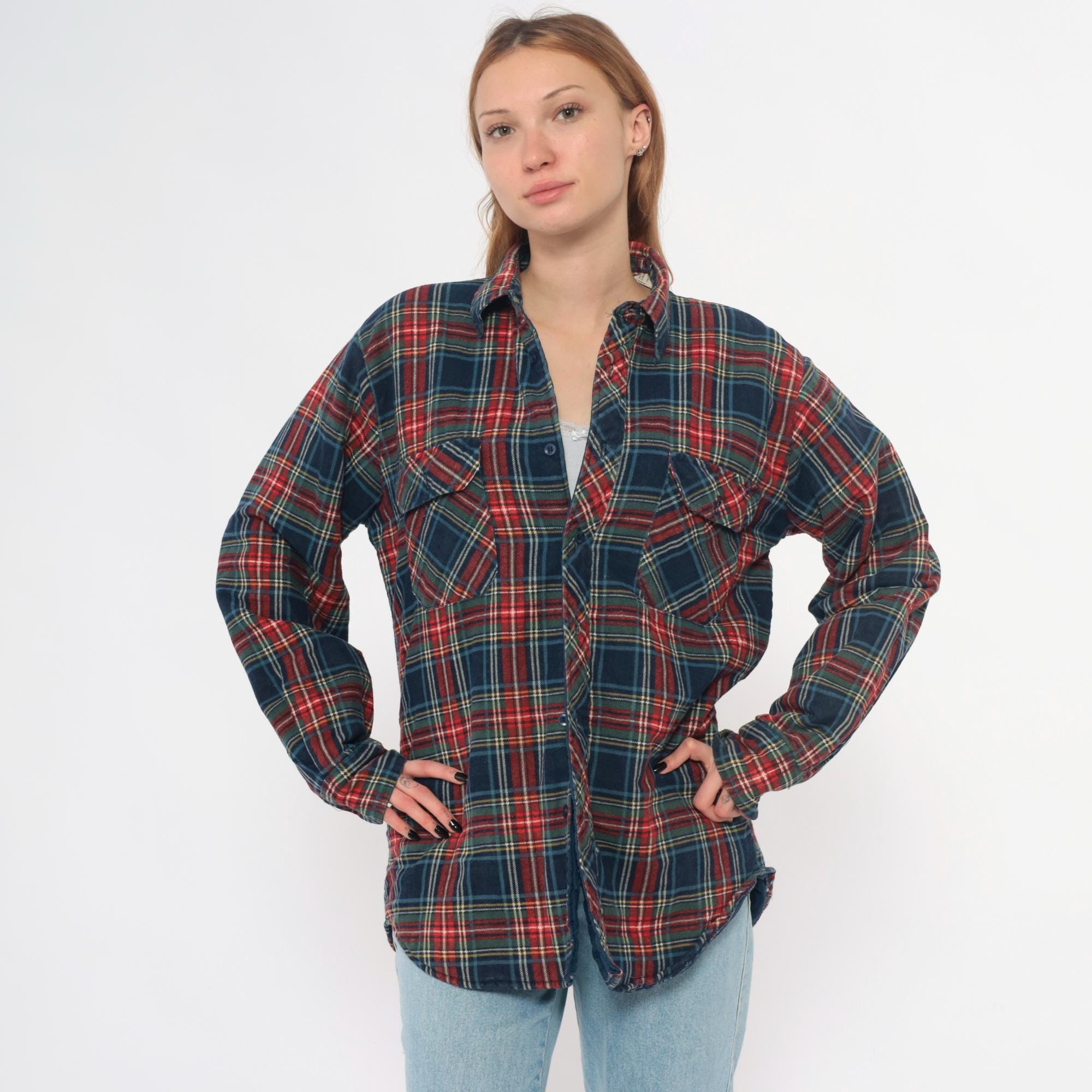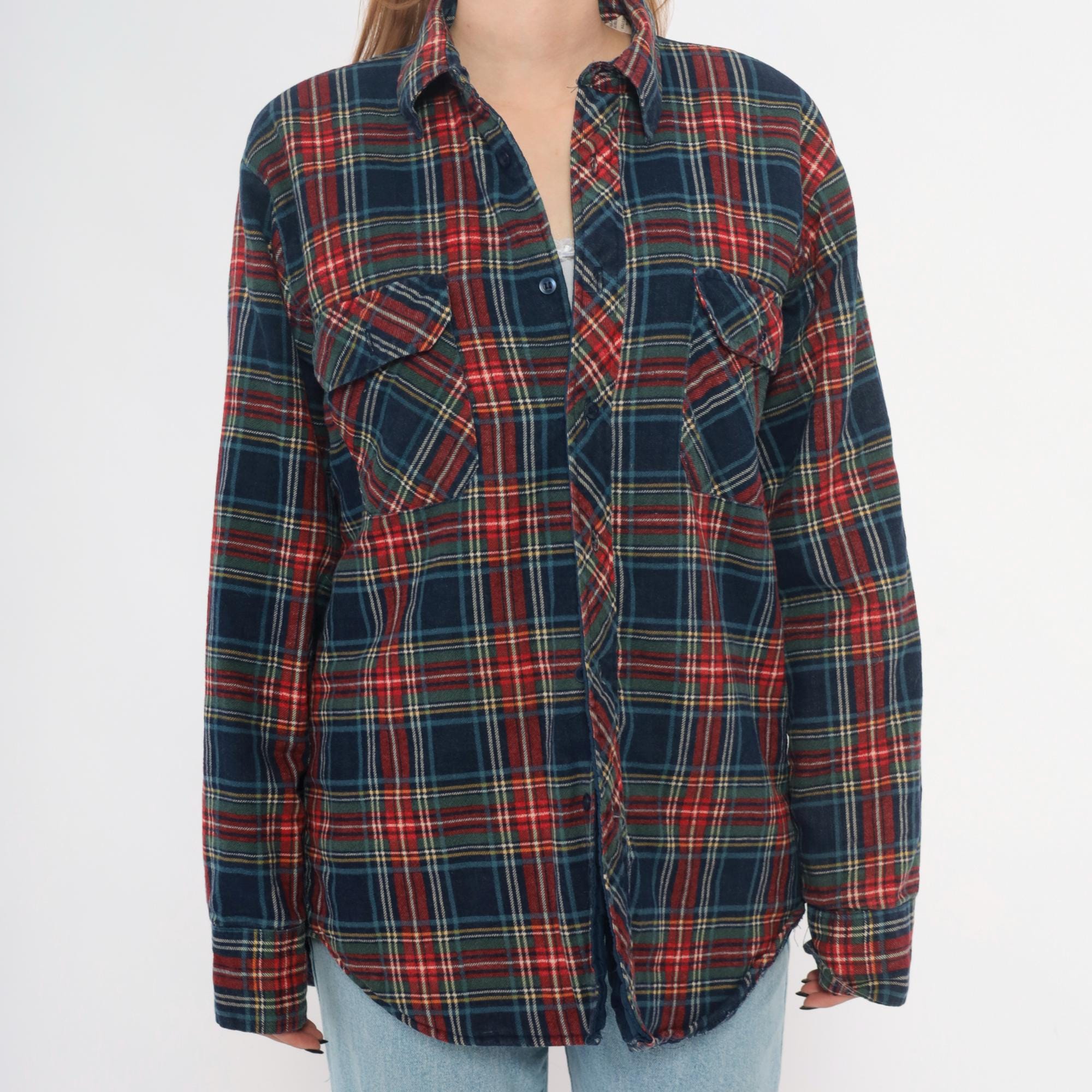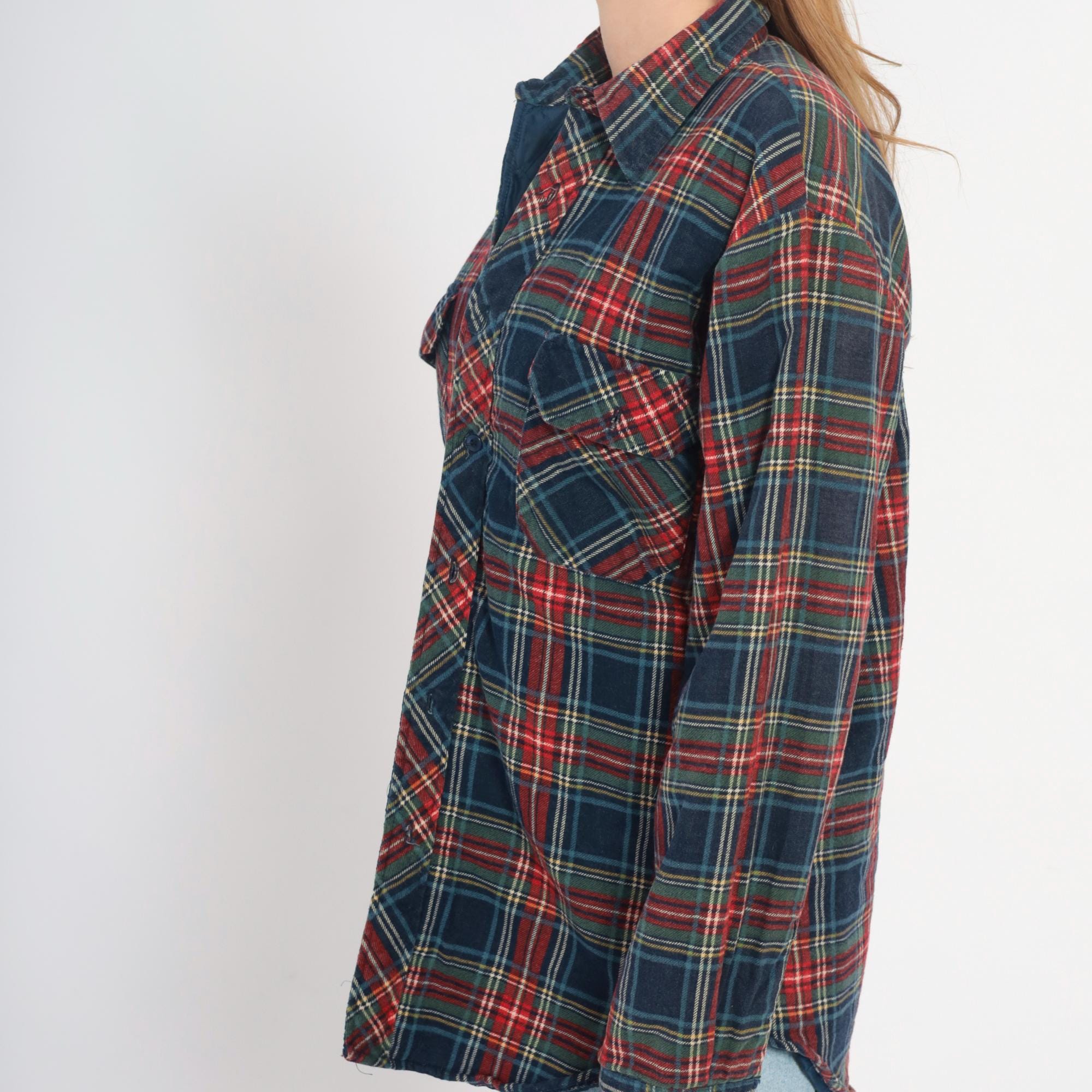 80s navy plaid flannel shirt from timber run with red, green, and yellow tartan pattern throughout. Two chest pockets with button flaps, long sleeves with button cuffs, full button front closure.