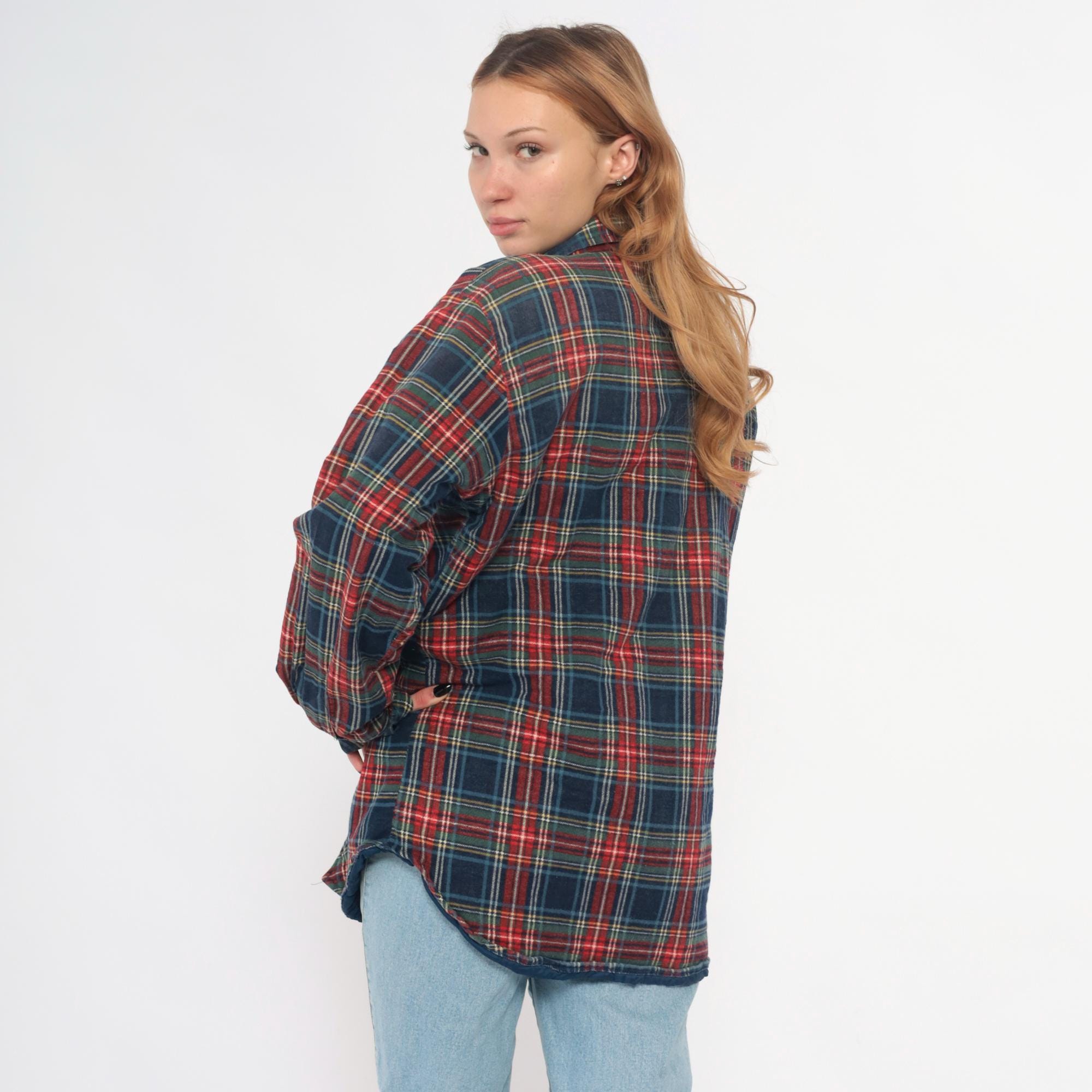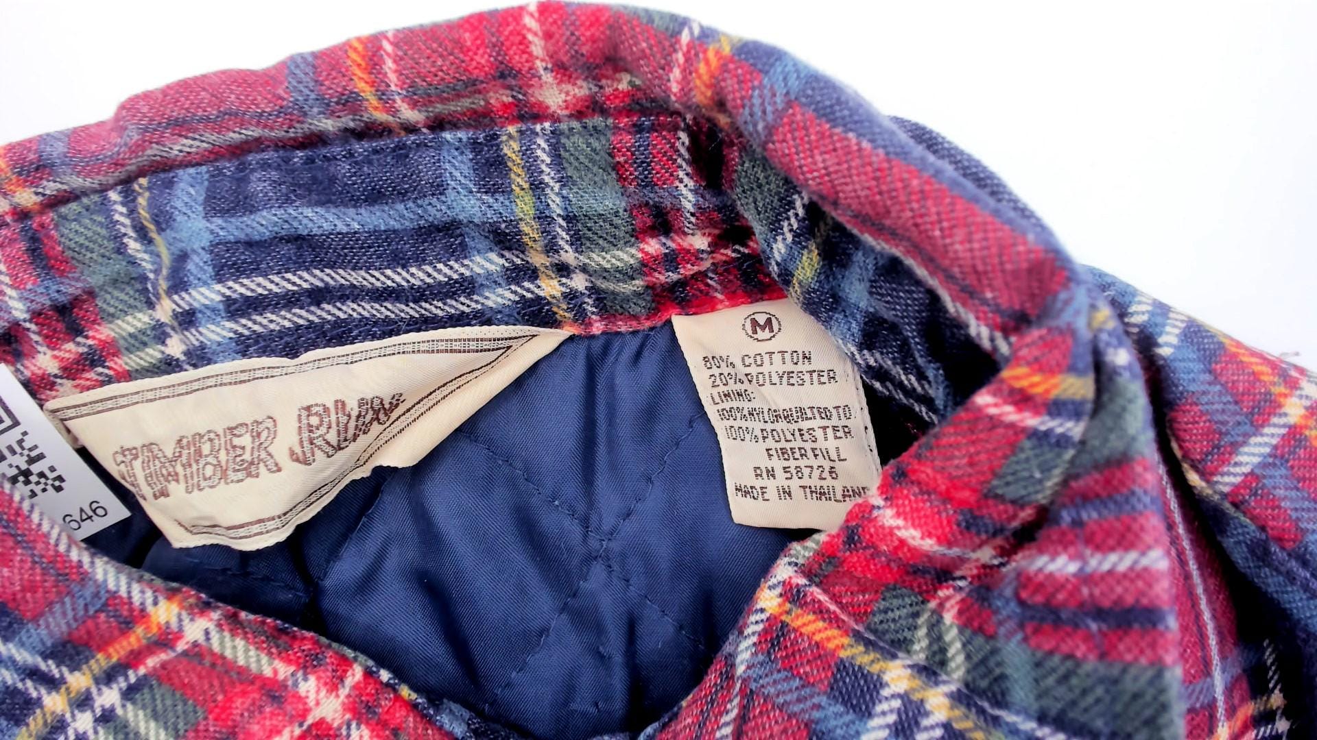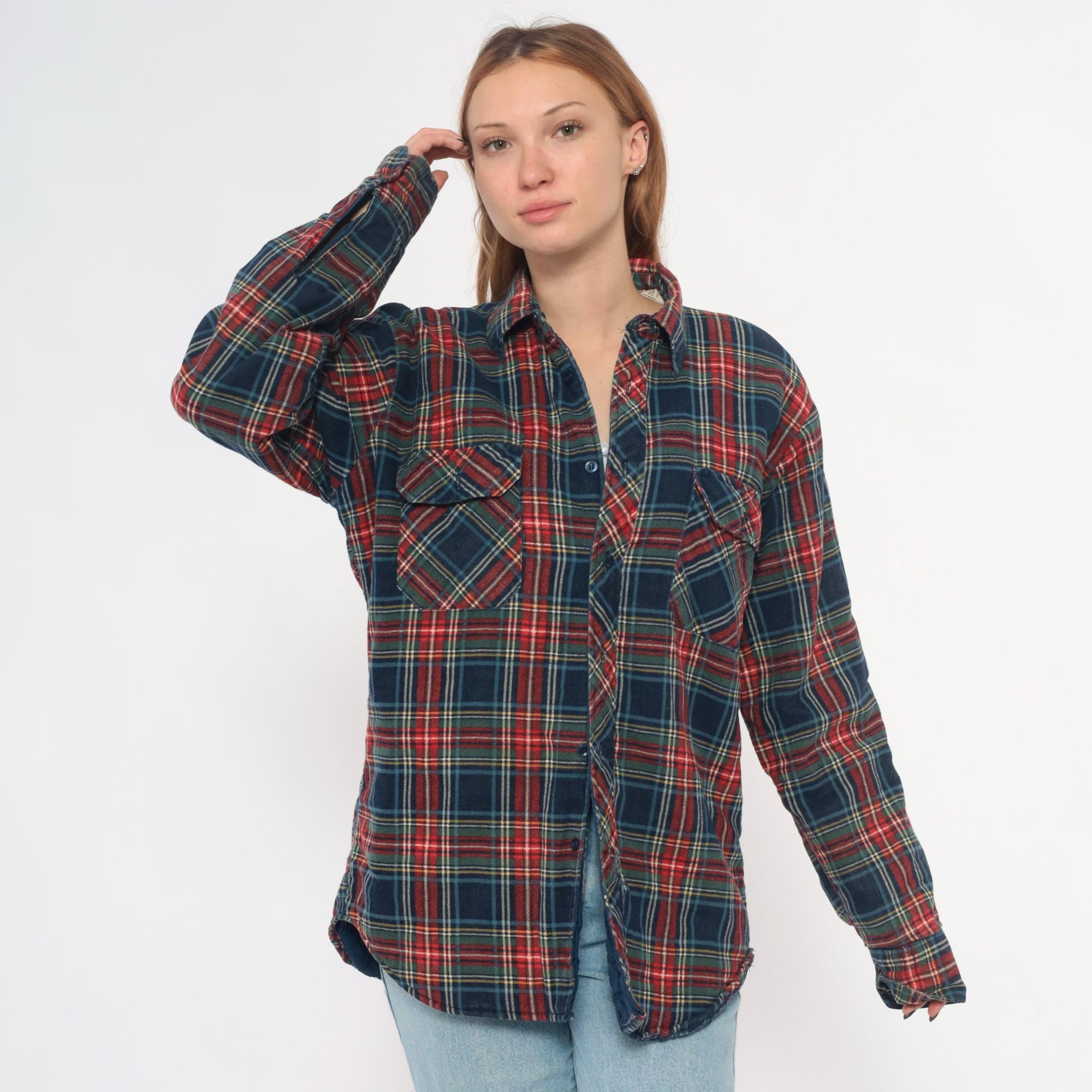 80s navy plaid flannel shirt from timber run with red, green, and yellow tartan pattern throughout. Two chest pockets with button flaps, long sleeves with button cuffs, full button front closure.