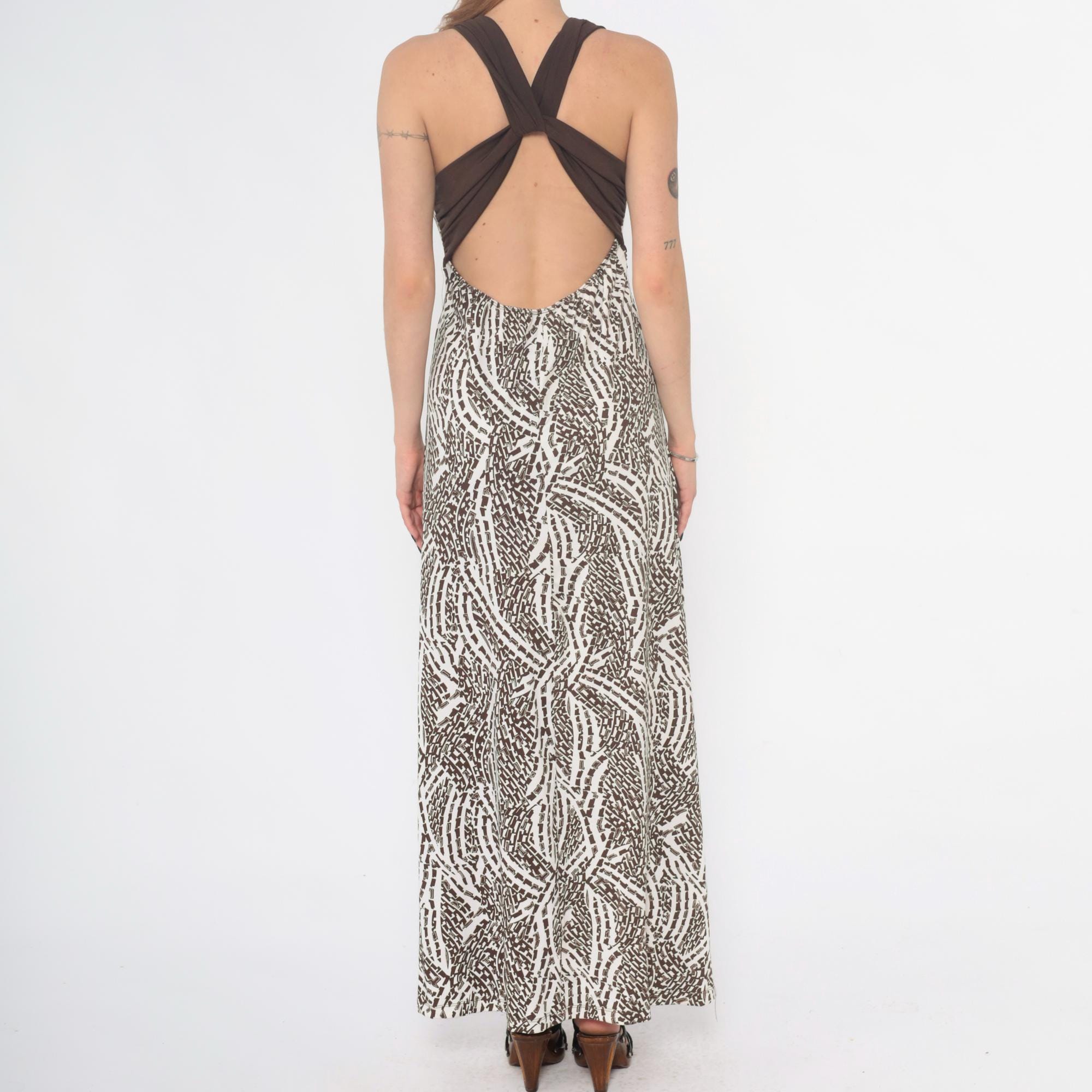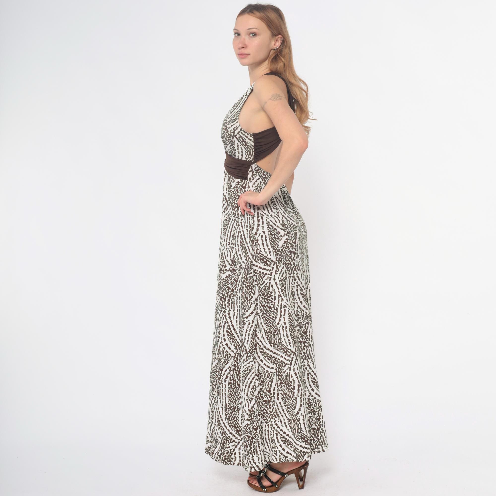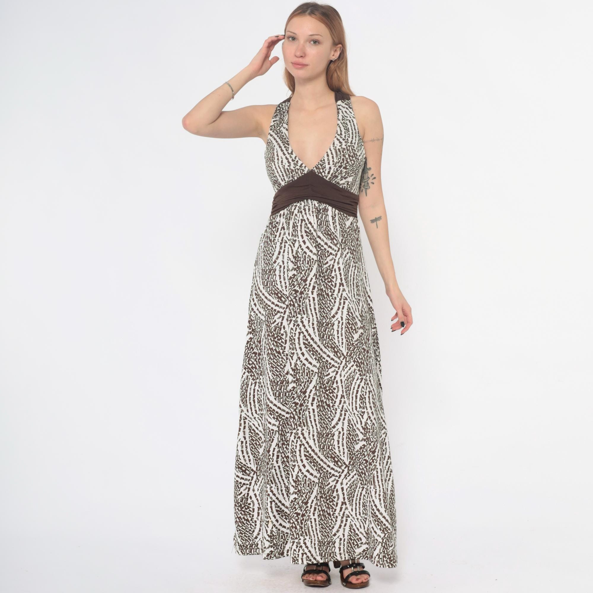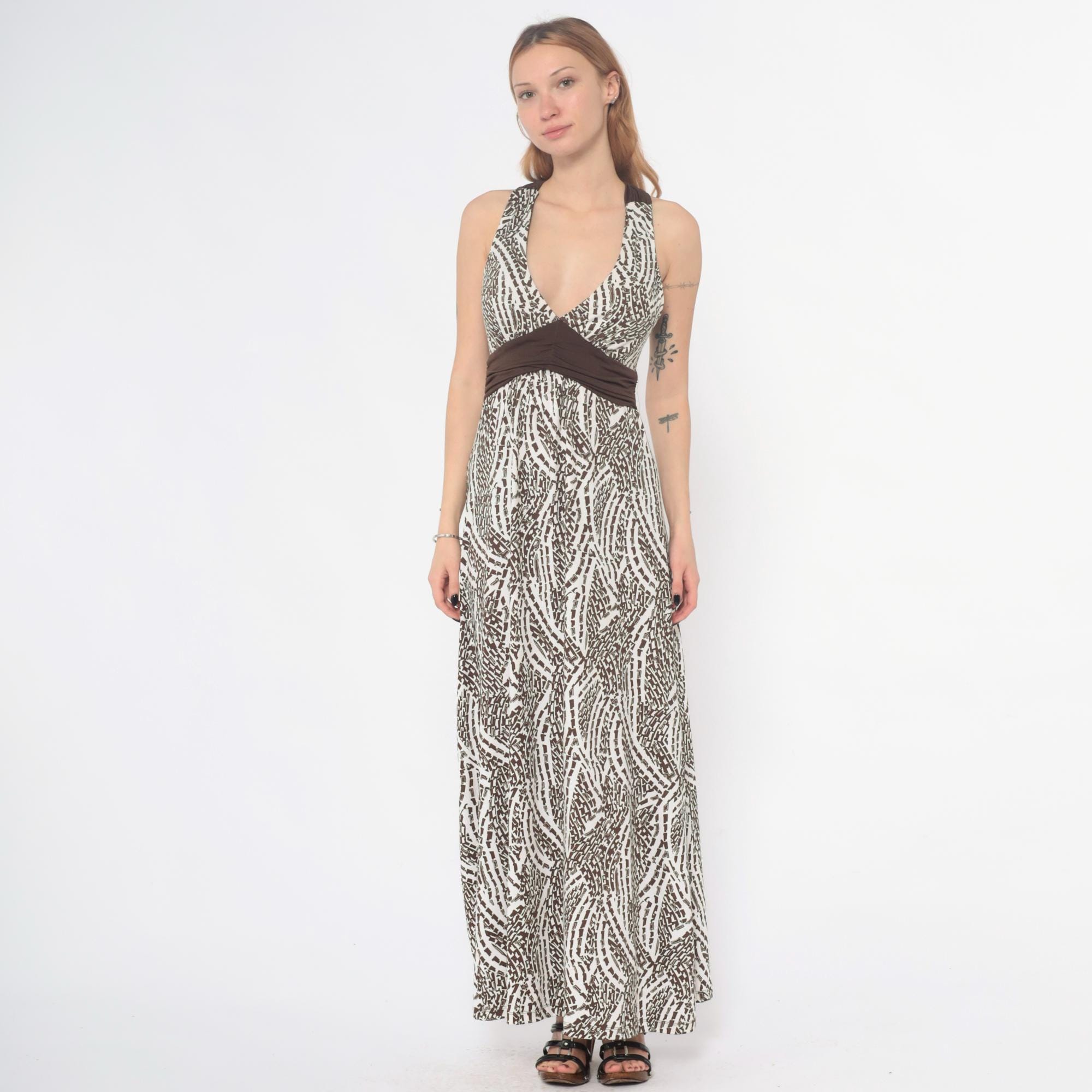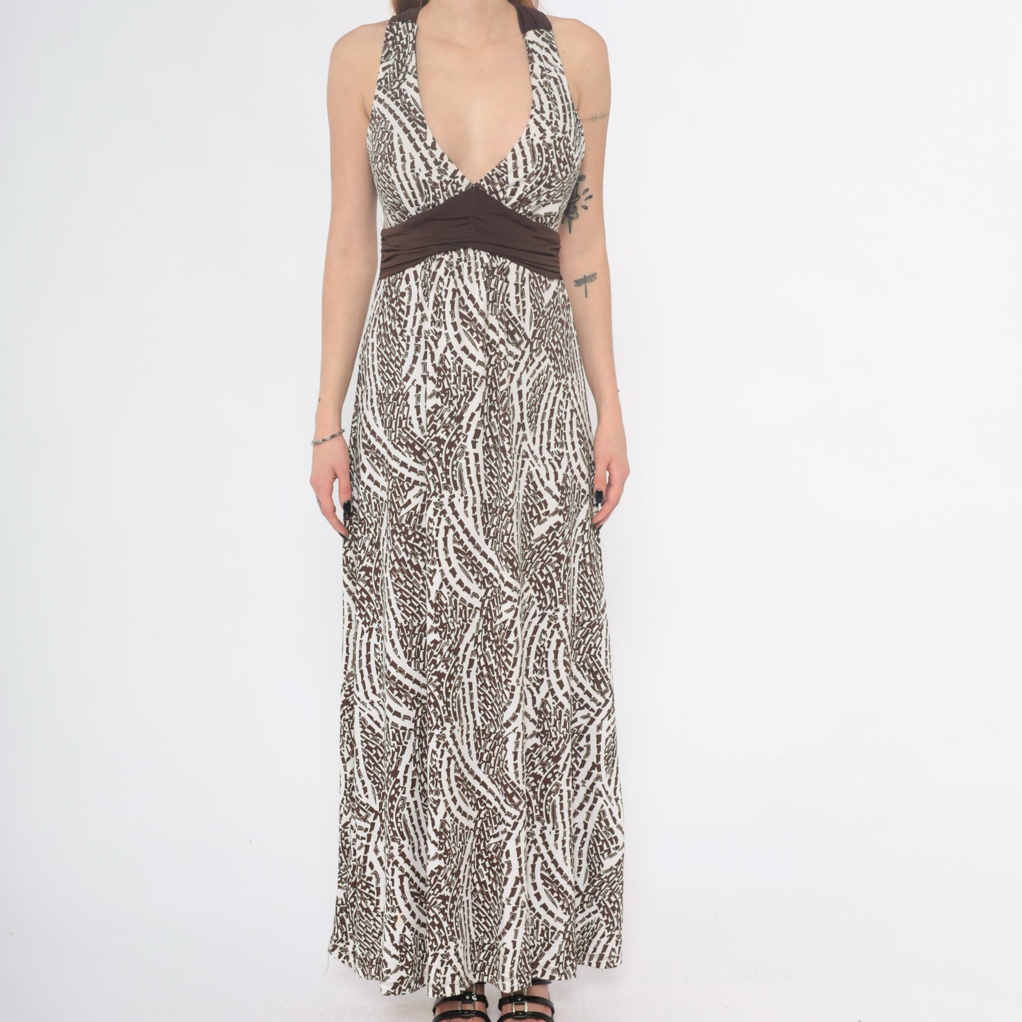 Y2K abstract animal print maxi dress from hypnotik with halter neckline, deep V-neck, and brown empire waist band. Criss-cross back straps creating open back detail. Full-length straight skirt with all-over brown and black geometric pattern on cream base.