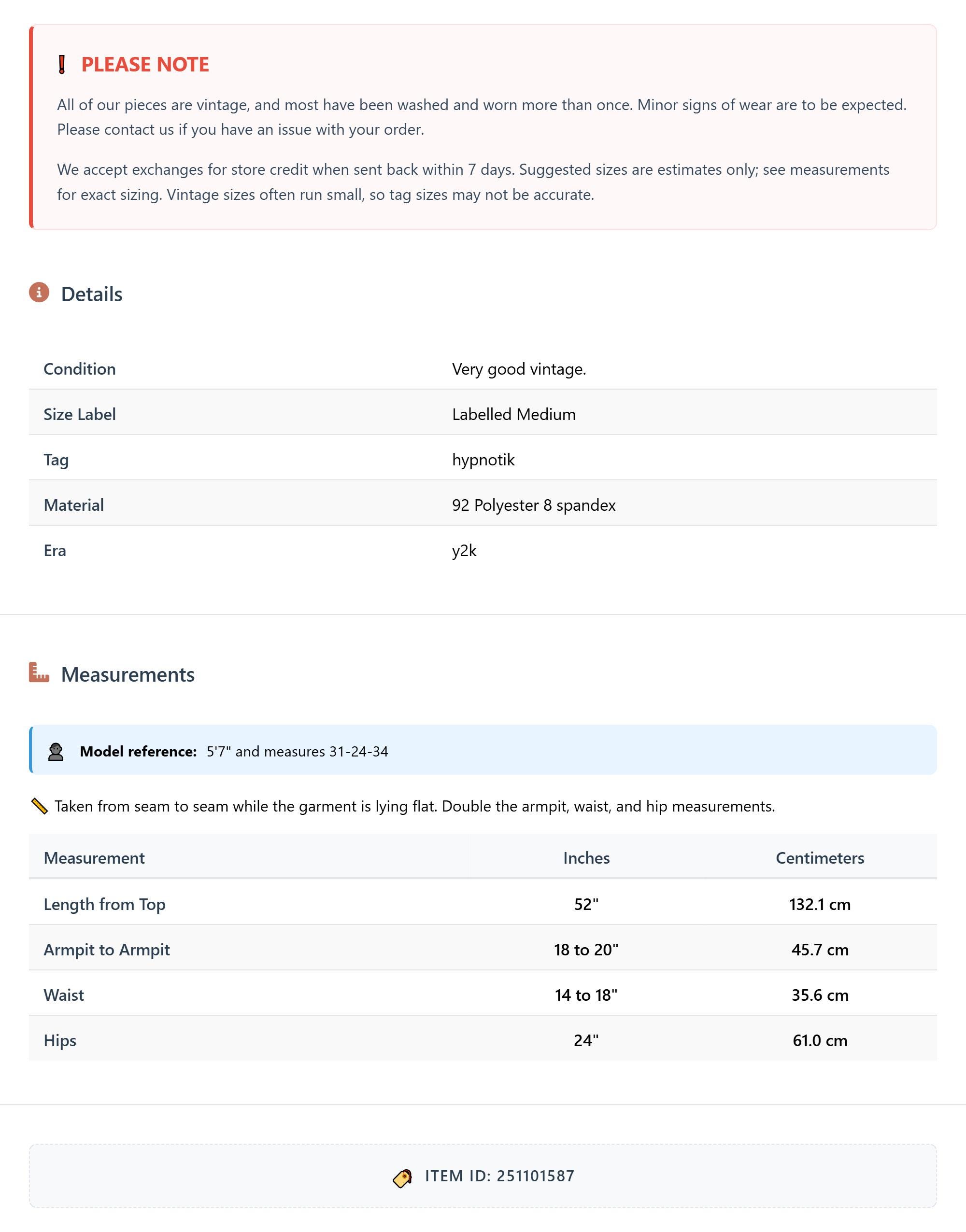 Measurements are taken laying flat and should be doubled where applicable. The "best fits" size is just an estimate, and vintage sizing can vary from modern sizing. Please use measurements to ensure proper fit. The best thing to do is measure a similar item of your own, and compare. When an item has stretch, we will list the unstretched dimensions with the stretched measurement afterwards.