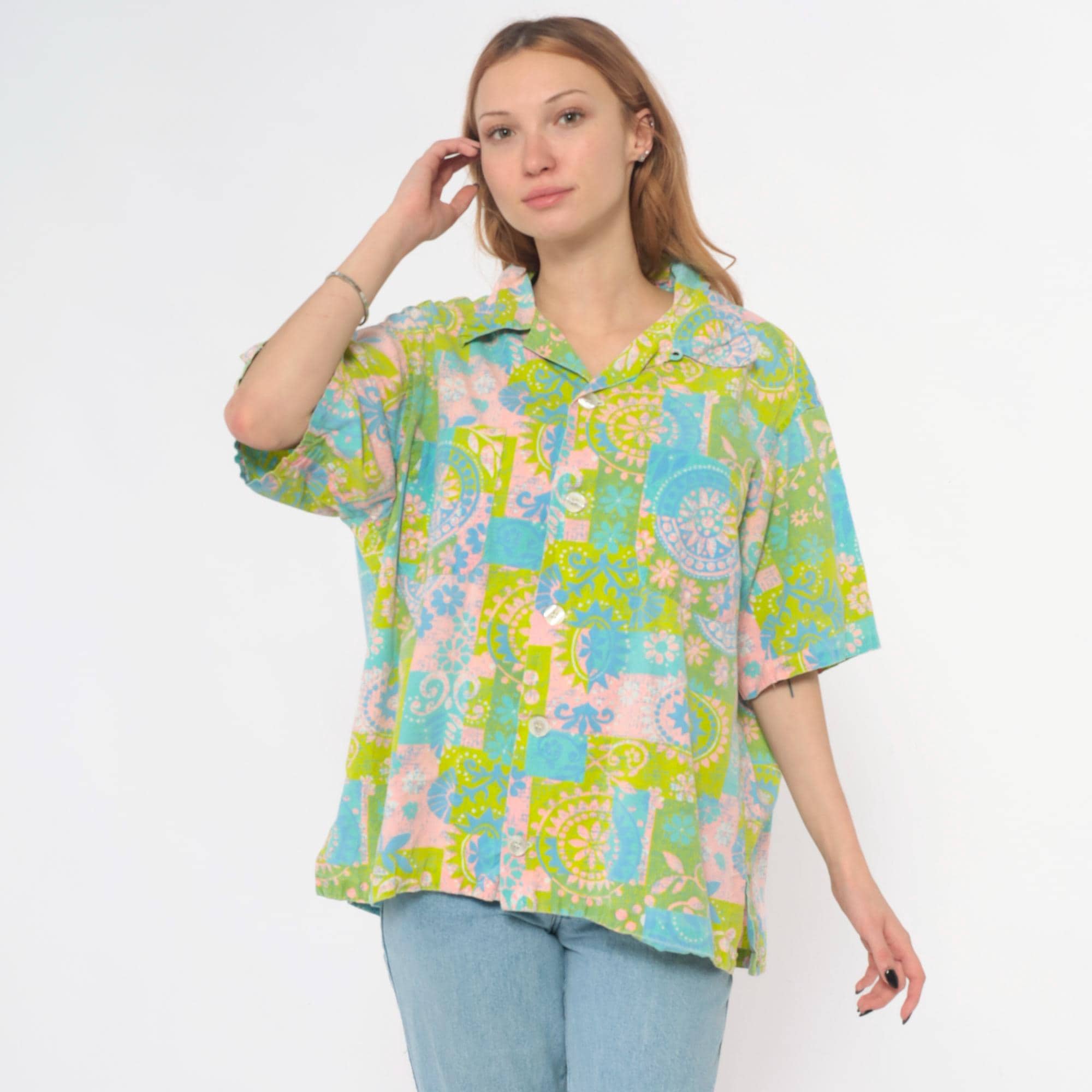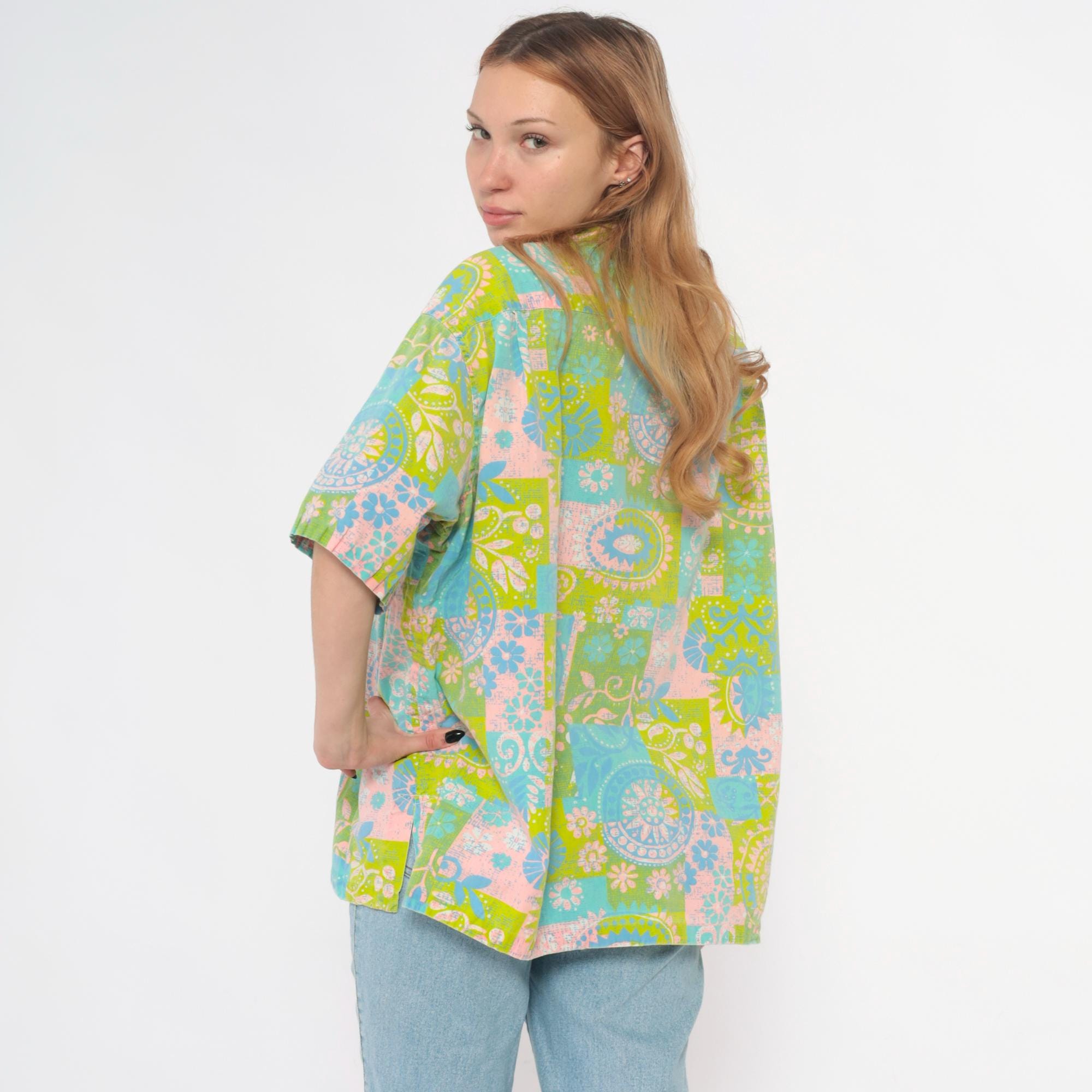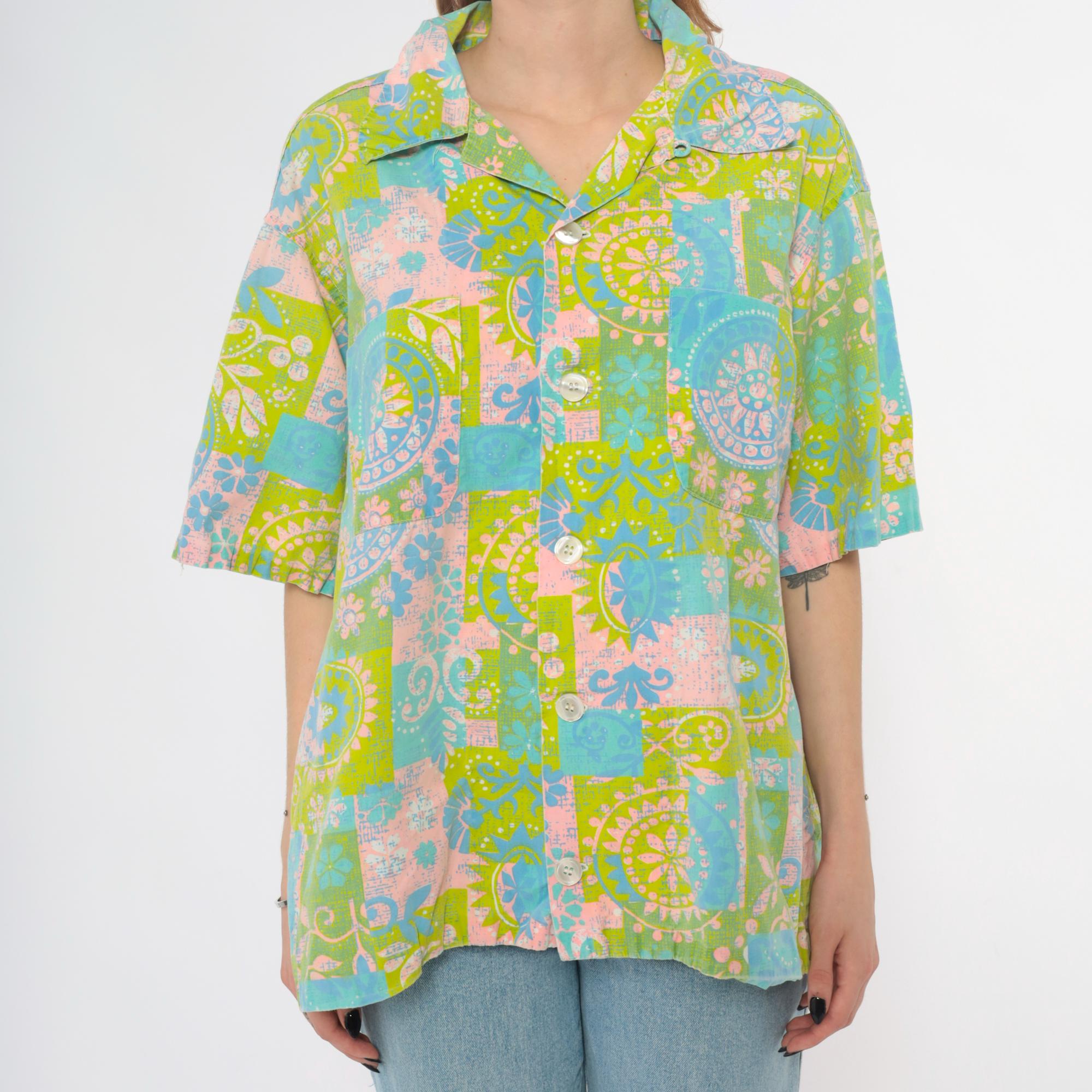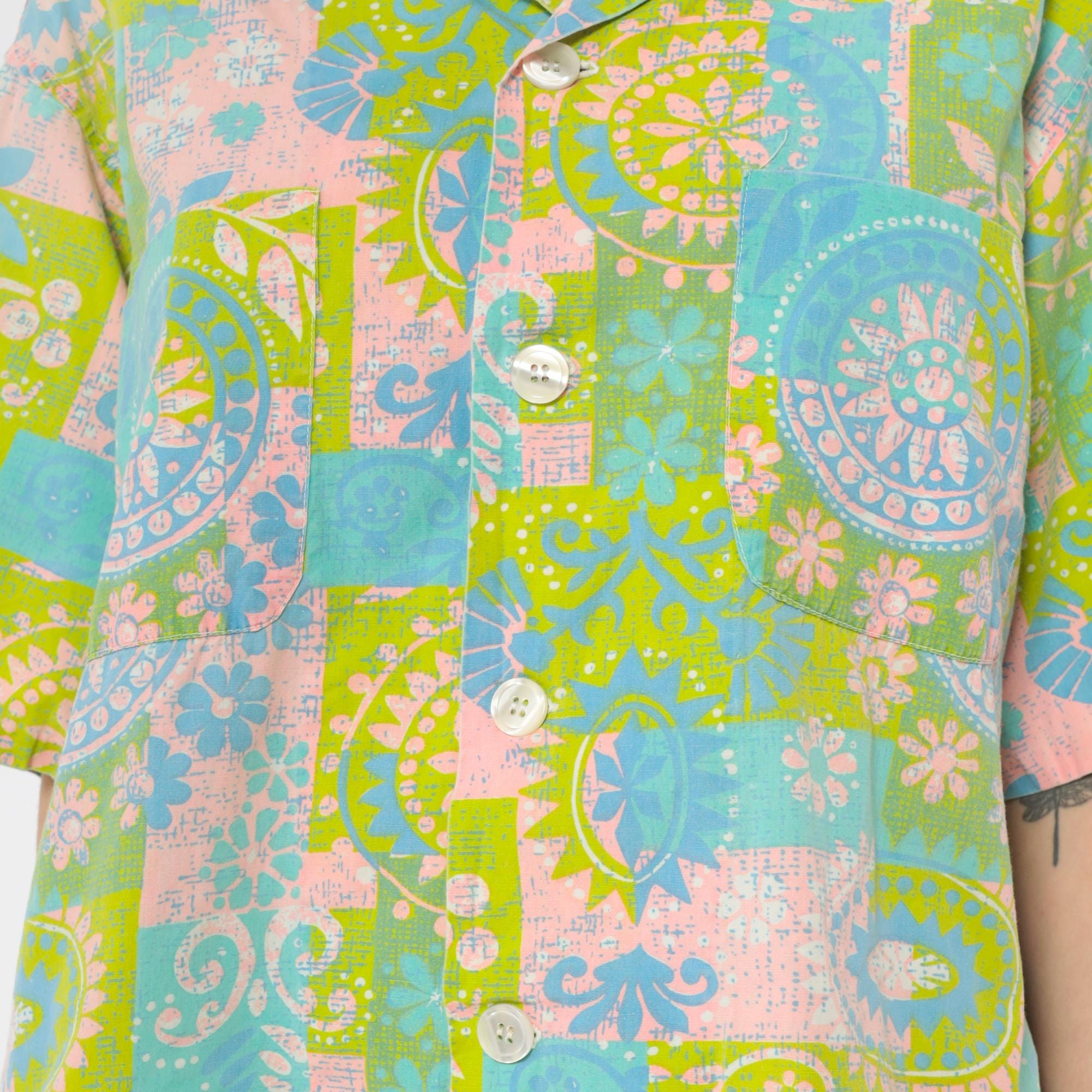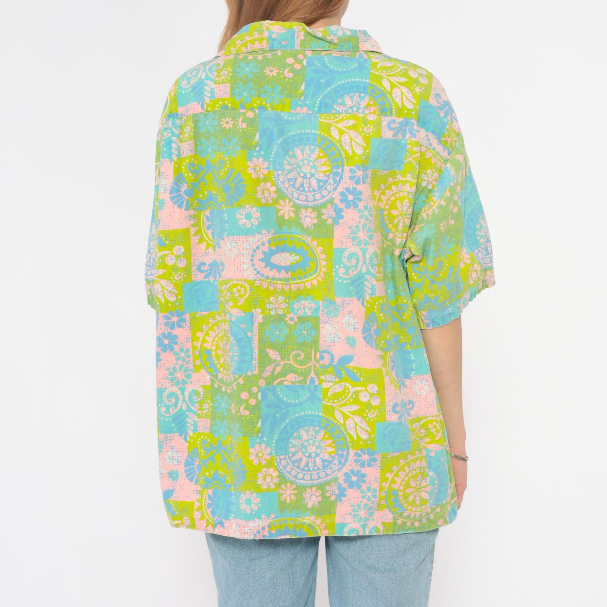70s patchwork print blouse with paisley and floral motifs in lime green, light blue, pink, and white. Button front closure with pointed collar and short sleeves.