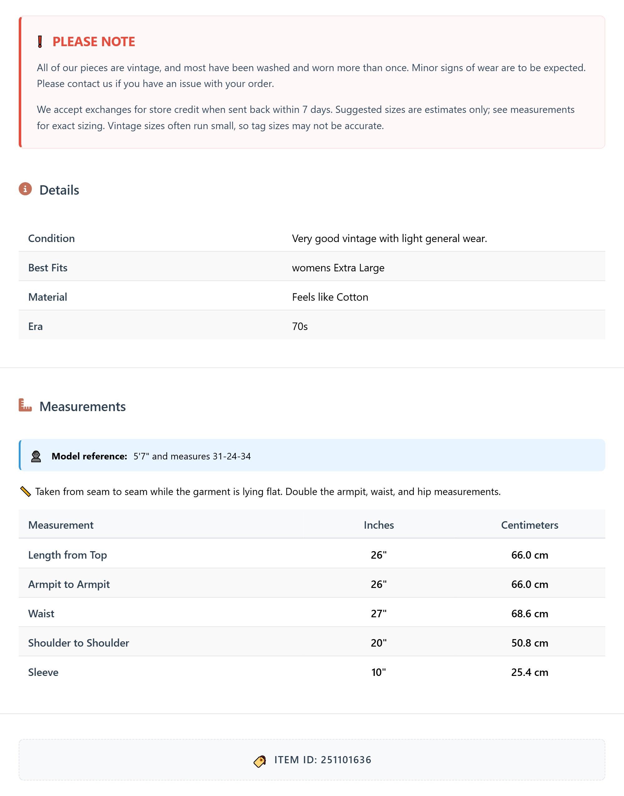 All of our pieces are vintage, and most have been washed and worn more than once. Minor signs of wear are to be expected. Please contact us if you have an issue with your order. We accept exchanges for store credit when sent back within 7 days.