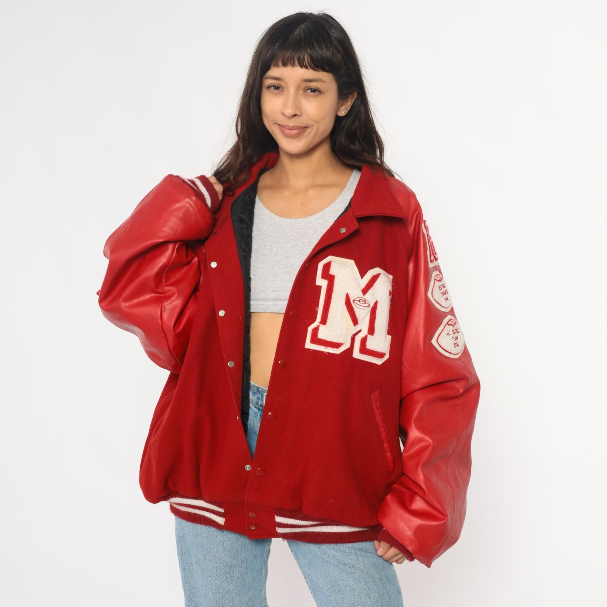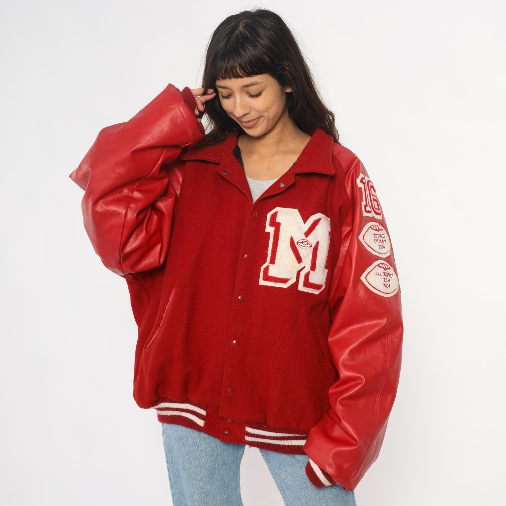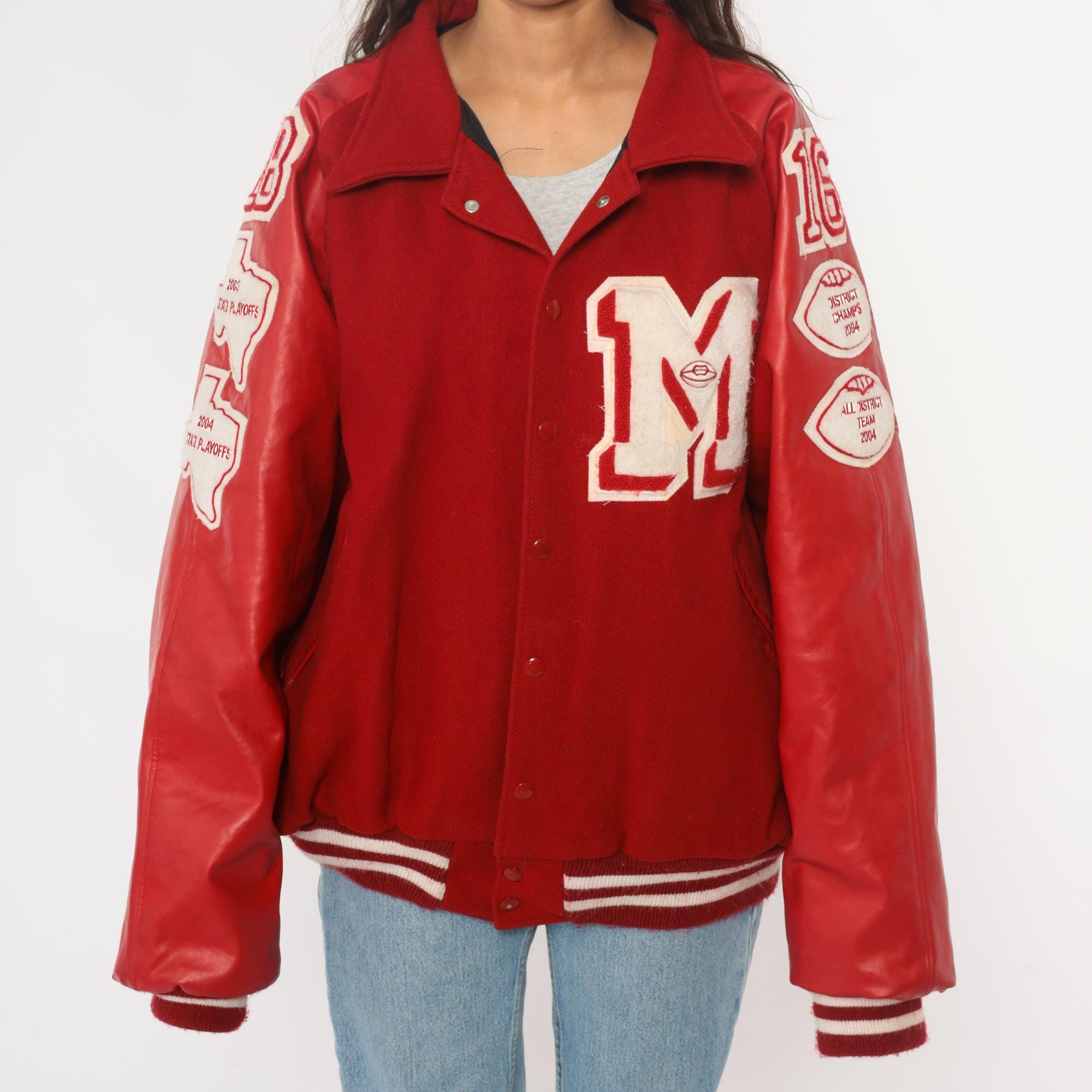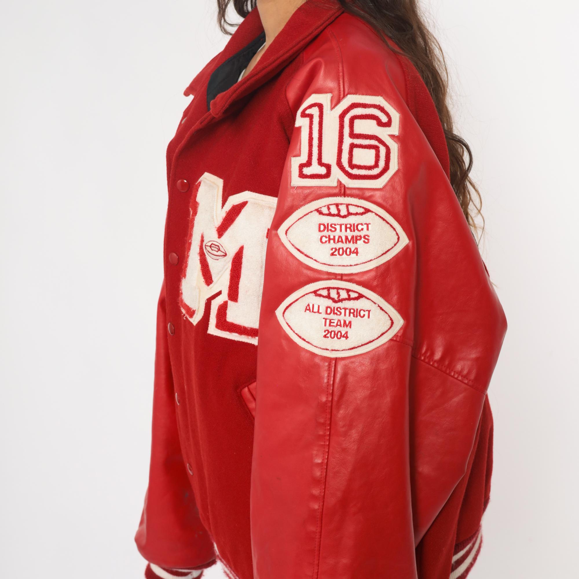 Y2K red varsity jacket from Neff with large white "M" letter patch on chest, white and red football patches on sleeves reading "16", "DISTRICT CHAMPS 2004", and "ALL DISTRICT TEAM 2004", and "BEREUTER" across back yoke. Button front closure, ribbed knit collar, cuffs, and hem with white stripes.