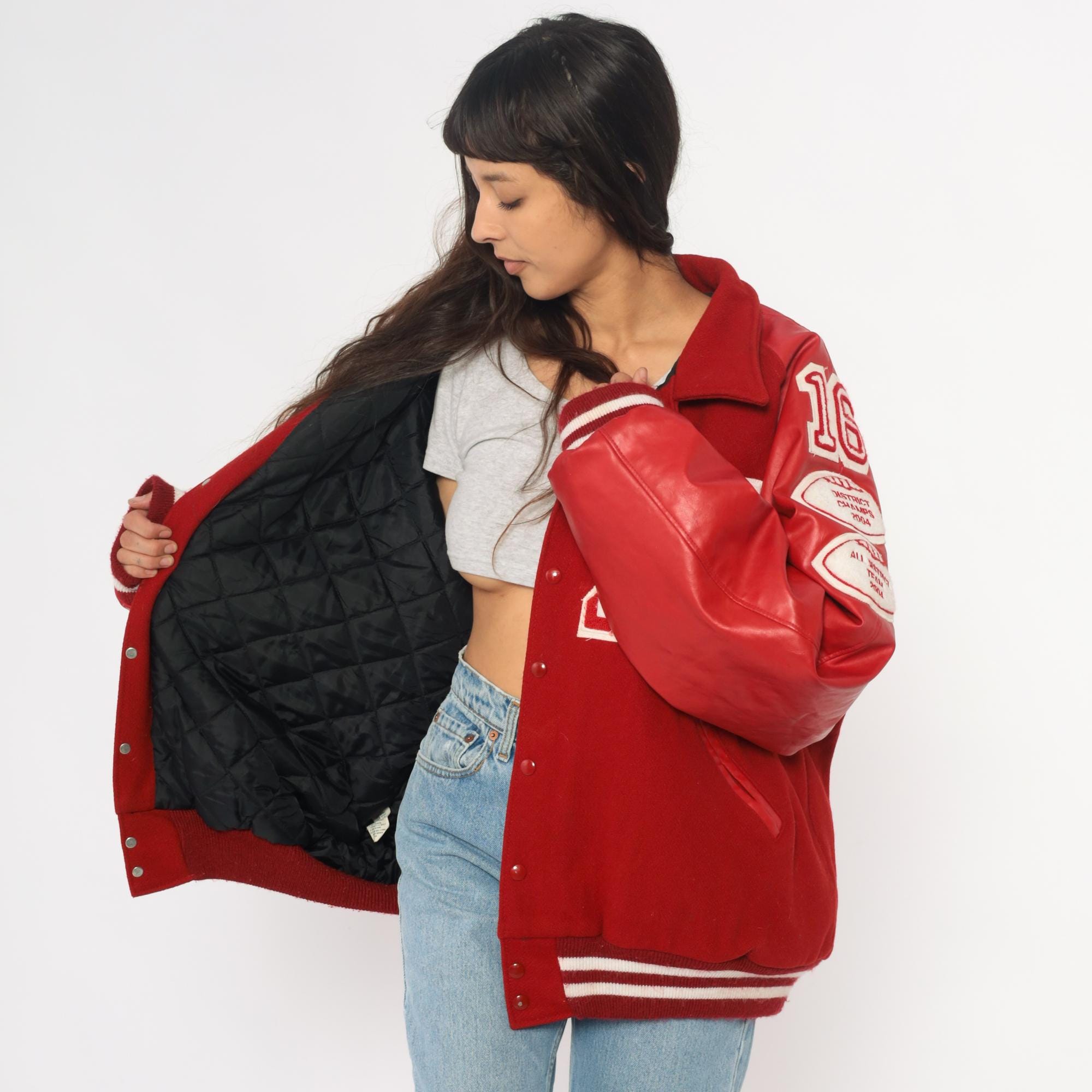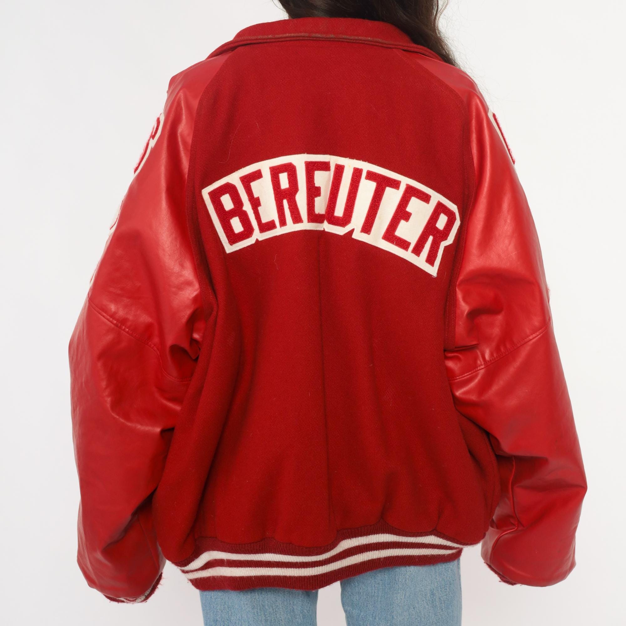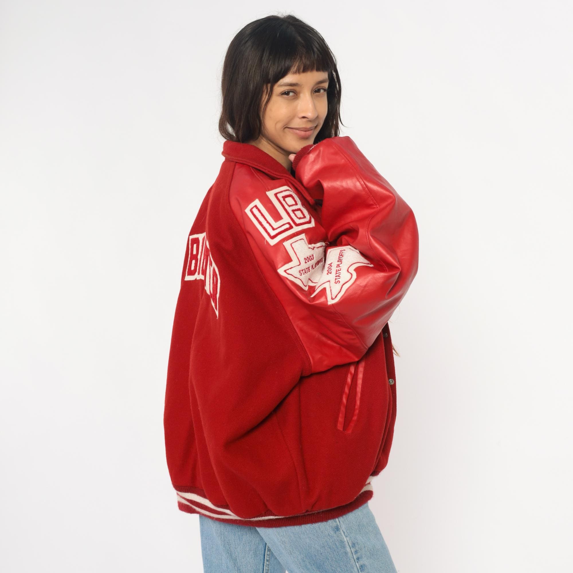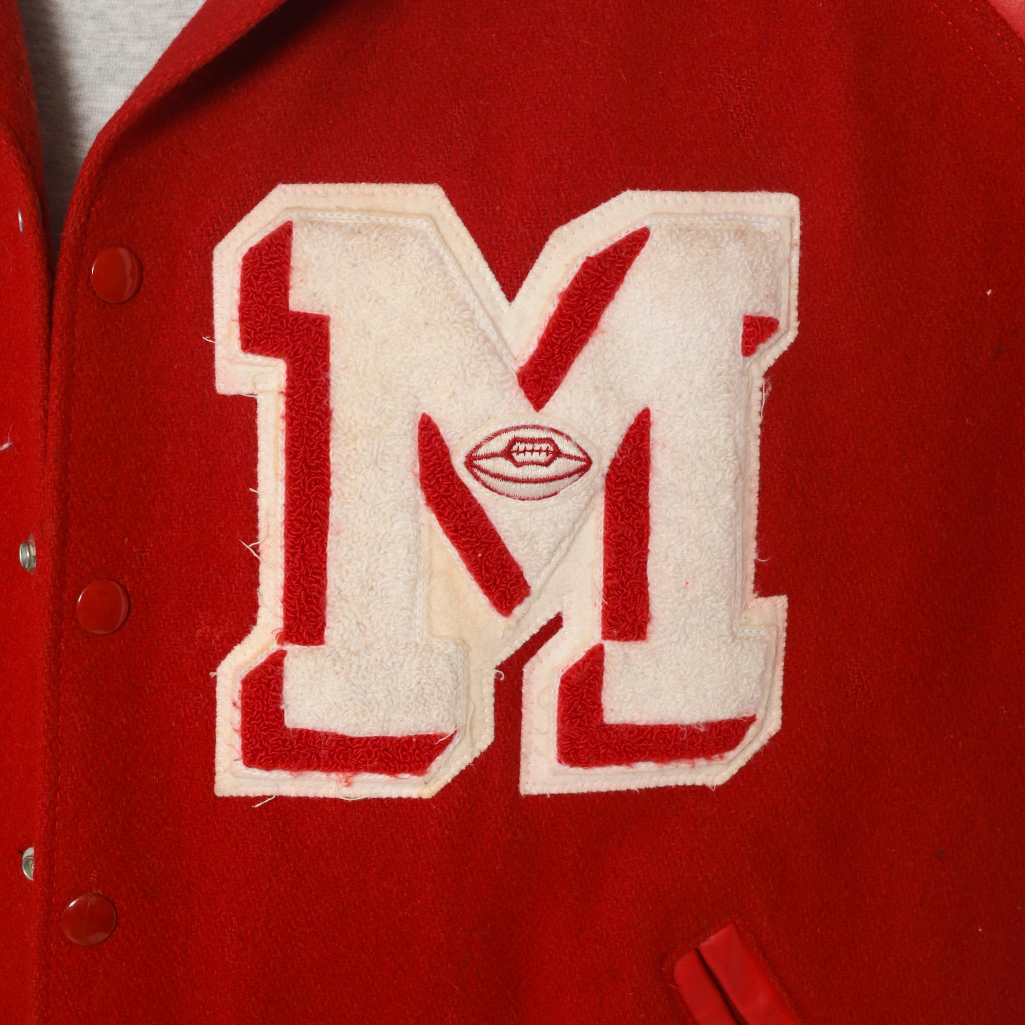 Y2K red varsity jacket from Neff with large white "M" letter patch on chest, white and red football patches on sleeves reading "16", "DISTRICT CHAMPS 2004", and "ALL DISTRICT TEAM 2004", and "BEREUTER" across back yoke. Button front closure, ribbed knit collar, cuffs, and hem with white stripes.