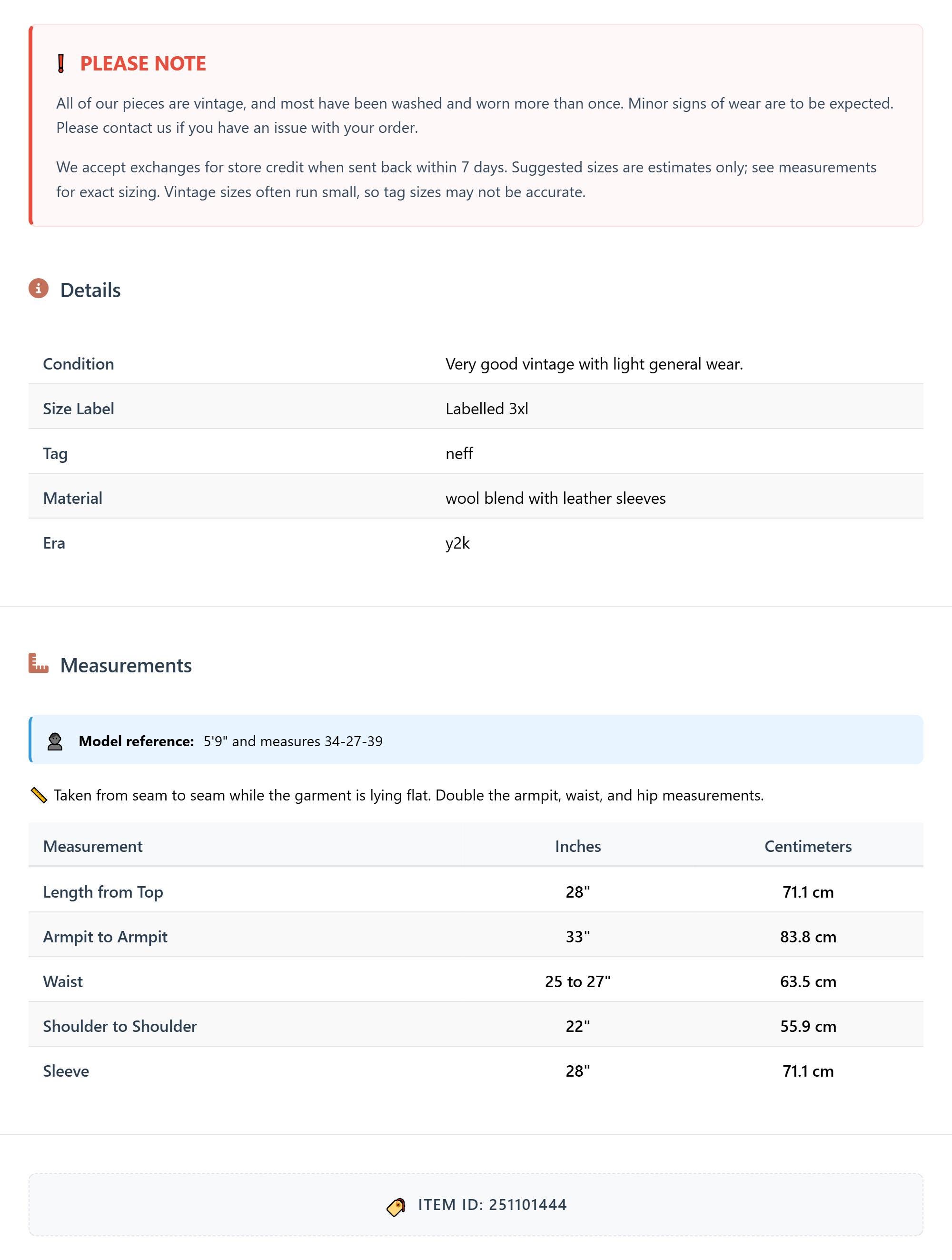 All of our pieces are vintage, and most have been washed and worn more than once. Minor signs of wear are to be expected. Please contact us if you have an issue with your order. We accept exchanges for store credit when sent back within 7 days.