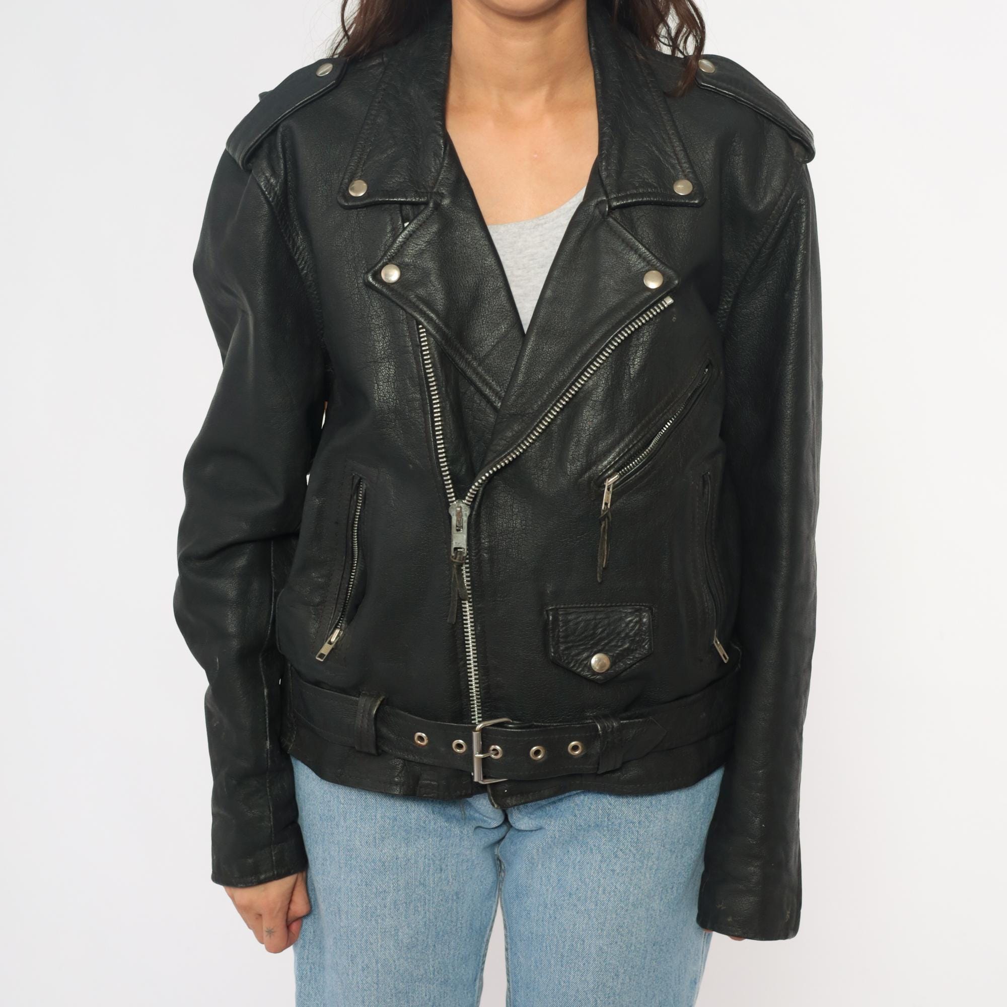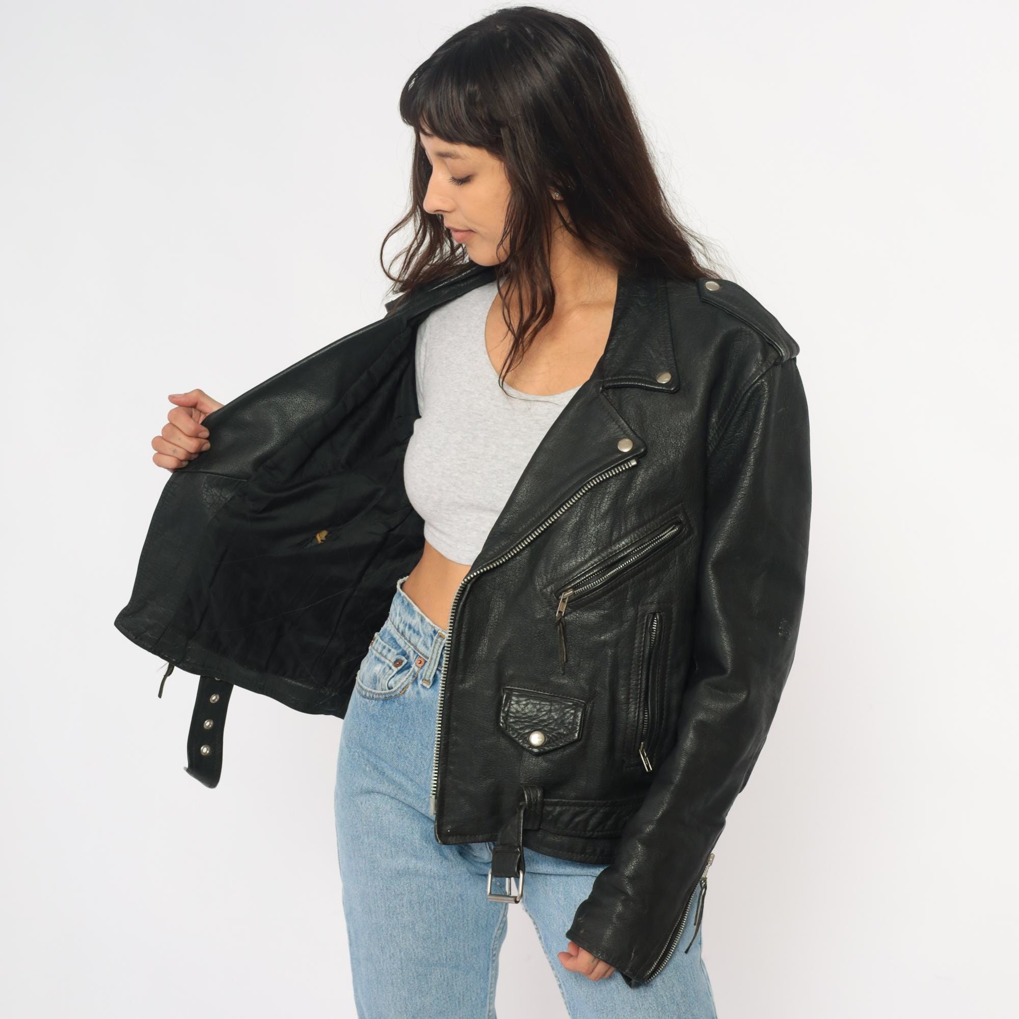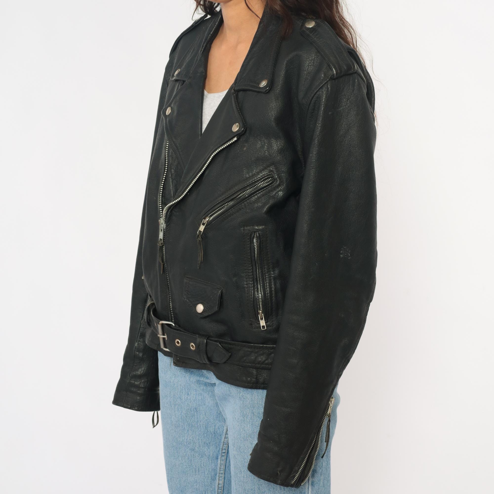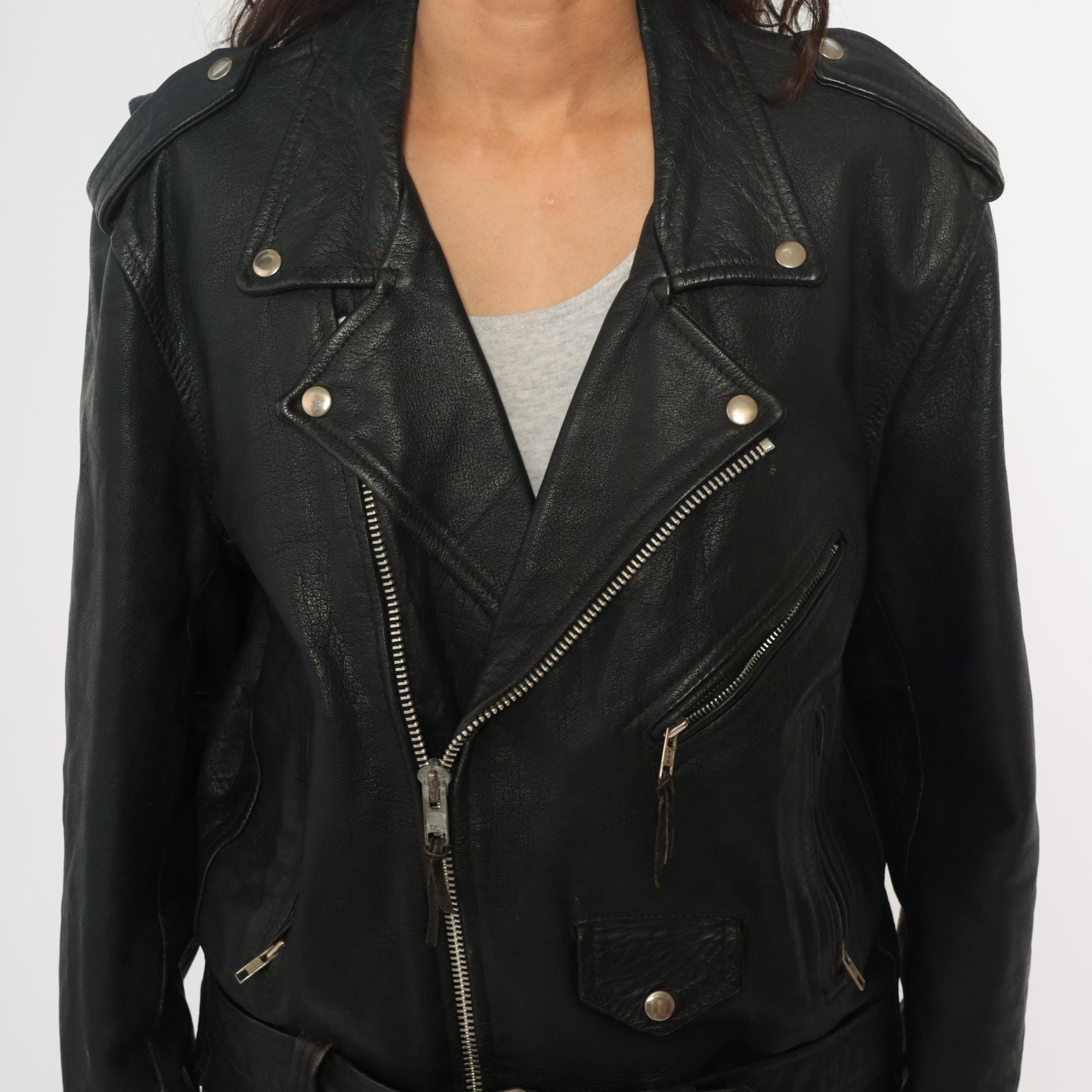 90s black leather motorcycle jacket from Wilsons Leather with asymmetric front zipper closure and belted waist. Notched collar with snap buttons, snap-button epaulettes on shoulders, zippered chest pocket, two front waist pockets with zipper closures, and zipper details at cuffs.