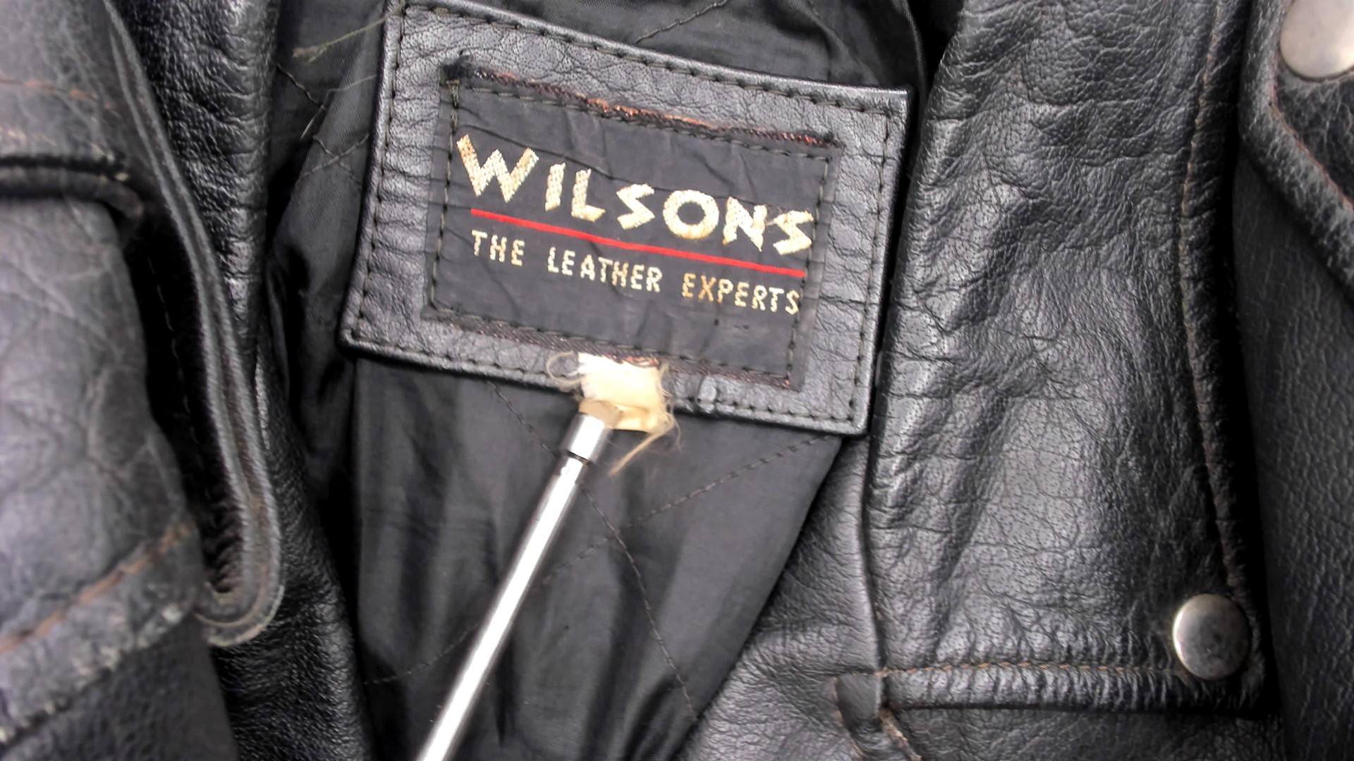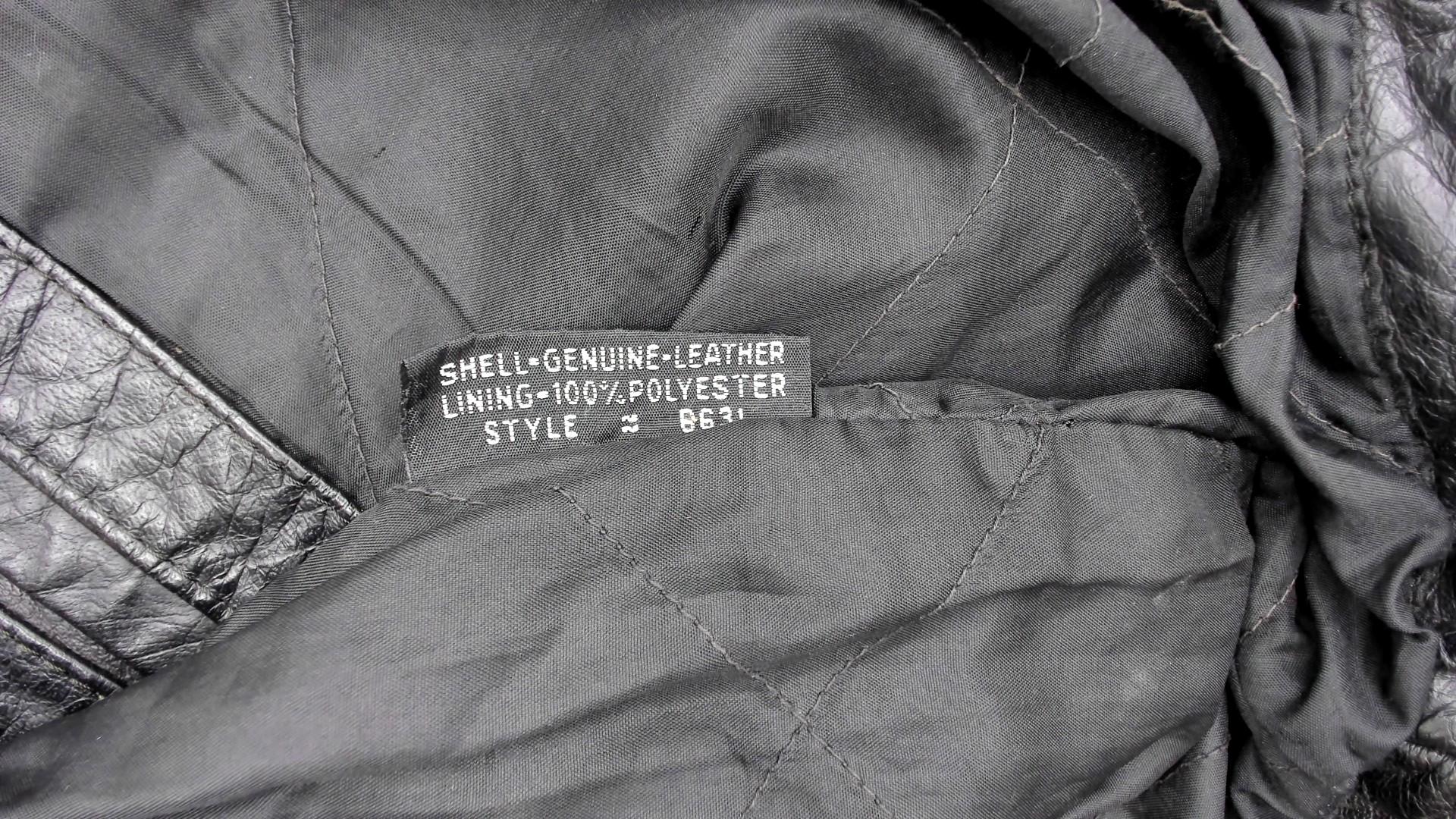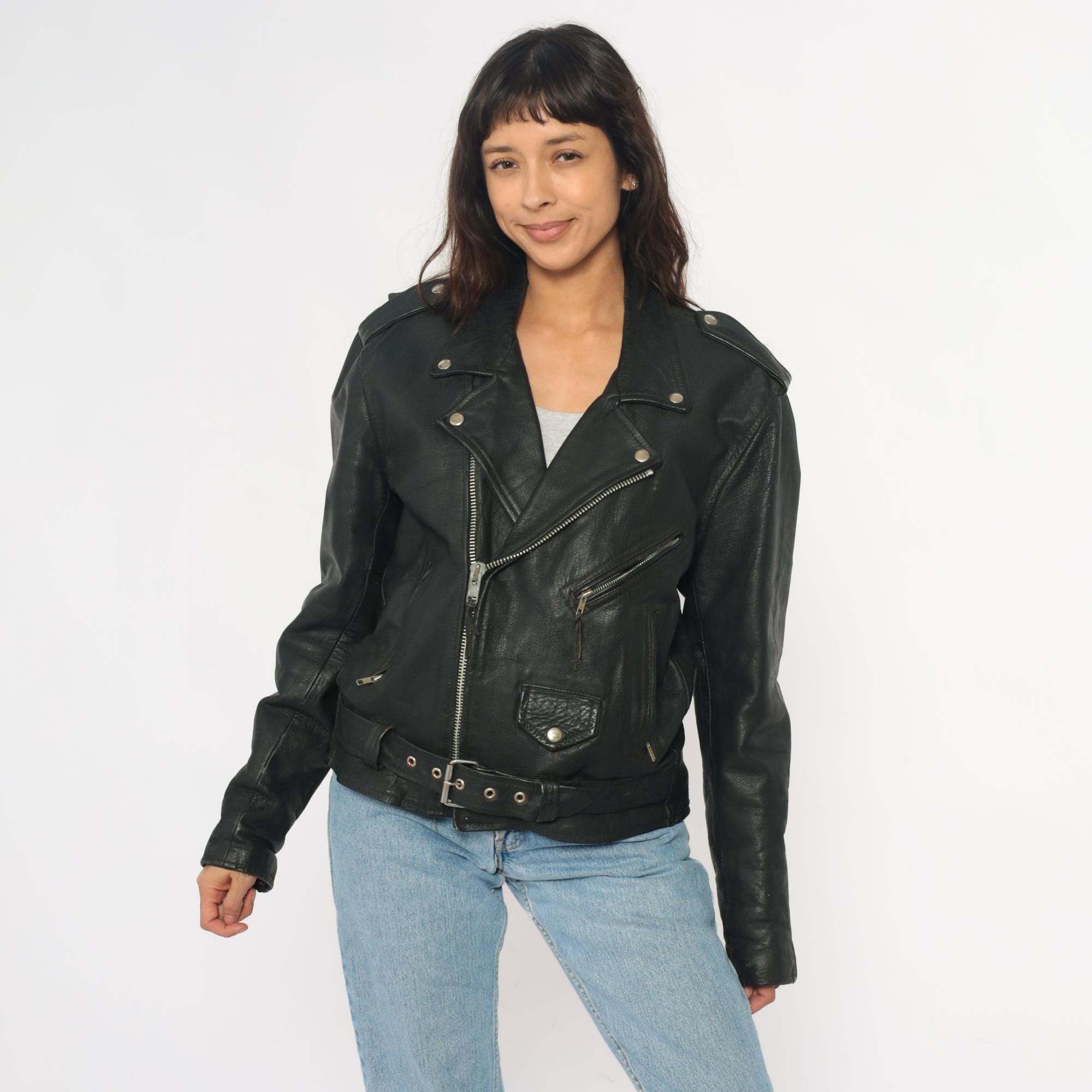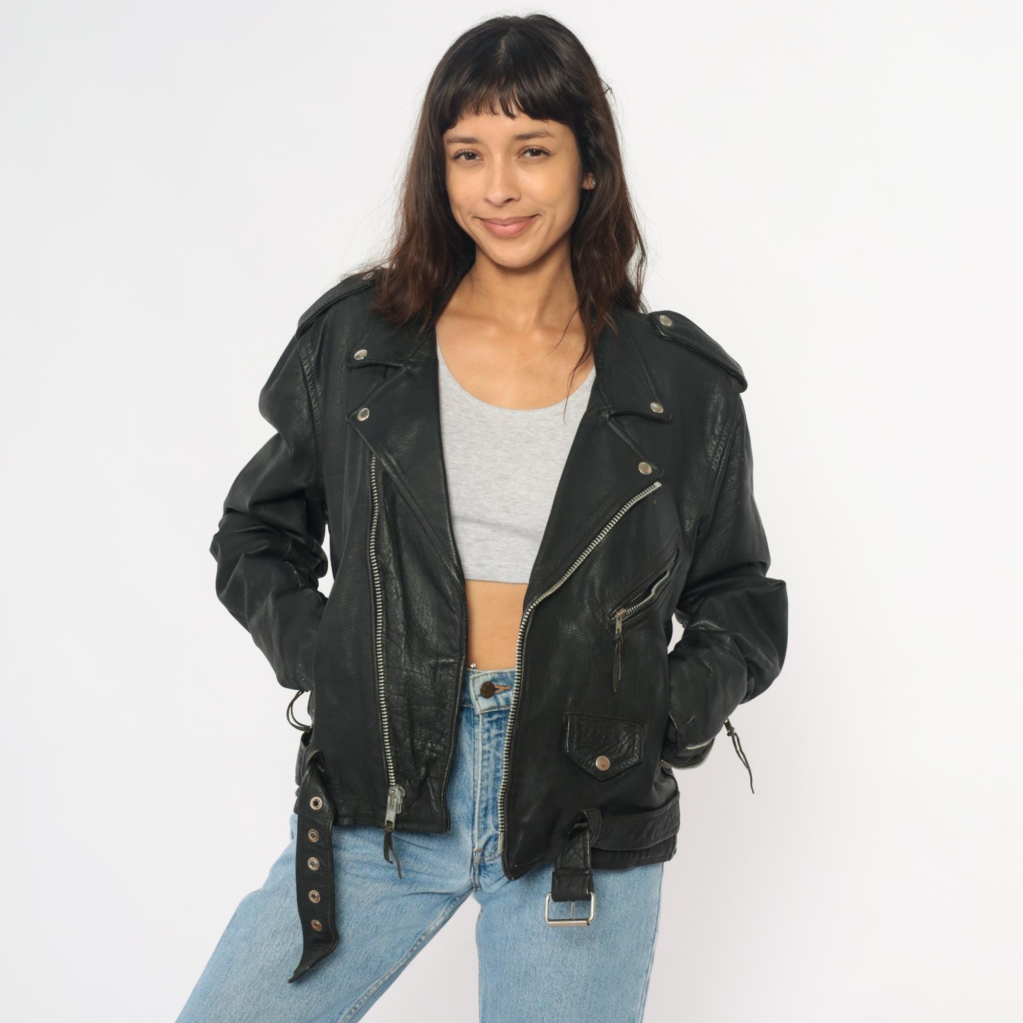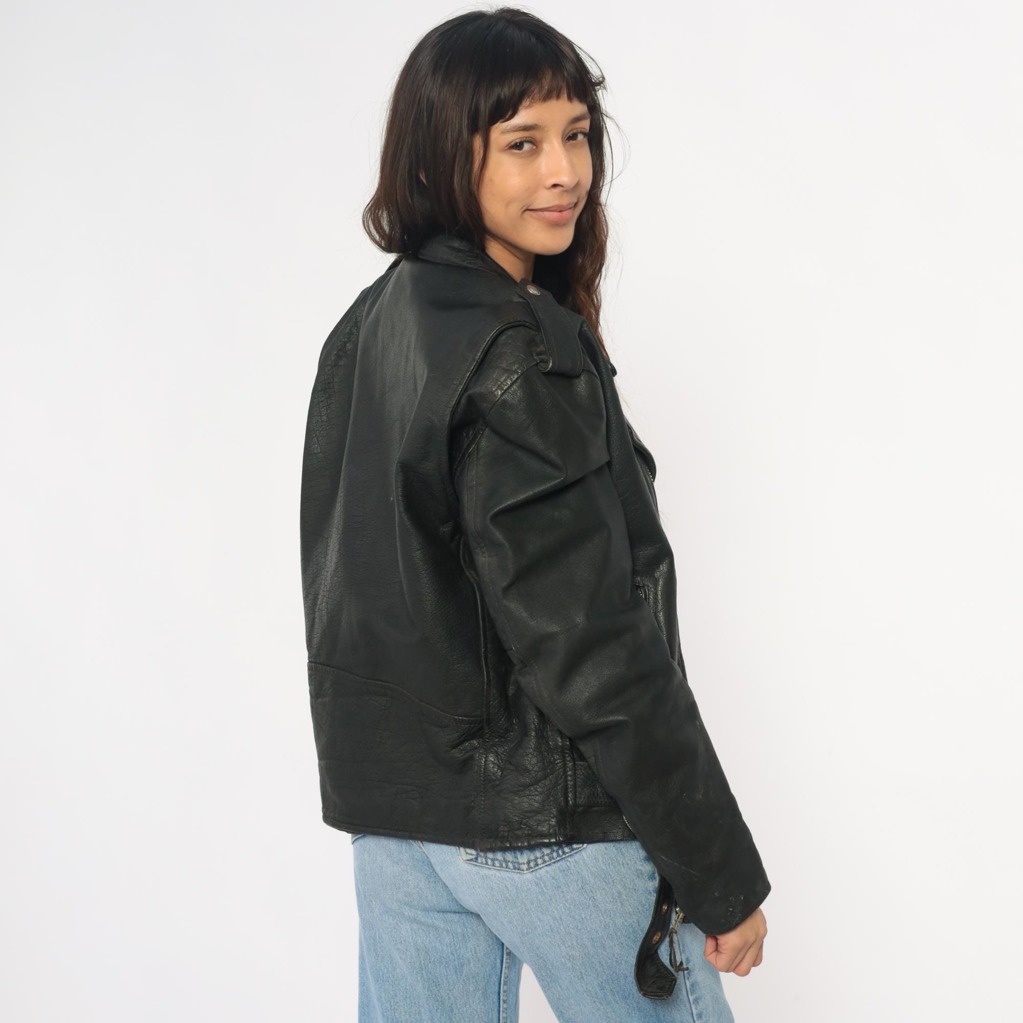 90s black leather motorcycle jacket from Wilsons Leather with asymmetric front zipper closure and belted waist. Notched collar with snap buttons, snap-button epaulettes on shoulders, zippered chest pocket, two front waist pockets with zipper closures, and zipper details at cuffs.