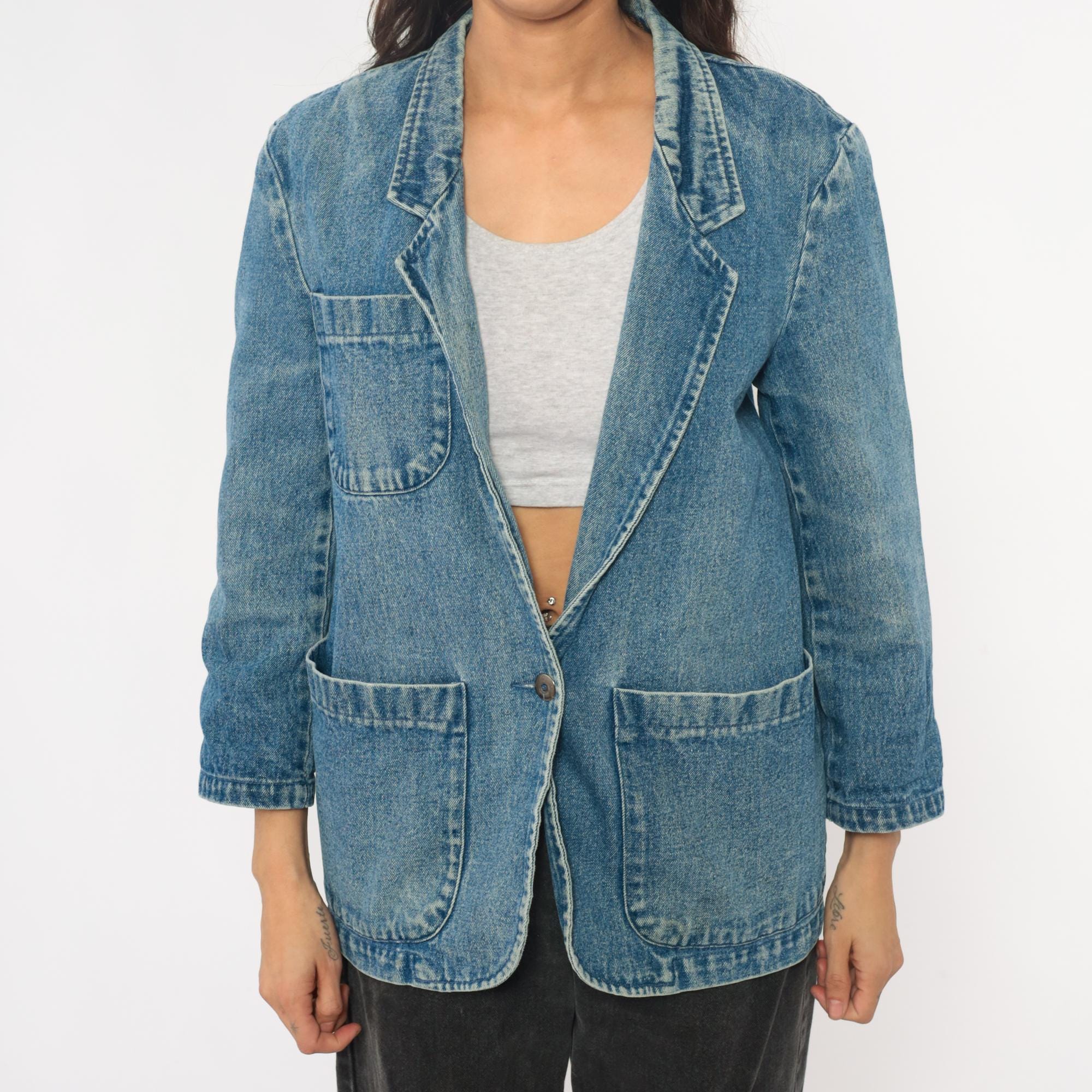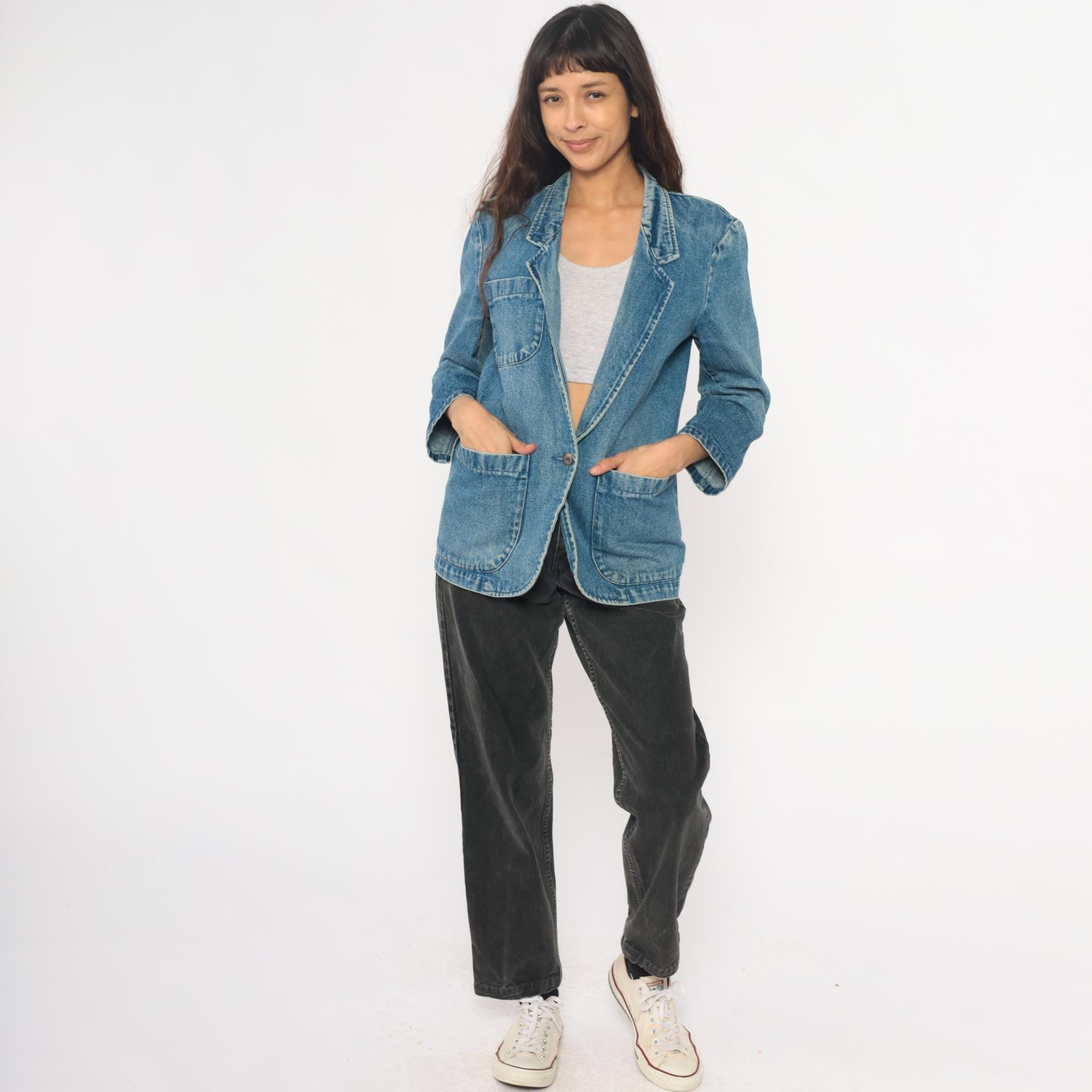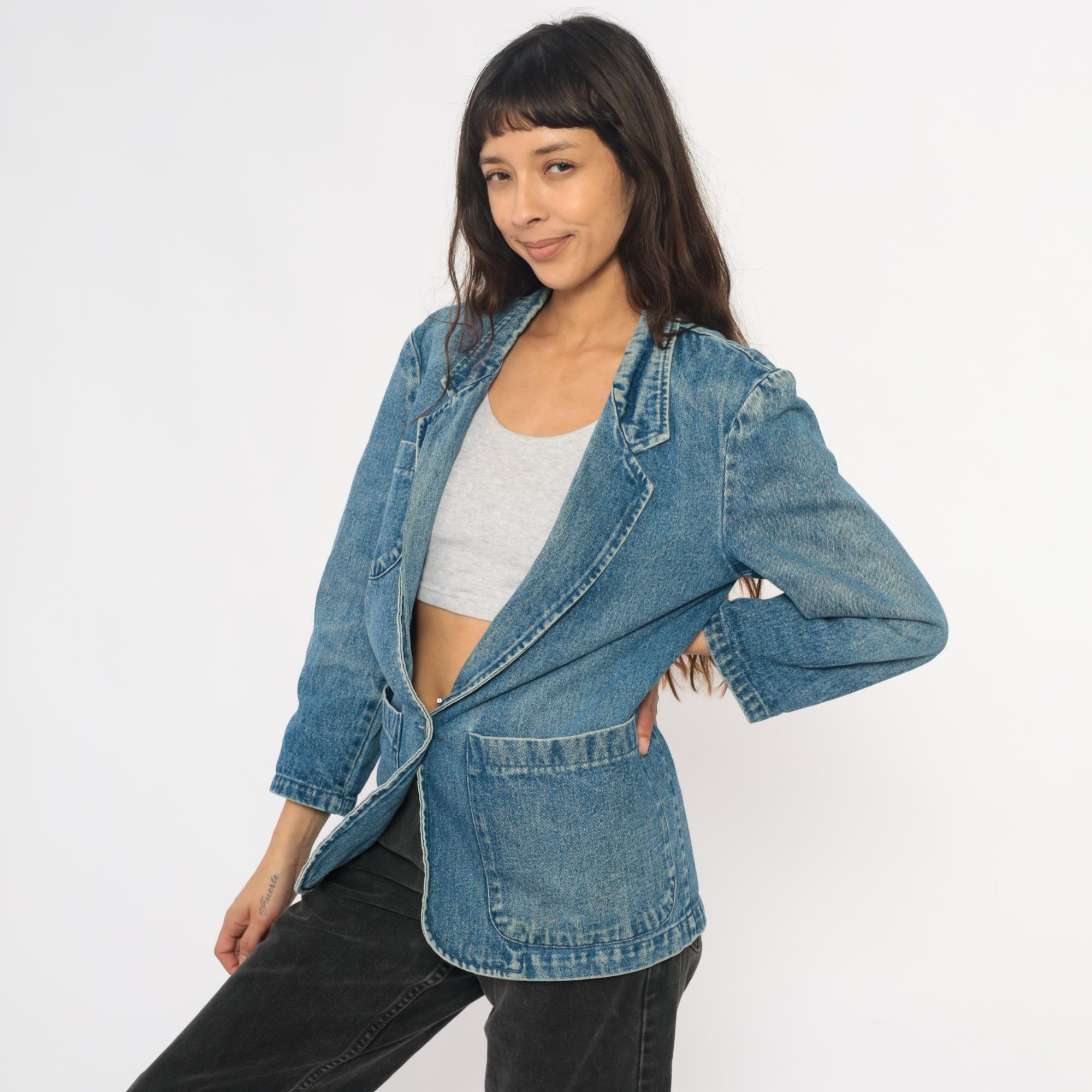 90s medium blue denim blazer from Eddie Bauer with notched collar and lapels, single button front closure, and two patch pockets at hips. Long sleeves with structured, tailored silhouette.