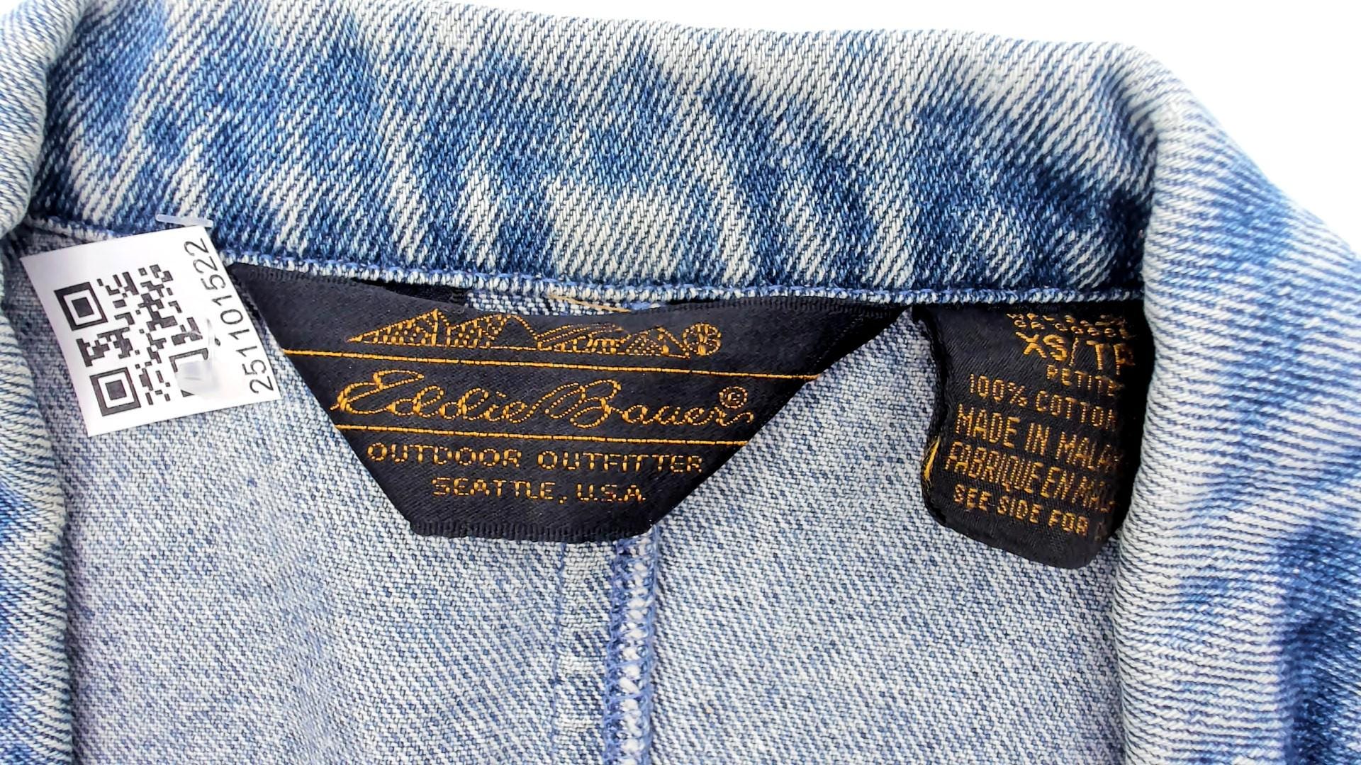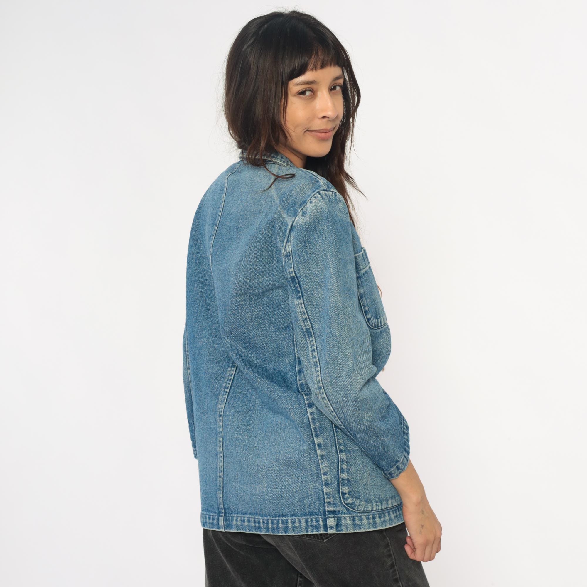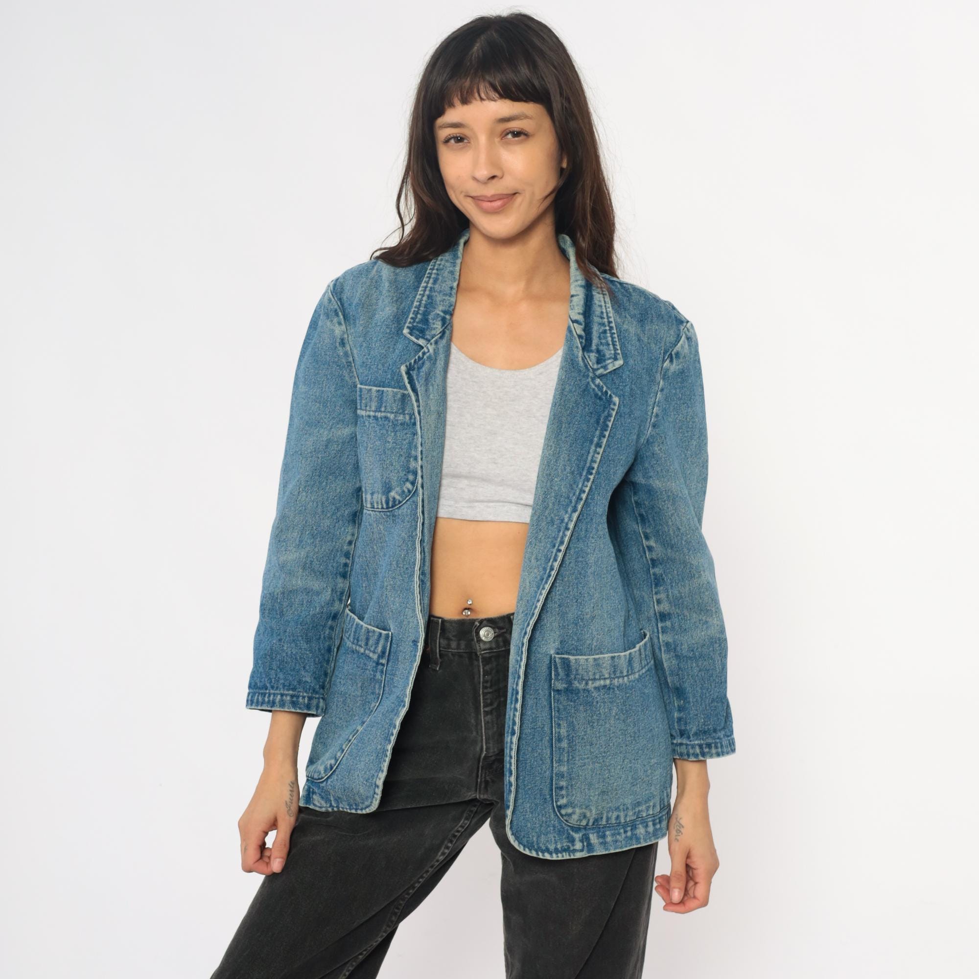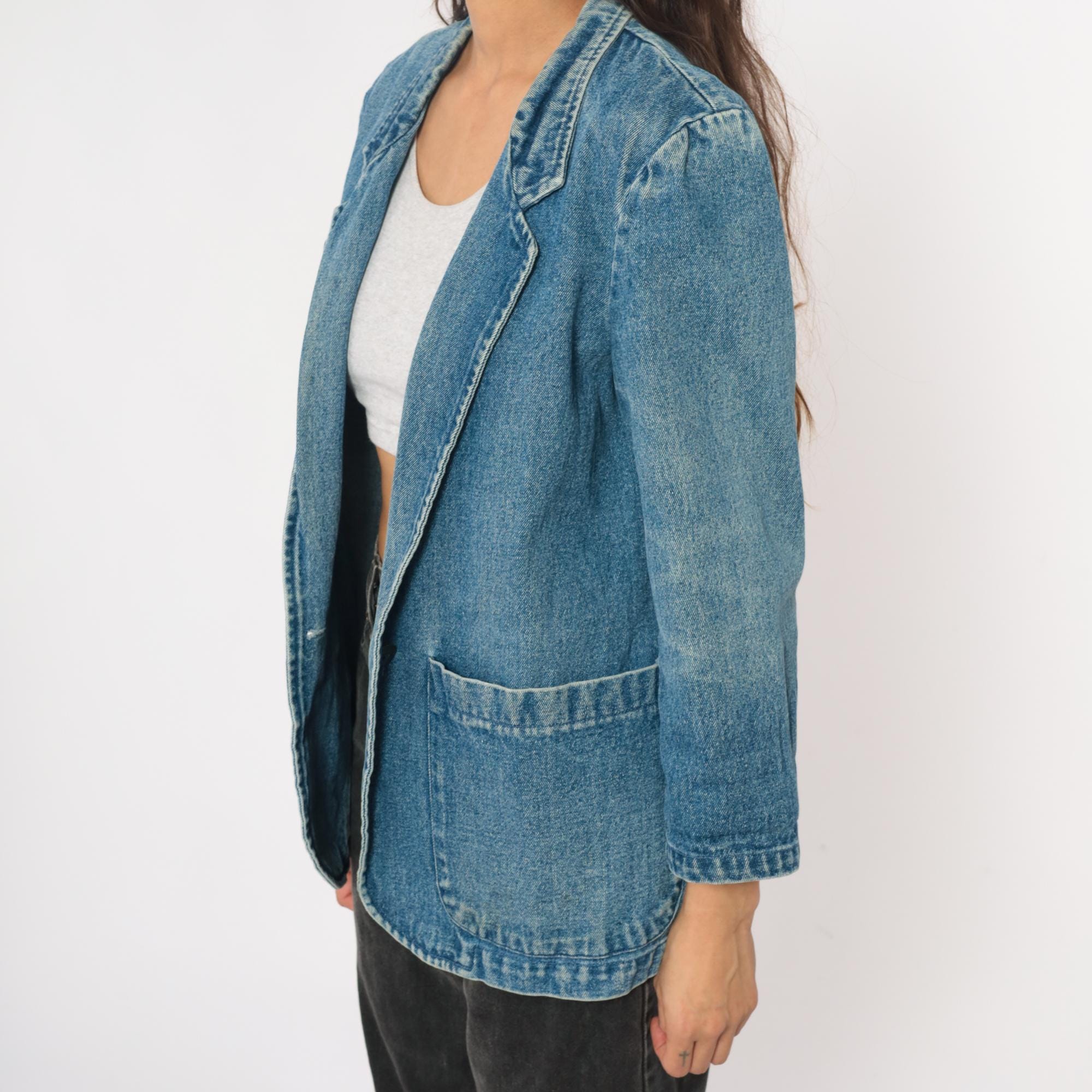 90s medium blue denim blazer from Eddie Bauer with notched collar and lapels, single button front closure, and two patch pockets at hips. Long sleeves with structured, tailored silhouette.