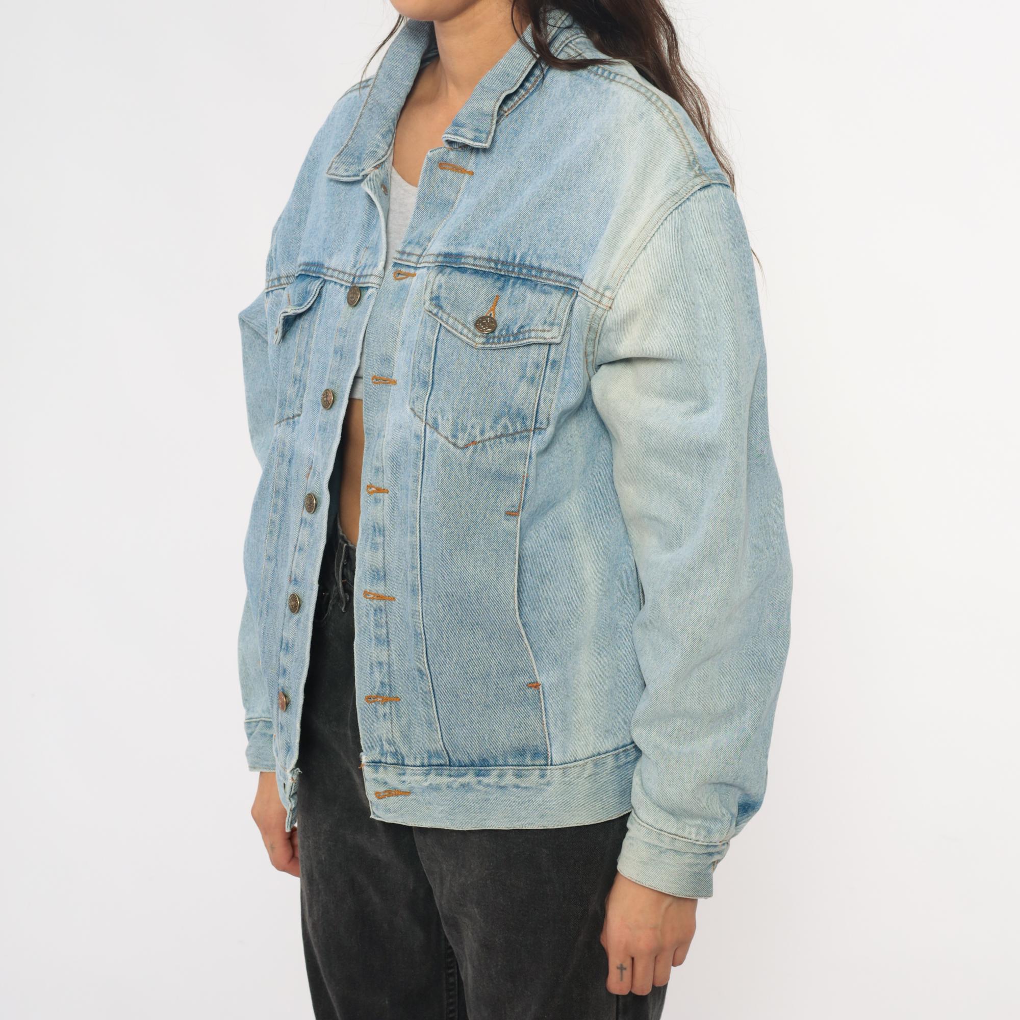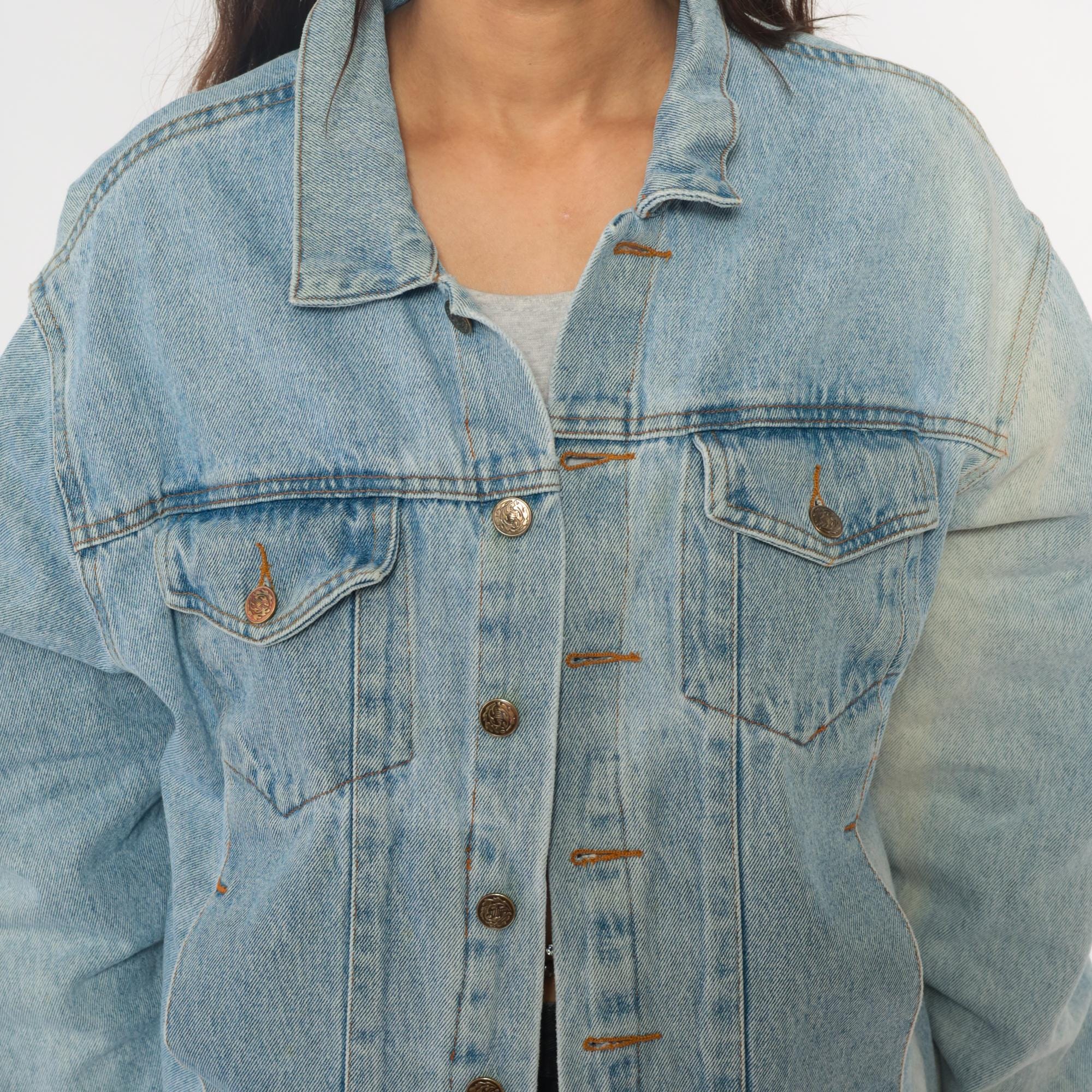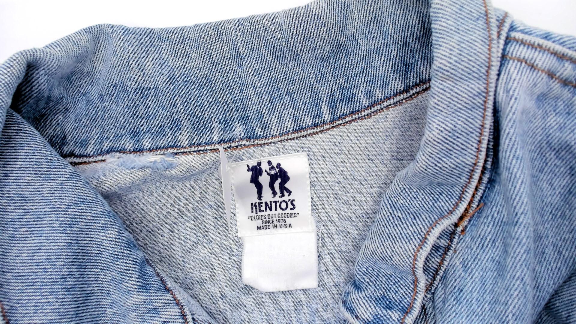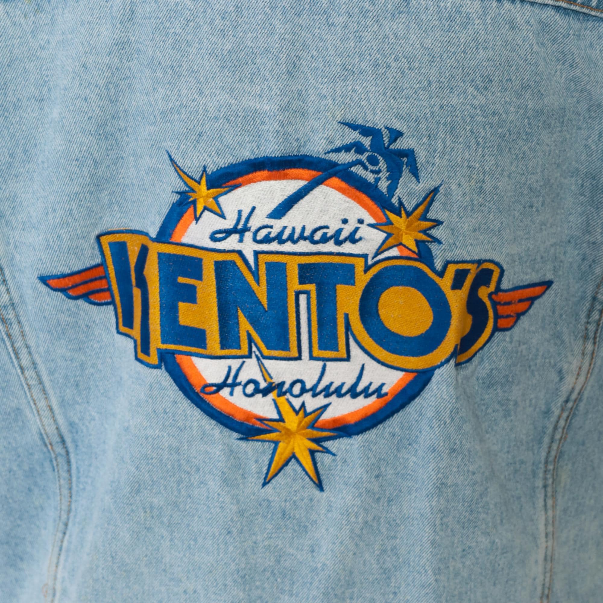 90s light wash denim jacket with large embroidered "Kento's Hawaii Honolulu" logo patch on back in blue, orange, and yellow with stars and wing details. Button front closure with two chest pockets, pointed collar, long sleeves.