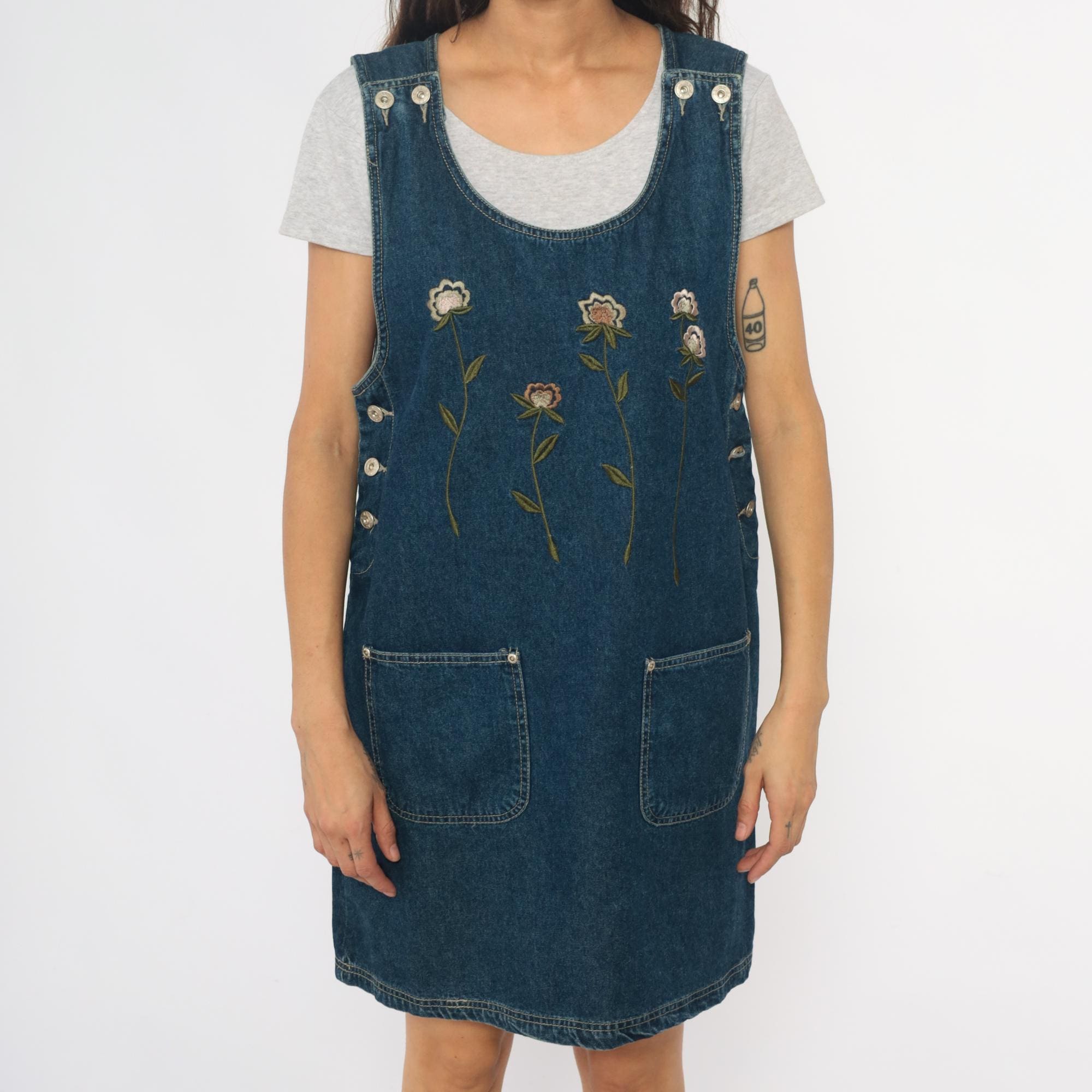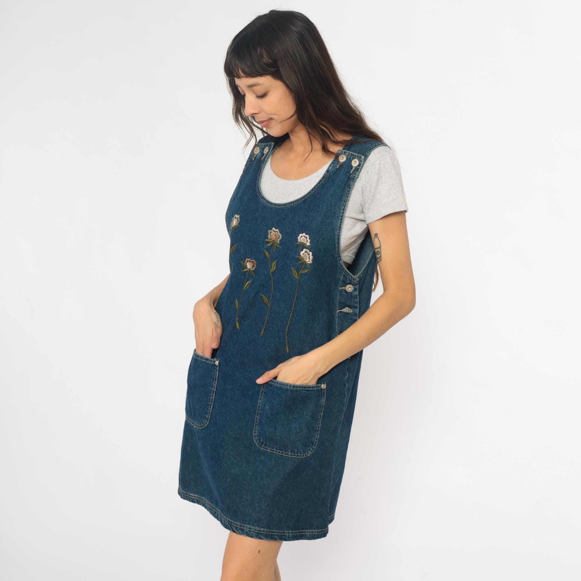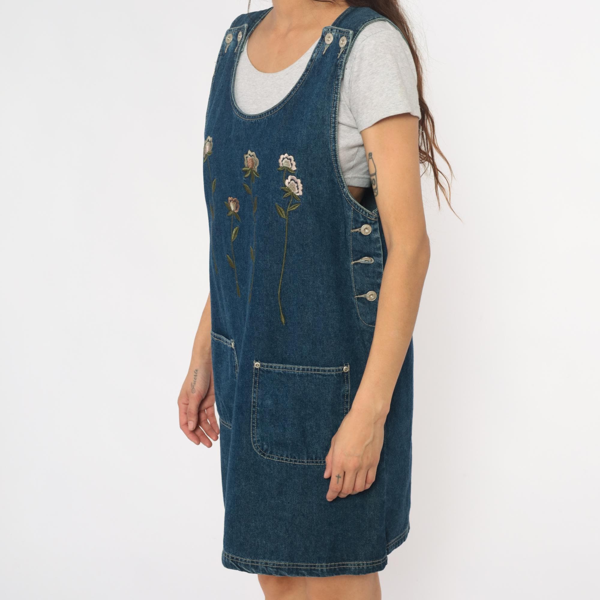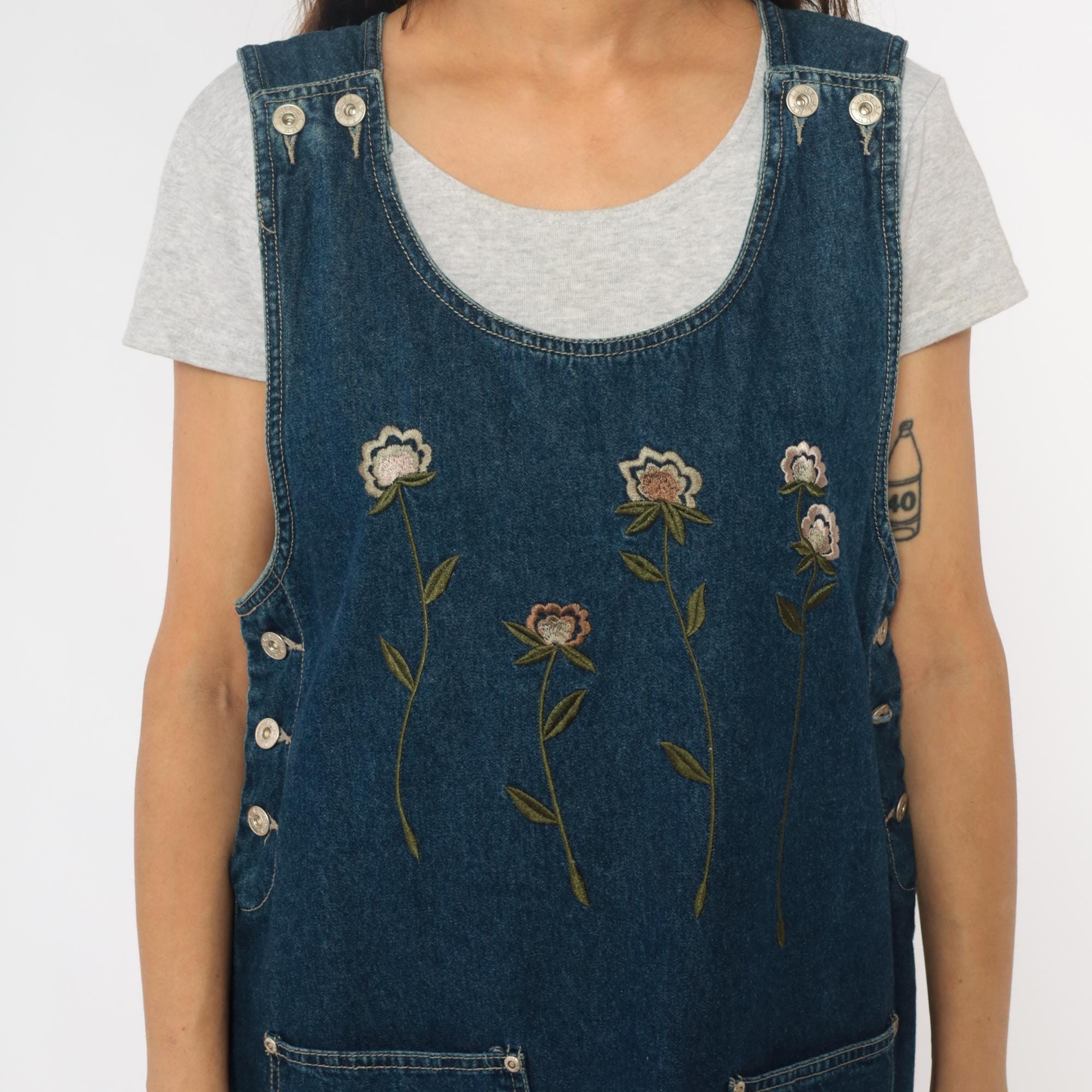 90s denim jumper dress from jlny sport with embroidered floral design across the front in cream, pink, coral, and green. Scoop neckline, button closure straps at shoulders, side button closures at waist.
