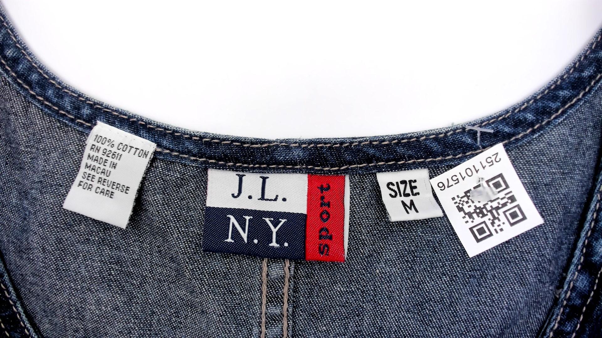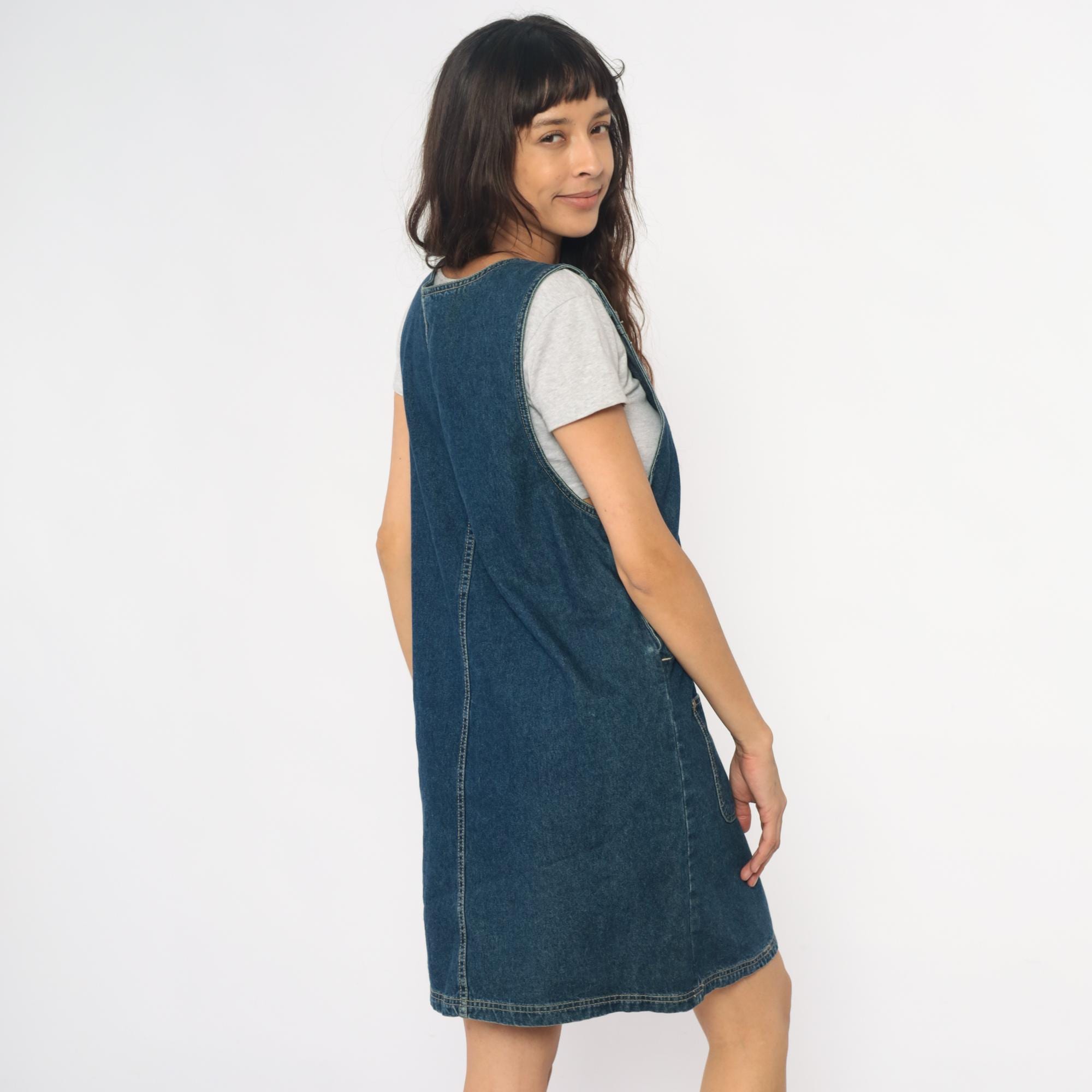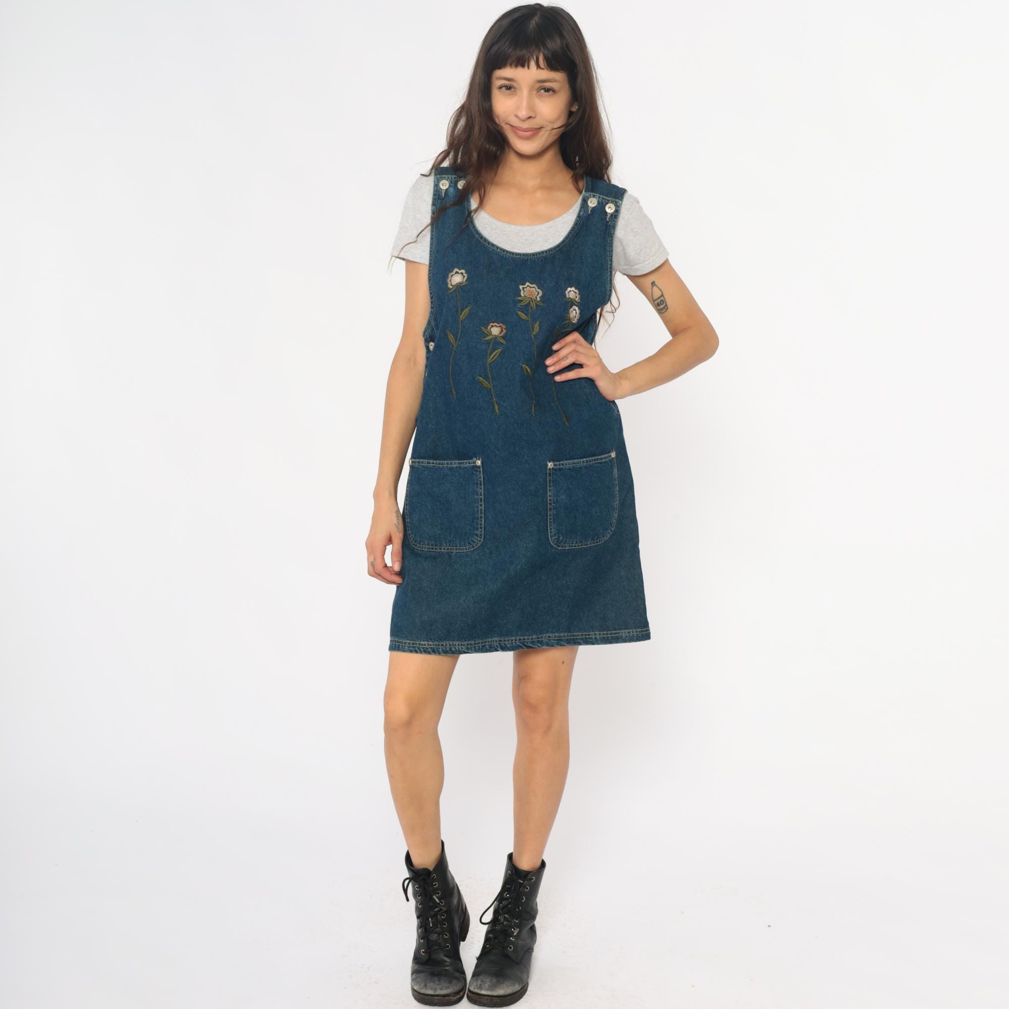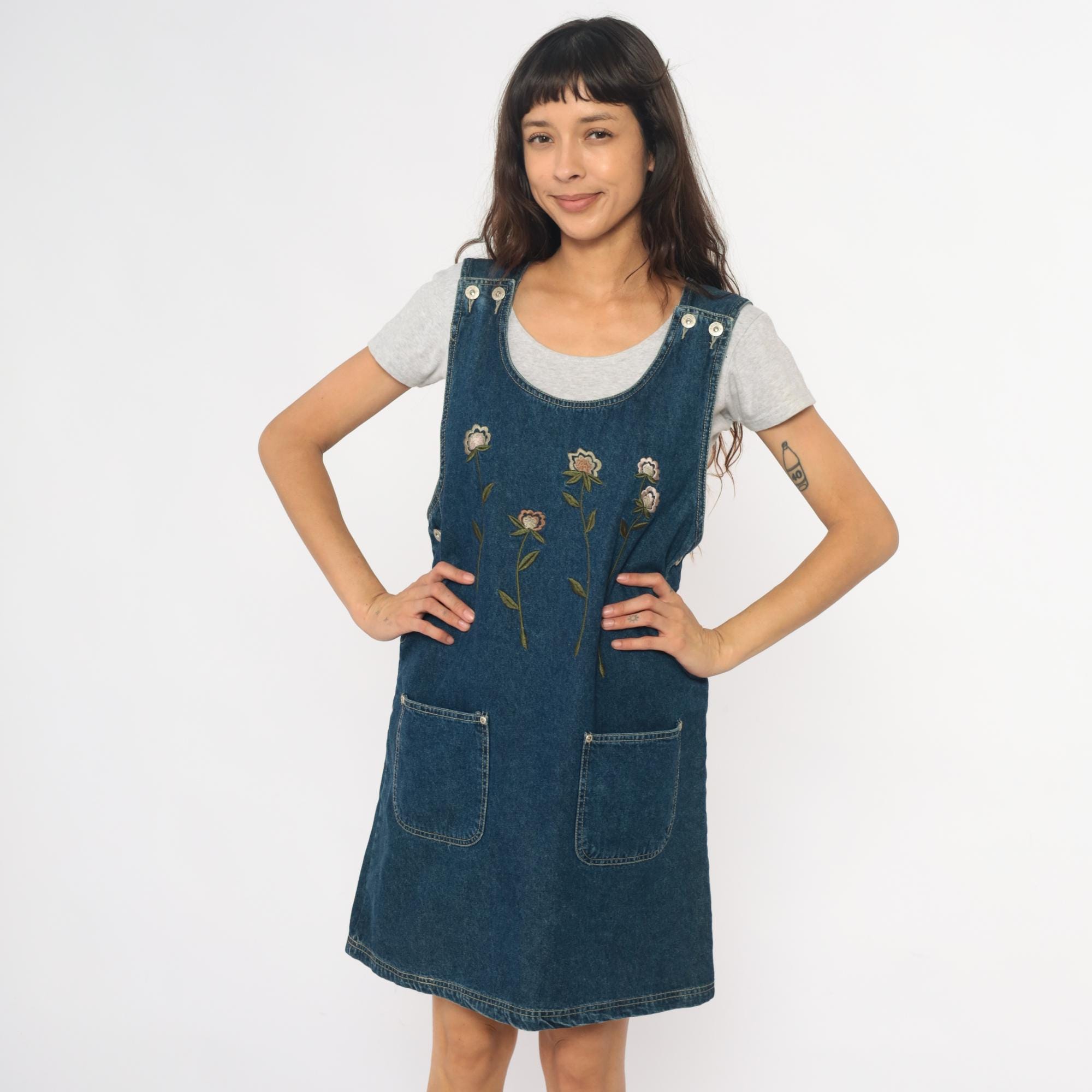 90s denim jumper dress from jlny sport with embroidered floral design across the front in cream, pink, coral, and green. Scoop neckline, button closure straps at shoulders, side button closures at waist.