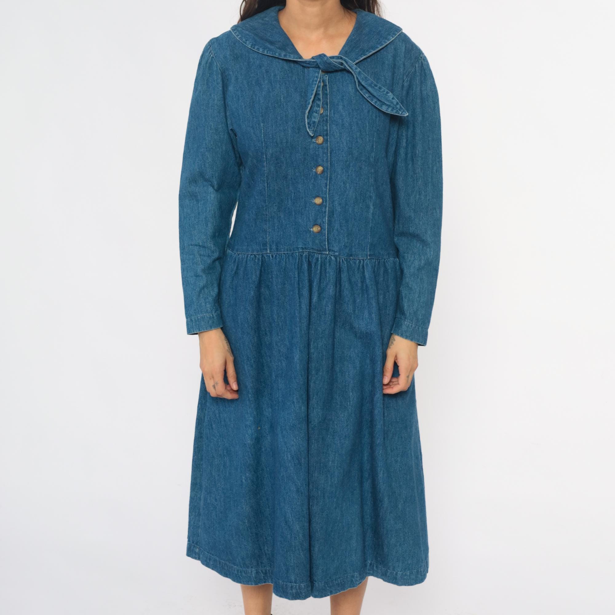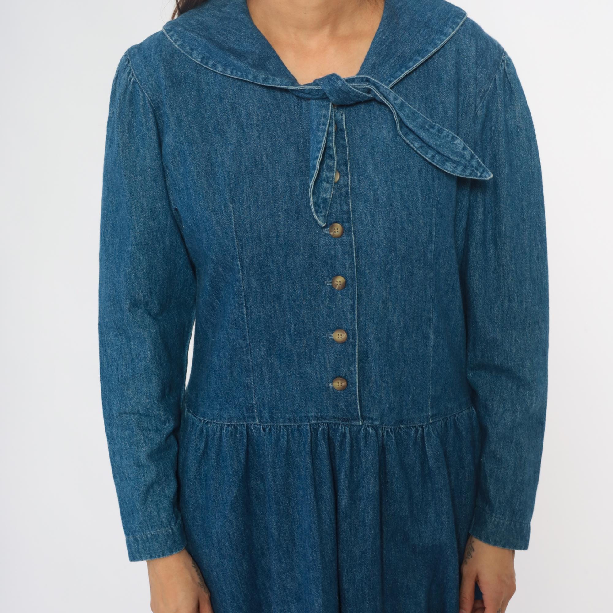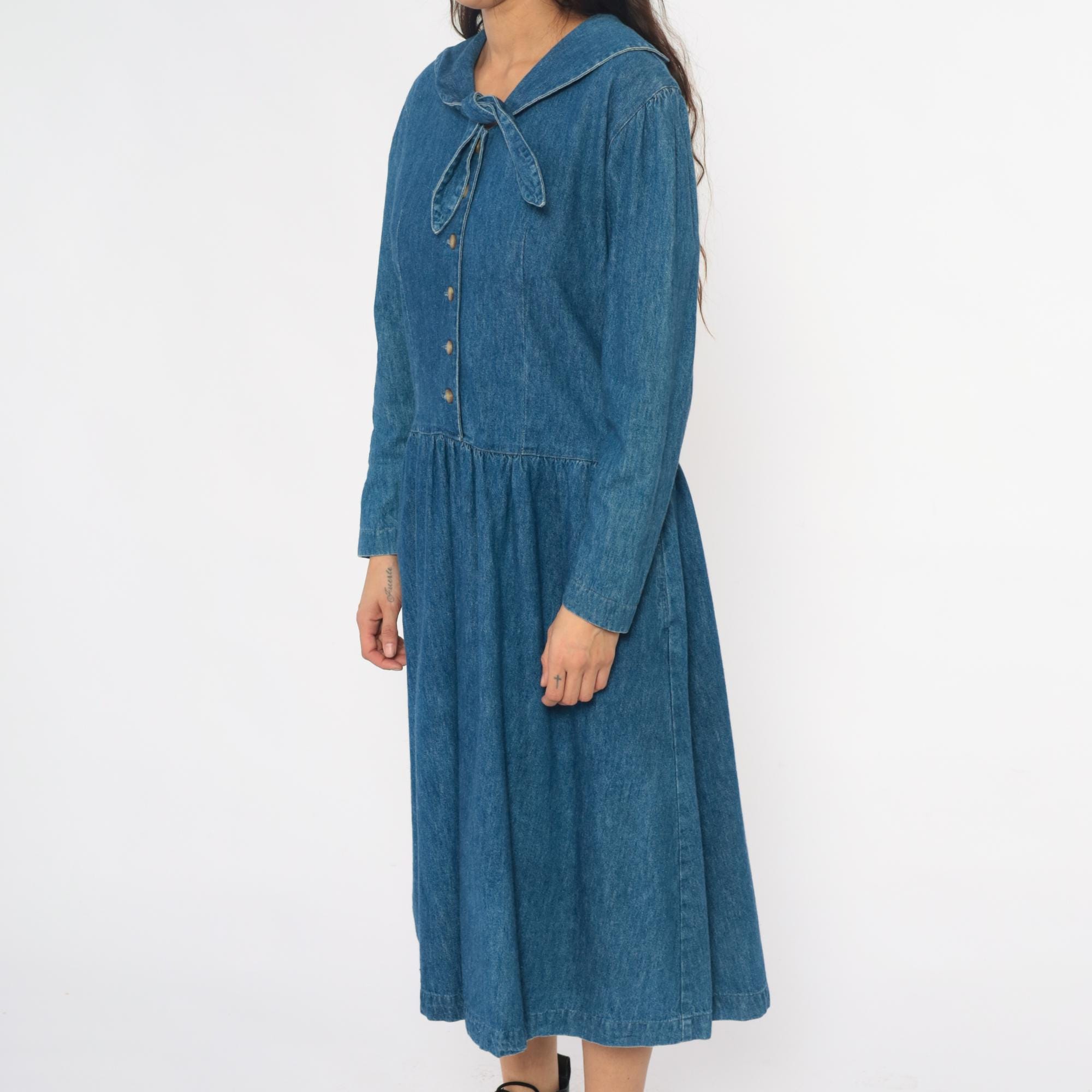 90s medium blue denim dress from all week long with large rounded Peter Pan collar and decorative bow tie detail at the neckline. Button front closure down the bodice, long sleeves, drop waist with gathered skirt.