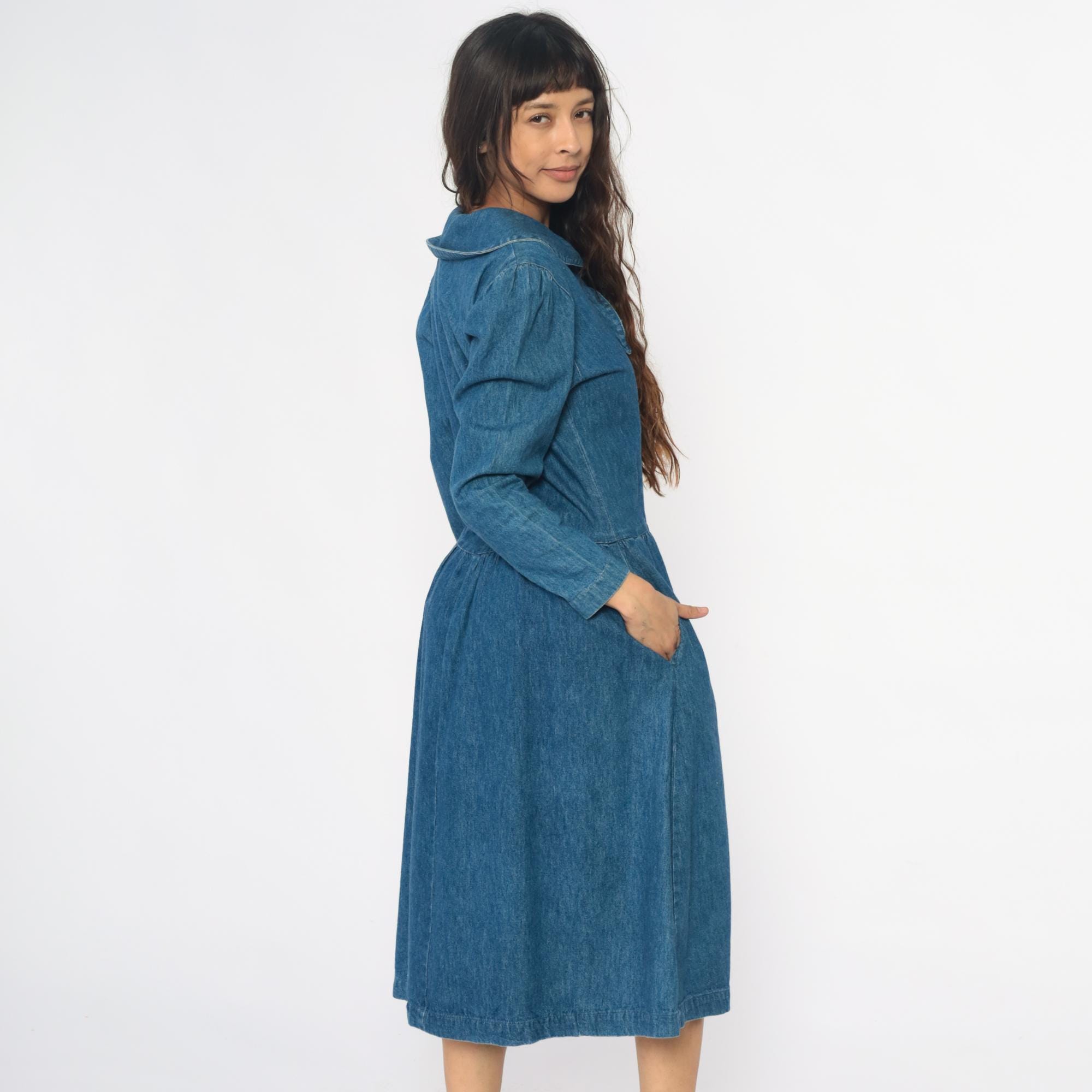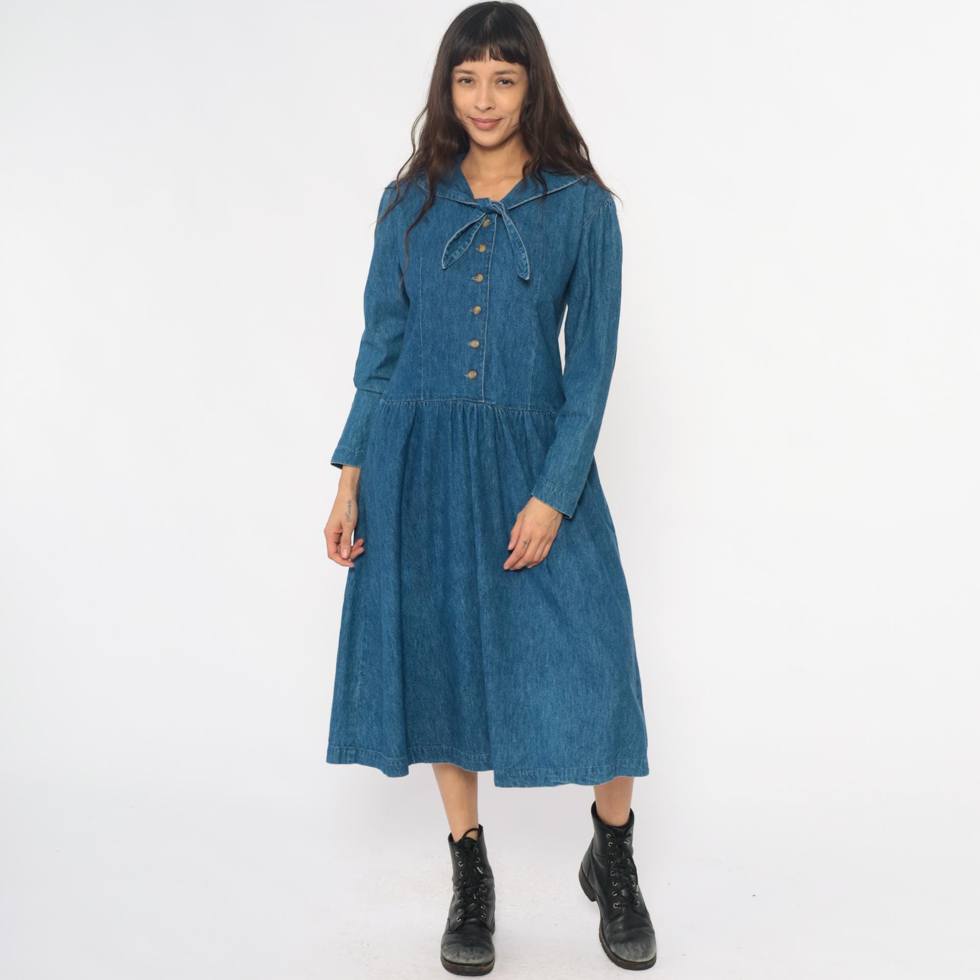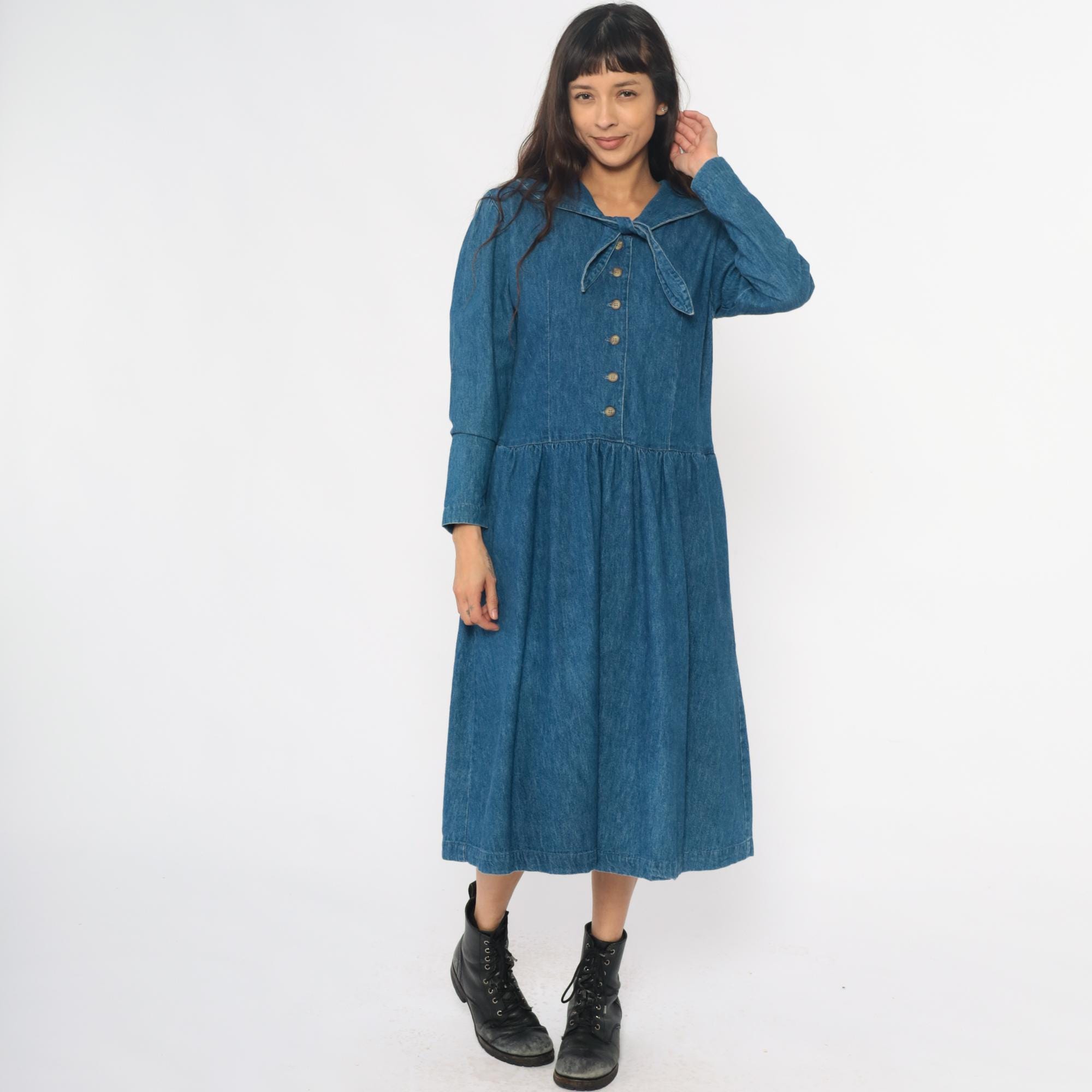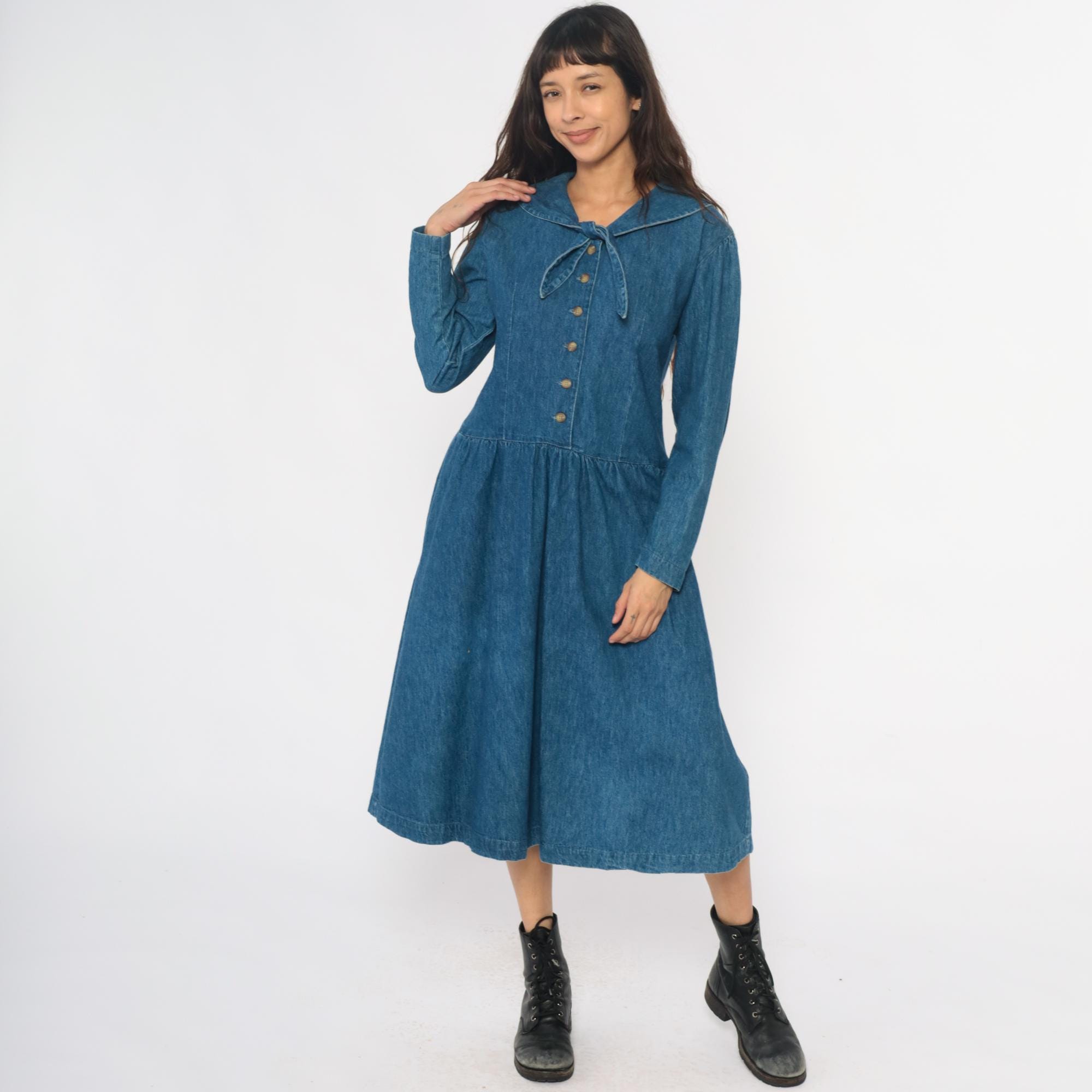 90s medium blue denim dress from all week long with large rounded Peter Pan collar and decorative bow tie detail at the neckline. Button front closure down the bodice, long sleeves, drop waist with gathered skirt.