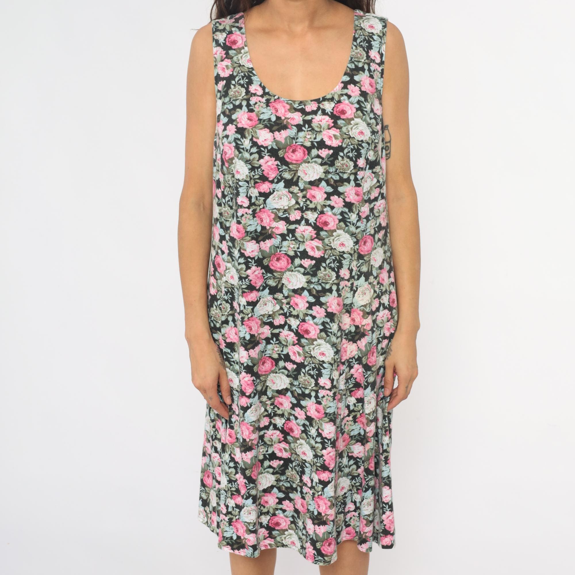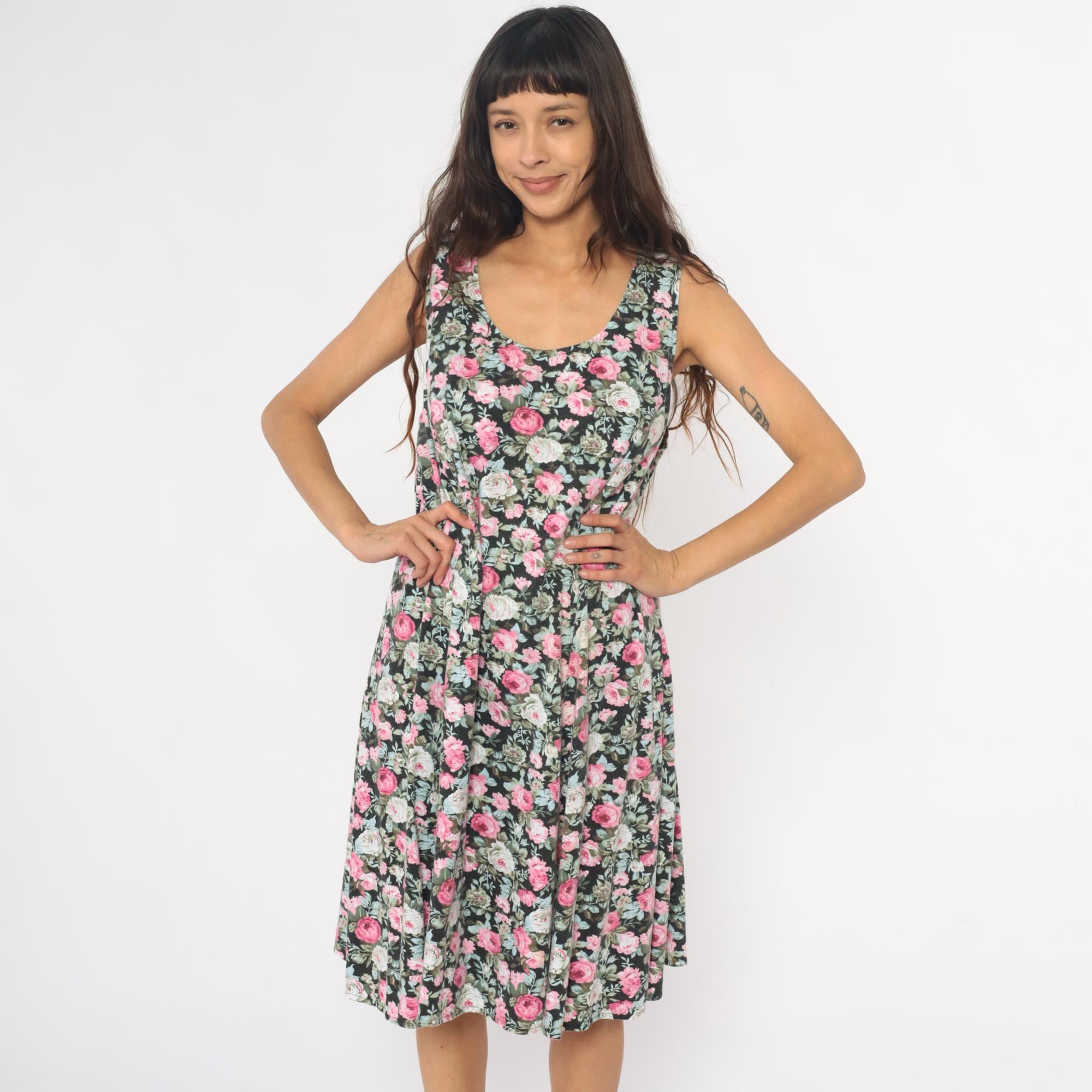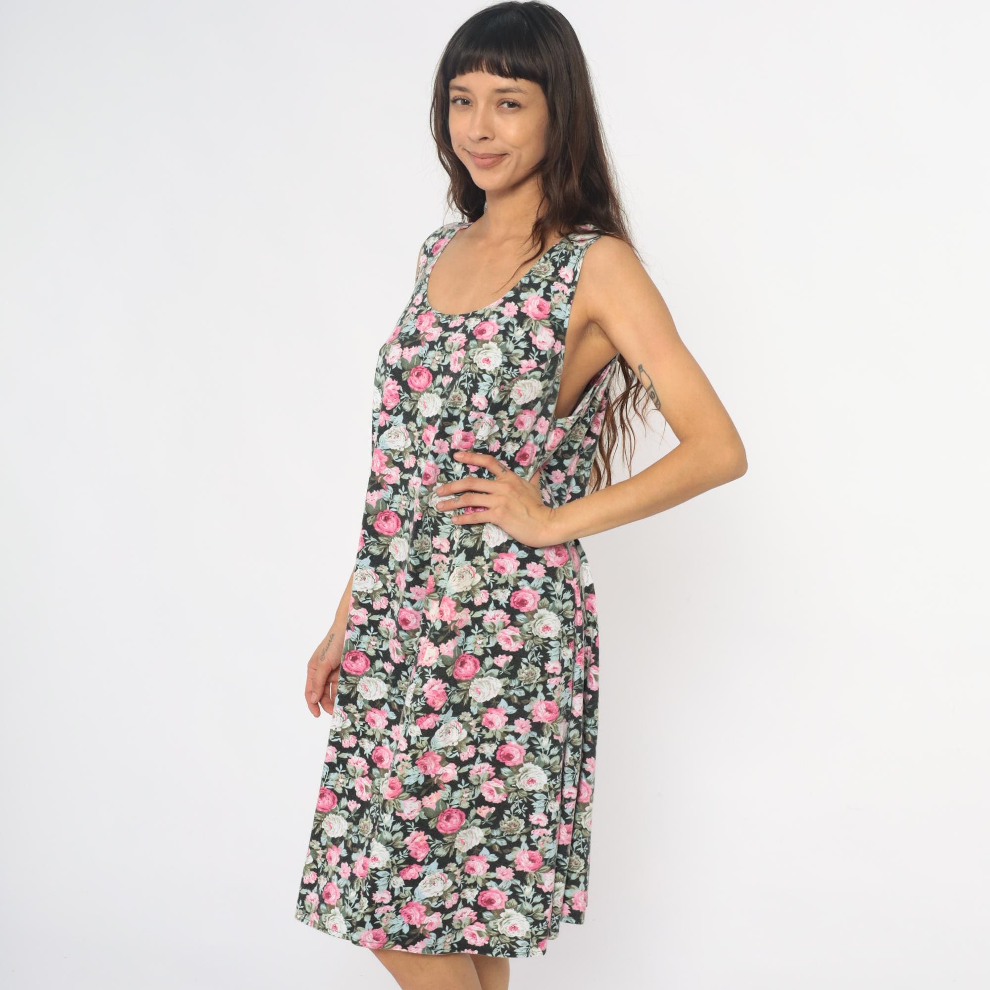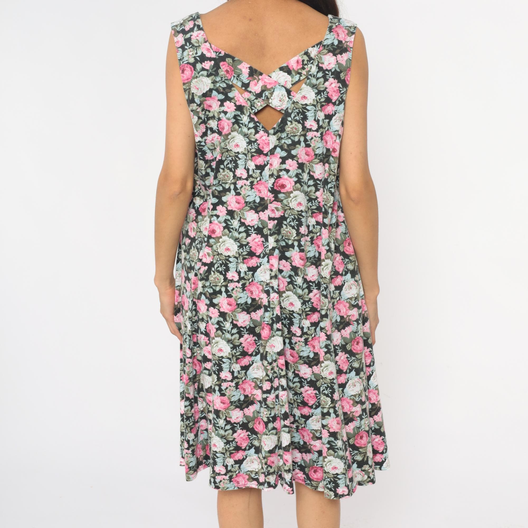 90s black floral dress from lady dorby with pink, white, and mint green roses across the fabric. Sleeveless with scoop neckline, fitted bodice, cutout detail at upper back with twisted fabric accent.