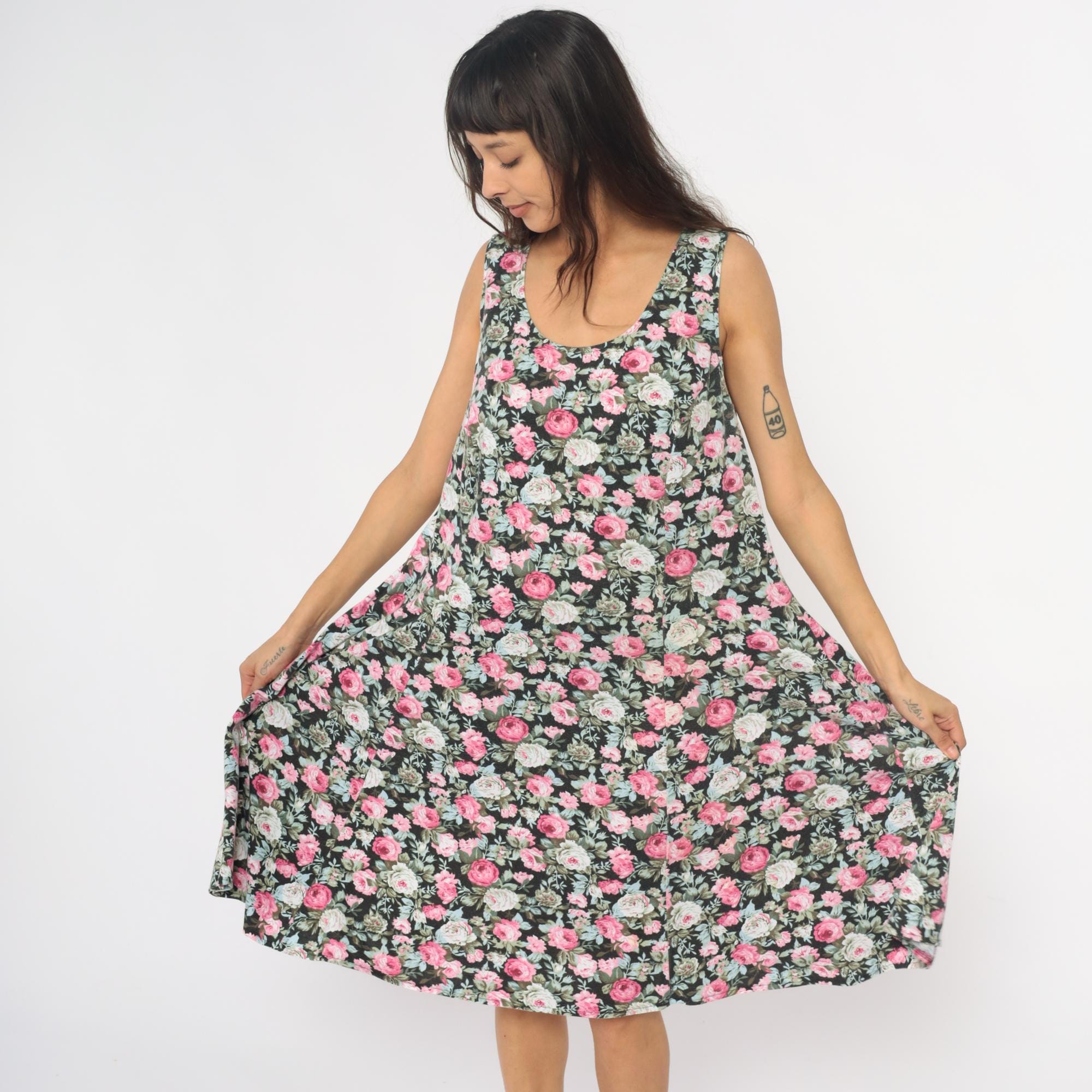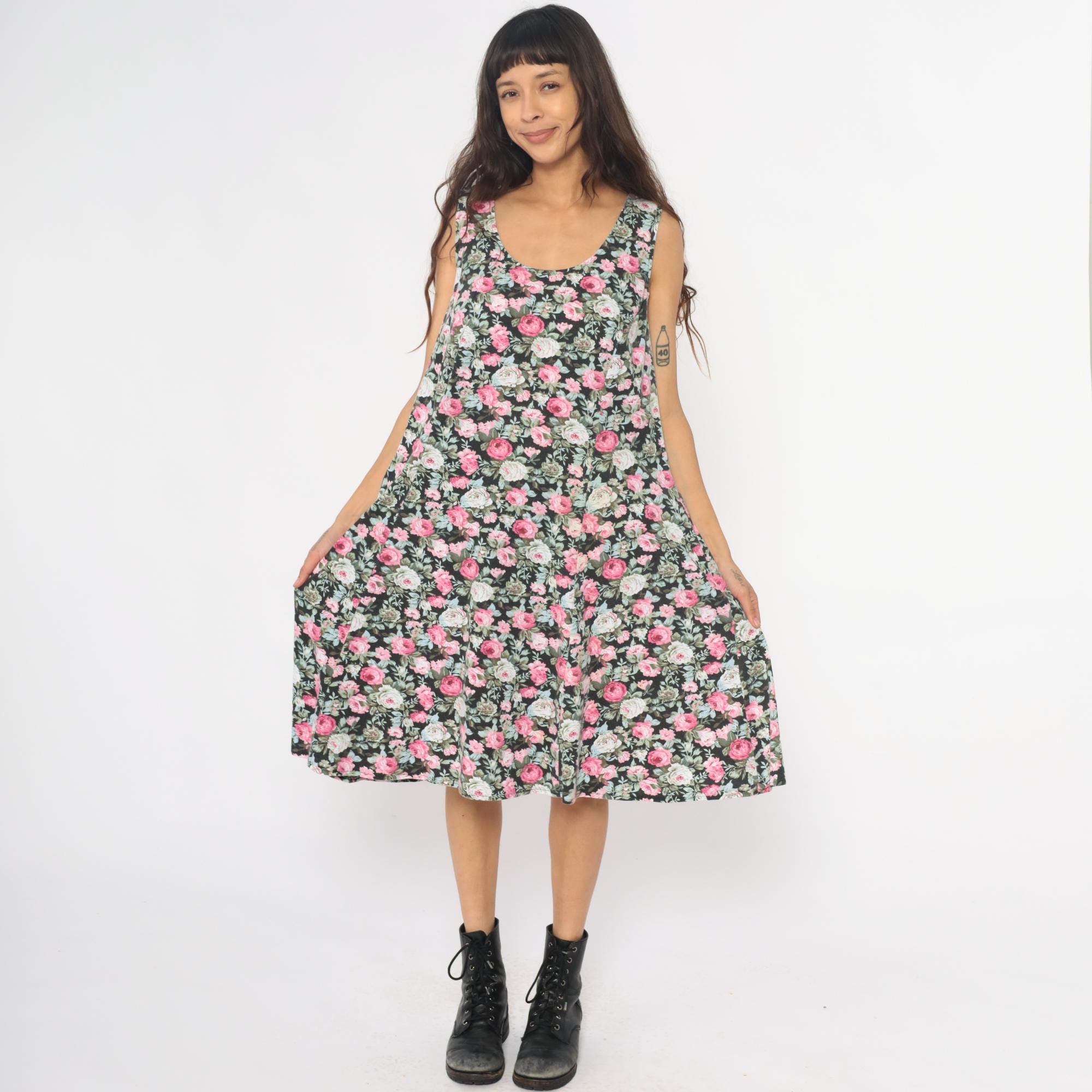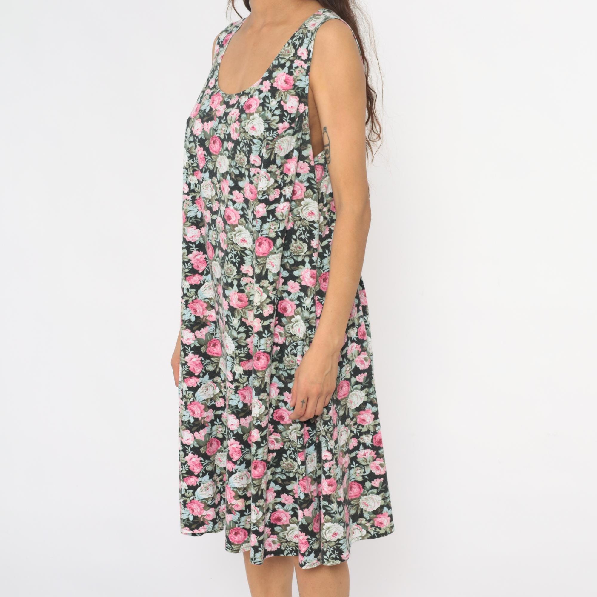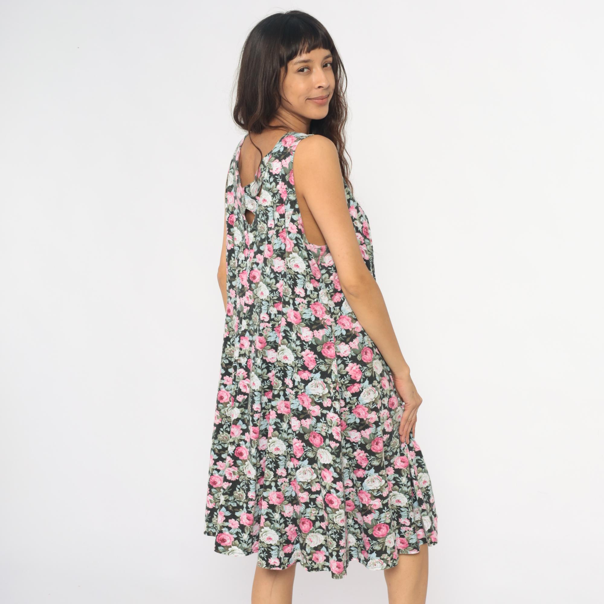 90s black floral dress from lady dorby with pink, white, and mint green roses across the fabric. Sleeveless with scoop neckline, fitted bodice, cutout detail at upper back with twisted fabric accent.