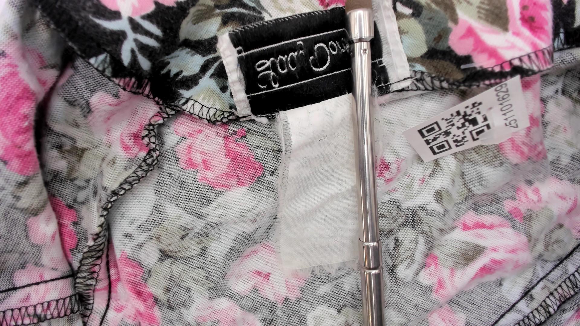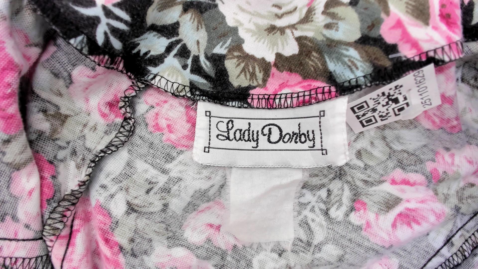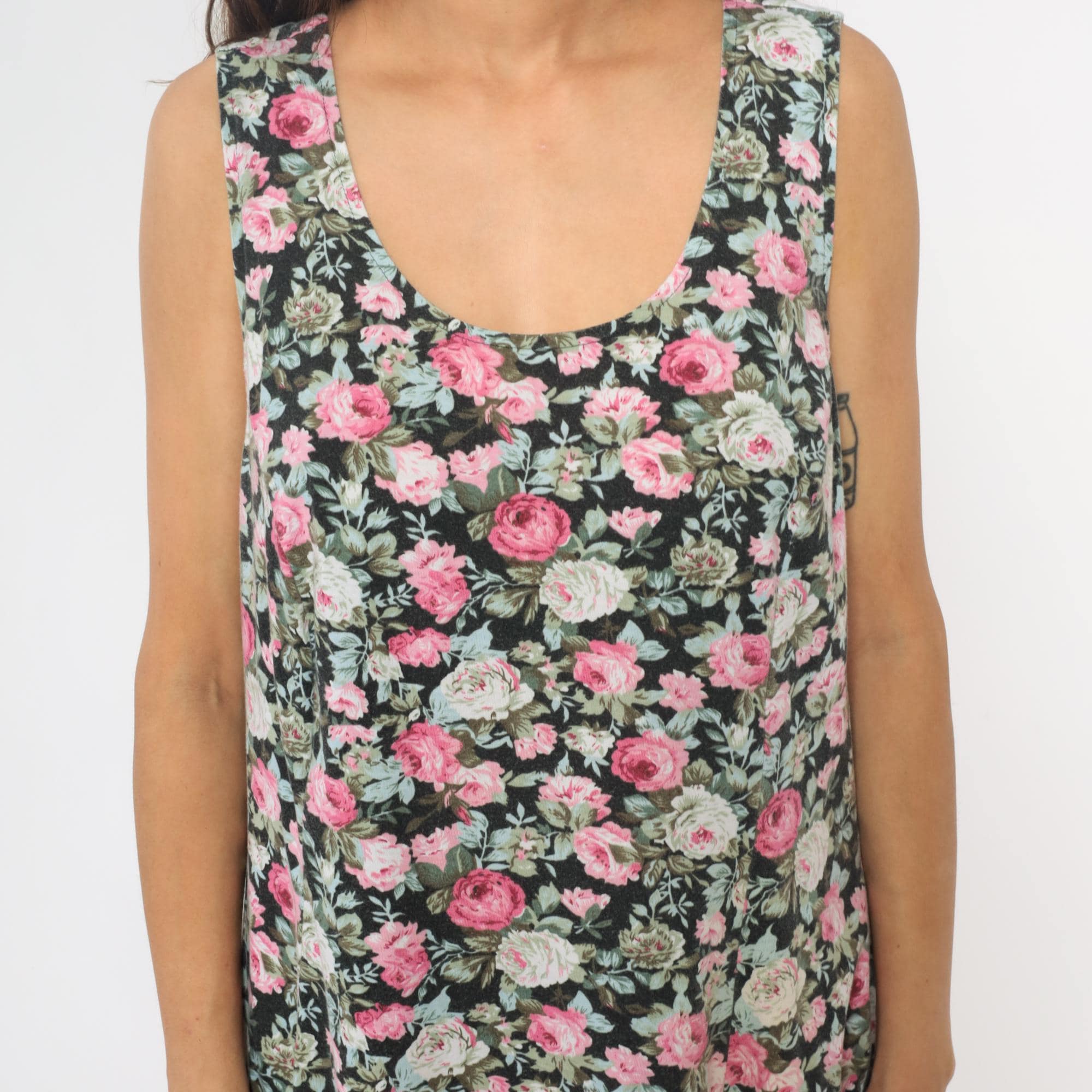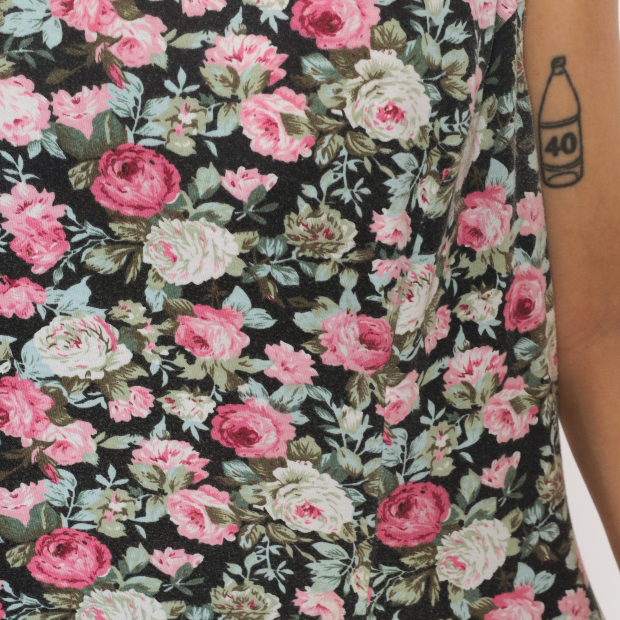 90s black floral dress from lady dorby with pink, white, and mint green roses across the fabric. Sleeveless with scoop neckline, fitted bodice, cutout detail at upper back with twisted fabric accent.