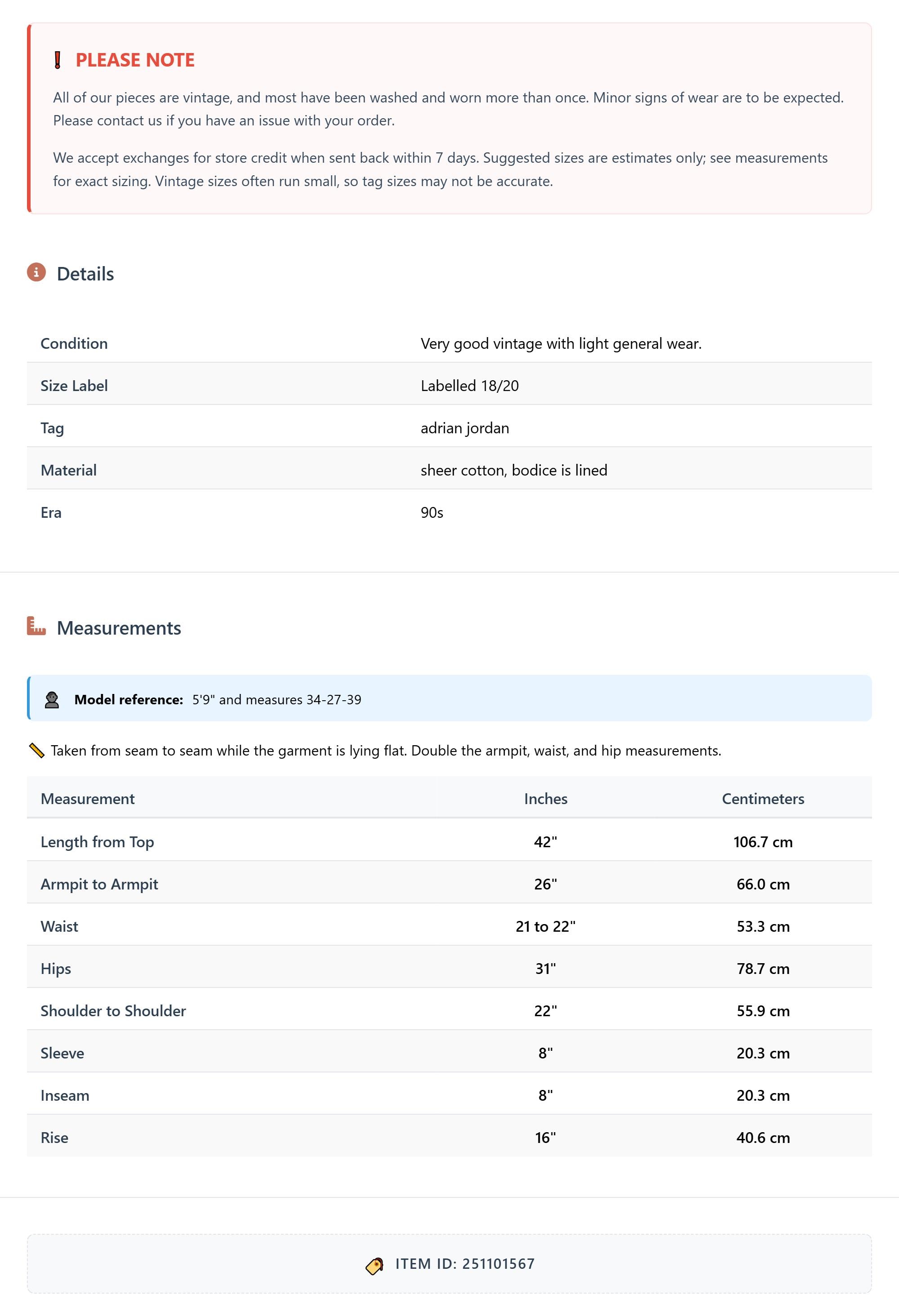 All of our pieces are vintage, and most have been washed and worn more than once. Minor signs of wear are to be expected. Please contact us if you have an issue with your order. We accept exchanges for store credit when sent back within 7 days.