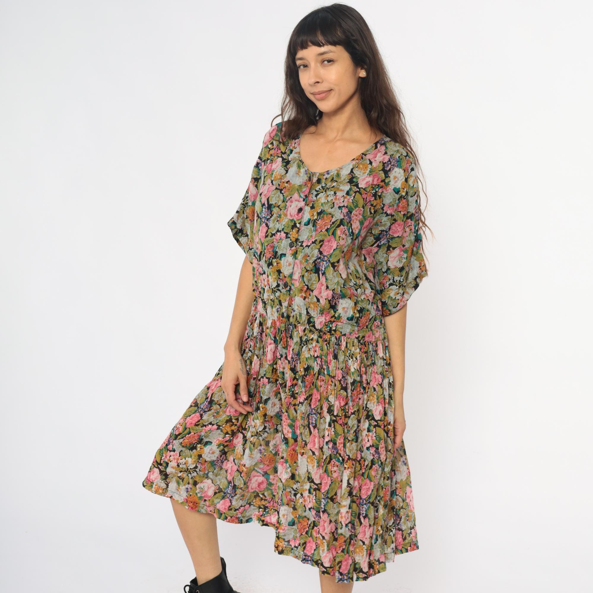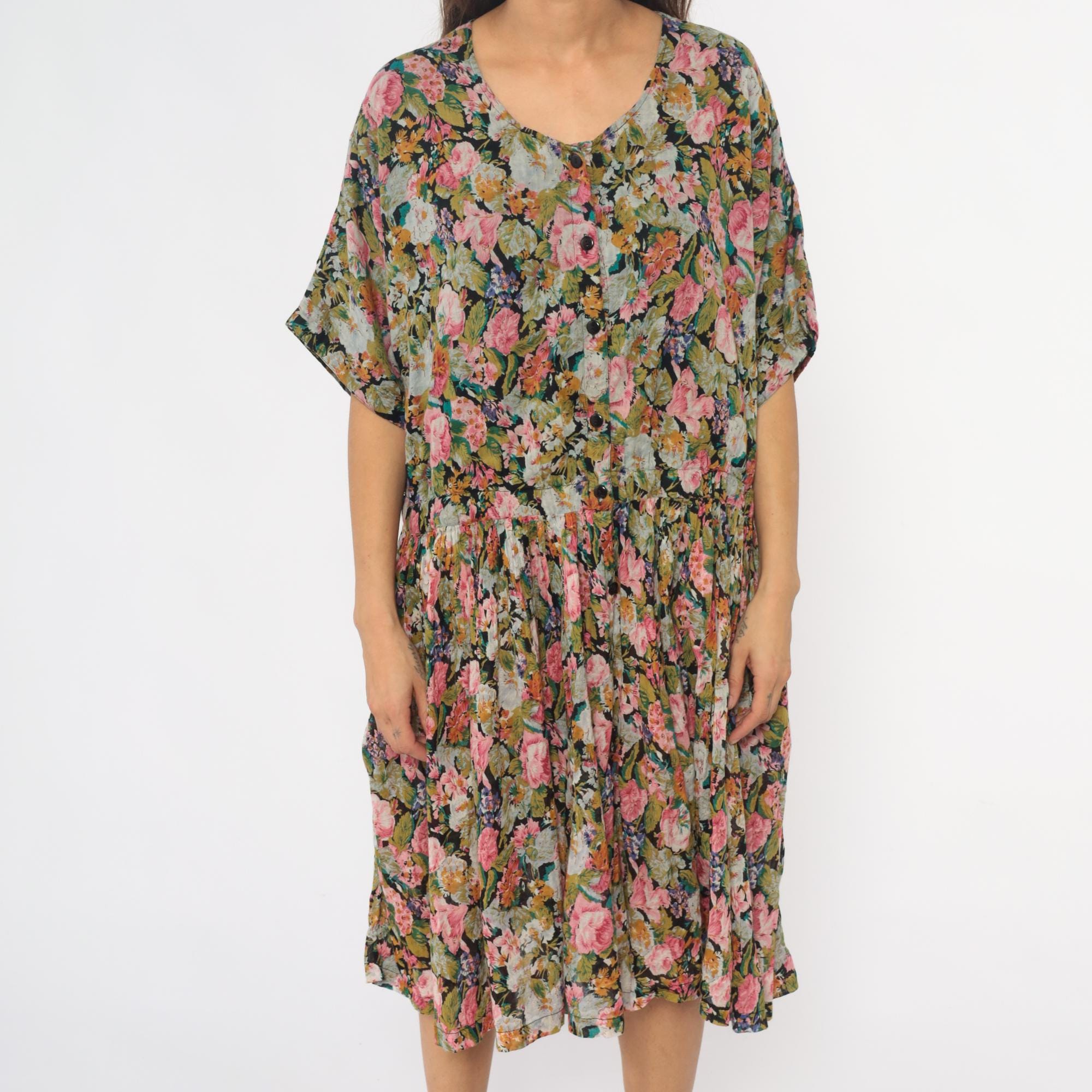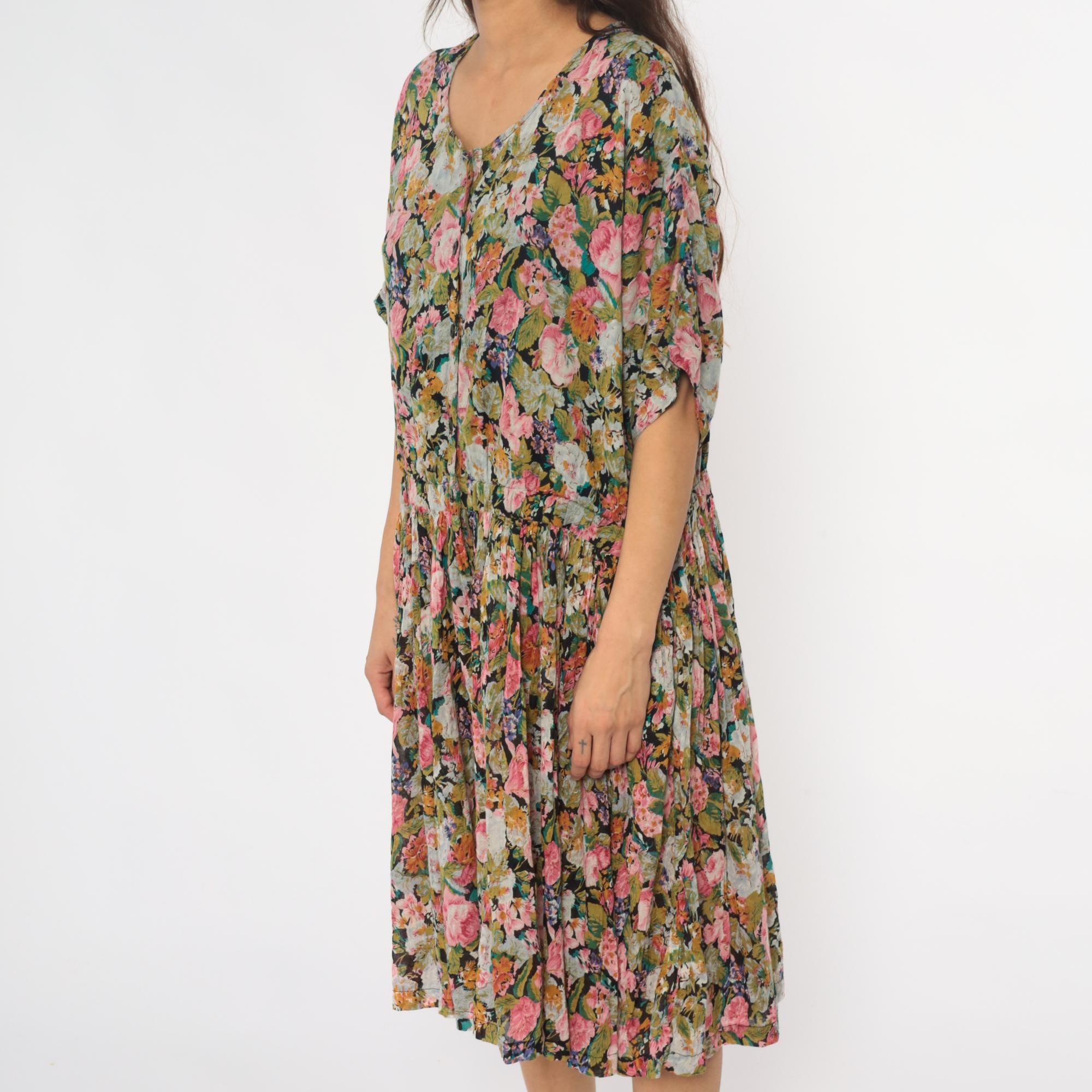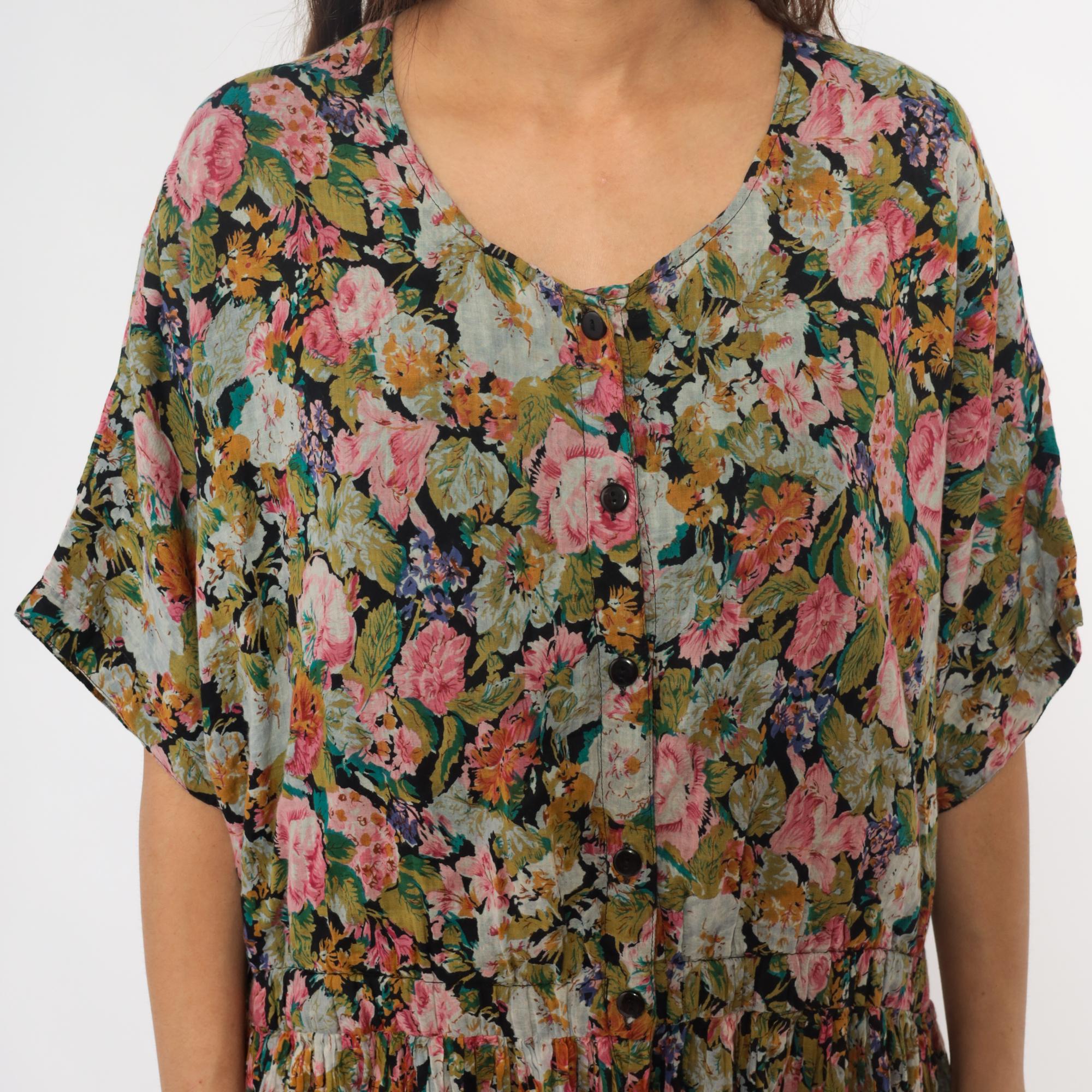 90s floral wide leg palazzo romper from adrian jordan with pink, coral, orange, green, and blue flowers on black background. V-neck with button front closure, short dolman sleeves, elastic gathered waist.