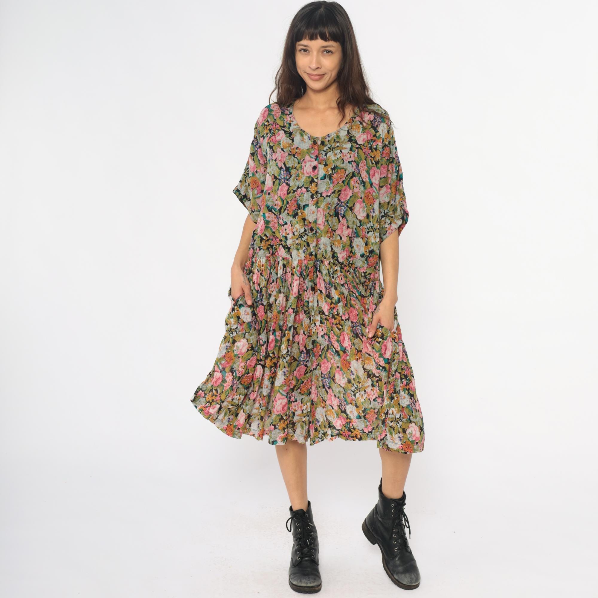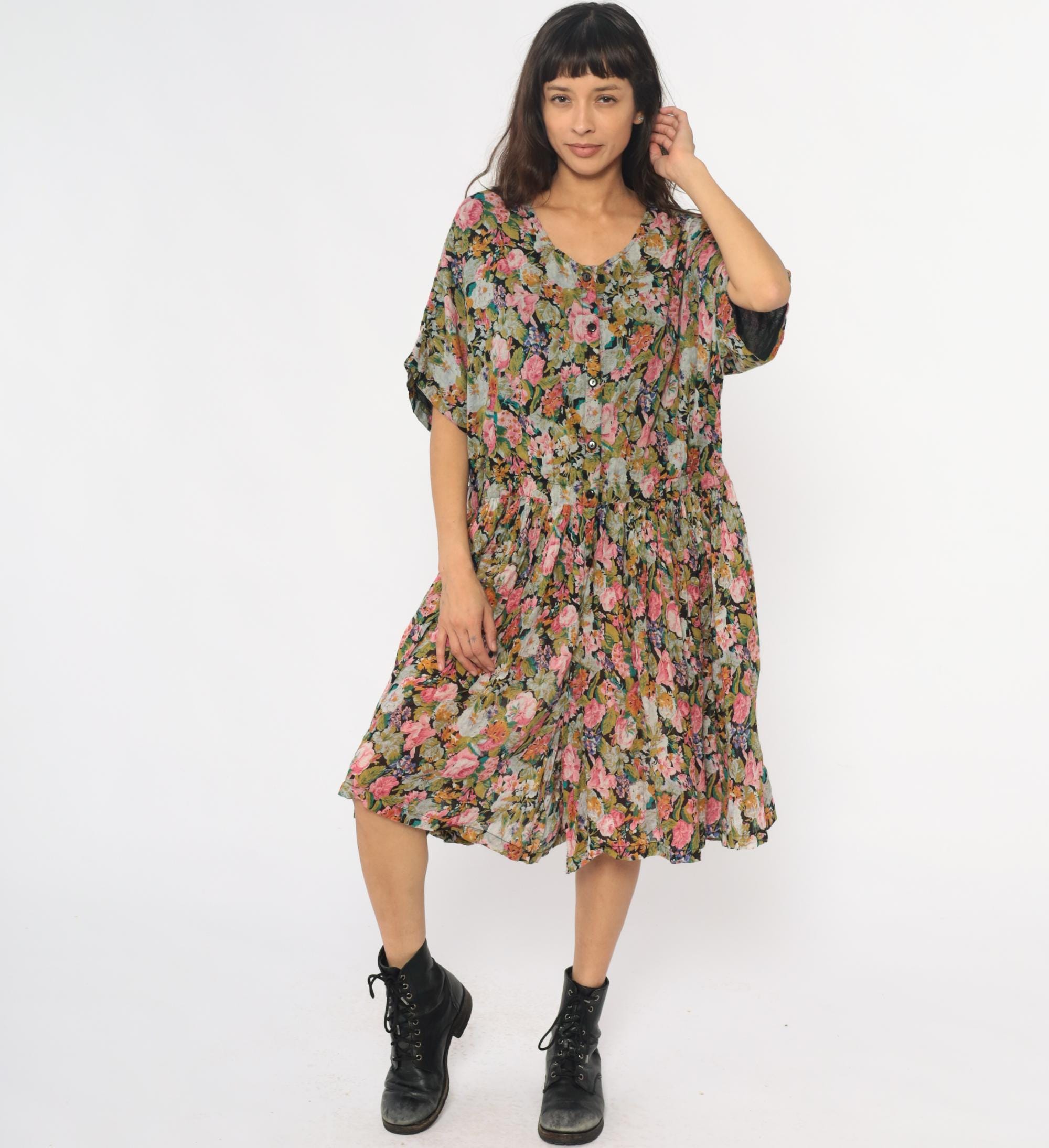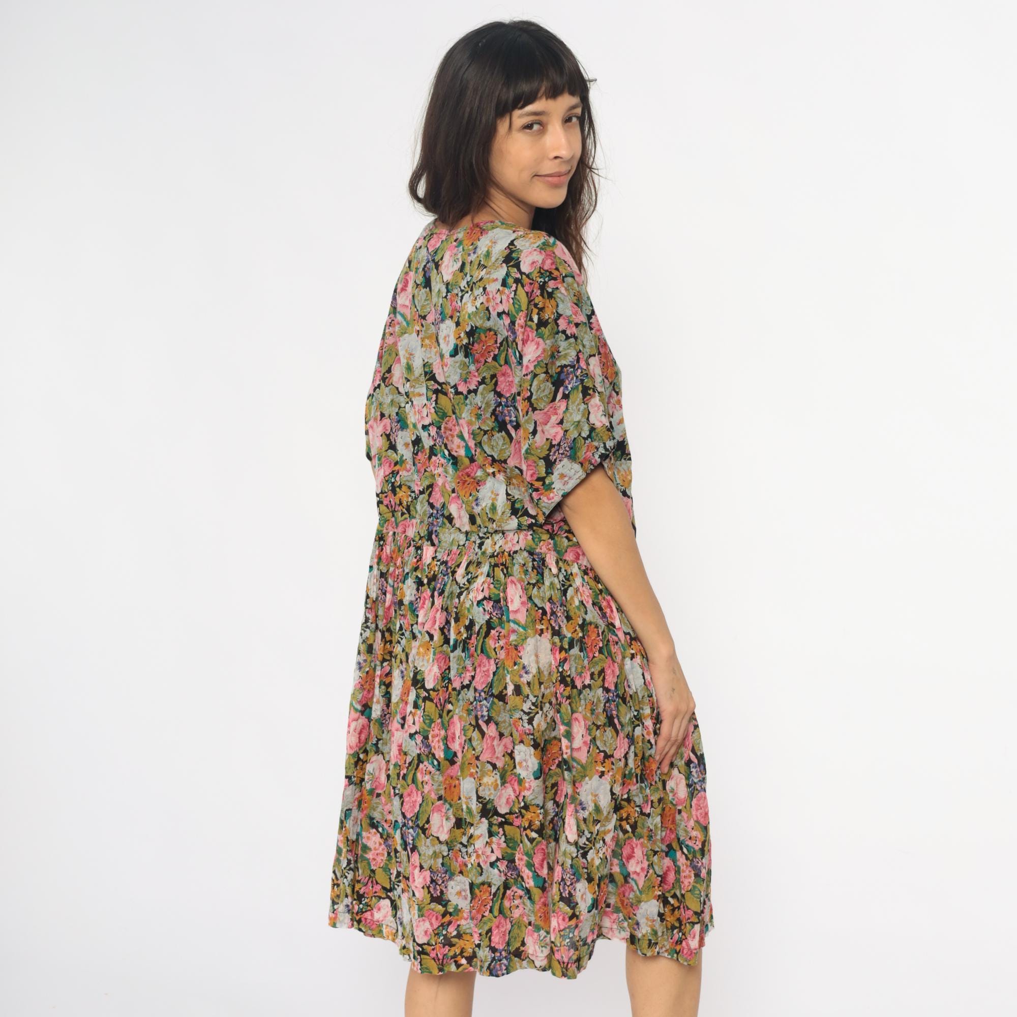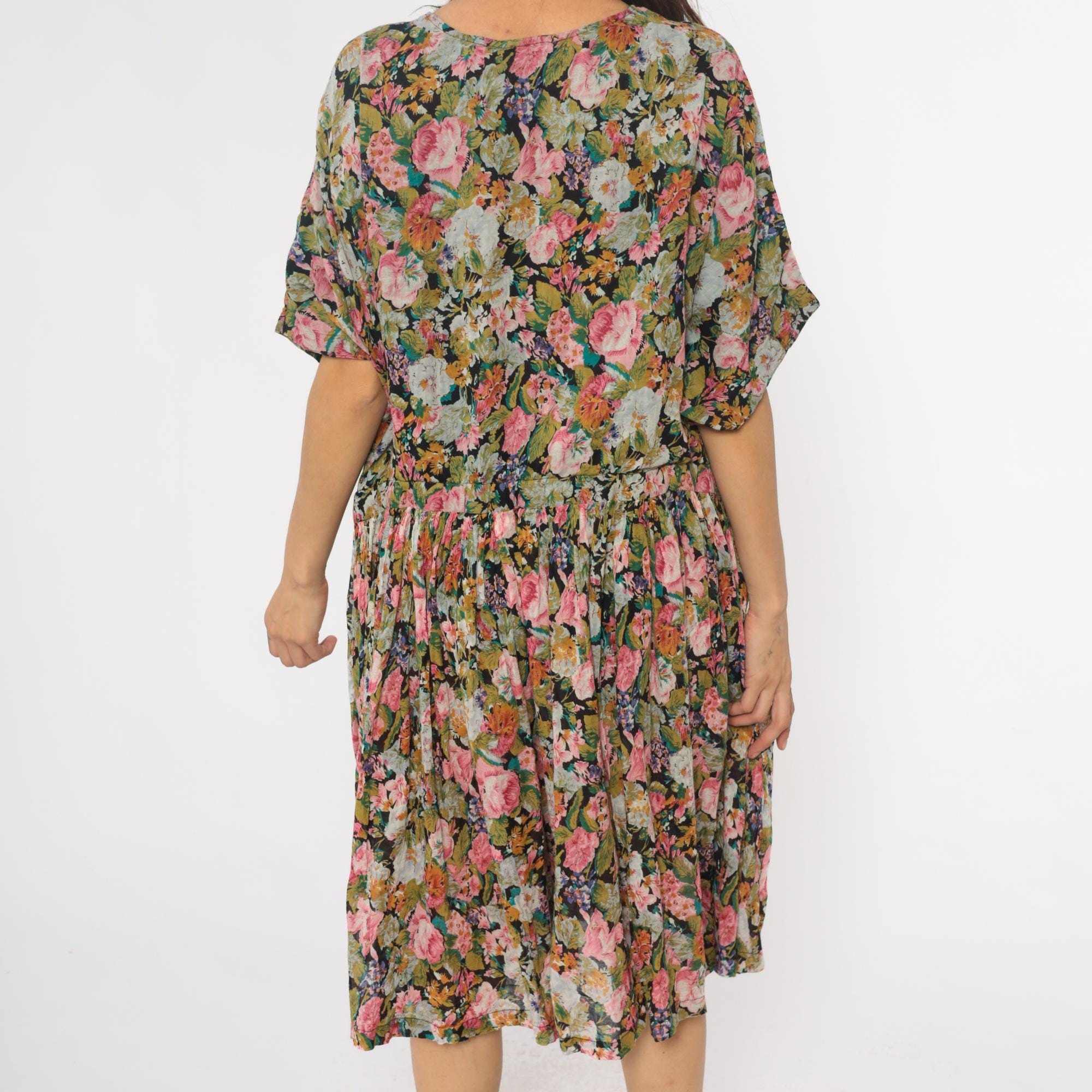 90s floral wide leg palazzo romper from adrian jordan with pink, coral, orange, green, and blue flowers on black background. V-neck with button front closure, short dolman sleeves, elastic gathered waist.