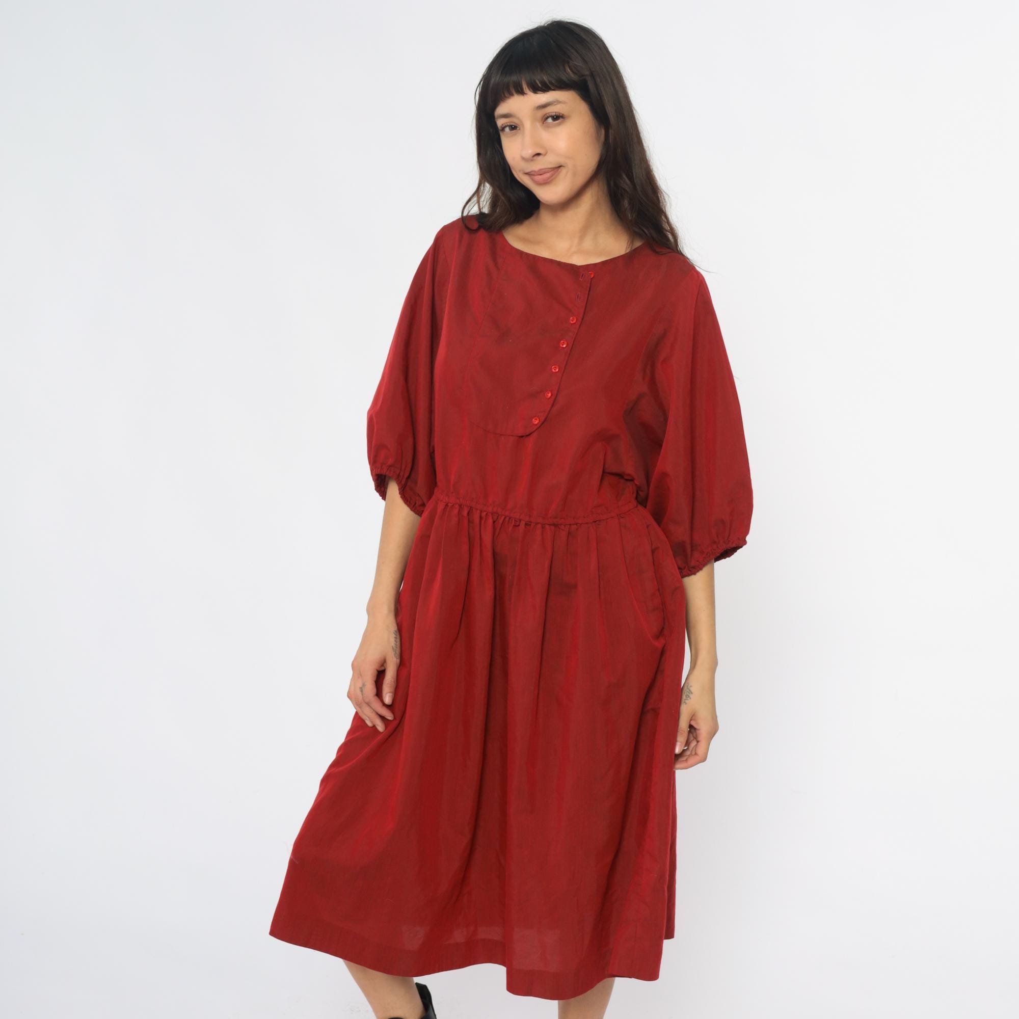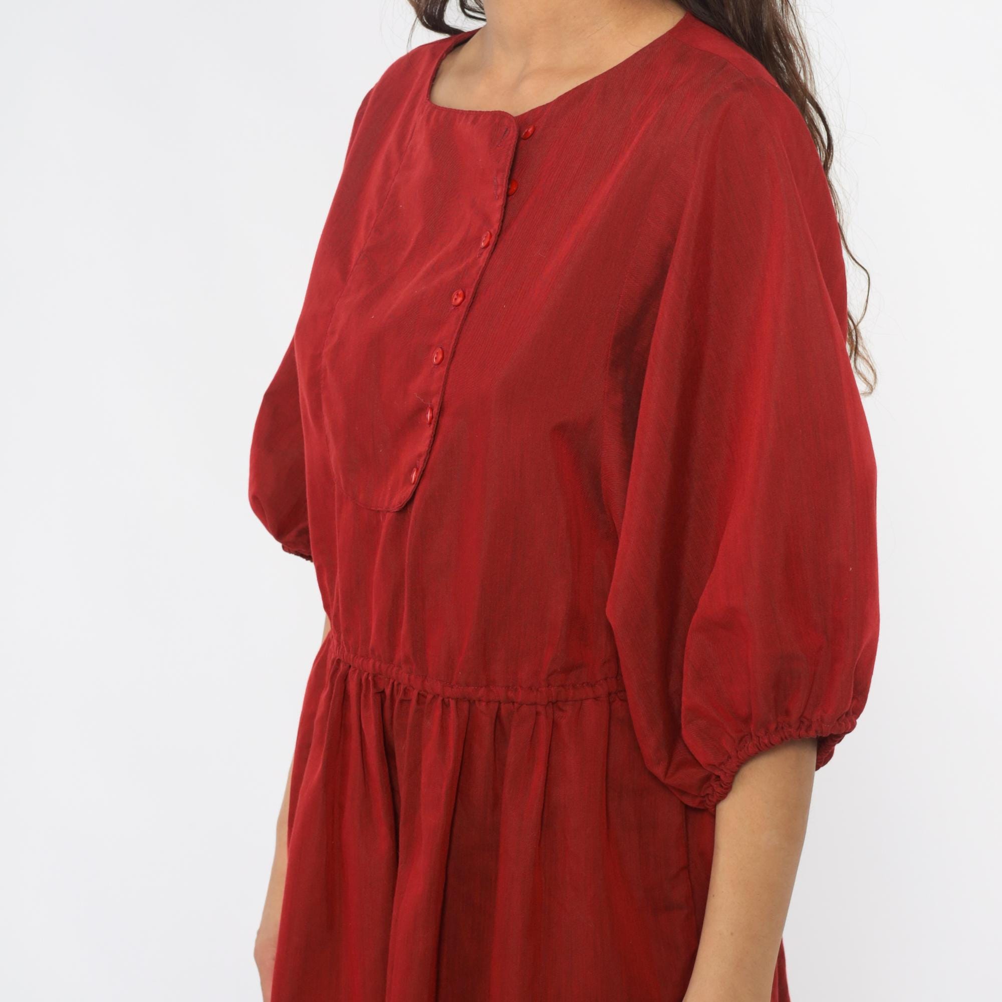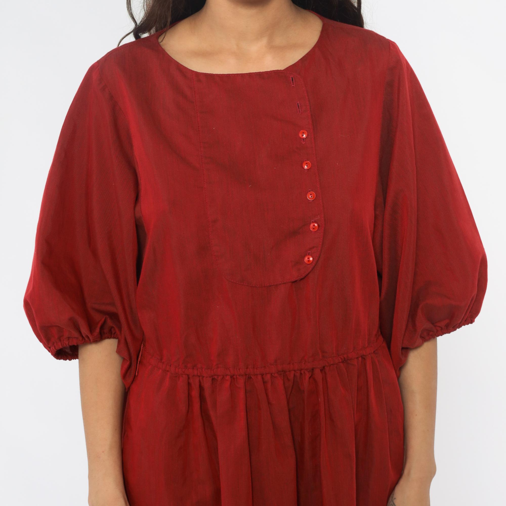 80s burgundy dress with asymmetric button front closure at the chest and rounded neckline. Puff sleeves with gathered cuffs, fitted bodice with gathered waist seam releasing to an A-line skirt.