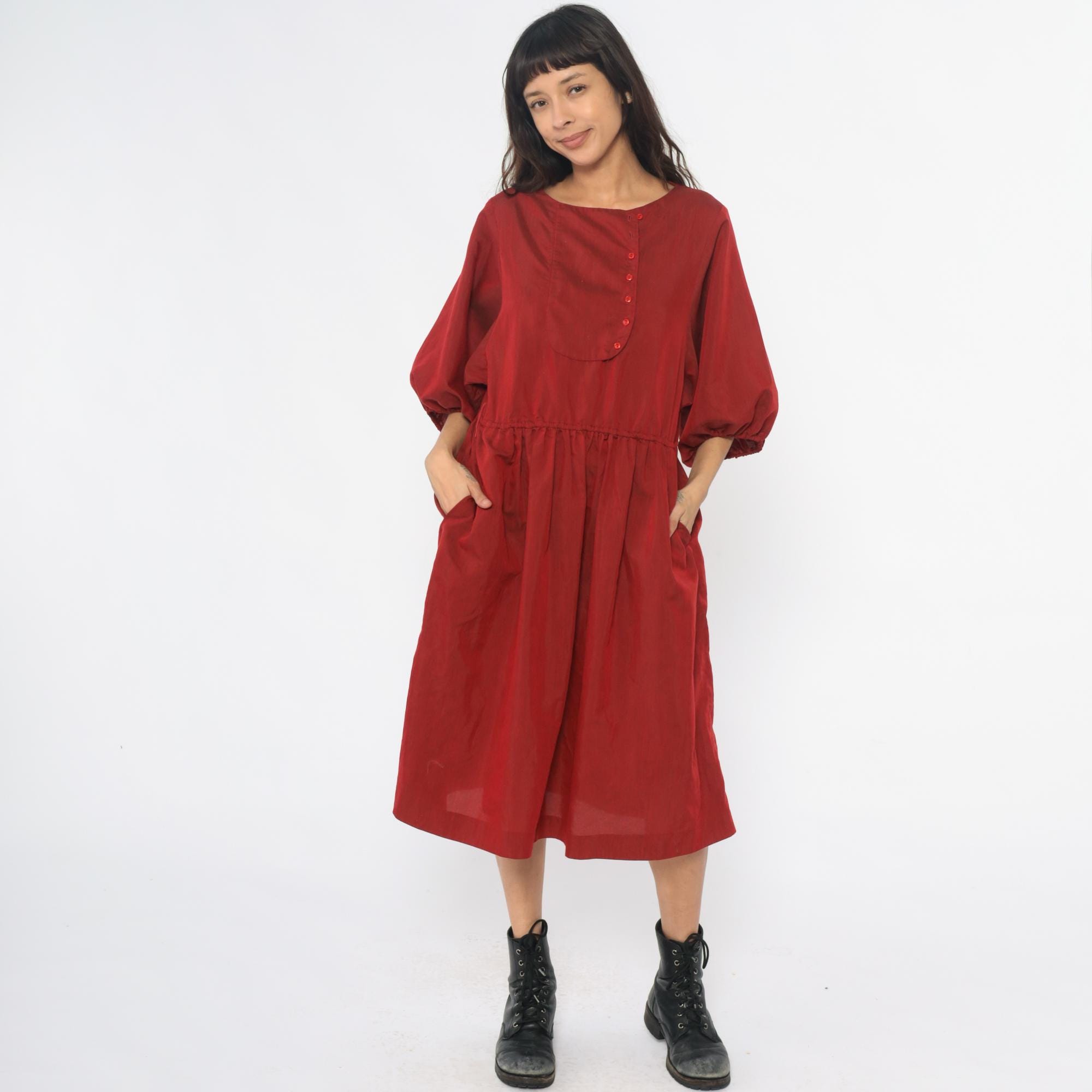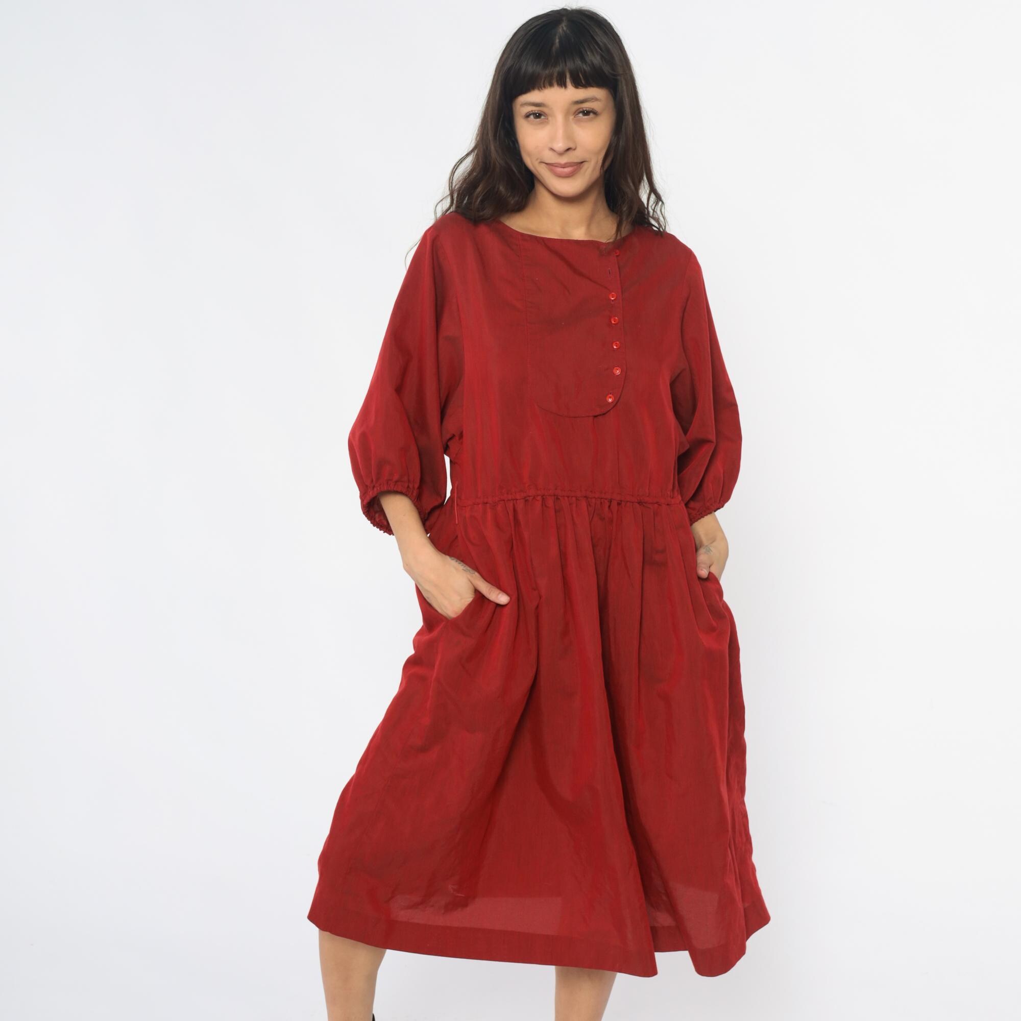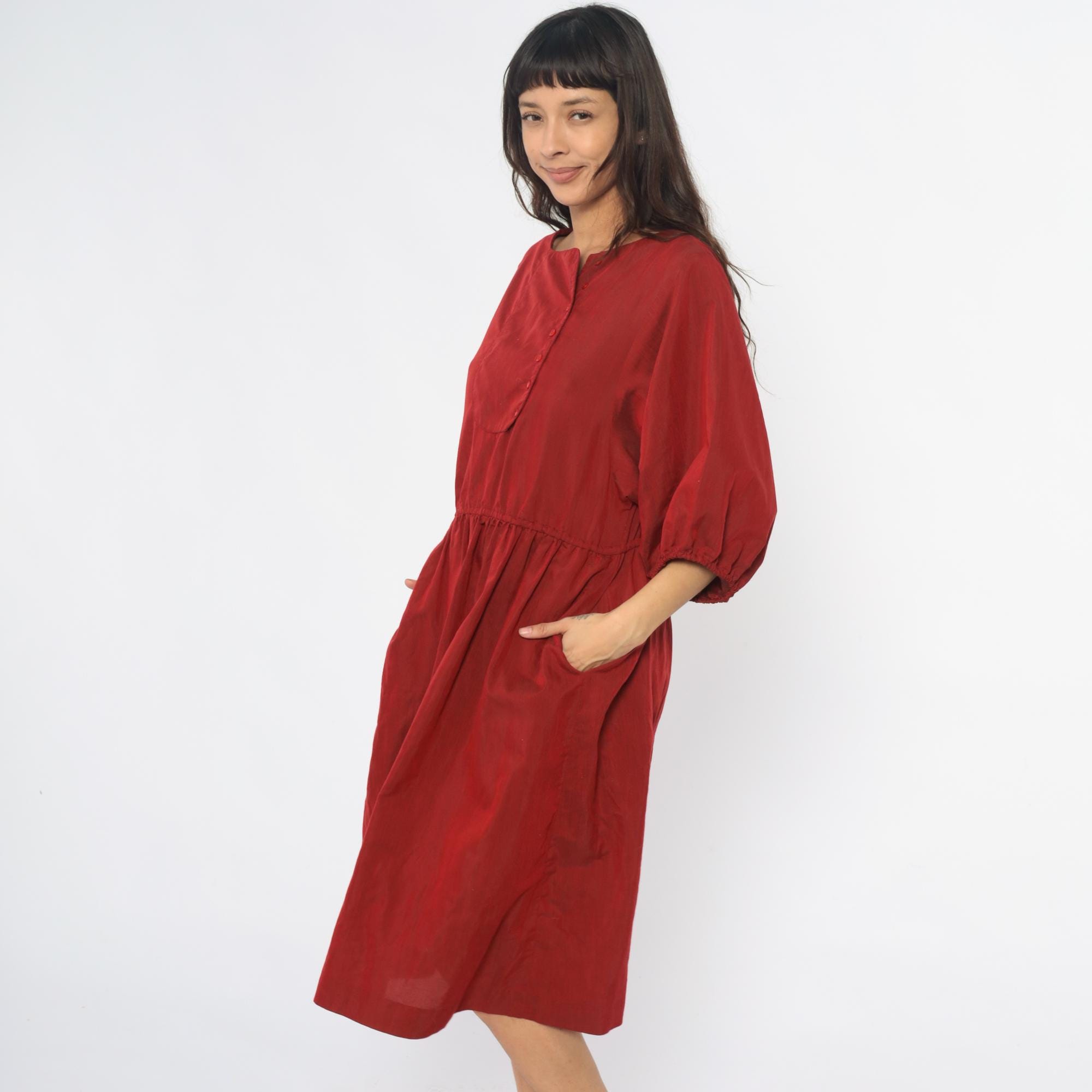 80s burgundy dress with asymmetric button front closure at the chest and rounded neckline. Puff sleeves with gathered cuffs, fitted bodice with gathered waist seam releasing to an A-line skirt.
