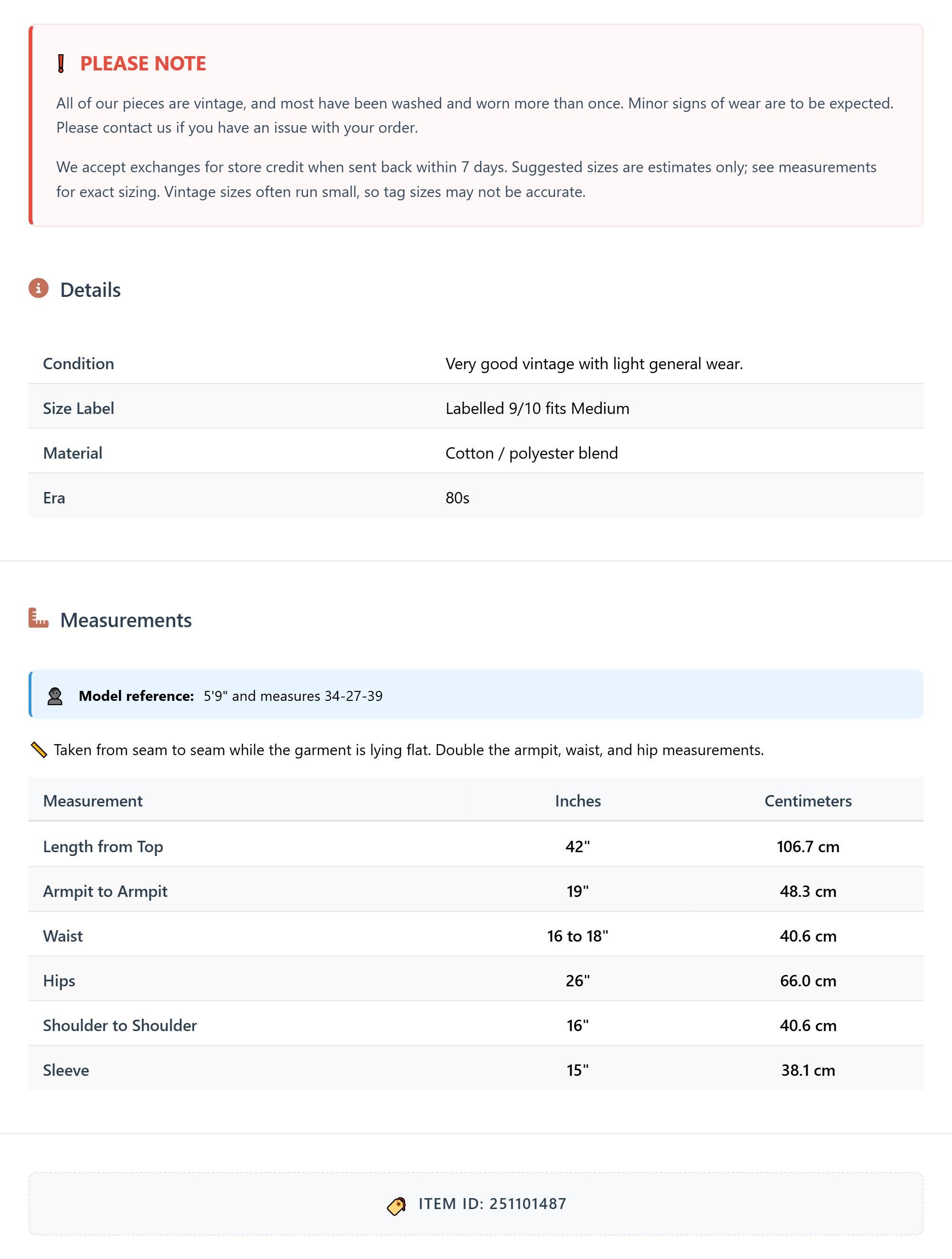 Suggested sizes are estimates only; see measurements for exact sizing. Vintage sizes often run small, so tag sizes may not be accurate.