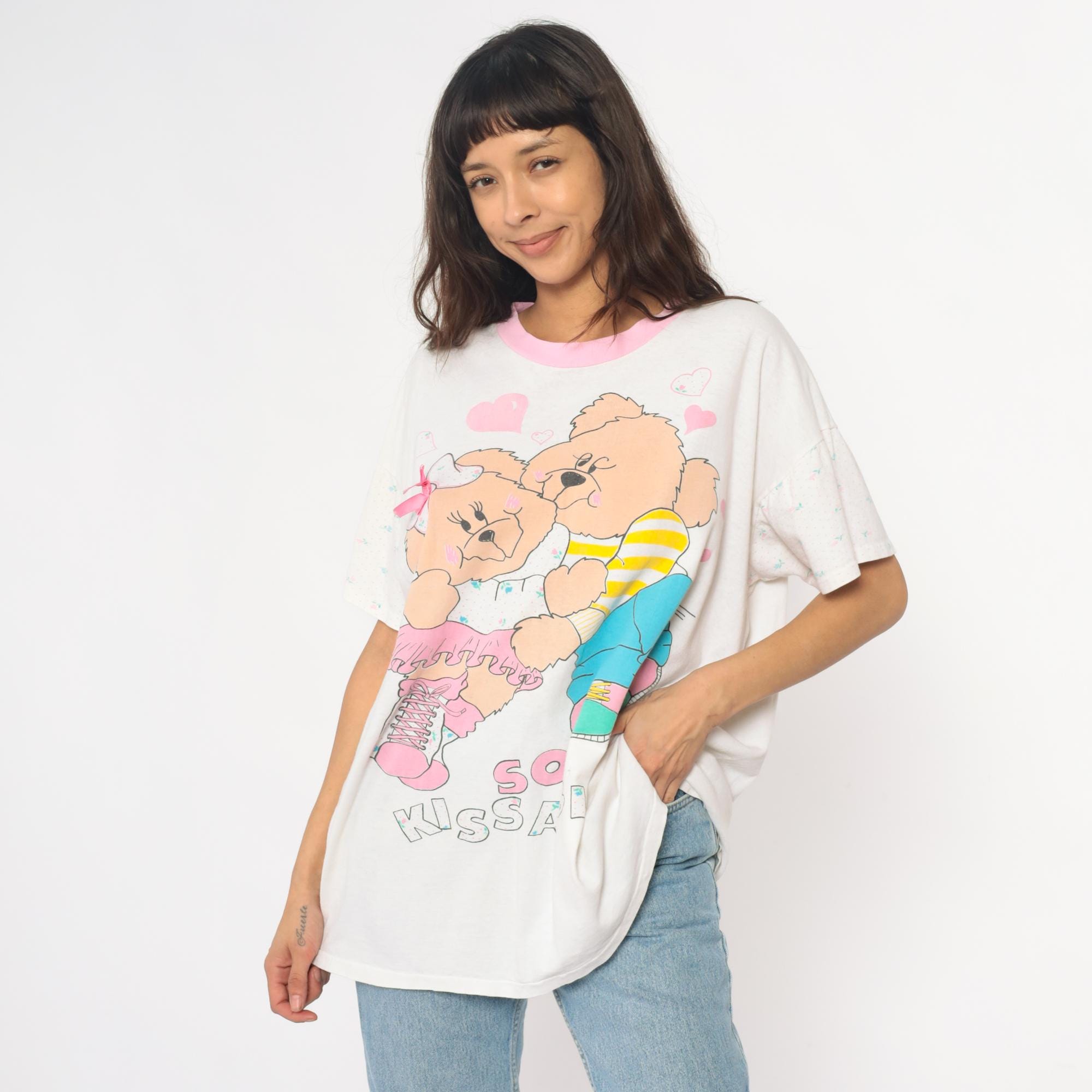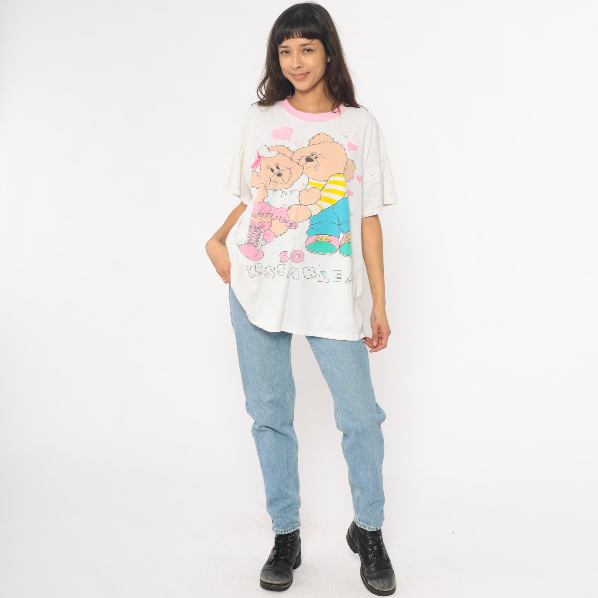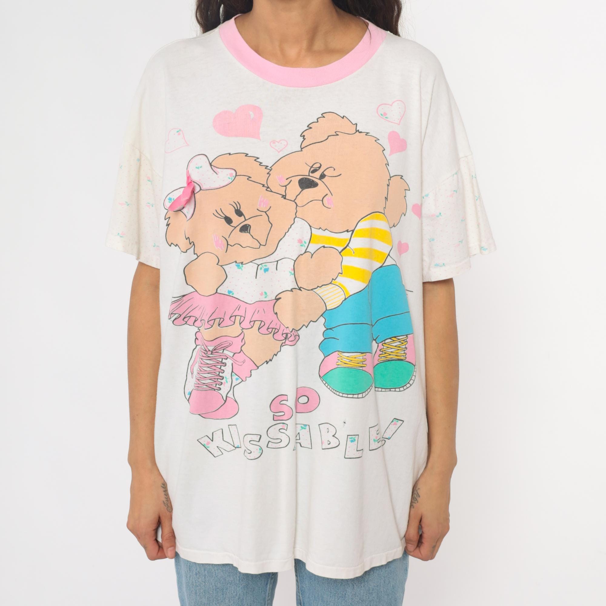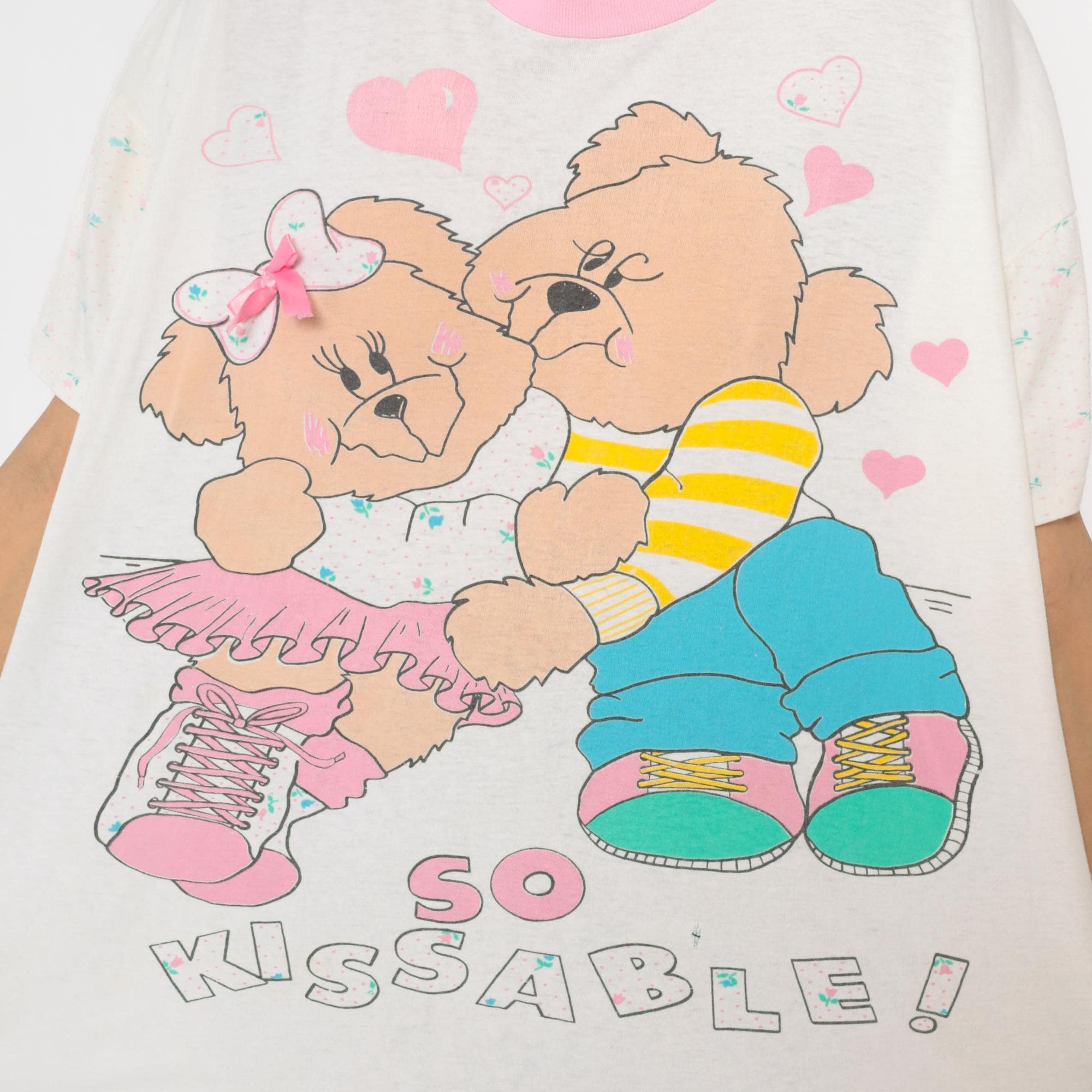 90s white nightshirt with cartoon bear graphic and "SO KISSABLE!" text across the front. Two bears hugging with pink hearts, wearing pink, yellow, and blue clothing details. Pink ribbed trim at crew neckline, short sleeves with small matching graphics.