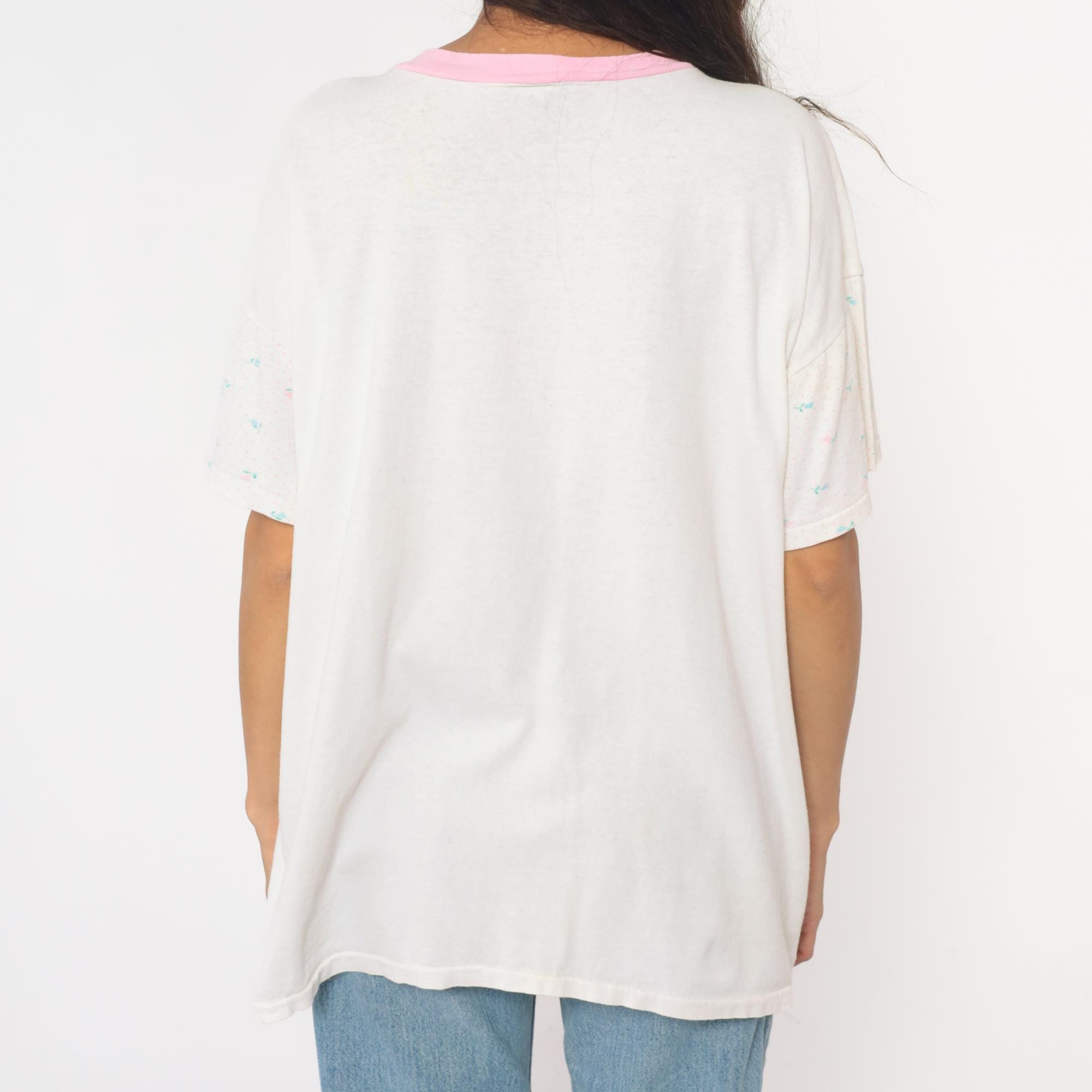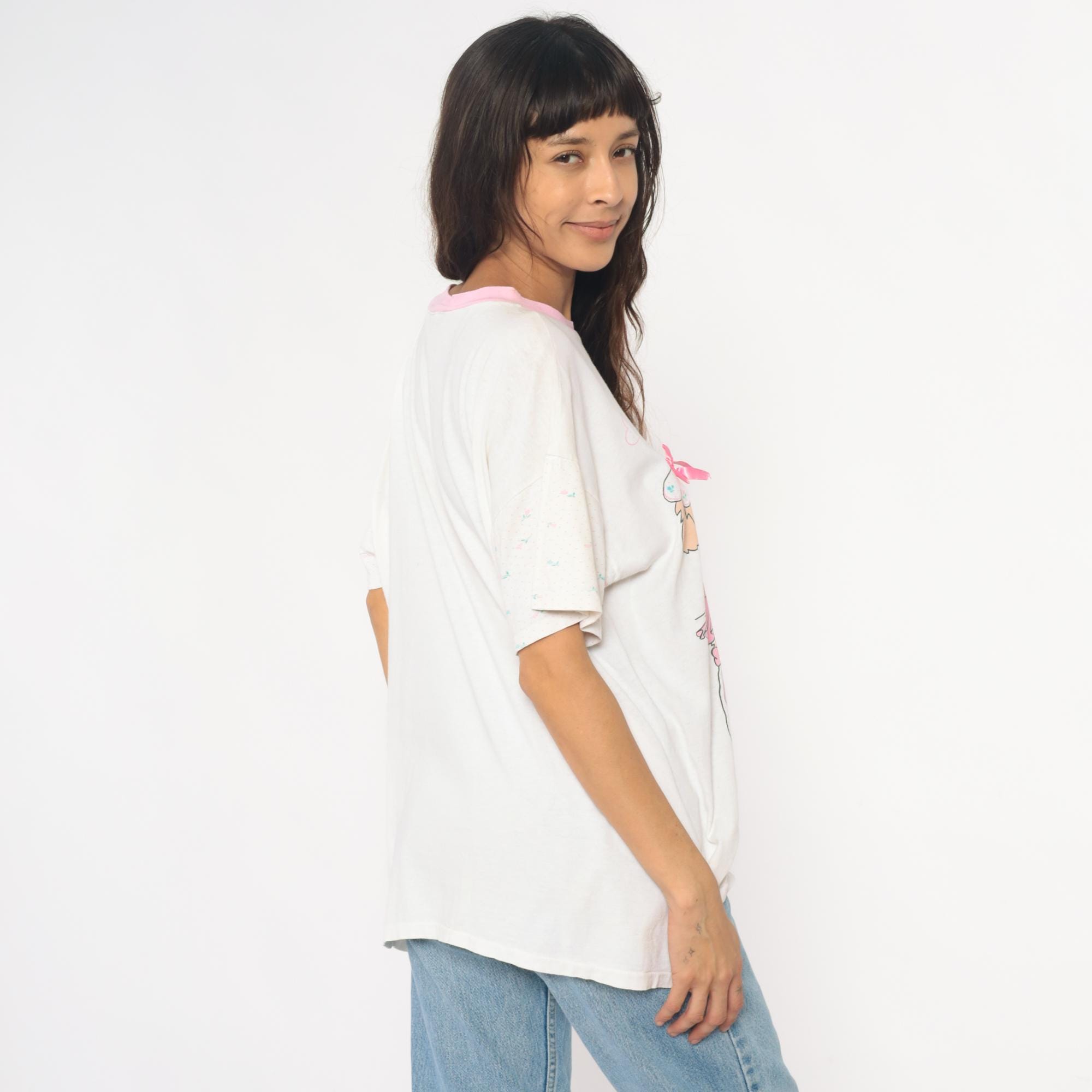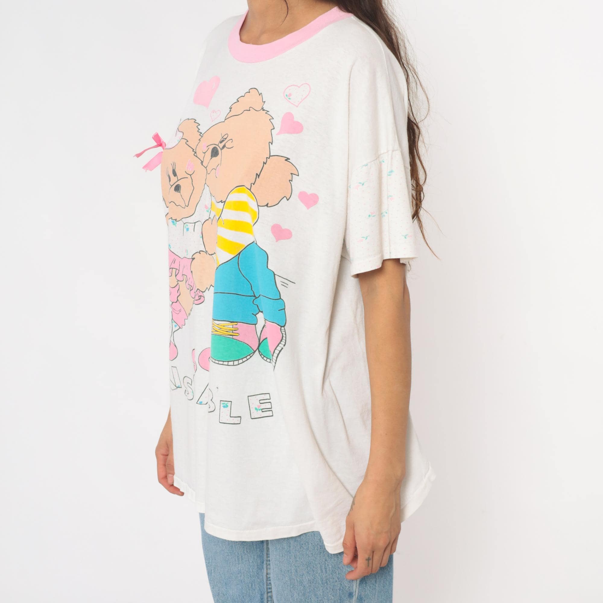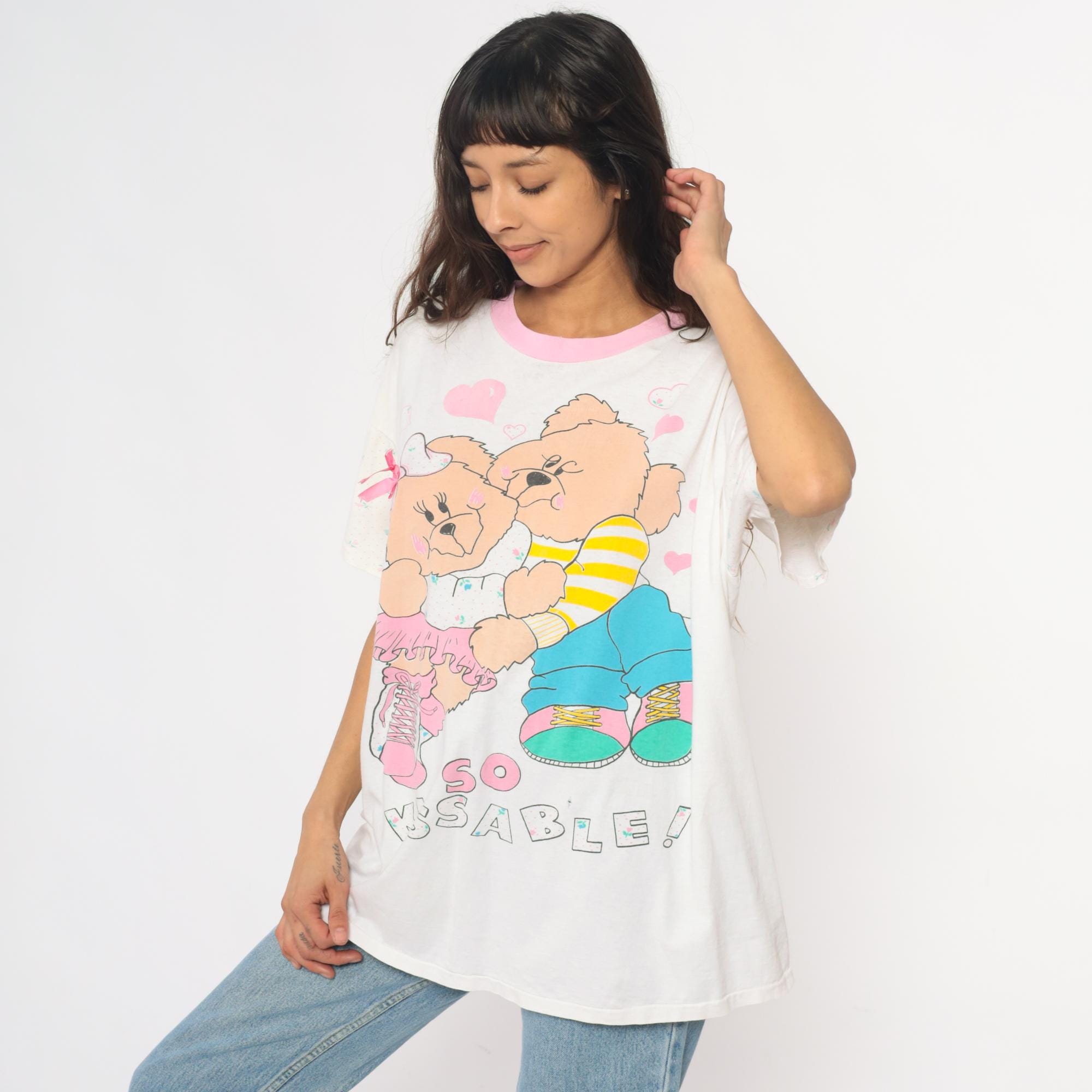 90s white nightshirt with cartoon bear graphic and "SO KISSABLE!" text across the front. Two bears hugging with pink hearts, wearing pink, yellow, and blue clothing details. Pink ribbed trim at crew neckline, short sleeves with small matching graphics.